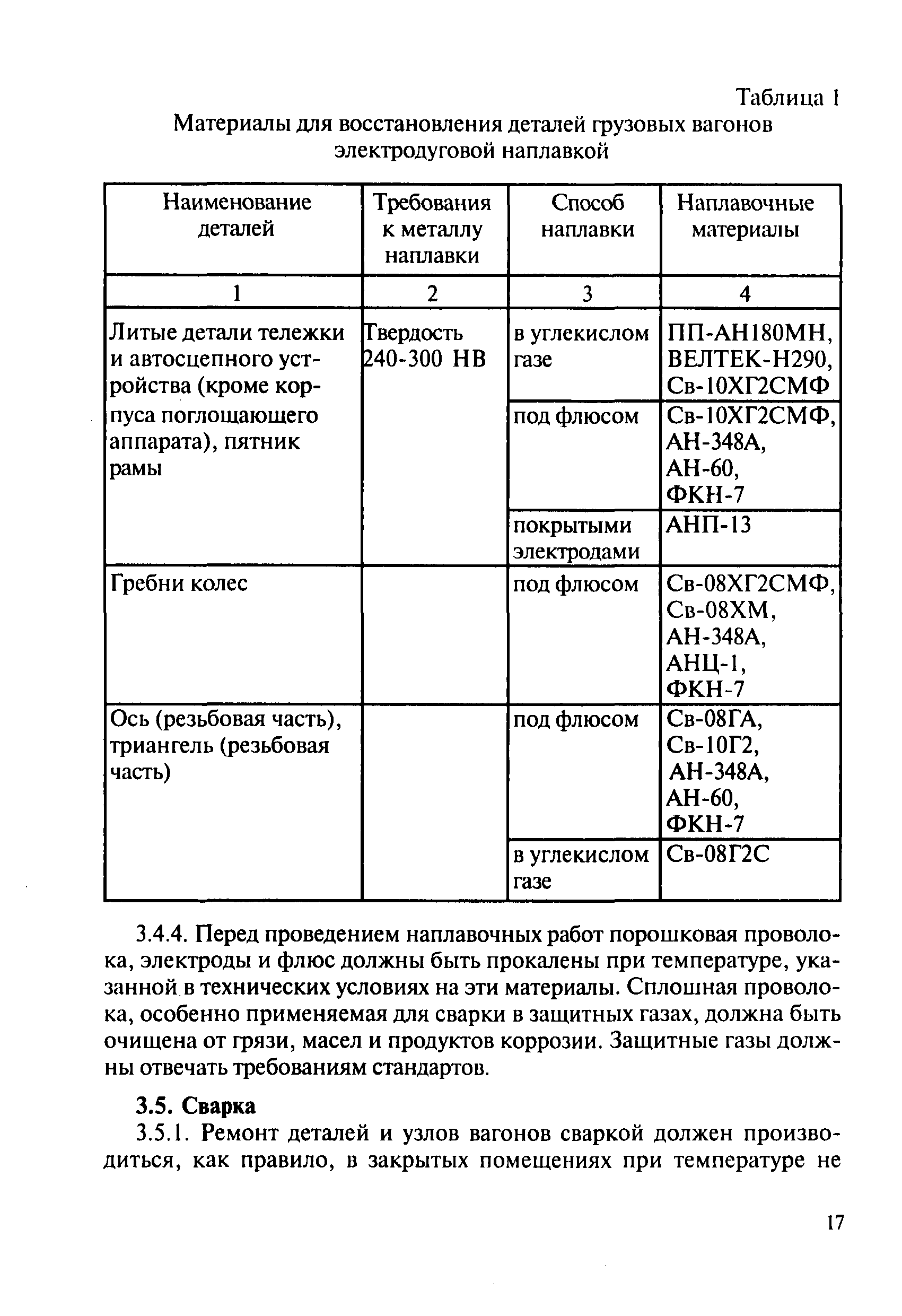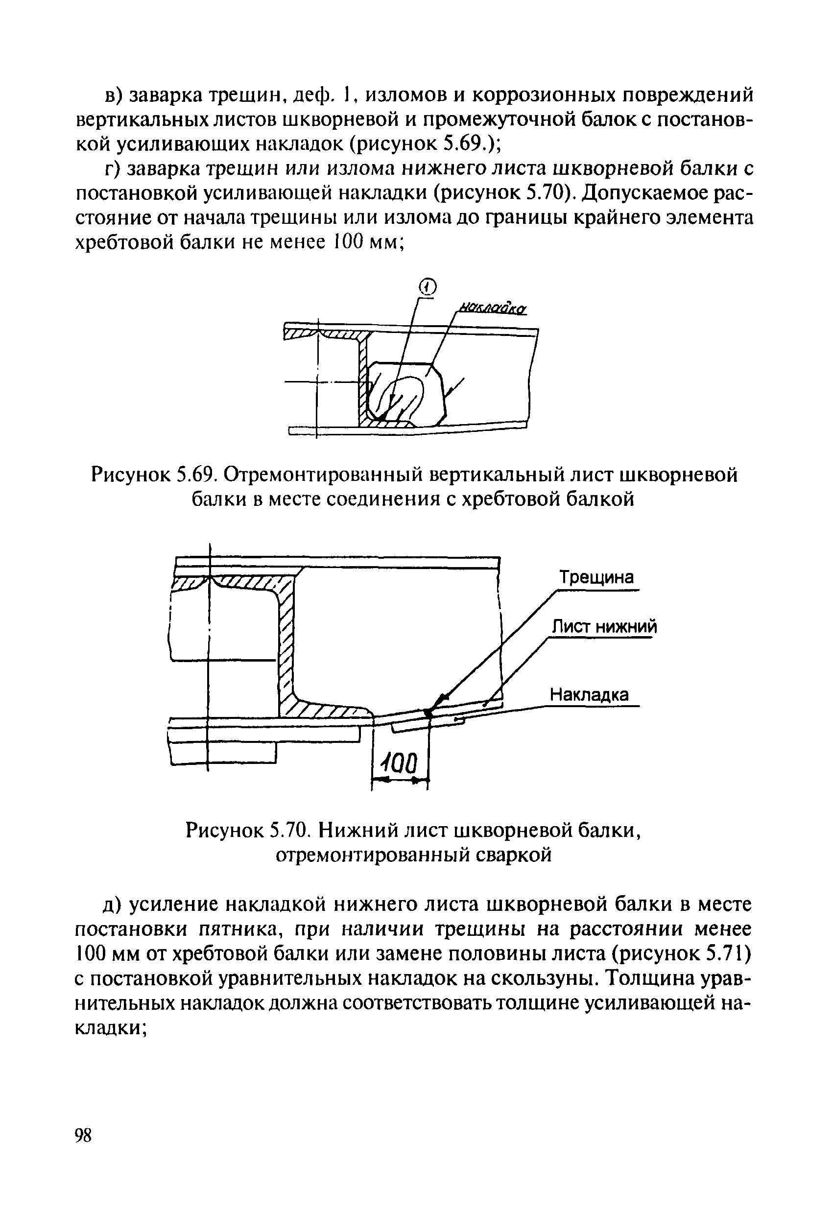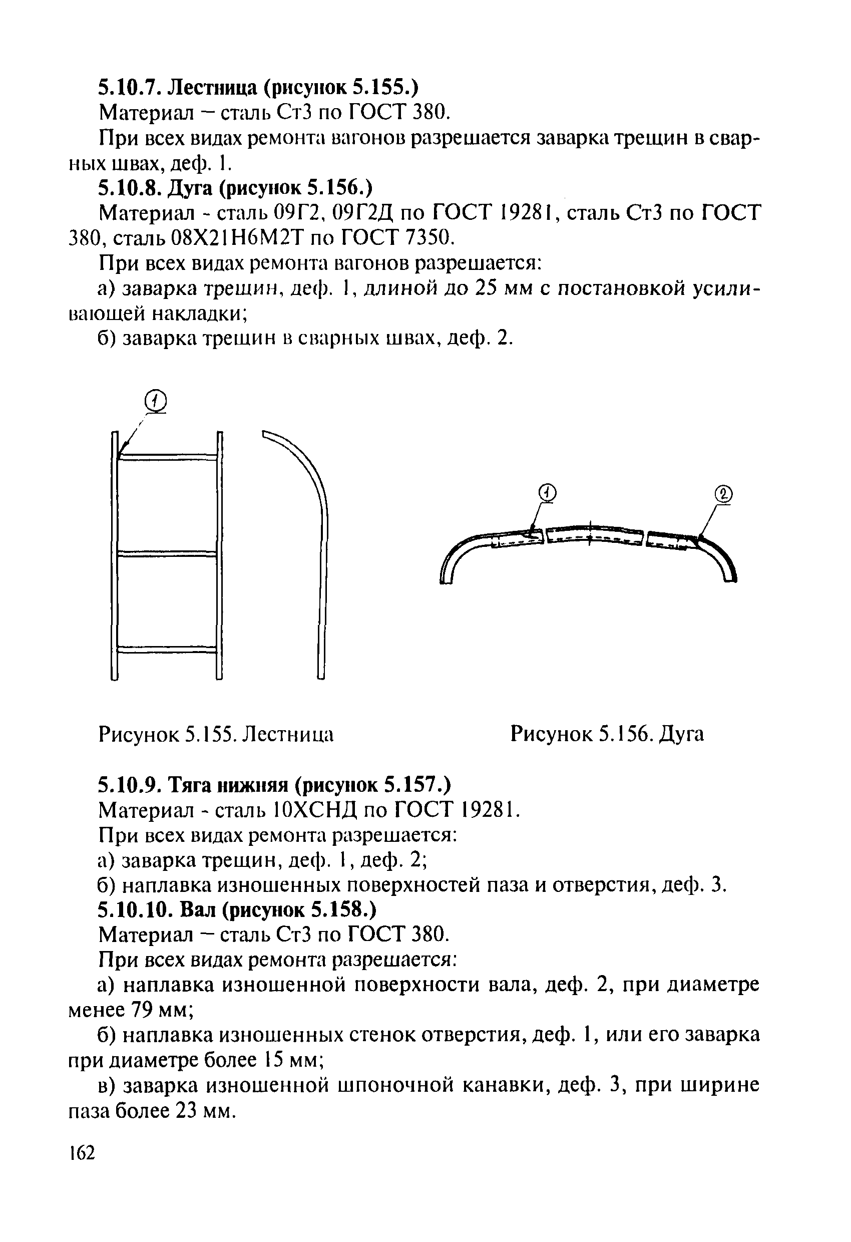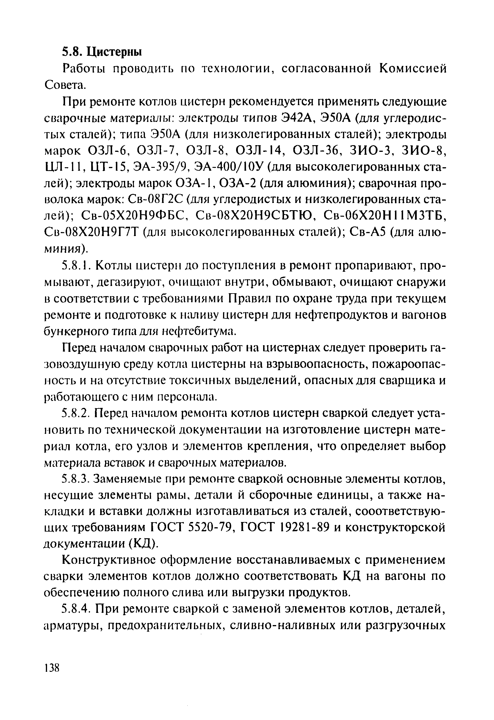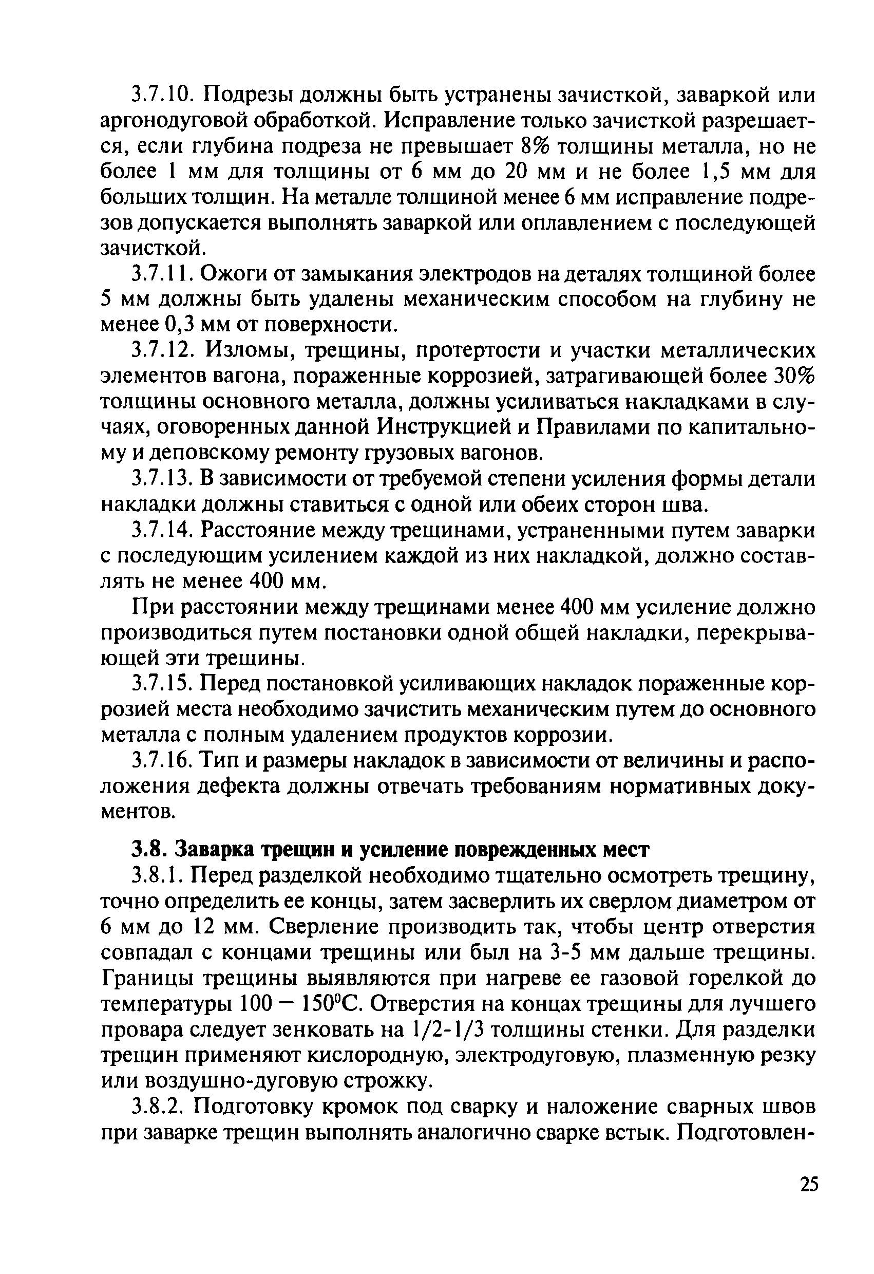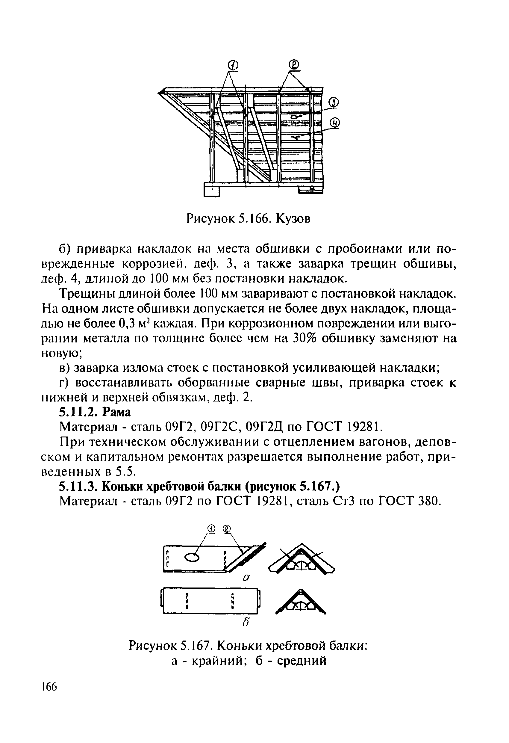 | Оглавление: | 1. Область применения 2. Нормативные ссылки 3. Основные указания по организации и выполнению сварочно-наплавочных работ 3.1 Организация сварочно-наплавочных работ 3.2 Общие требования к проведению сварочно-наплавочных работ 3.3 Подготовка узлов и деталей вагонов к сварке и наплавке 3.4 Наплавка изношенных поверхностей 3.5 Сварка 3.6 Контроль качества сварных соединений 3.7 Виды дефектов и способы их устранения 3.8 Заварка трещин и усиление поврежденных мест 3.9 Приемка выполненных работ 4. Требования безопасности и охраны окружающей среды 5. Требования к ремонту сваркой деталей и узлов 5.1 Тележка модели 18-100, 18-101 5.2 Тележка рефрижераторного типа КВЗ-И2 5.3 Детали тормозов 5.4 Автосцепное устройство 5.5 Вагонная рама и ее детали 5.6 Кузова вагонов 5.7 Внутреннее оборудование рефрижераторных вагонов секций ЦБ-5, БМЗ-5 и АРВ 5.8 Цистерны 5.9 Вагон для битума 5.10 Вагон (хоппер) для зерна, цемента, сырья минеральных удобрений 5.11 Хоппер-дозатор, вагон (хоппер) для горячих окатышей и агломерата |