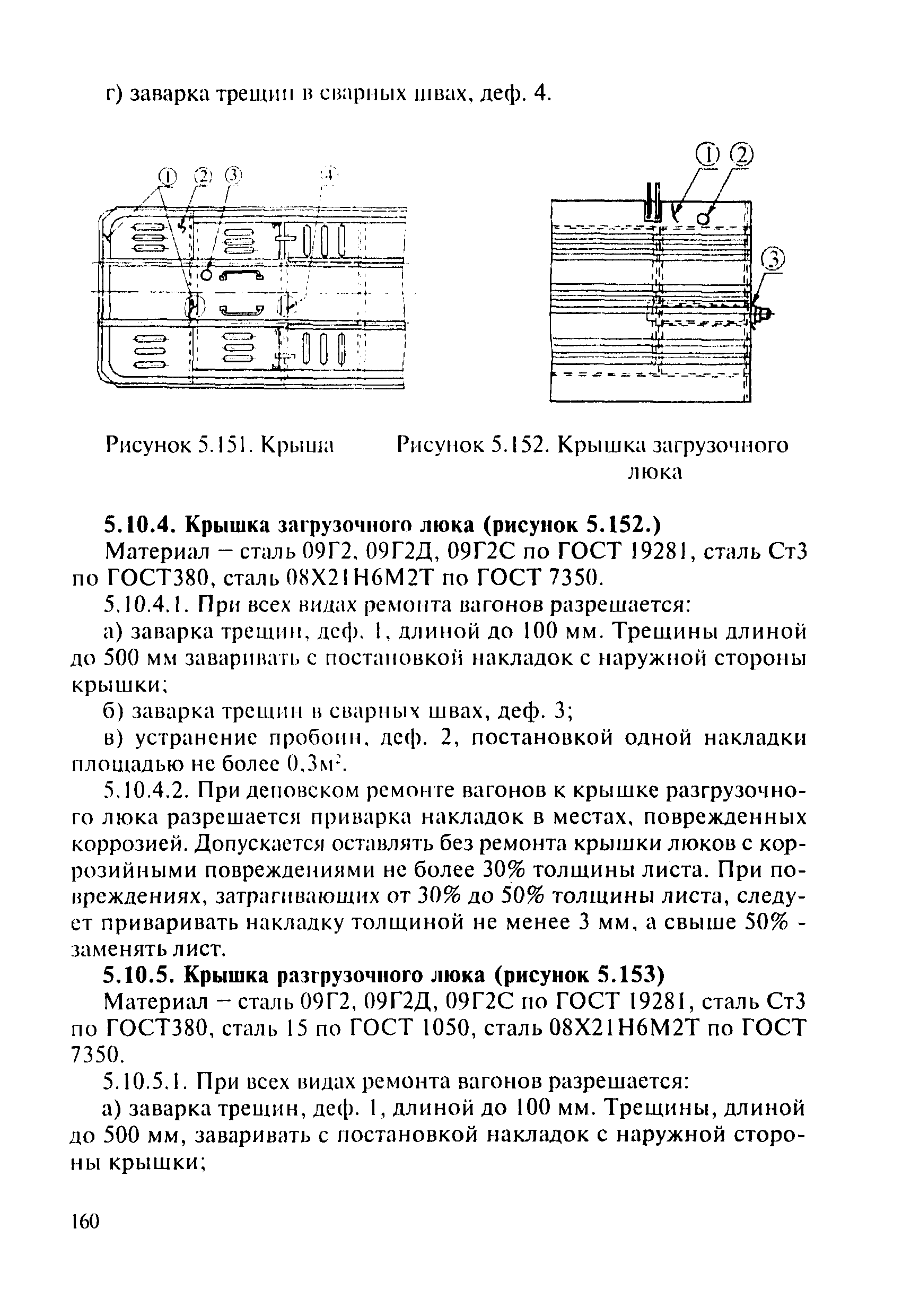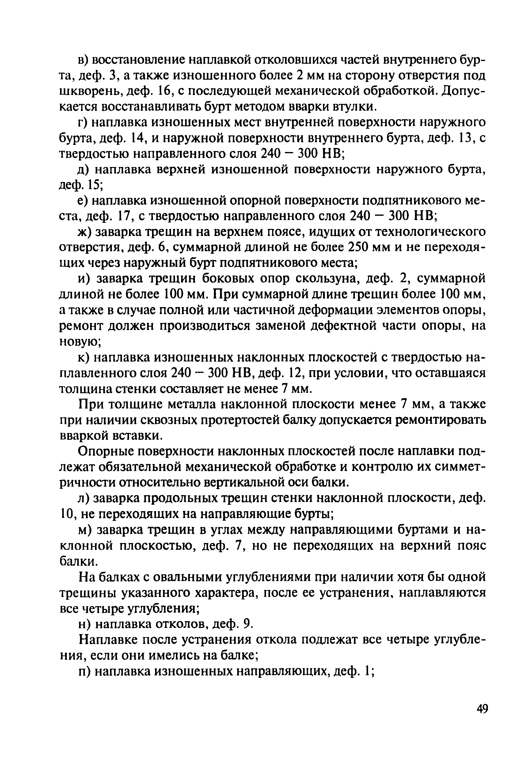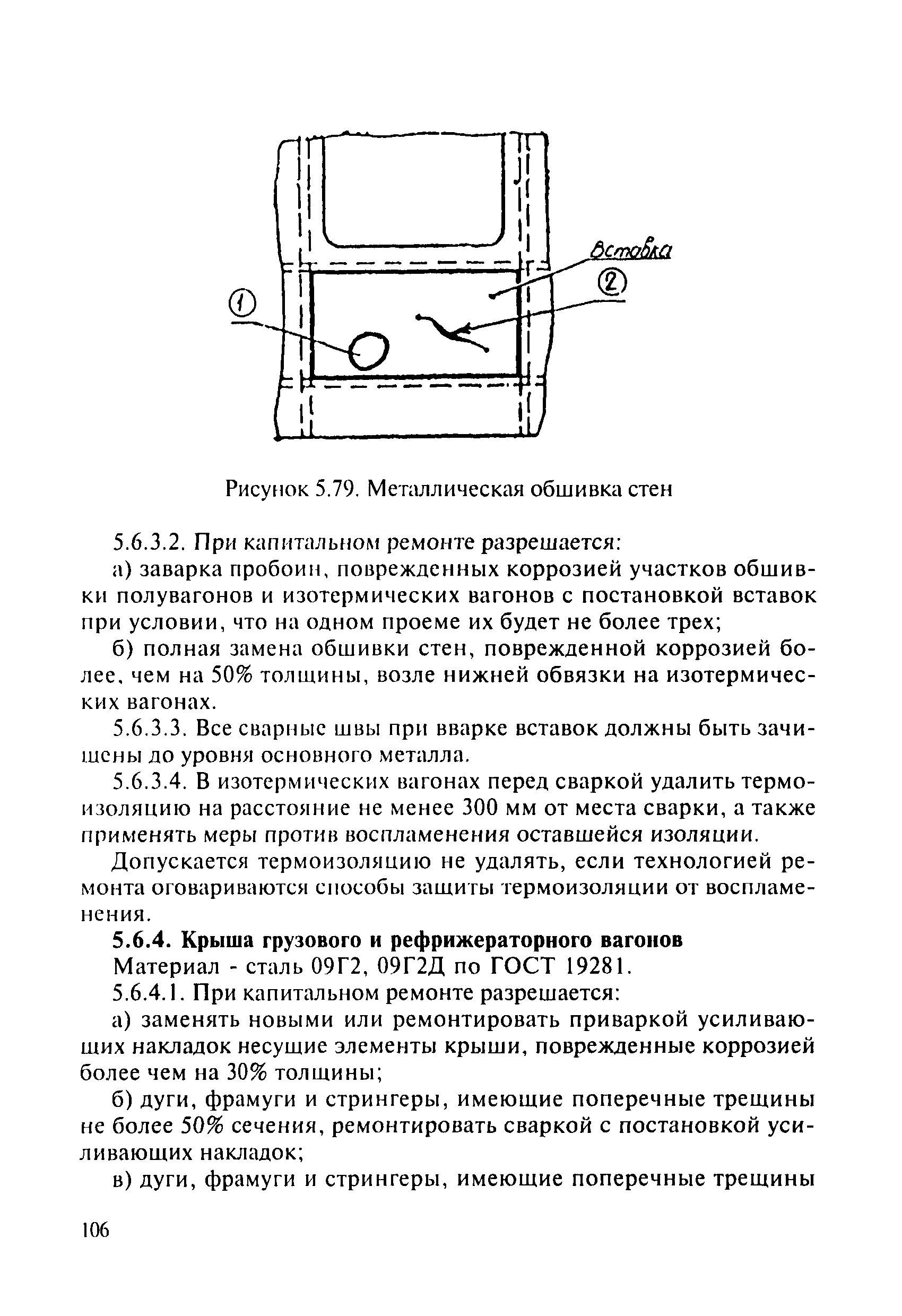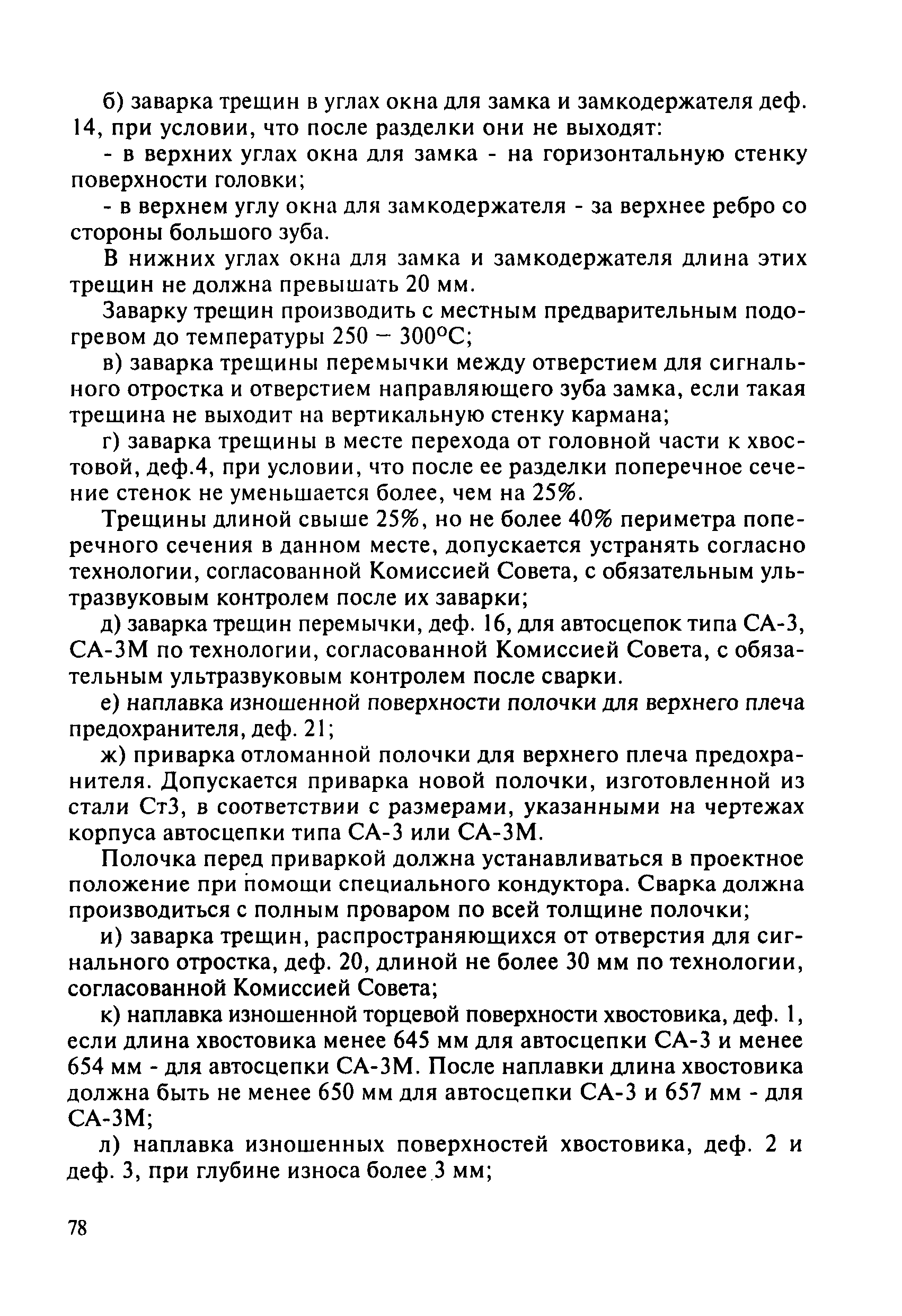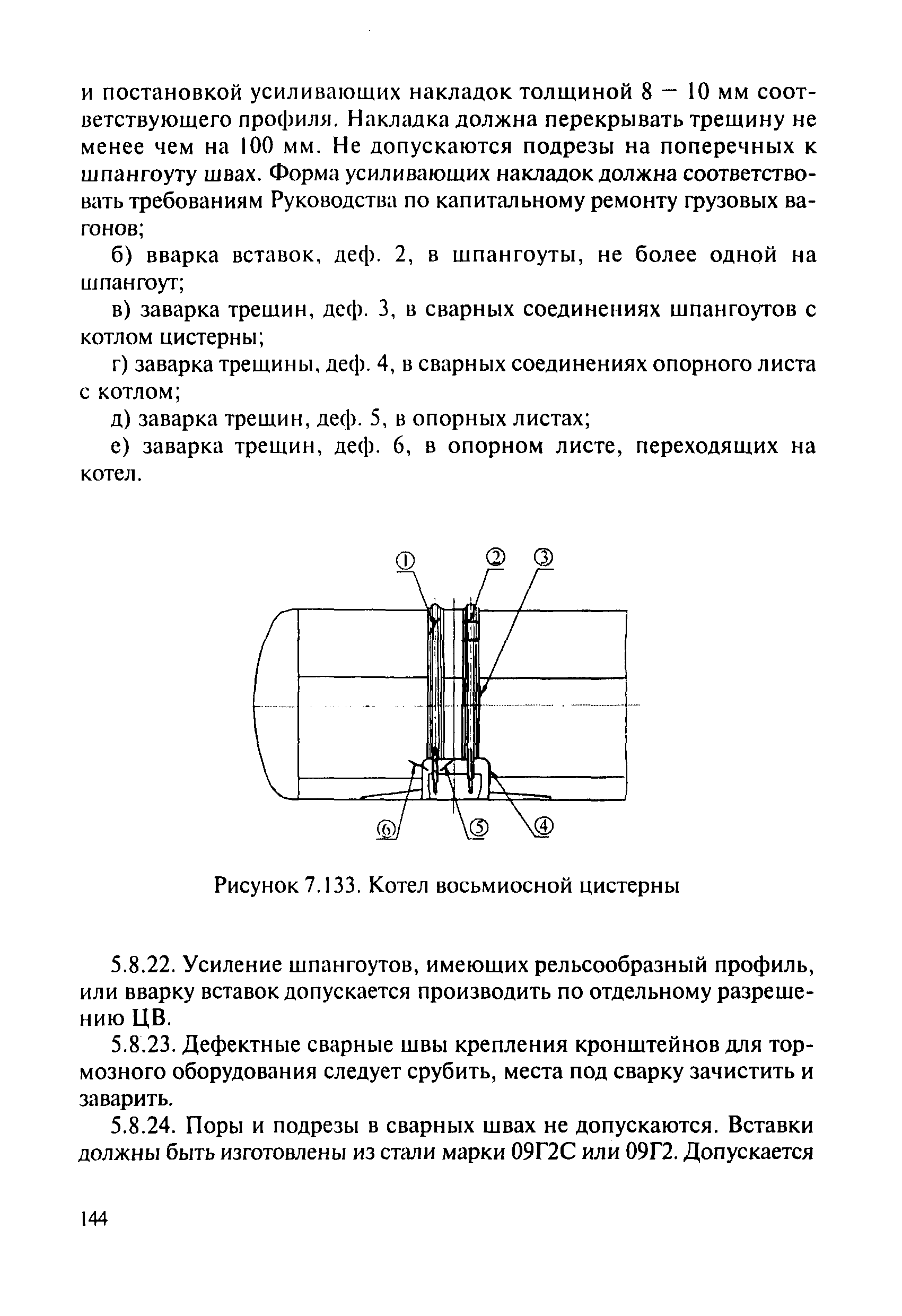 | Оглавление: | 1. Область применения 2. Нормативные ссылки 3. Основные указания по организации и выполнению сварочно-наплавочных работ 3.1 Организация сварочно-наплавочных работ 3.2 Общие требования к проведению сварочно-наплавочных работ 3.3 Подготовка узлов и деталей вагонов к сварке и наплавке 3.4 Наплавка изношенных поверхностей 3.5 Сварка 3.6 Контроль качества сварных соединений 3.7 Виды дефектов и способы их устранения 3.8 Заварка трещин и усиление поврежденных мест 3.9 Приемка выполненных работ 4. Требования безопасности и охраны окружающей среды 5. Требования к ремонту сваркой деталей и узлов 5.1 Тележка модели 18-100, 18-101 5.2 Тележка рефрижераторного типа КВЗ-И2 5.3 Детали тормозов 5.4 Автосцепное устройство 5.5 Вагонная рама и ее детали 5.6 Кузова вагонов 5.7 Внутреннее оборудование рефрижераторных вагонов секций ЦБ-5, БМЗ-5 и АРВ 5.8 Цистерны 5.9 Вагон для битума 5.10 Вагон (хоппер) для зерна, цемента, сырья минеральных удобрений 5.11 Хоппер-дозатор, вагон (хоппер) для горячих окатышей и агломерата |