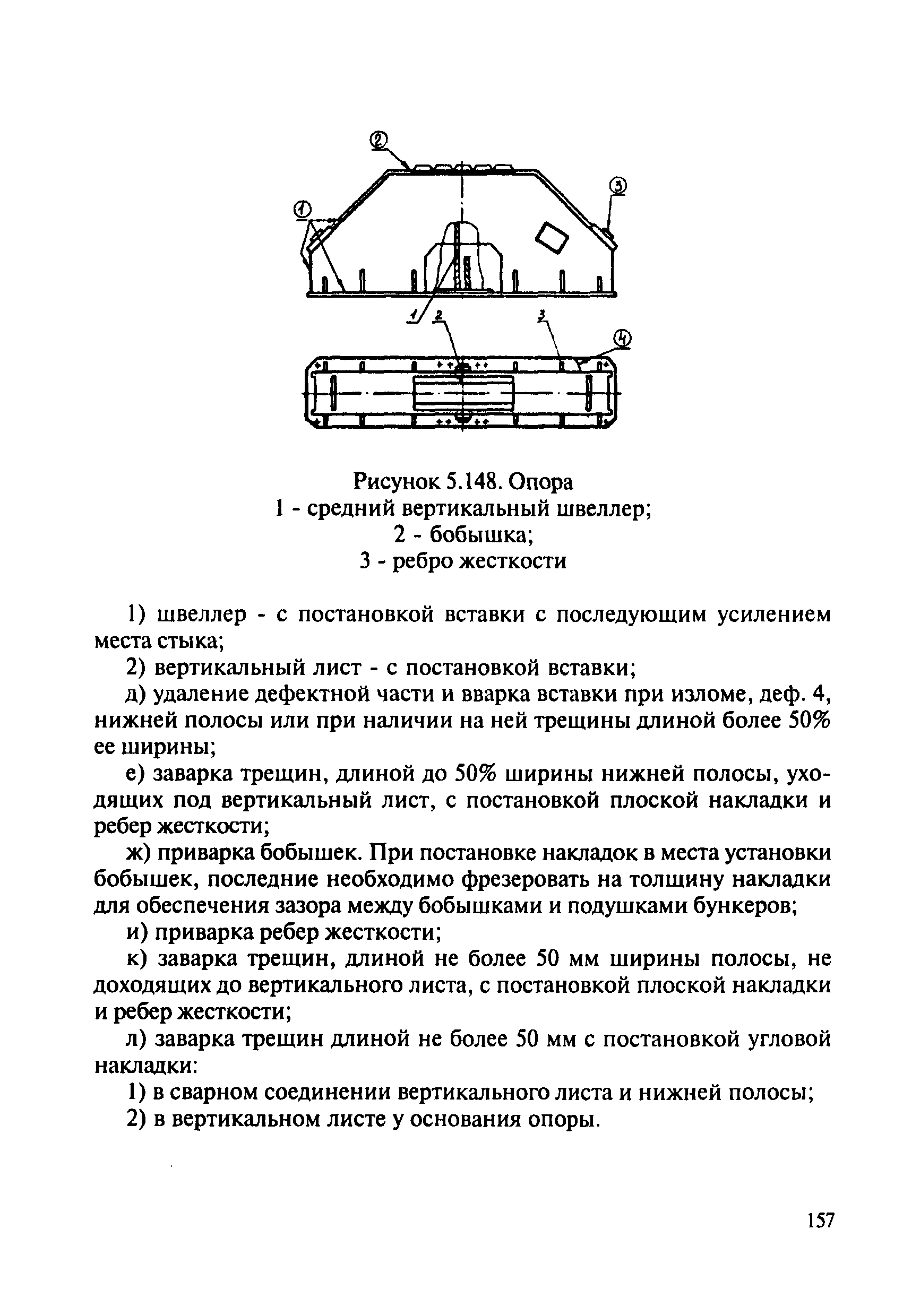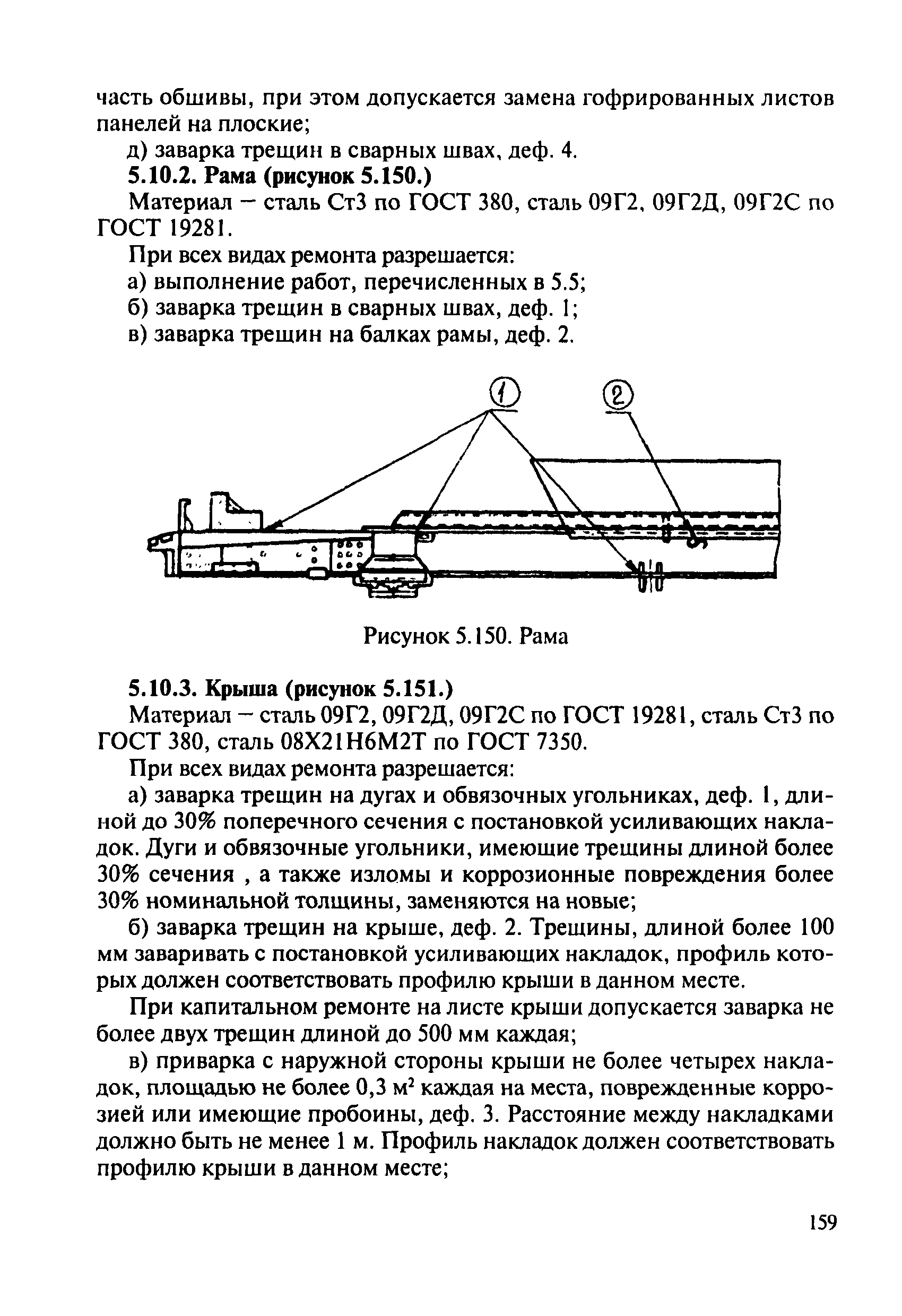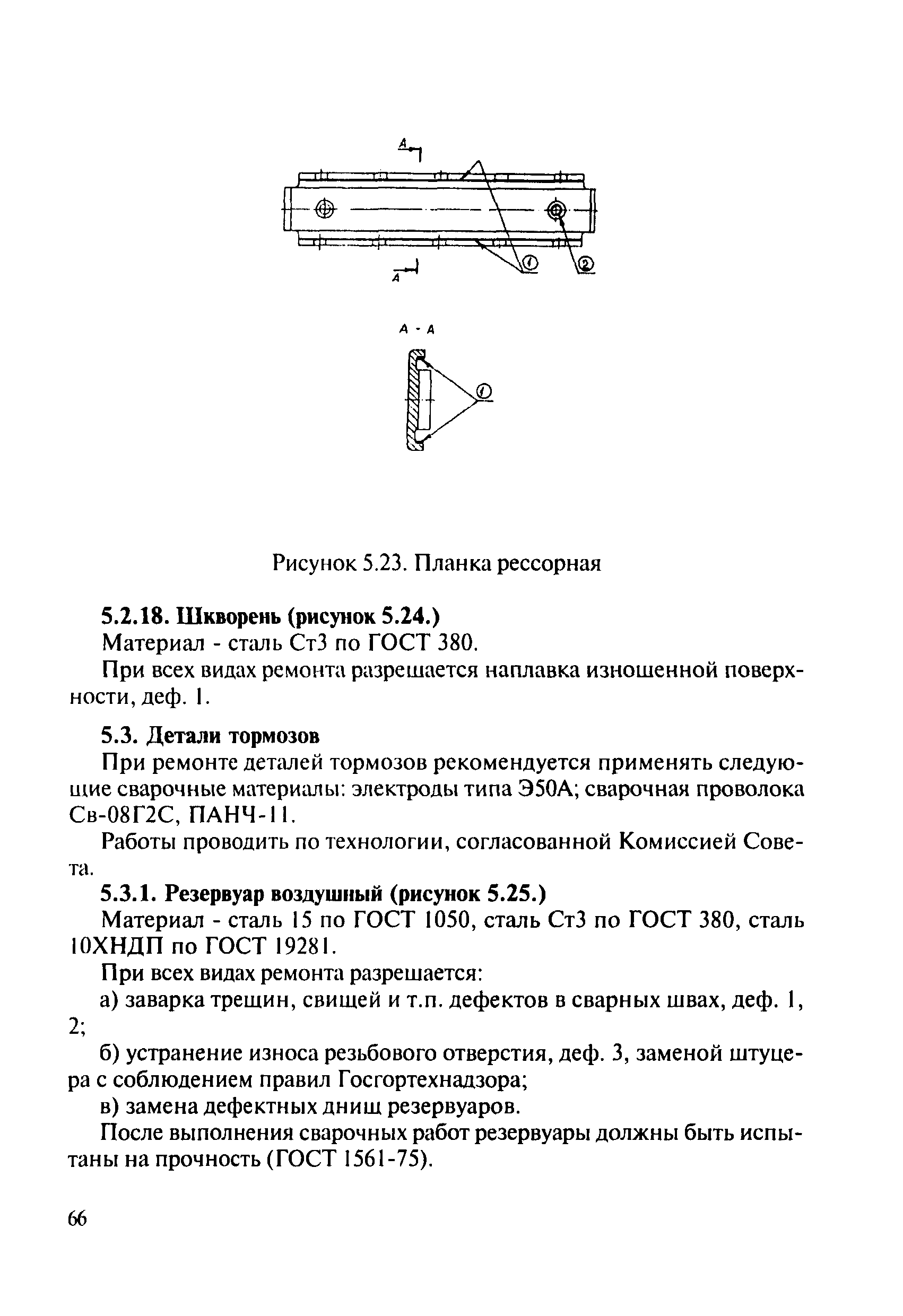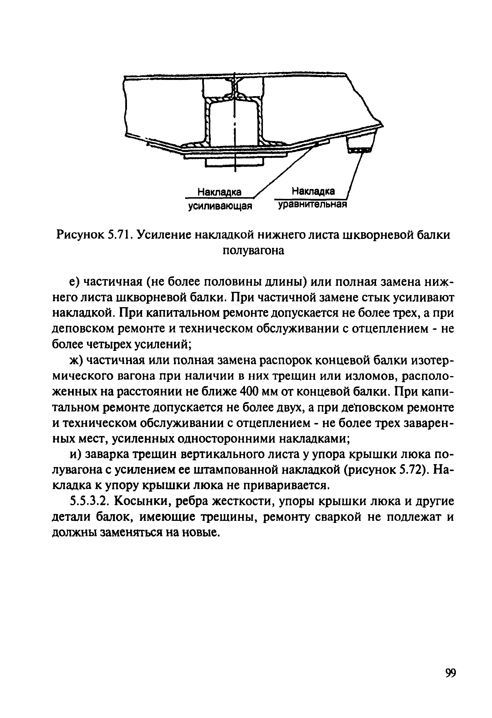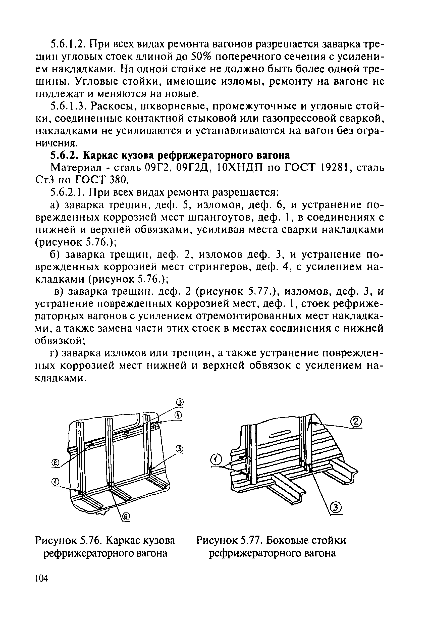 | Оглавление: | 1. Область применения 2. Нормативные ссылки 3. Основные указания по организации и выполнению сварочно-наплавочных работ 3.1 Организация сварочно-наплавочных работ 3.2 Общие требования к проведению сварочно-наплавочных работ 3.3 Подготовка узлов и деталей вагонов к сварке и наплавке 3.4 Наплавка изношенных поверхностей 3.5 Сварка 3.6 Контроль качества сварных соединений 3.7 Виды дефектов и способы их устранения 3.8 Заварка трещин и усиление поврежденных мест 3.9 Приемка выполненных работ 4. Требования безопасности и охраны окружающей среды 5. Требования к ремонту сваркой деталей и узлов 5.1 Тележка модели 18-100, 18-101 5.2 Тележка рефрижераторного типа КВЗ-И2 5.3 Детали тормозов 5.4 Автосцепное устройство 5.5 Вагонная рама и ее детали 5.6 Кузова вагонов 5.7 Внутреннее оборудование рефрижераторных вагонов секций ЦБ-5, БМЗ-5 и АРВ 5.8 Цистерны 5.9 Вагон для битума 5.10 Вагон (хоппер) для зерна, цемента, сырья минеральных удобрений 5.11 Хоппер-дозатор, вагон (хоппер) для горячих окатышей и агломерата |