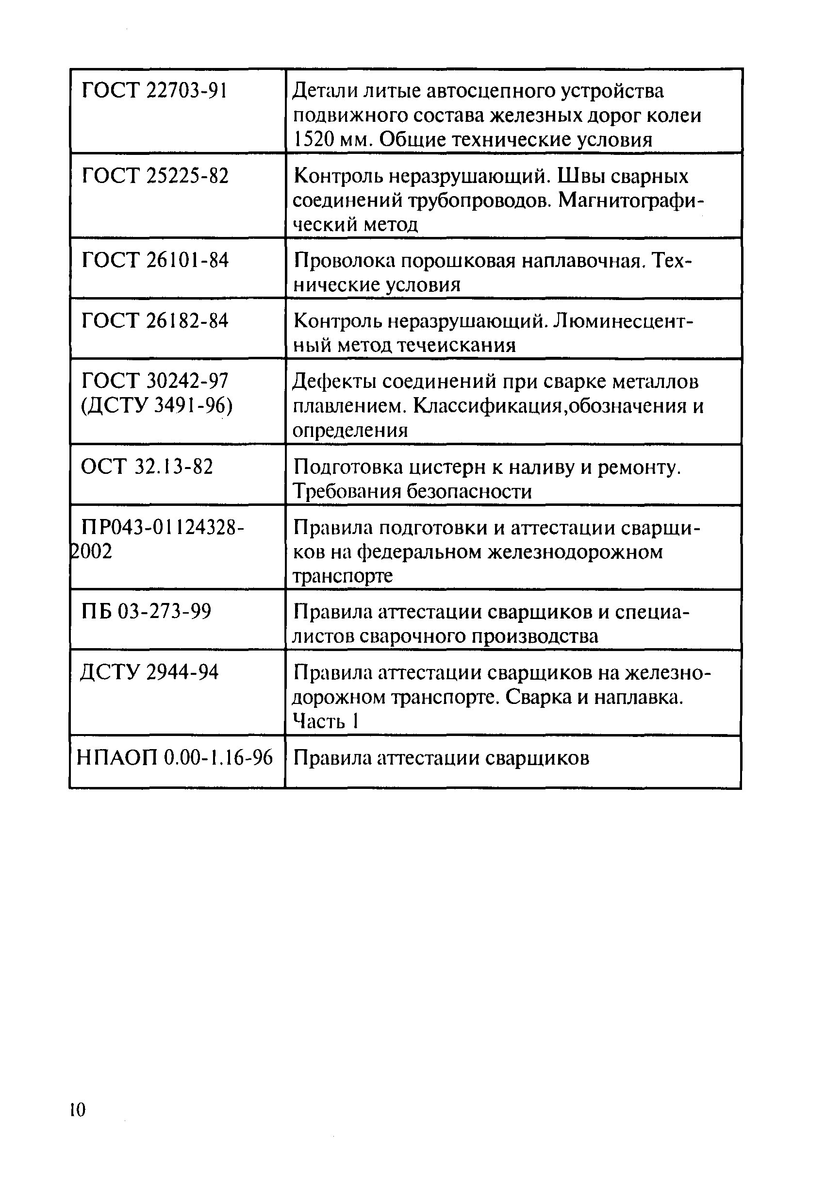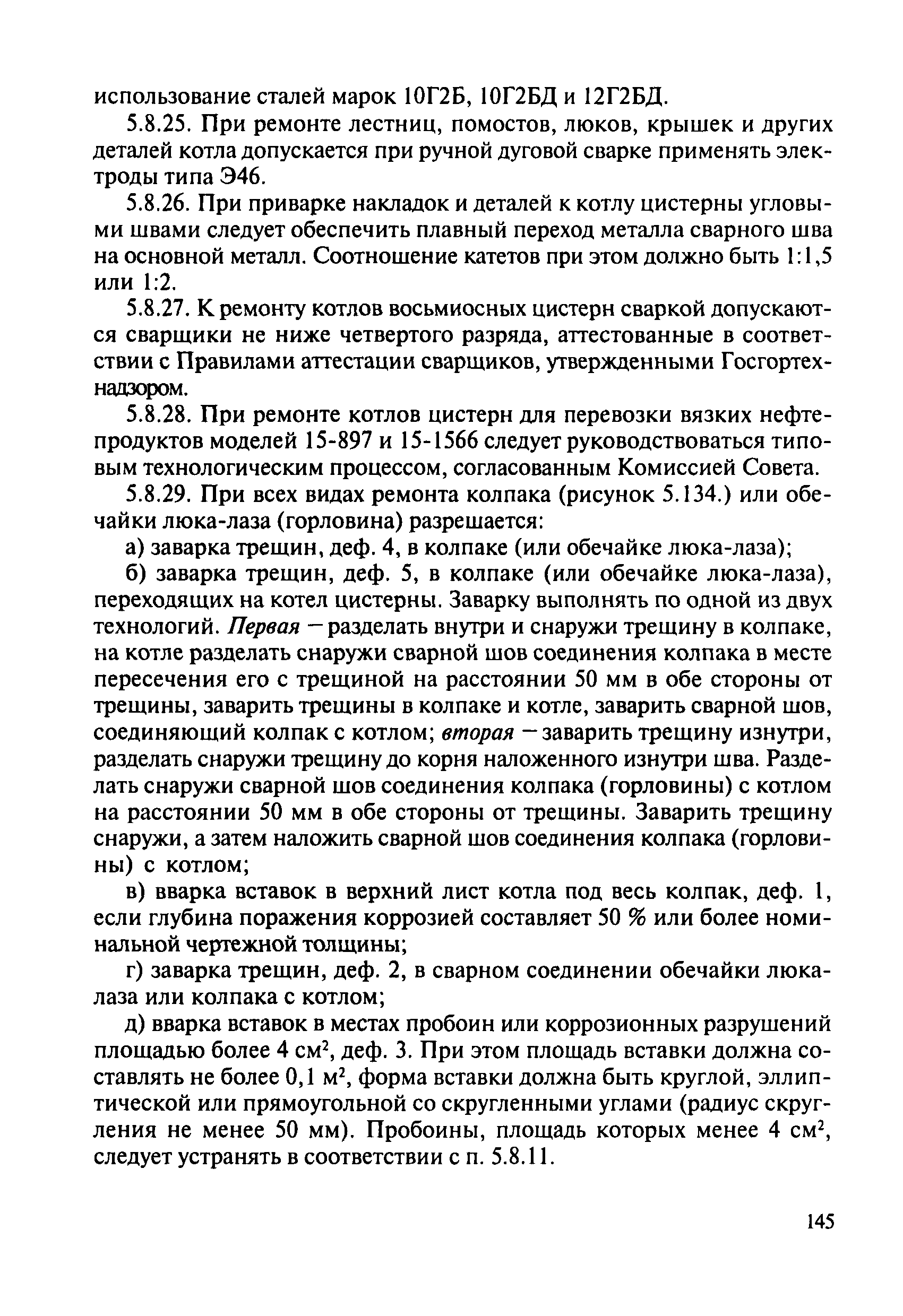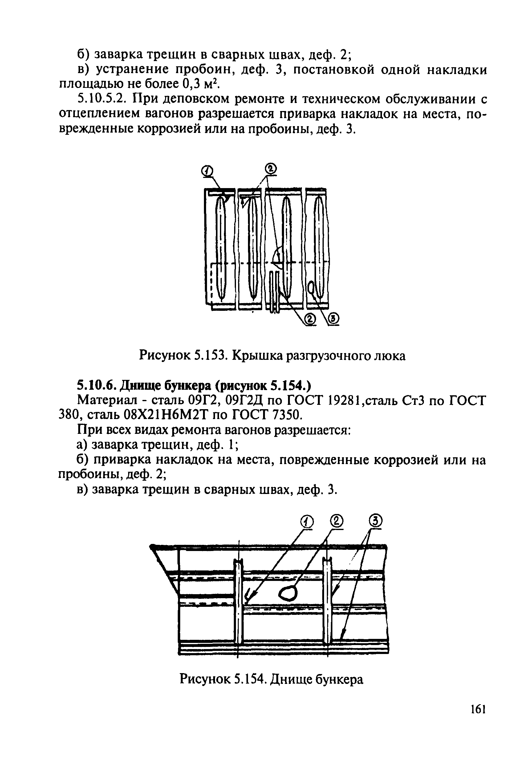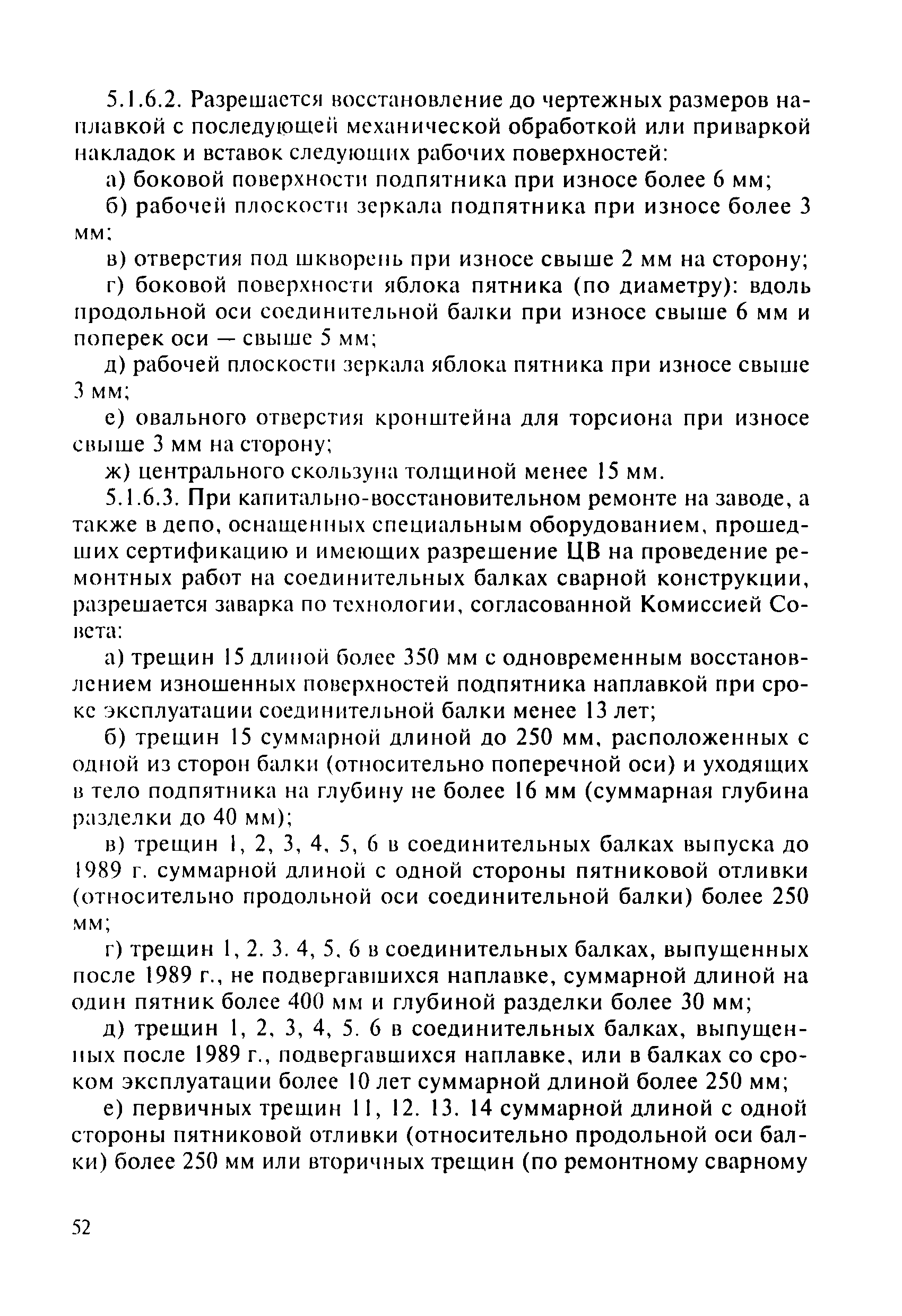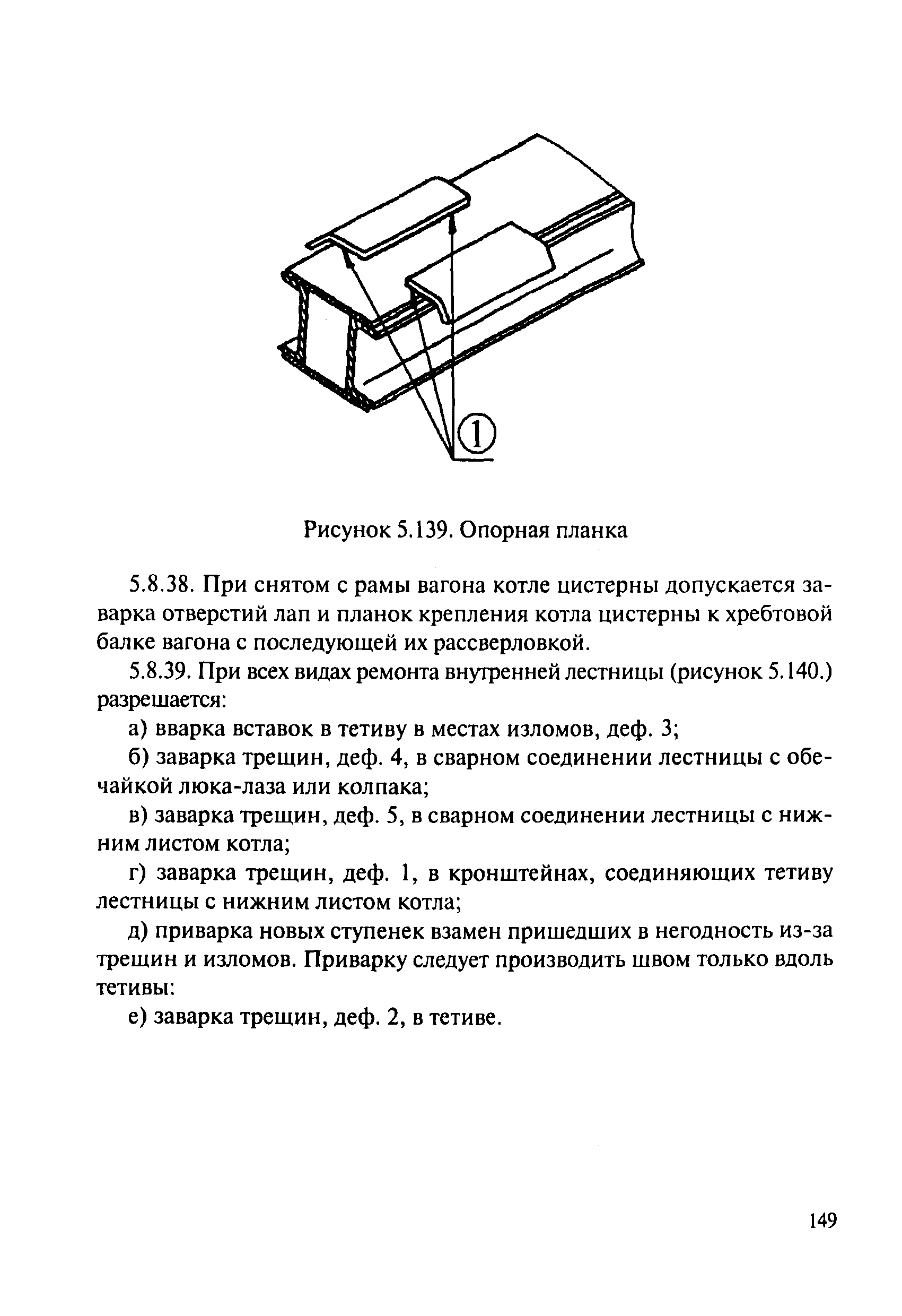 | Оглавление: | 1. Область применения 2. Нормативные ссылки 3. Основные указания по организации и выполнению сварочно-наплавочных работ 3.1 Организация сварочно-наплавочных работ 3.2 Общие требования к проведению сварочно-наплавочных работ 3.3 Подготовка узлов и деталей вагонов к сварке и наплавке 3.4 Наплавка изношенных поверхностей 3.5 Сварка 3.6 Контроль качества сварных соединений 3.7 Виды дефектов и способы их устранения 3.8 Заварка трещин и усиление поврежденных мест 3.9 Приемка выполненных работ 4. Требования безопасности и охраны окружающей среды 5. Требования к ремонту сваркой деталей и узлов 5.1 Тележка модели 18-100, 18-101 5.2 Тележка рефрижераторного типа КВЗ-И2 5.3 Детали тормозов 5.4 Автосцепное устройство 5.5 Вагонная рама и ее детали 5.6 Кузова вагонов 5.7 Внутреннее оборудование рефрижераторных вагонов секций ЦБ-5, БМЗ-5 и АРВ 5.8 Цистерны 5.9 Вагон для битума 5.10 Вагон (хоппер) для зерна, цемента, сырья минеральных удобрений 5.11 Хоппер-дозатор, вагон (хоппер) для горячих окатышей и агломерата |