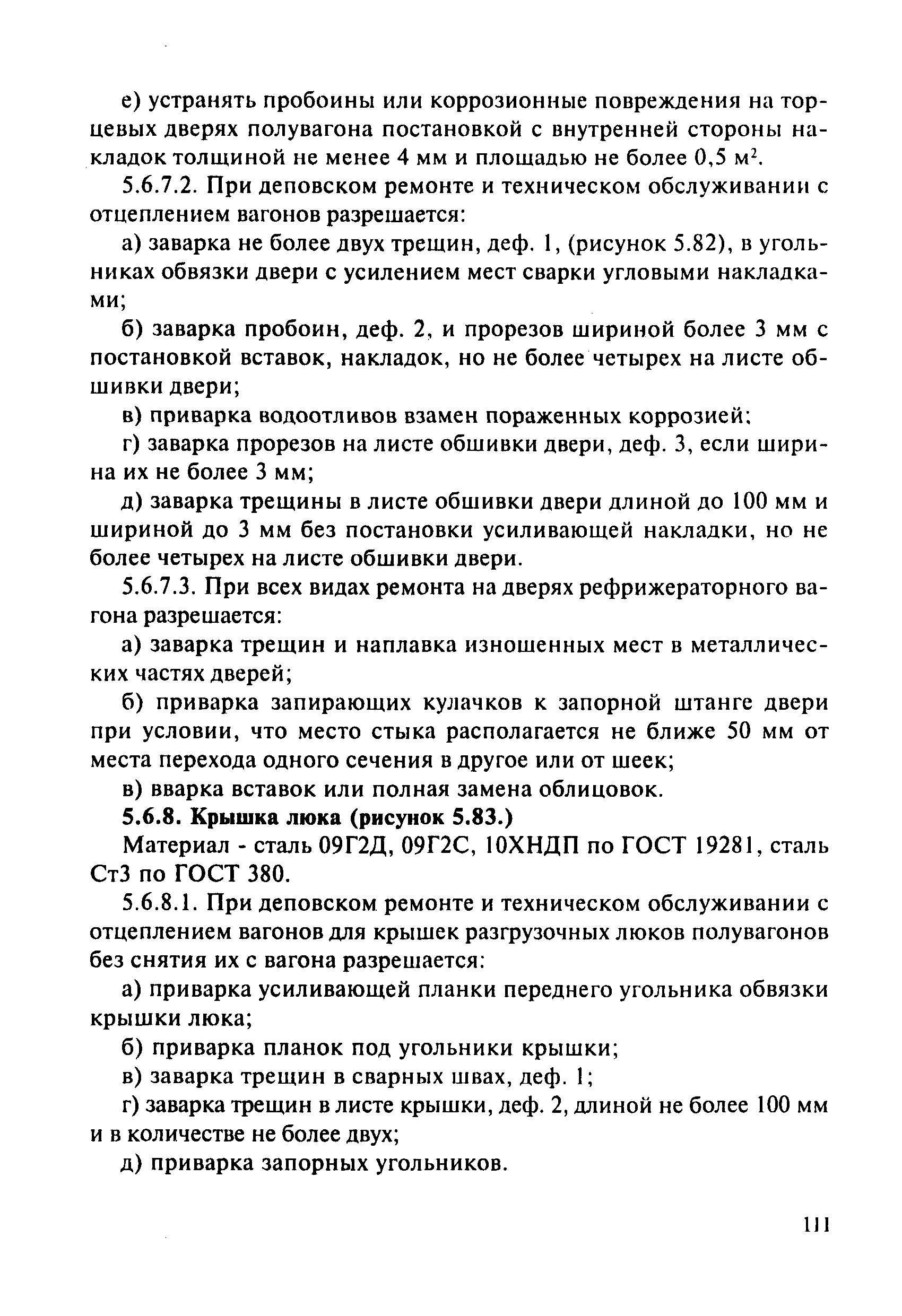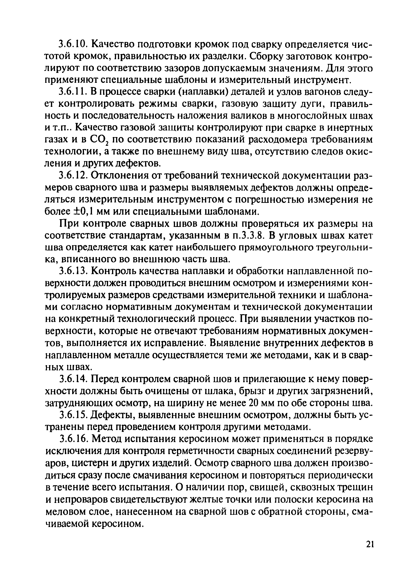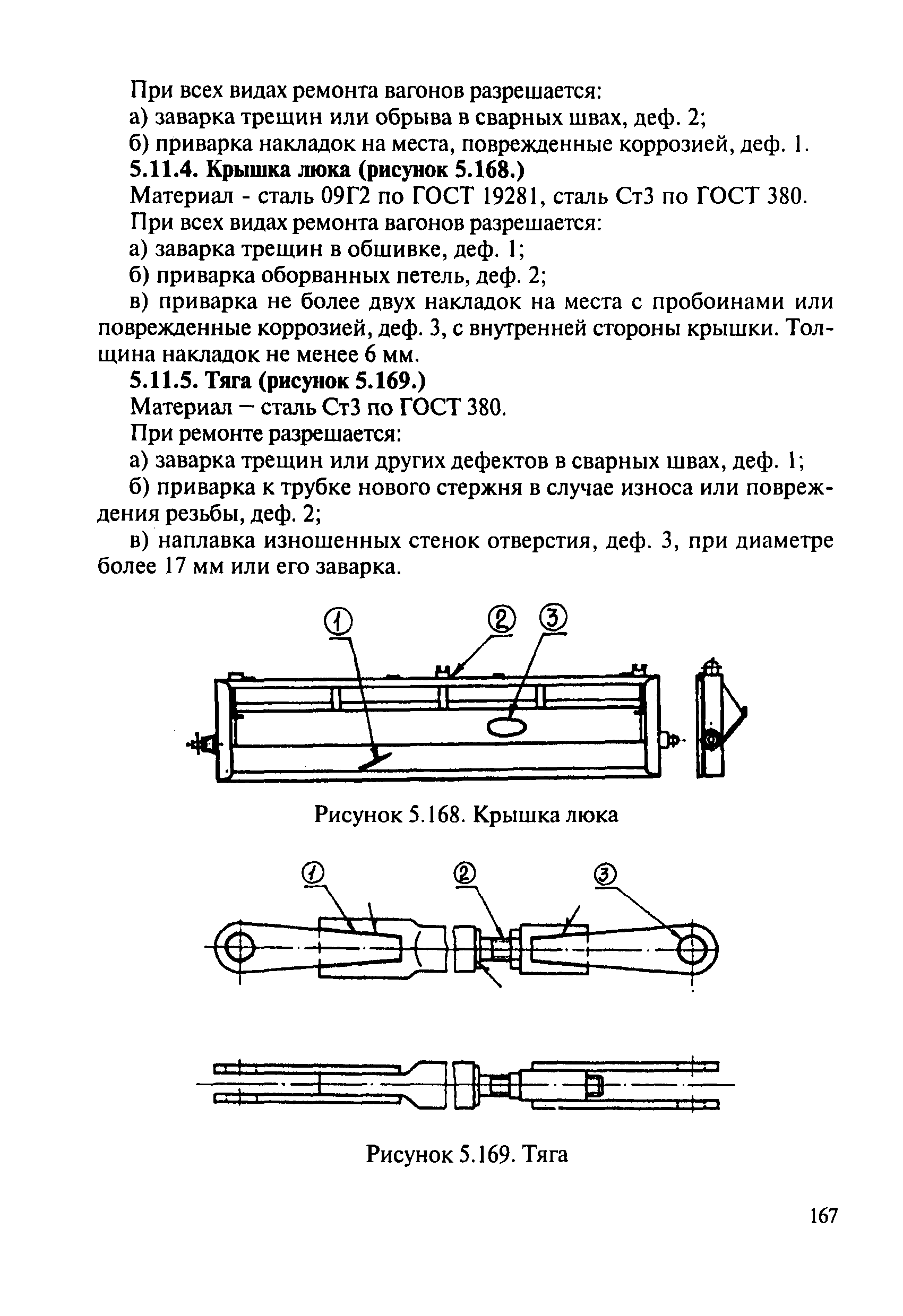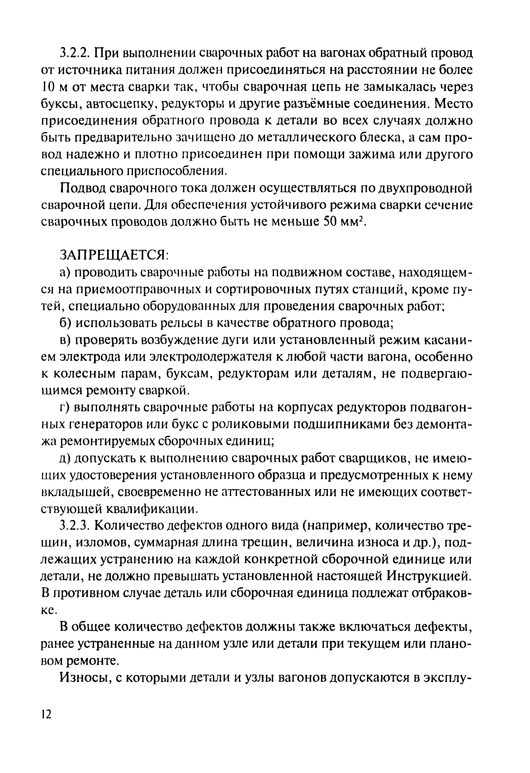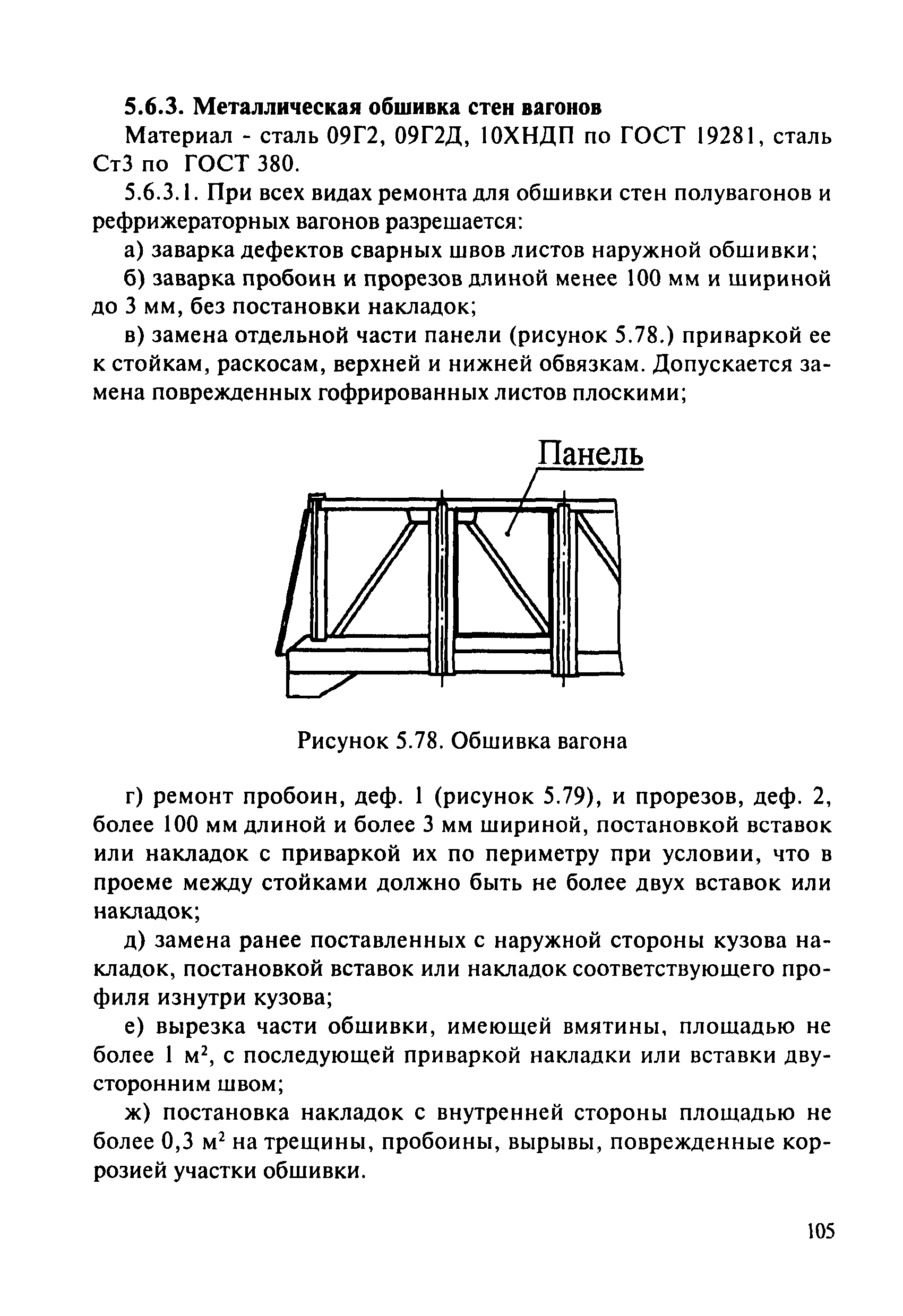 | Оглавление: | 1. Область применения 2. Нормативные ссылки 3. Основные указания по организации и выполнению сварочно-наплавочных работ 3.1 Организация сварочно-наплавочных работ 3.2 Общие требования к проведению сварочно-наплавочных работ 3.3 Подготовка узлов и деталей вагонов к сварке и наплавке 3.4 Наплавка изношенных поверхностей 3.5 Сварка 3.6 Контроль качества сварных соединений 3.7 Виды дефектов и способы их устранения 3.8 Заварка трещин и усиление поврежденных мест 3.9 Приемка выполненных работ 4. Требования безопасности и охраны окружающей среды 5. Требования к ремонту сваркой деталей и узлов 5.1 Тележка модели 18-100, 18-101 5.2 Тележка рефрижераторного типа КВЗ-И2 5.3 Детали тормозов 5.4 Автосцепное устройство 5.5 Вагонная рама и ее детали 5.6 Кузова вагонов 5.7 Внутреннее оборудование рефрижераторных вагонов секций ЦБ-5, БМЗ-5 и АРВ 5.8 Цистерны 5.9 Вагон для битума 5.10 Вагон (хоппер) для зерна, цемента, сырья минеральных удобрений 5.11 Хоппер-дозатор, вагон (хоппер) для горячих окатышей и агломерата |