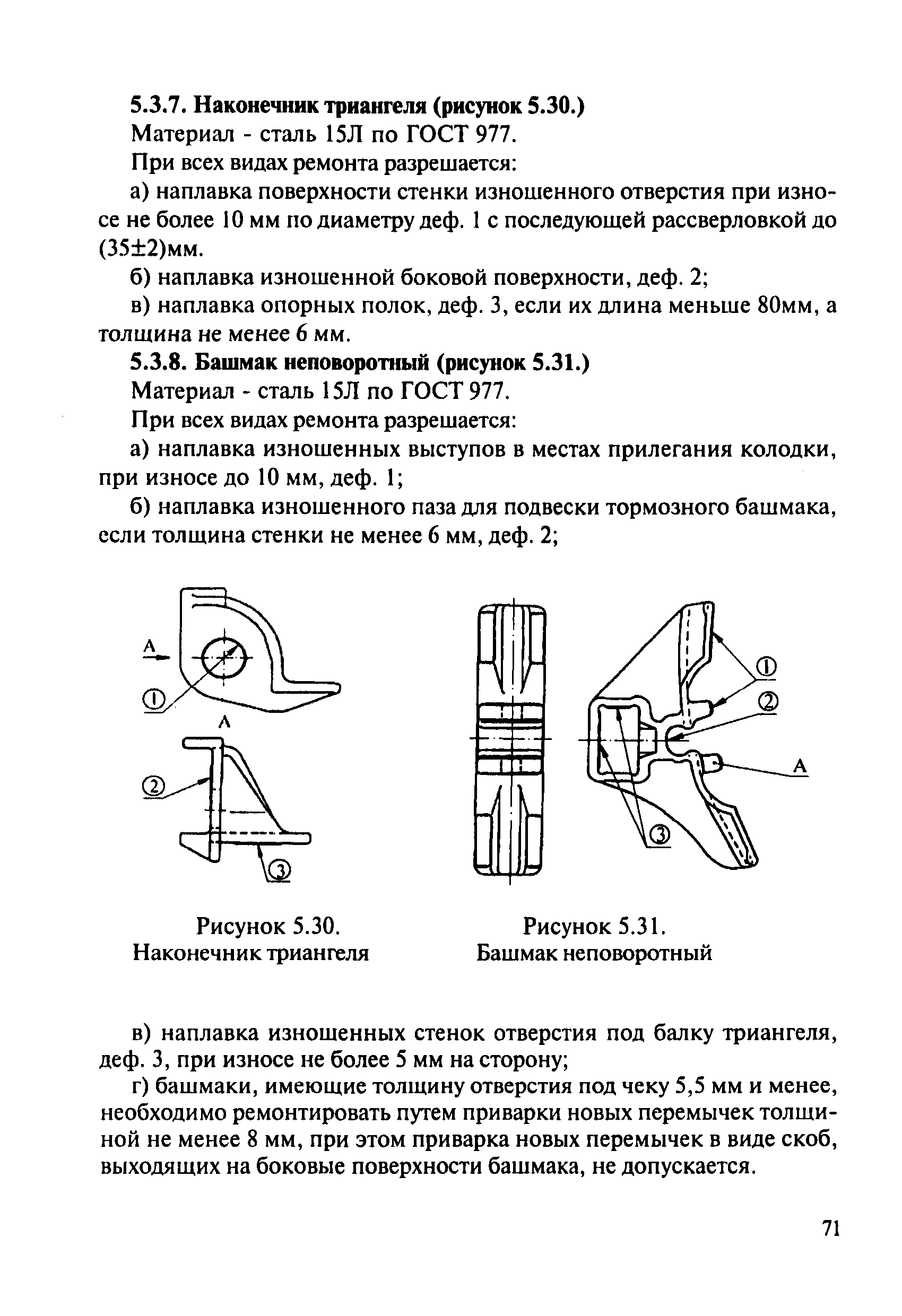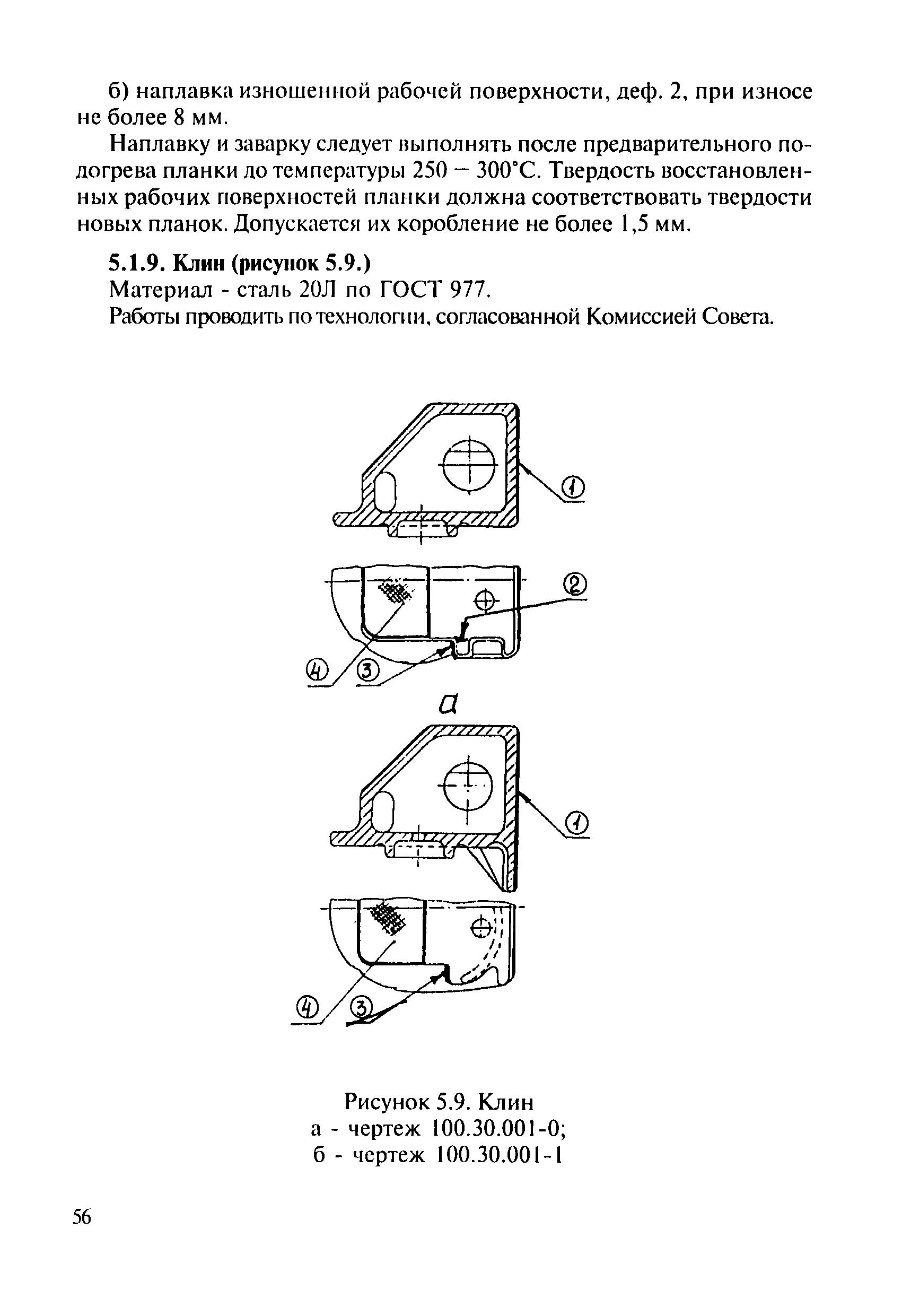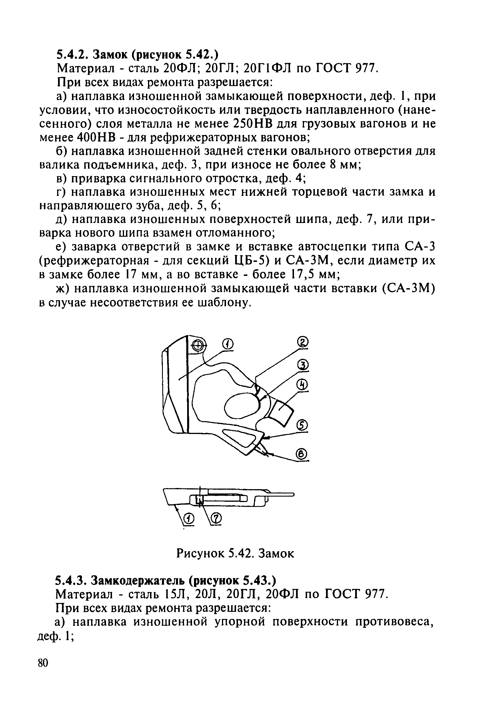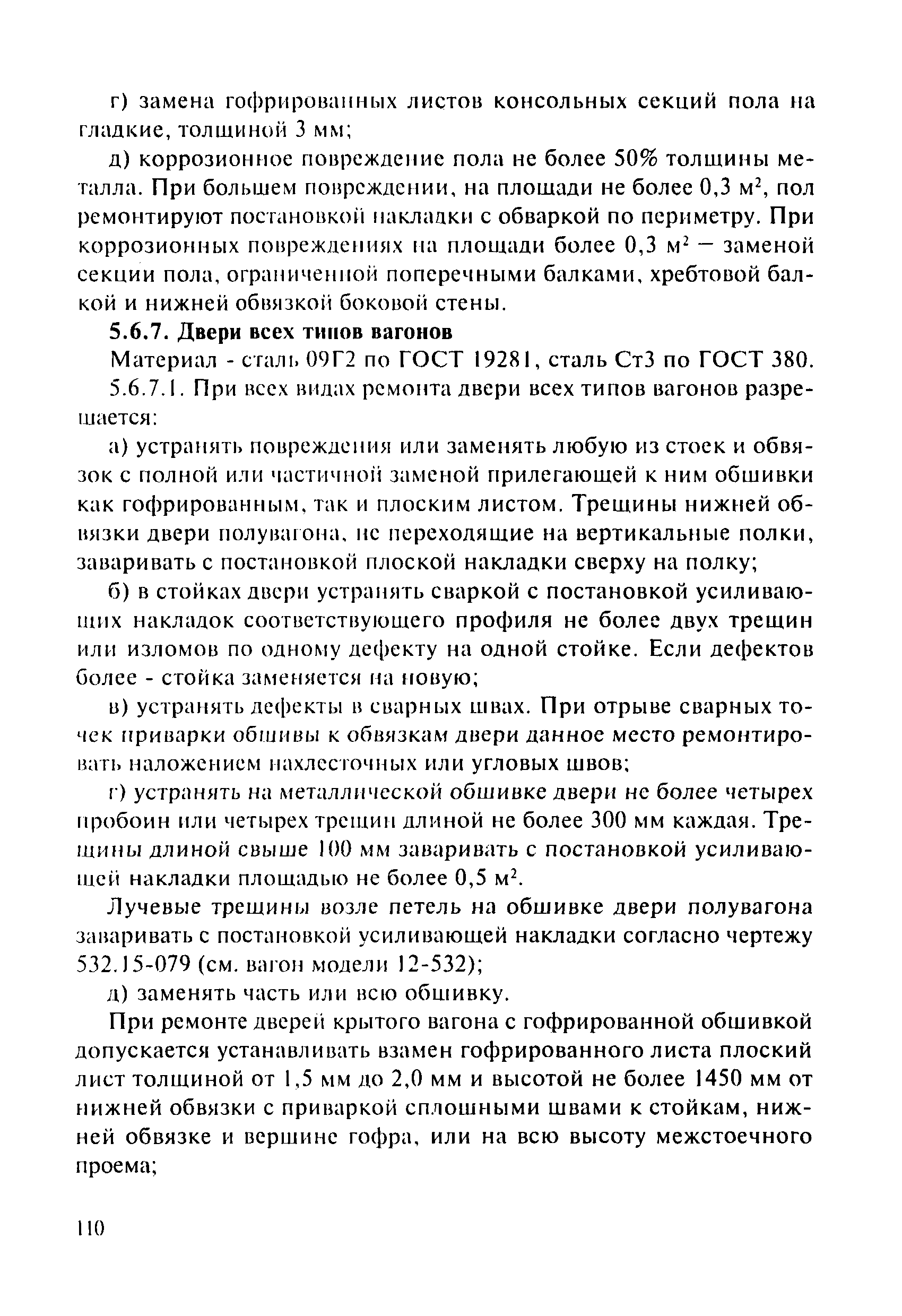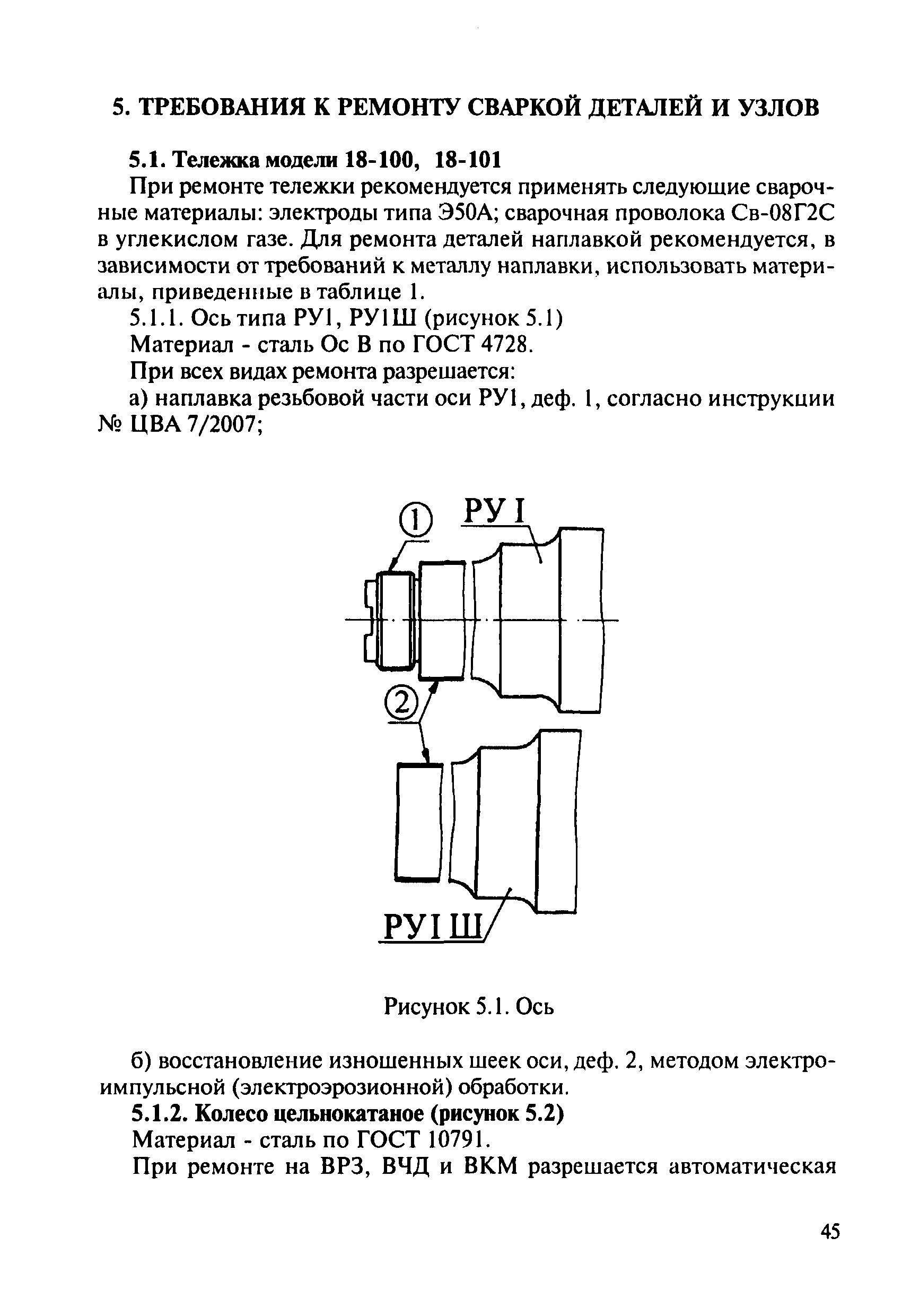 | Оглавление: | 1. Область применения 2. Нормативные ссылки 3. Основные указания по организации и выполнению сварочно-наплавочных работ 3.1 Организация сварочно-наплавочных работ 3.2 Общие требования к проведению сварочно-наплавочных работ 3.3 Подготовка узлов и деталей вагонов к сварке и наплавке 3.4 Наплавка изношенных поверхностей 3.5 Сварка 3.6 Контроль качества сварных соединений 3.7 Виды дефектов и способы их устранения 3.8 Заварка трещин и усиление поврежденных мест 3.9 Приемка выполненных работ 4. Требования безопасности и охраны окружающей среды 5. Требования к ремонту сваркой деталей и узлов 5.1 Тележка модели 18-100, 18-101 5.2 Тележка рефрижераторного типа КВЗ-И2 5.3 Детали тормозов 5.4 Автосцепное устройство 5.5 Вагонная рама и ее детали 5.6 Кузова вагонов 5.7 Внутреннее оборудование рефрижераторных вагонов секций ЦБ-5, БМЗ-5 и АРВ 5.8 Цистерны 5.9 Вагон для битума 5.10 Вагон (хоппер) для зерна, цемента, сырья минеральных удобрений 5.11 Хоппер-дозатор, вагон (хоппер) для горячих окатышей и агломерата |