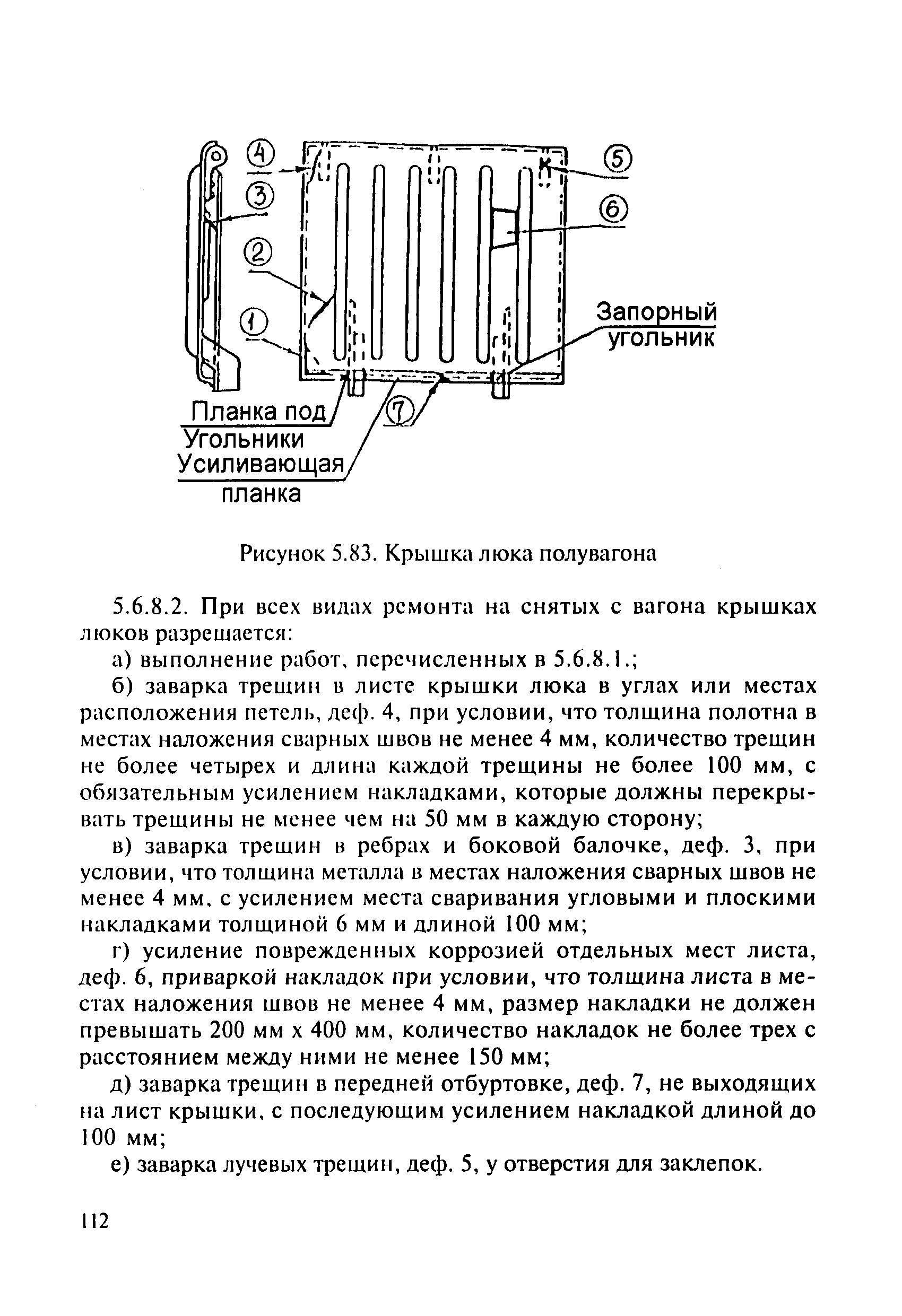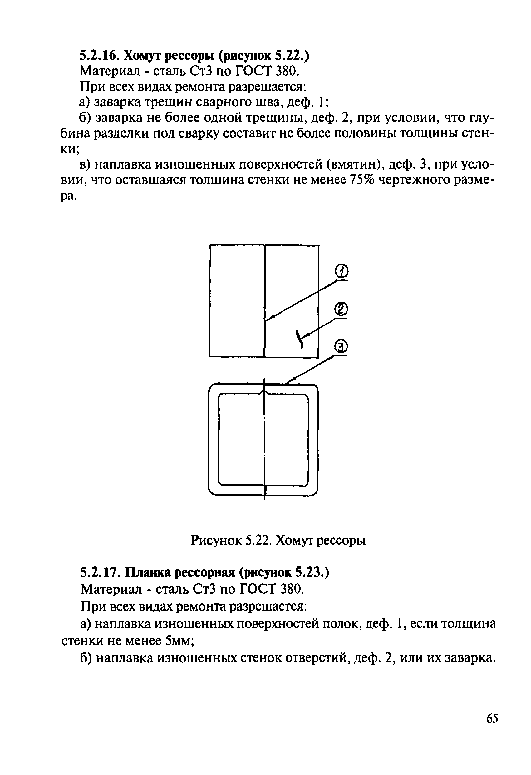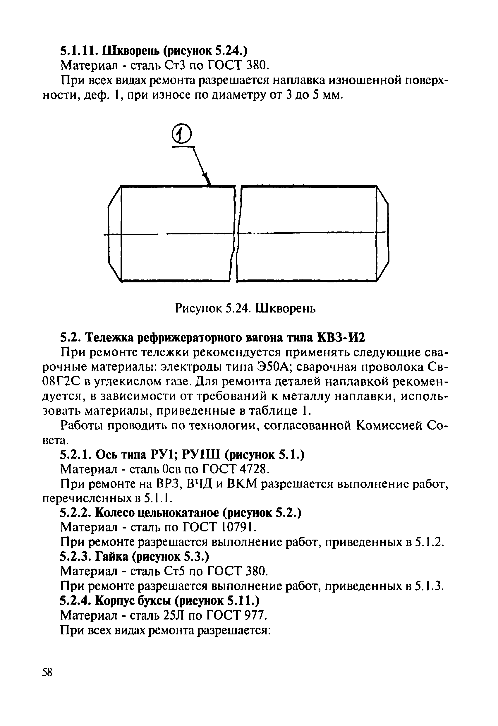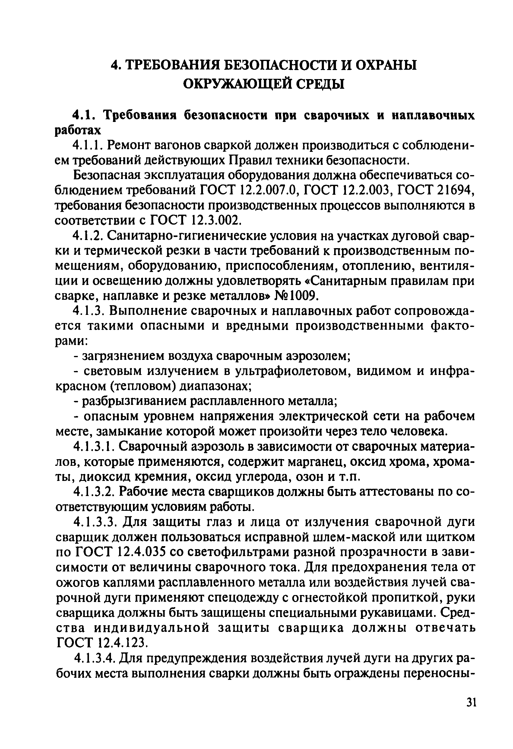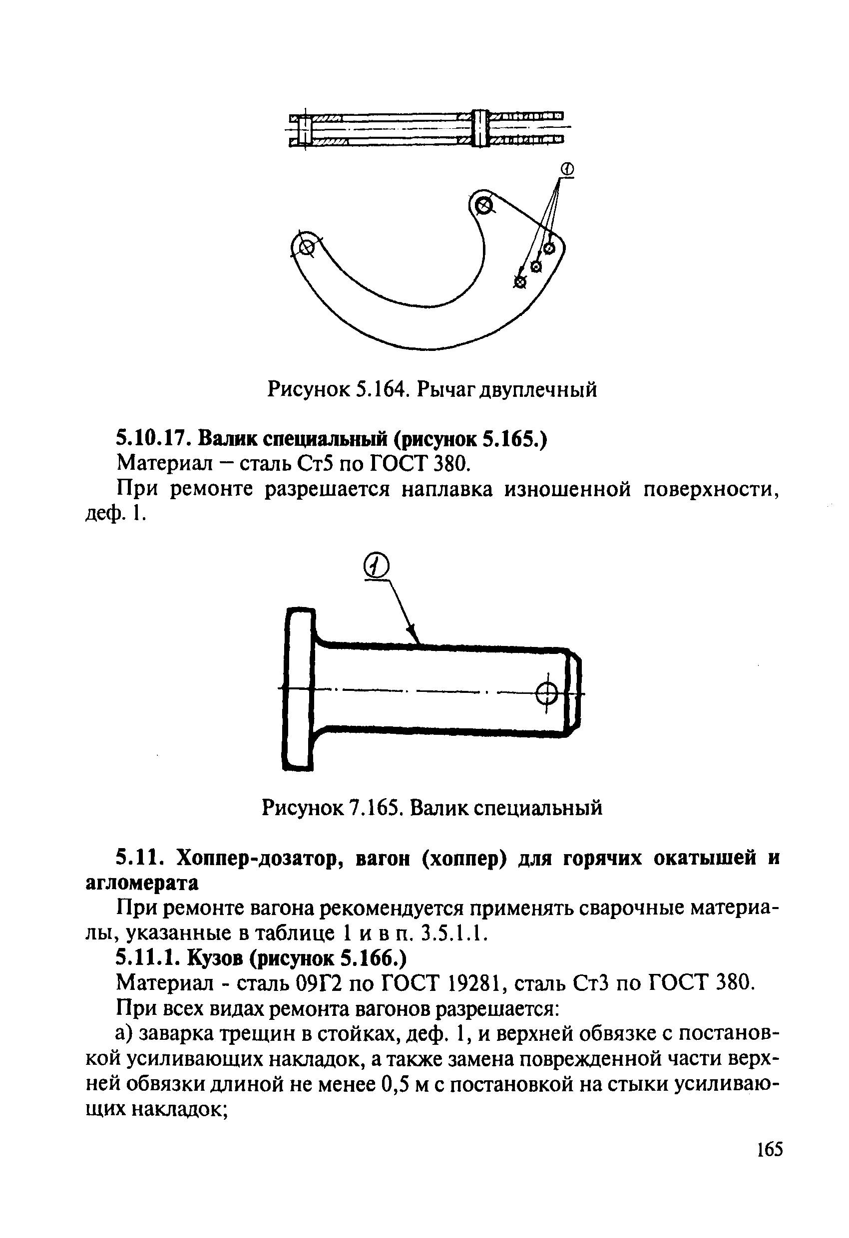 | Оглавление: | 1. Область применения 2. Нормативные ссылки 3. Основные указания по организации и выполнению сварочно-наплавочных работ 3.1 Организация сварочно-наплавочных работ 3.2 Общие требования к проведению сварочно-наплавочных работ 3.3 Подготовка узлов и деталей вагонов к сварке и наплавке 3.4 Наплавка изношенных поверхностей 3.5 Сварка 3.6 Контроль качества сварных соединений 3.7 Виды дефектов и способы их устранения 3.8 Заварка трещин и усиление поврежденных мест 3.9 Приемка выполненных работ 4. Требования безопасности и охраны окружающей среды 5. Требования к ремонту сваркой деталей и узлов 5.1 Тележка модели 18-100, 18-101 5.2 Тележка рефрижераторного типа КВЗ-И2 5.3 Детали тормозов 5.4 Автосцепное устройство 5.5 Вагонная рама и ее детали 5.6 Кузова вагонов 5.7 Внутреннее оборудование рефрижераторных вагонов секций ЦБ-5, БМЗ-5 и АРВ 5.8 Цистерны 5.9 Вагон для битума 5.10 Вагон (хоппер) для зерна, цемента, сырья минеральных удобрений 5.11 Хоппер-дозатор, вагон (хоппер) для горячих окатышей и агломерата |