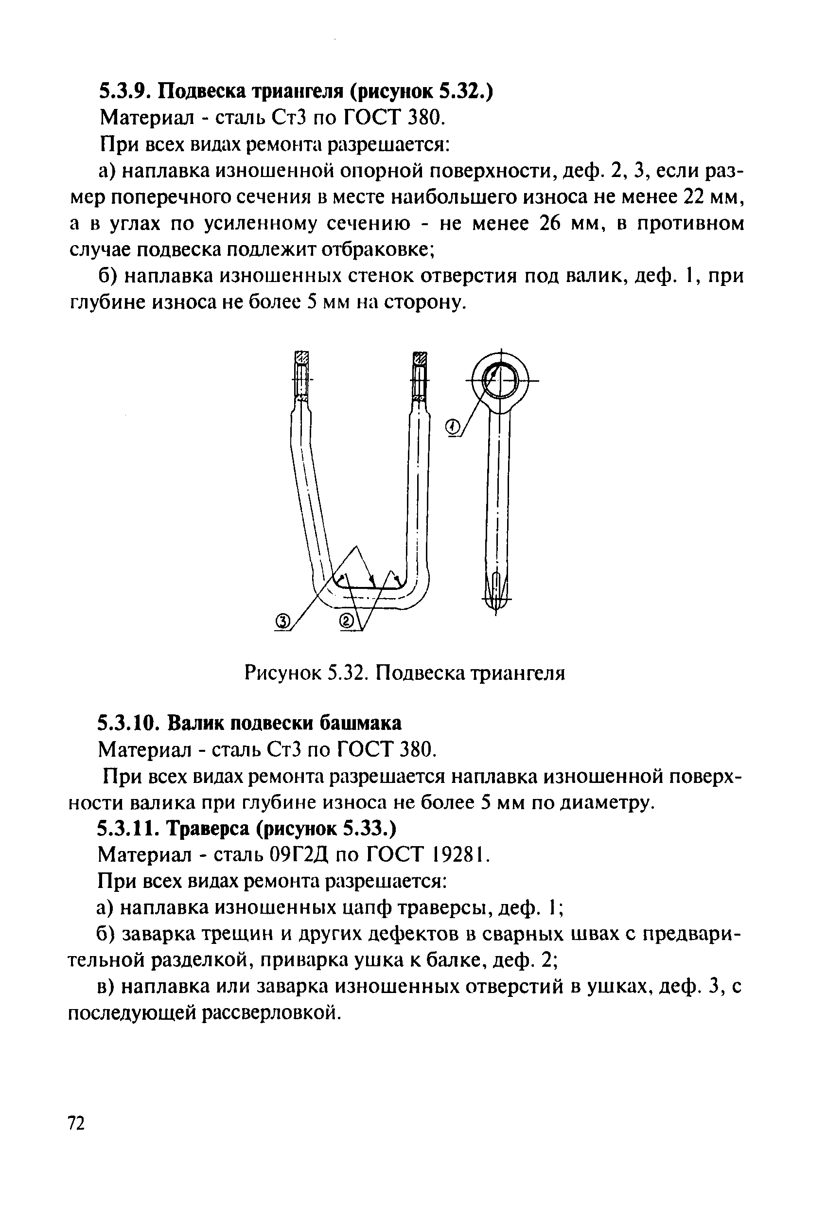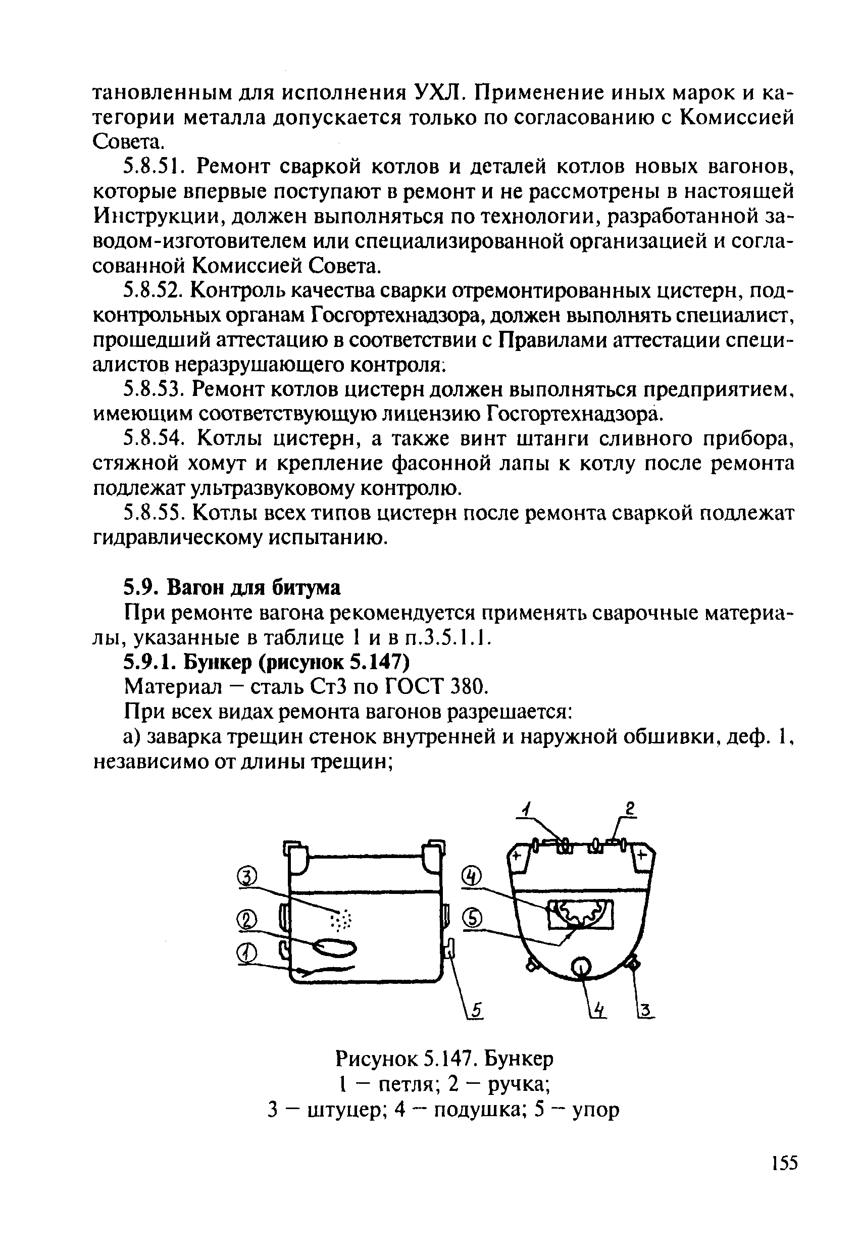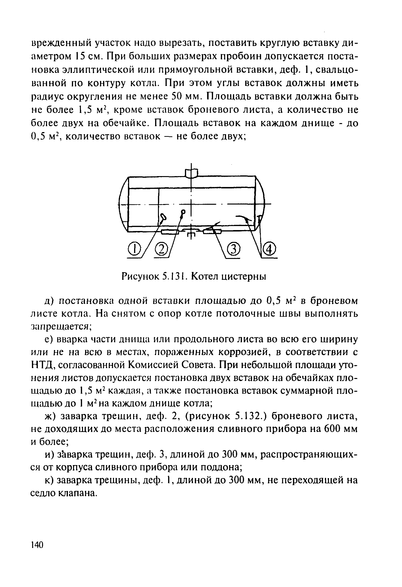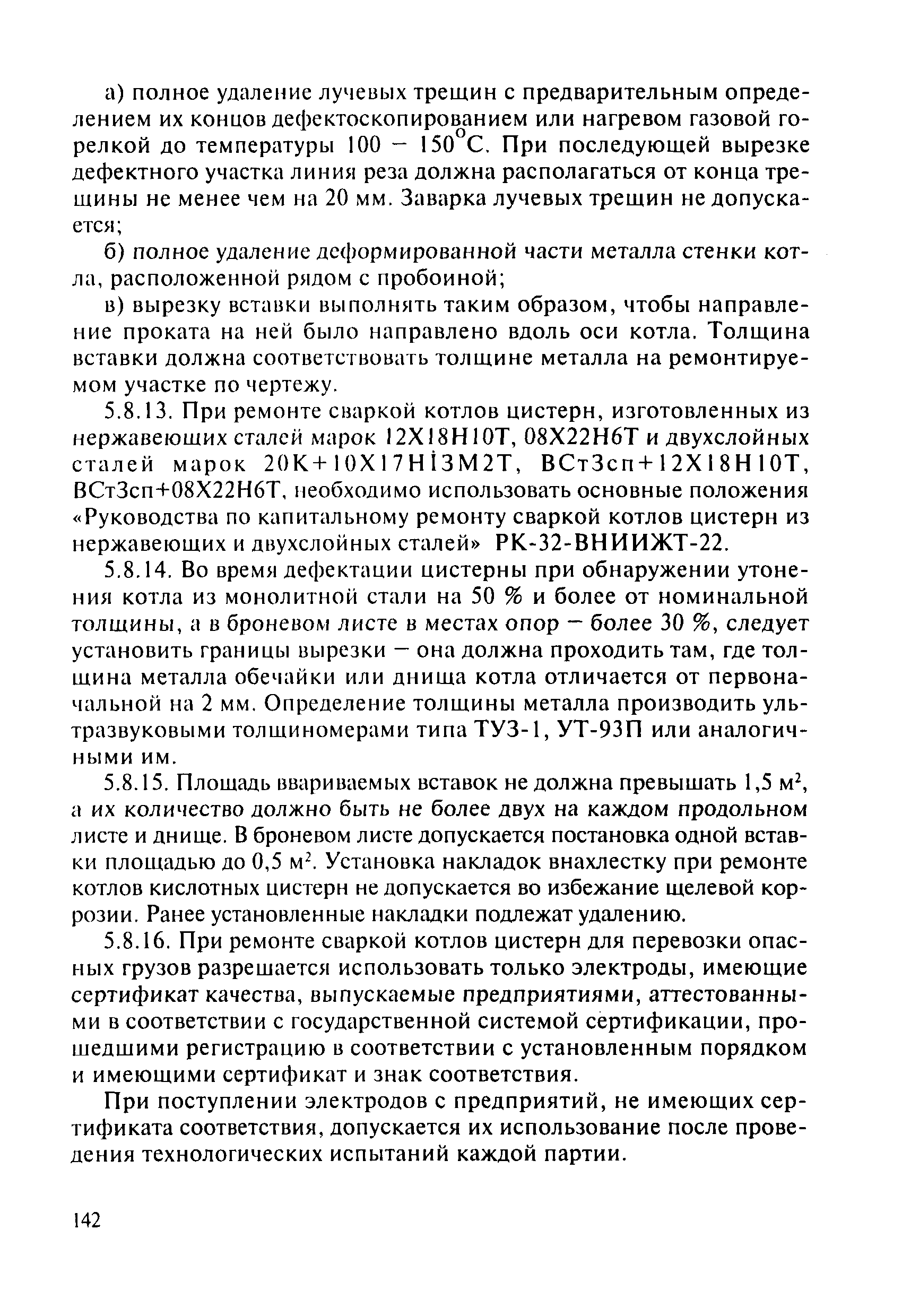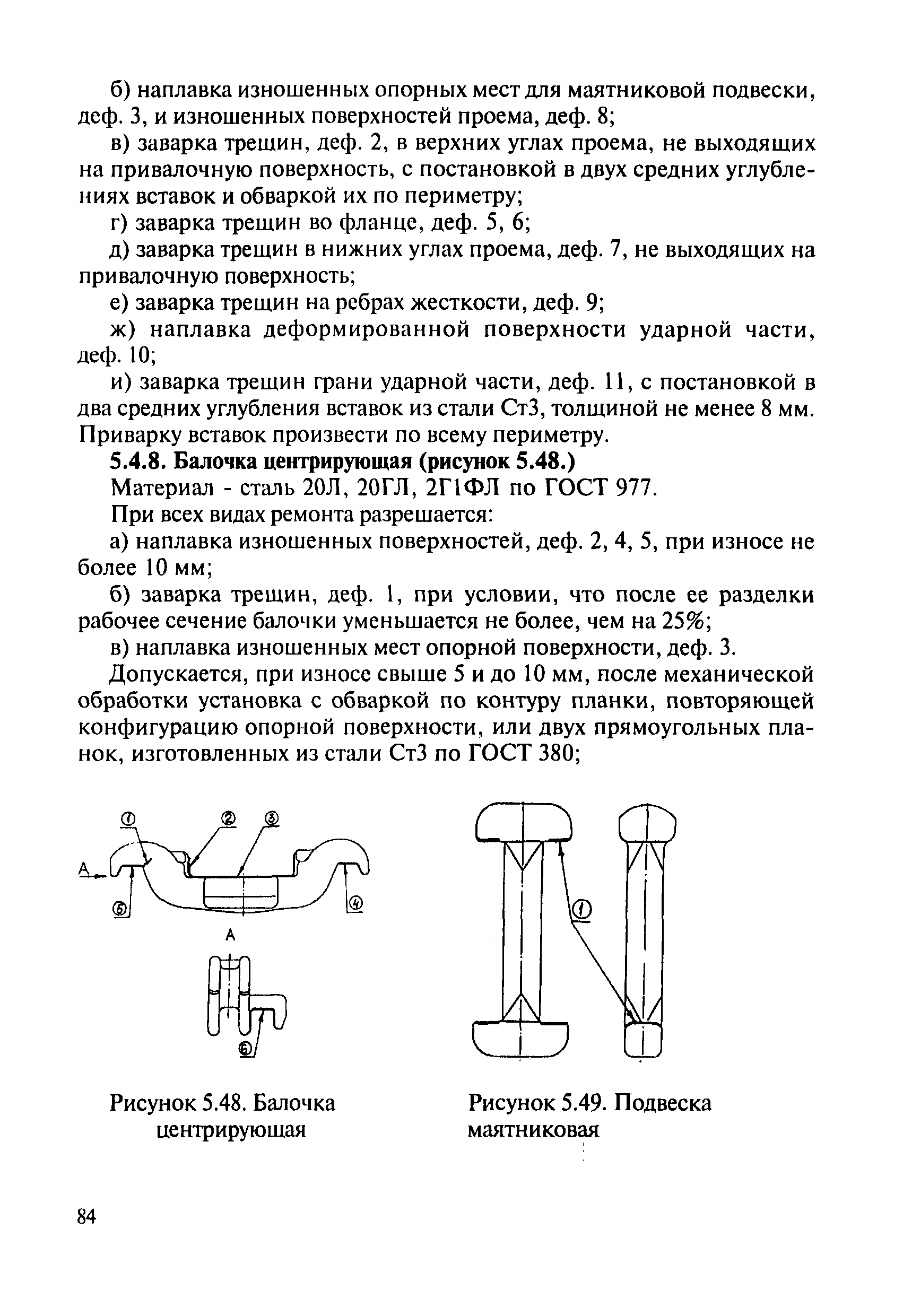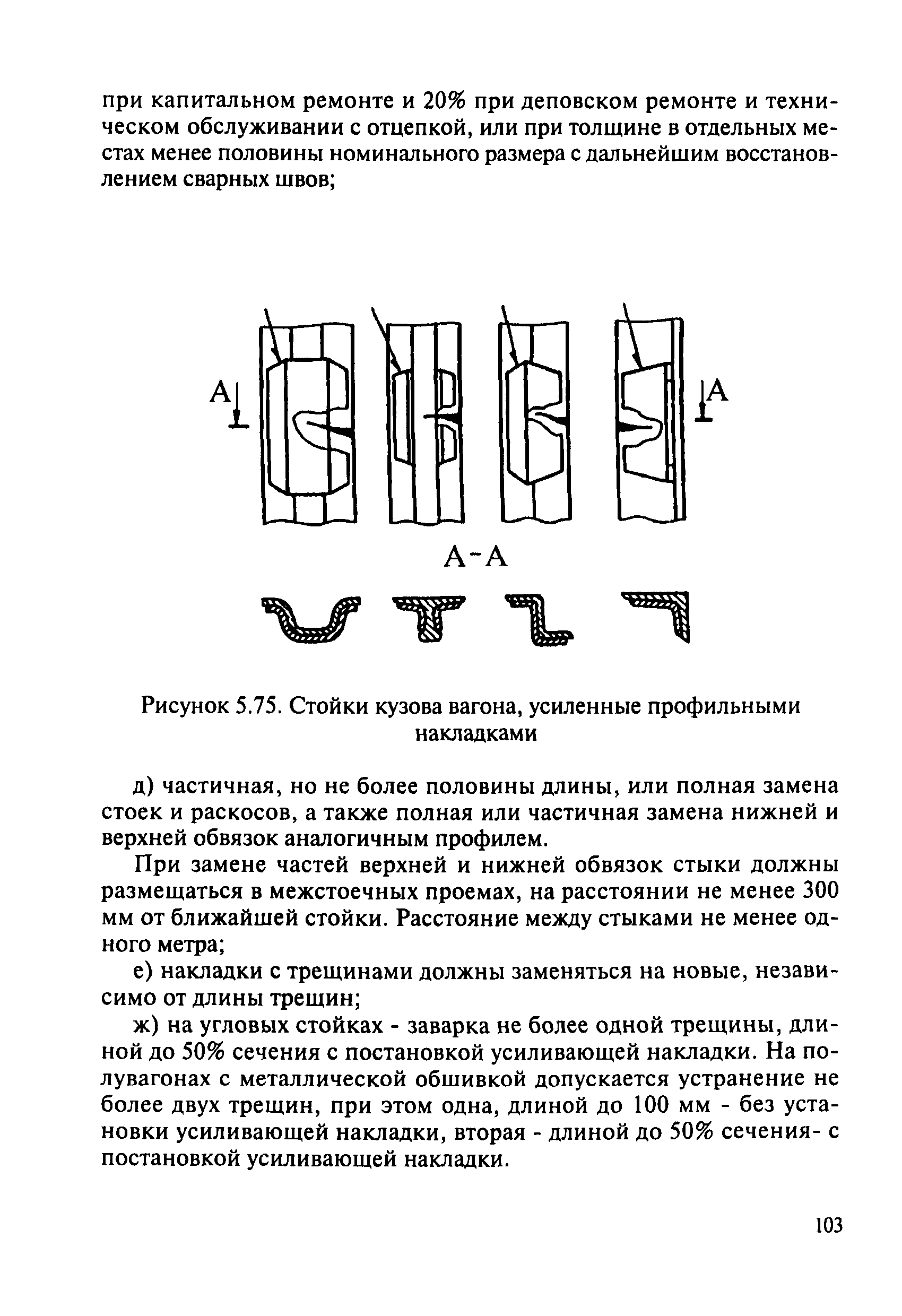| Оглавление: | 1. Область применения 2. Нормативные ссылки 3. Основные указания по организации и выполнению сварочно-наплавочных работ 3.1 Организация сварочно-наплавочных работ 3.2 Общие требования к проведению сварочно-наплавочных работ 3.3 Подготовка узлов и деталей вагонов к сварке и наплавке 3.4 Наплавка изношенных поверхностей 3.5 Сварка 3.6 Контроль качества сварных соединений 3.7 Виды дефектов и способы их устранения 3.8 Заварка трещин и усиление поврежденных мест 3.9 Приемка выполненных работ 4. Требования безопасности и охраны окружающей среды 5. Требования к ремонту сваркой деталей и узлов 5.1 Тележка модели 18-100, 18-101 5.2 Тележка рефрижераторного типа КВЗ-И2 5.3 Детали тормозов 5.4 Автосцепное устройство 5.5 Вагонная рама и ее детали 5.6 Кузова вагонов 5.7 Внутреннее оборудование рефрижераторных вагонов секций ЦБ-5, БМЗ-5 и АРВ 5.8 Цистерны 5.9 Вагон для битума 5.10 Вагон (хоппер) для зерна, цемента, сырья минеральных удобрений 5.11 Хоппер-дозатор, вагон (хоппер) для горячих окатышей и агломерата |