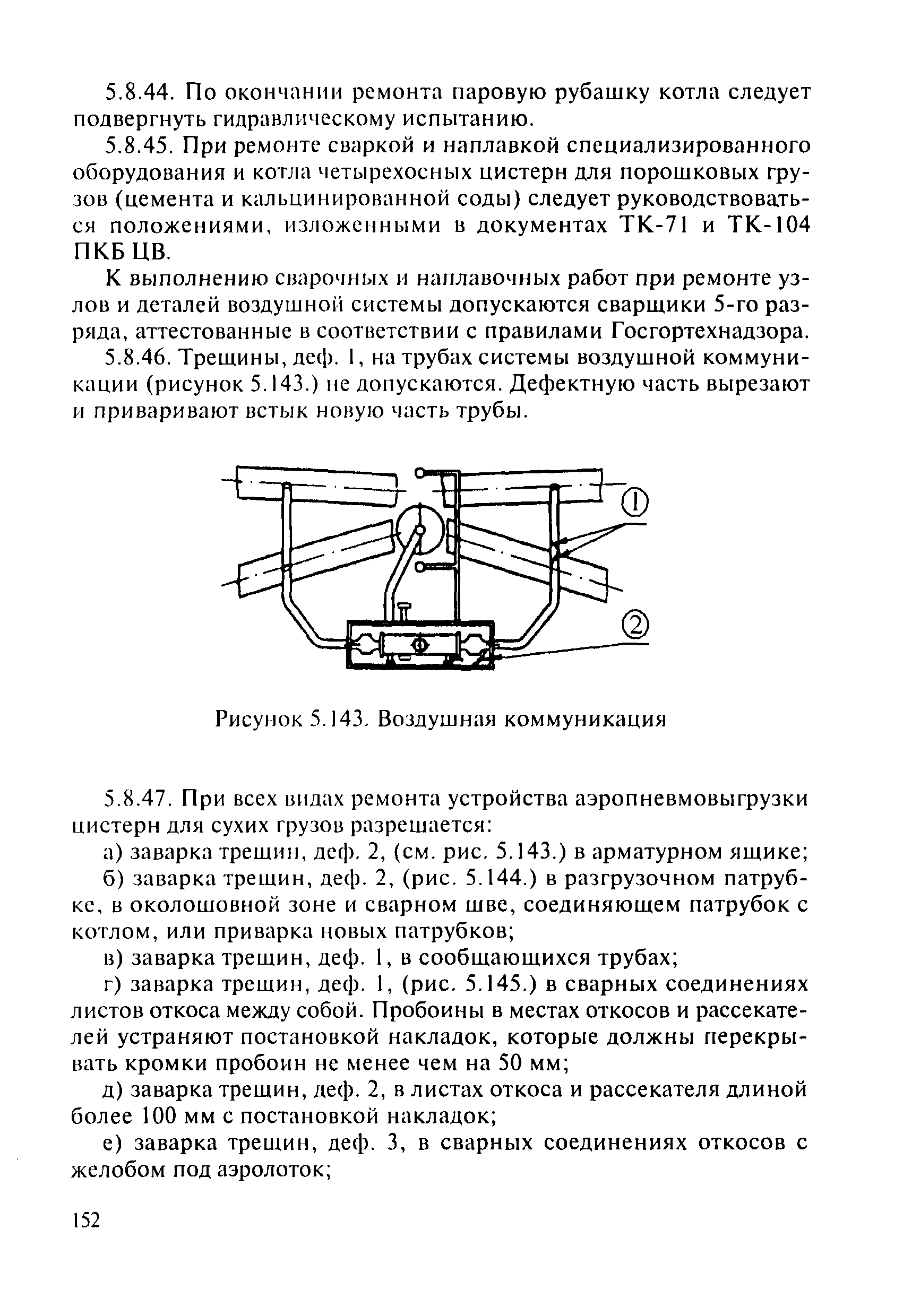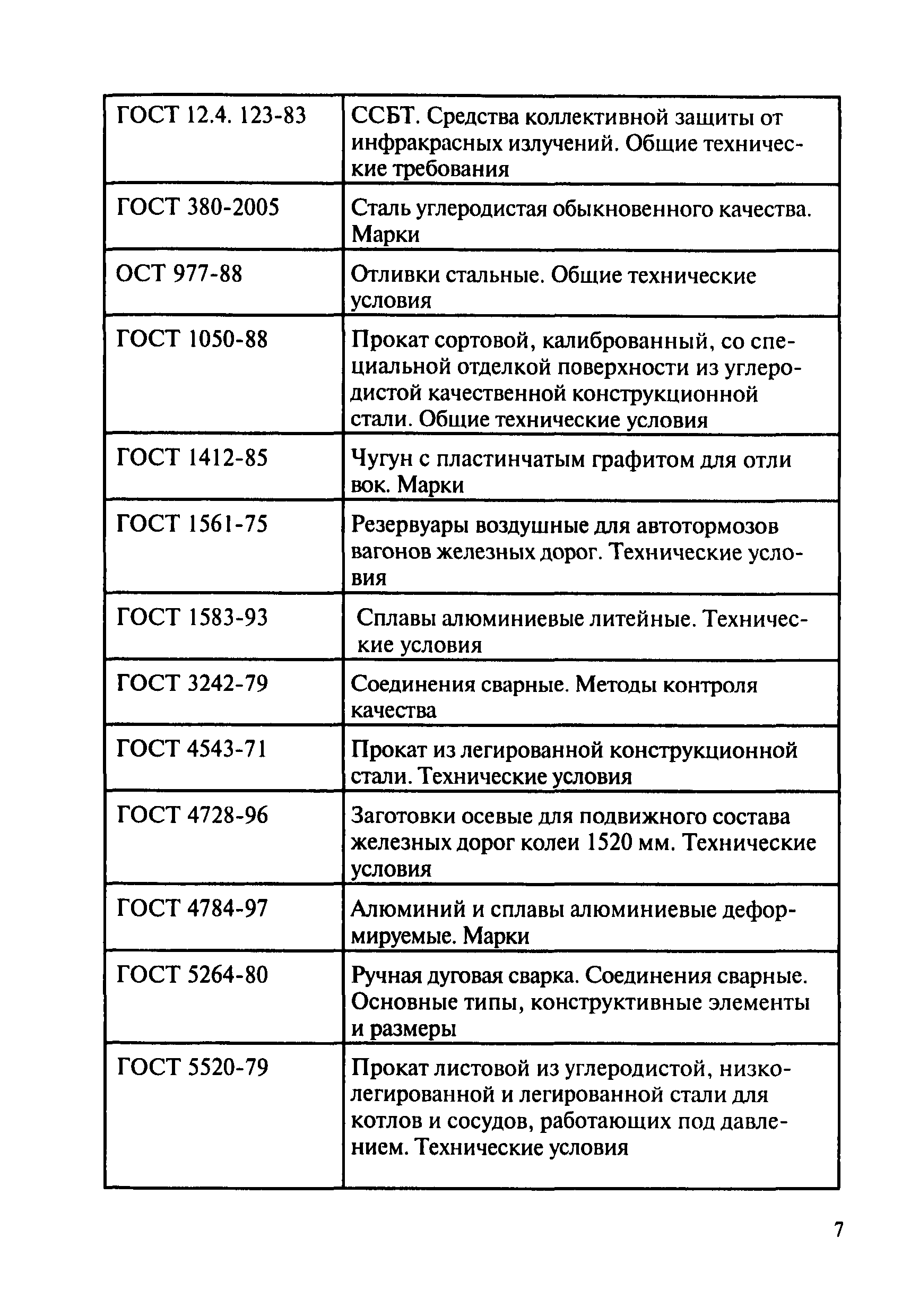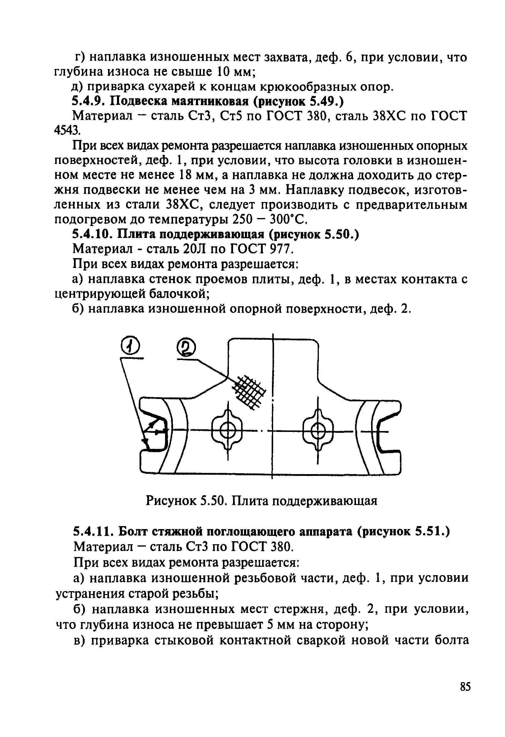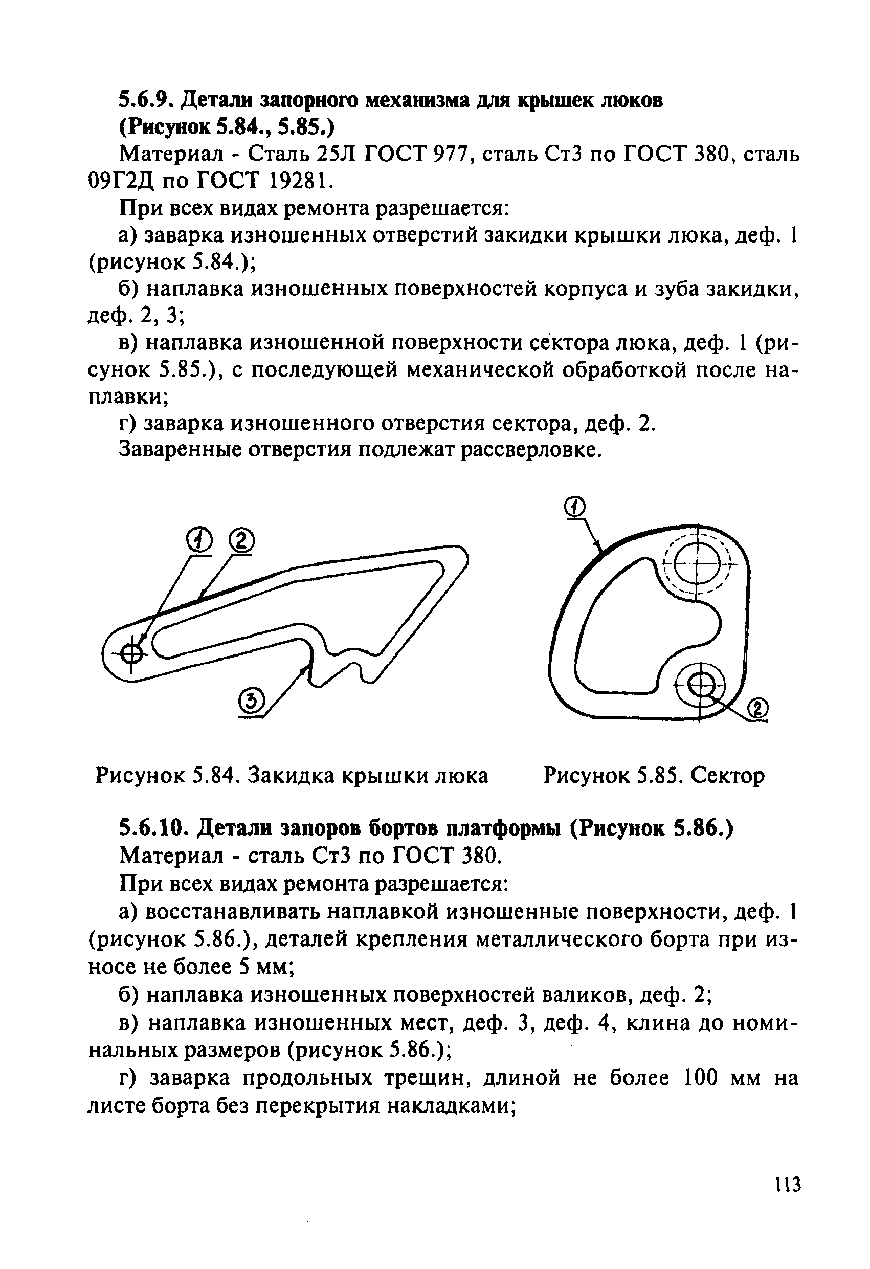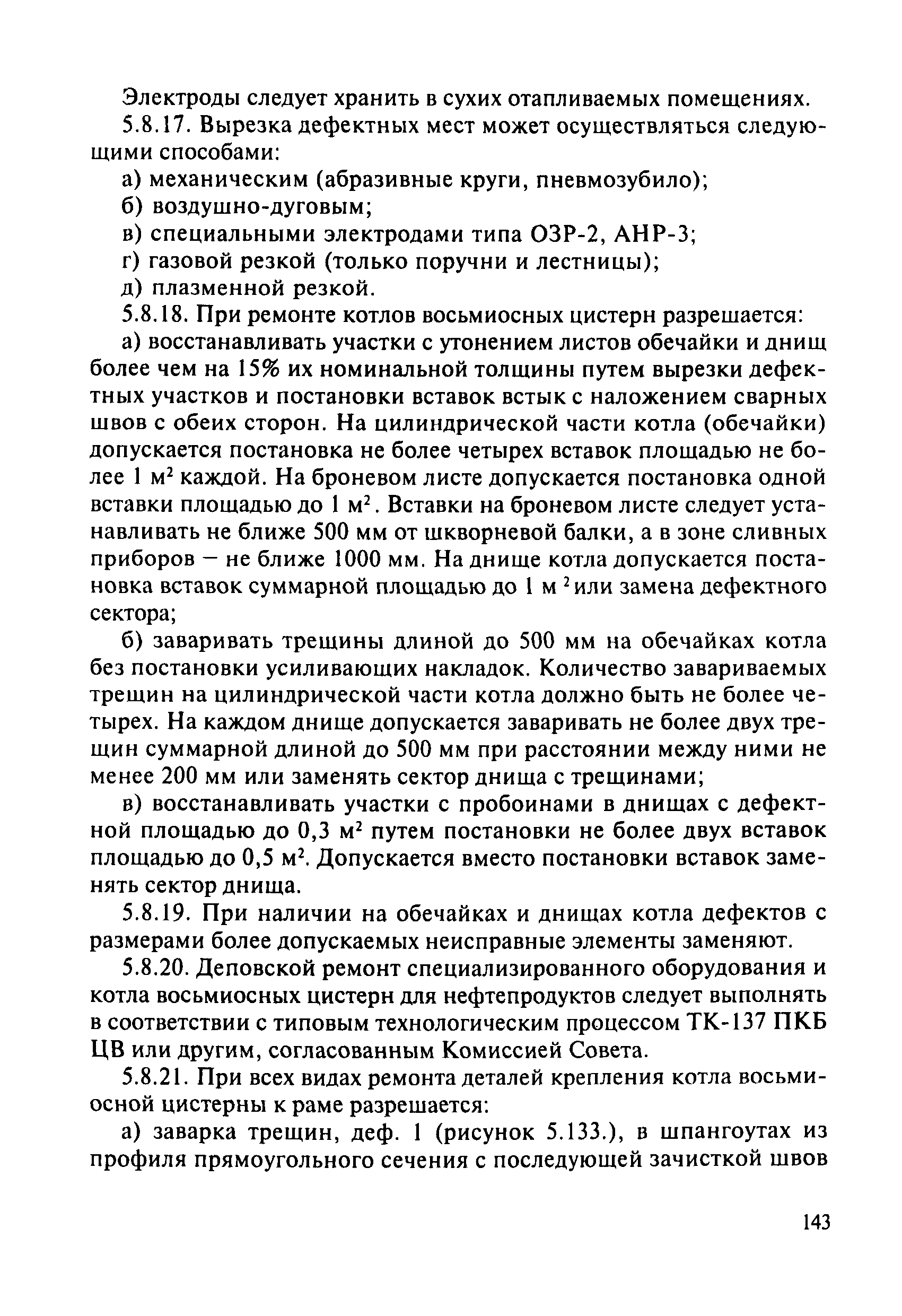 | Оглавление: | 1. Область применения 2. Нормативные ссылки 3. Основные указания по организации и выполнению сварочно-наплавочных работ 3.1 Организация сварочно-наплавочных работ 3.2 Общие требования к проведению сварочно-наплавочных работ 3.3 Подготовка узлов и деталей вагонов к сварке и наплавке 3.4 Наплавка изношенных поверхностей 3.5 Сварка 3.6 Контроль качества сварных соединений 3.7 Виды дефектов и способы их устранения 3.8 Заварка трещин и усиление поврежденных мест 3.9 Приемка выполненных работ 4. Требования безопасности и охраны окружающей среды 5. Требования к ремонту сваркой деталей и узлов 5.1 Тележка модели 18-100, 18-101 5.2 Тележка рефрижераторного типа КВЗ-И2 5.3 Детали тормозов 5.4 Автосцепное устройство 5.5 Вагонная рама и ее детали 5.6 Кузова вагонов 5.7 Внутреннее оборудование рефрижераторных вагонов секций ЦБ-5, БМЗ-5 и АРВ 5.8 Цистерны 5.9 Вагон для битума 5.10 Вагон (хоппер) для зерна, цемента, сырья минеральных удобрений 5.11 Хоппер-дозатор, вагон (хоппер) для горячих окатышей и агломерата |