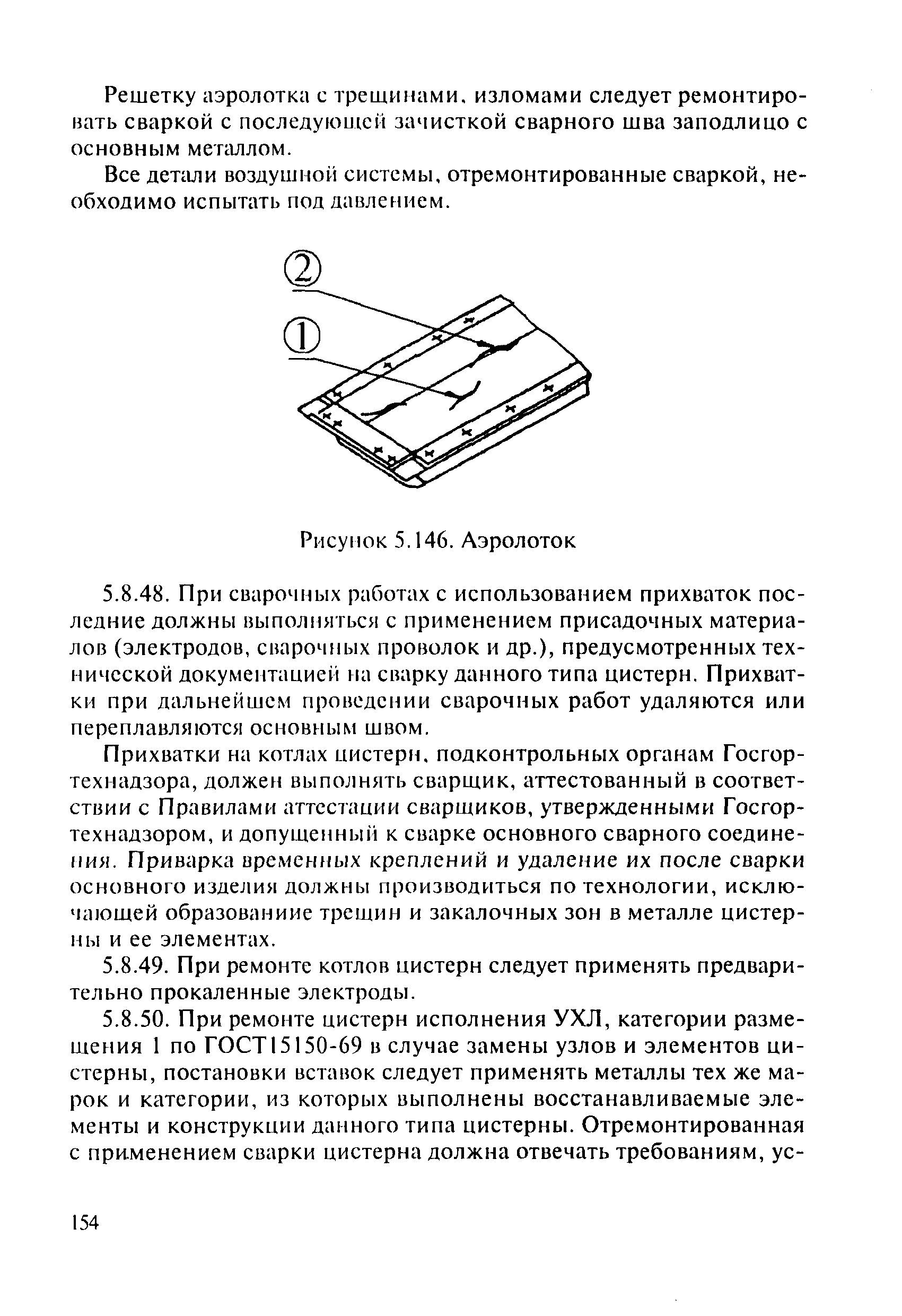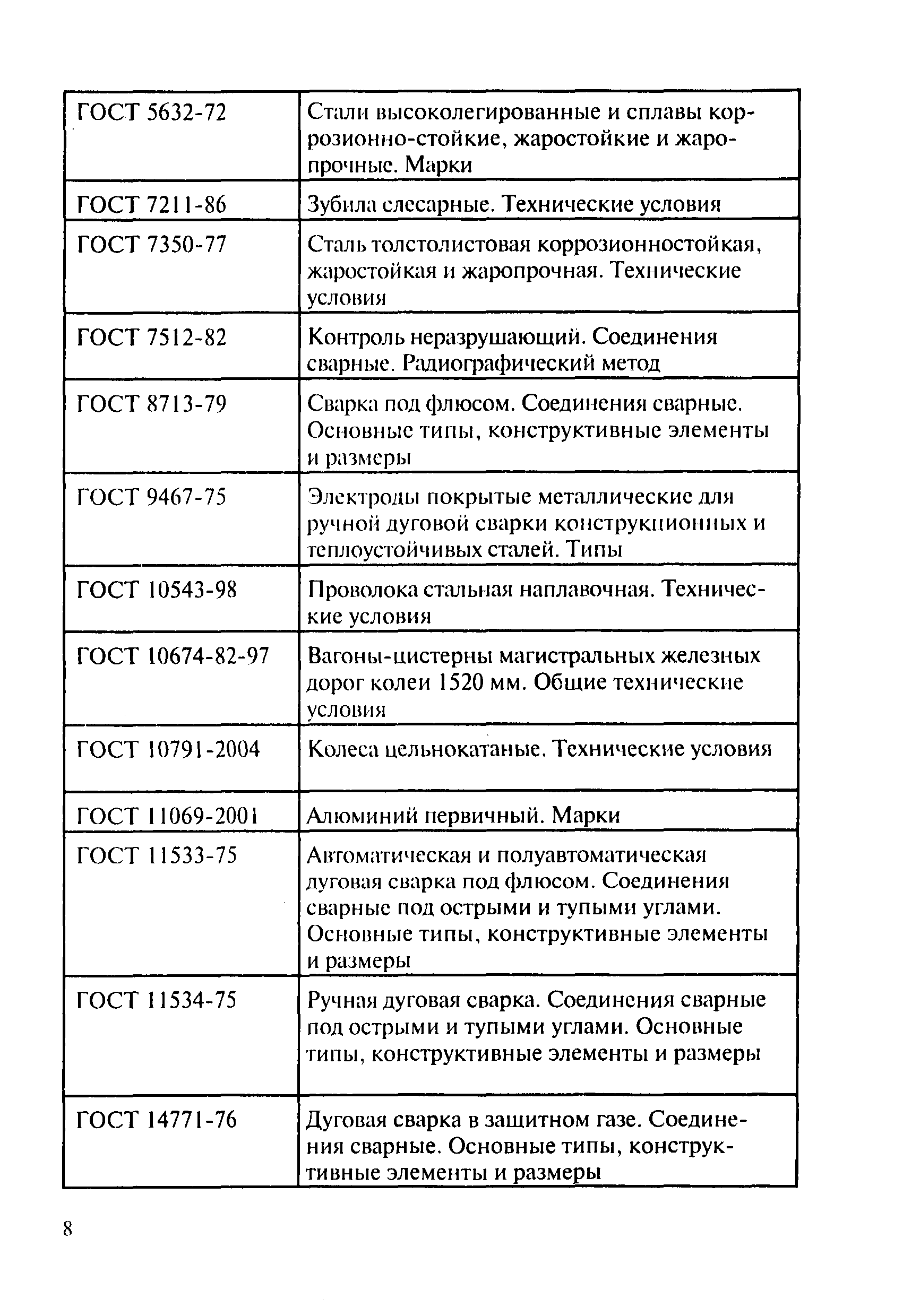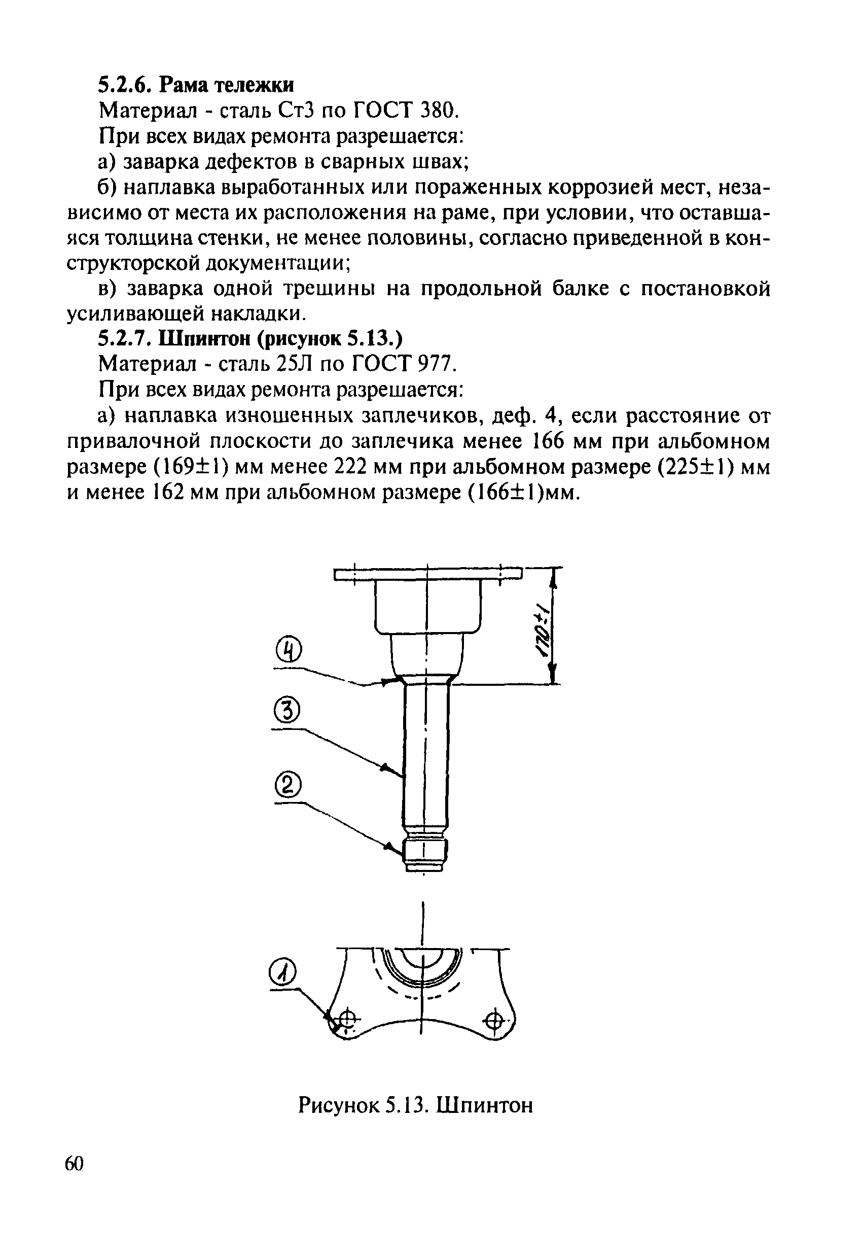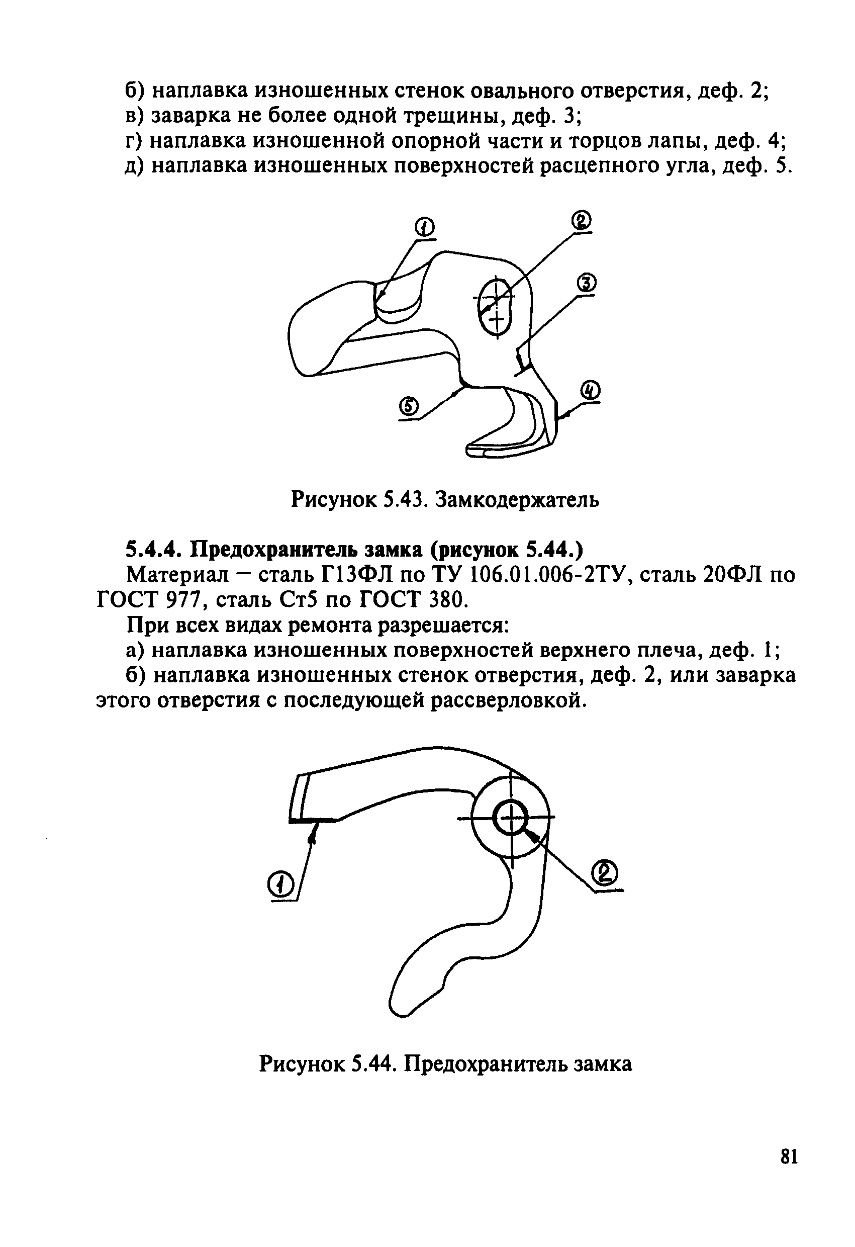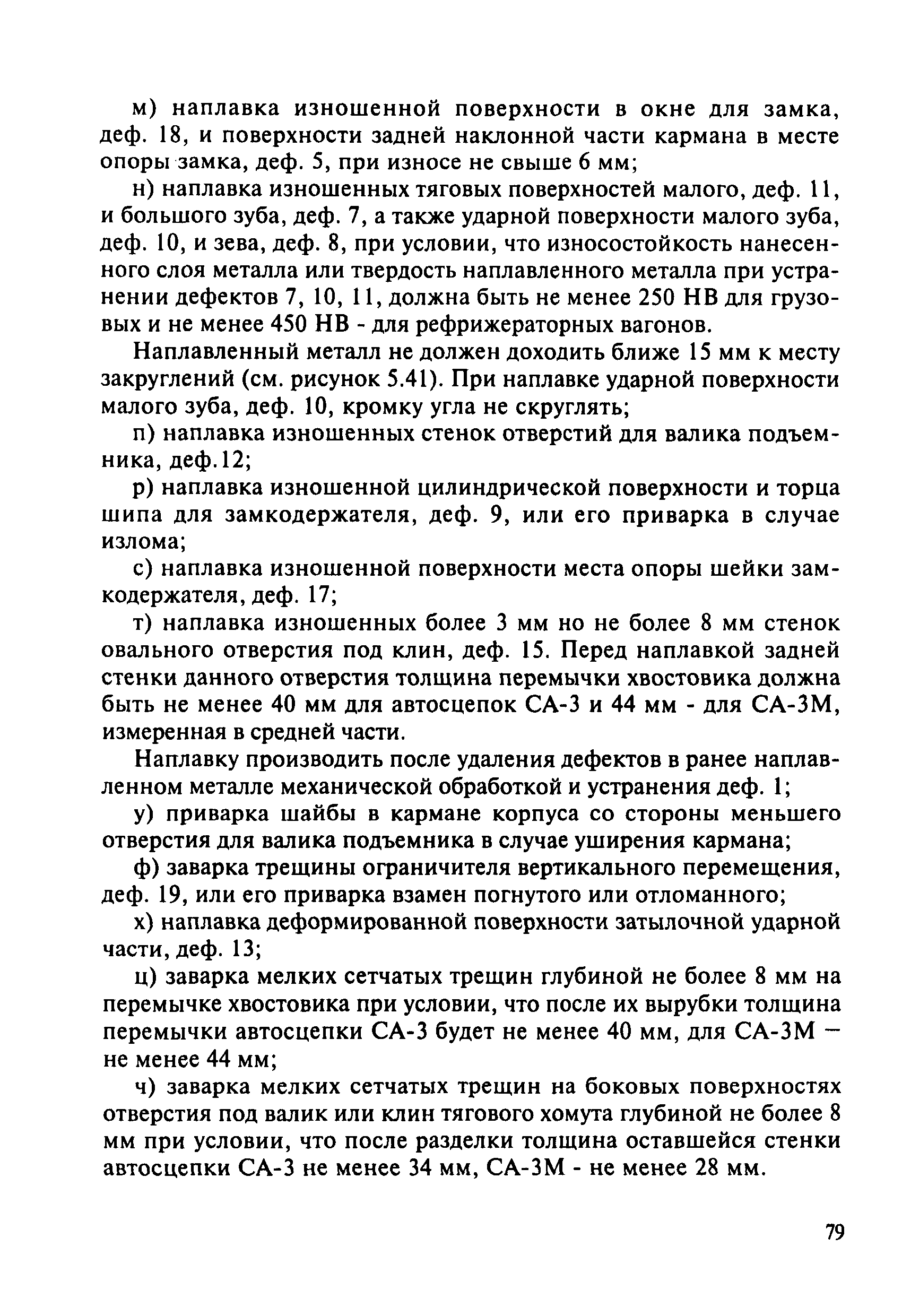 | Оглавление: | 1. Область применения 2. Нормативные ссылки 3. Основные указания по организации и выполнению сварочно-наплавочных работ 3.1 Организация сварочно-наплавочных работ 3.2 Общие требования к проведению сварочно-наплавочных работ 3.3 Подготовка узлов и деталей вагонов к сварке и наплавке 3.4 Наплавка изношенных поверхностей 3.5 Сварка 3.6 Контроль качества сварных соединений 3.7 Виды дефектов и способы их устранения 3.8 Заварка трещин и усиление поврежденных мест 3.9 Приемка выполненных работ 4. Требования безопасности и охраны окружающей среды 5. Требования к ремонту сваркой деталей и узлов 5.1 Тележка модели 18-100, 18-101 5.2 Тележка рефрижераторного типа КВЗ-И2 5.3 Детали тормозов 5.4 Автосцепное устройство 5.5 Вагонная рама и ее детали 5.6 Кузова вагонов 5.7 Внутреннее оборудование рефрижераторных вагонов секций ЦБ-5, БМЗ-5 и АРВ 5.8 Цистерны 5.9 Вагон для битума 5.10 Вагон (хоппер) для зерна, цемента, сырья минеральных удобрений 5.11 Хоппер-дозатор, вагон (хоппер) для горячих окатышей и агломерата |