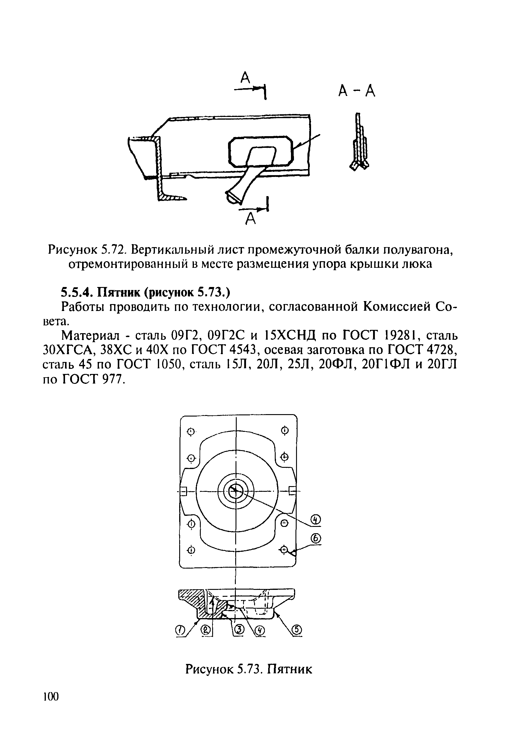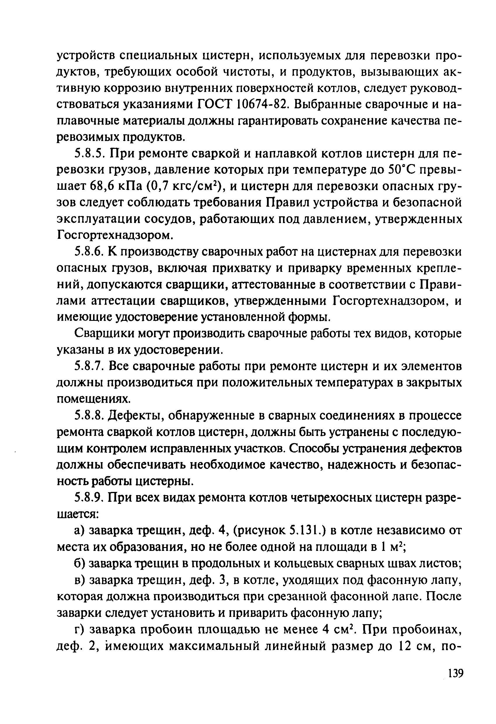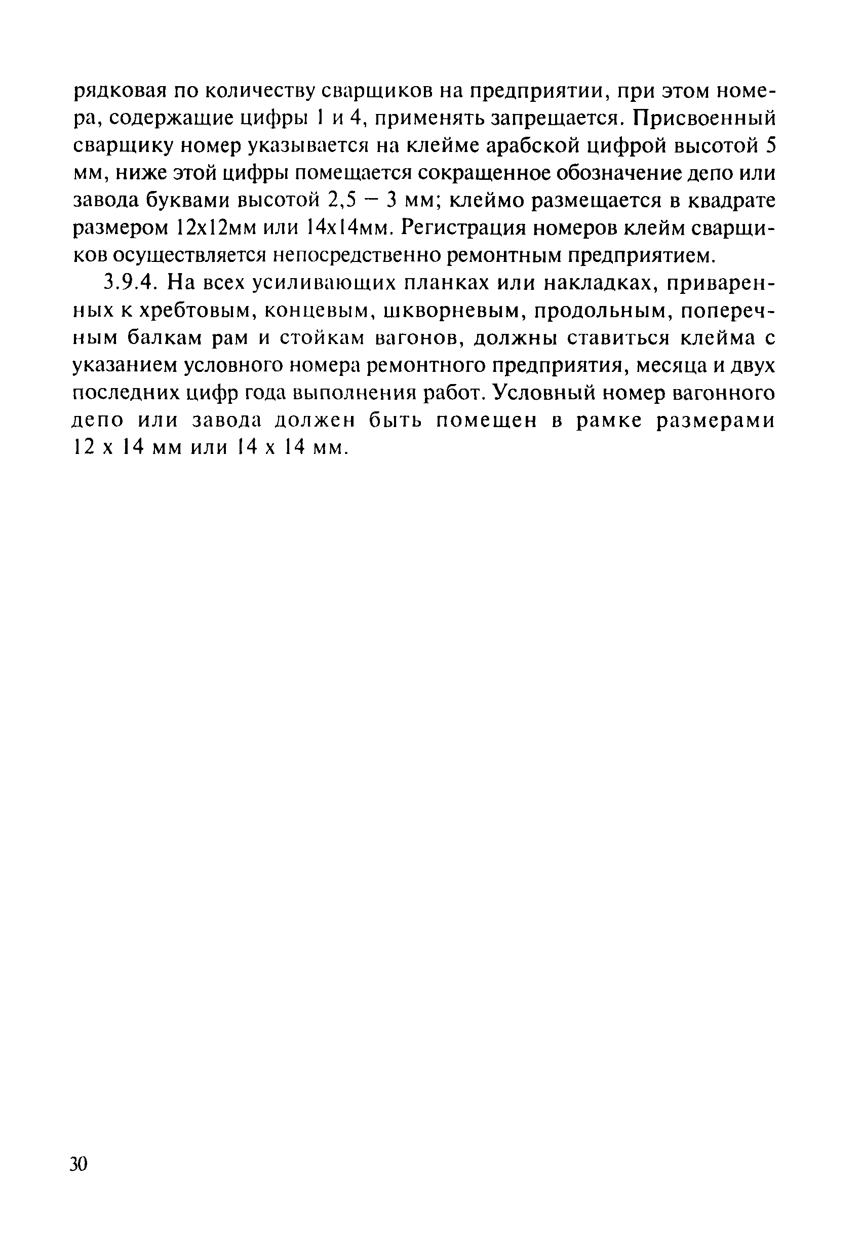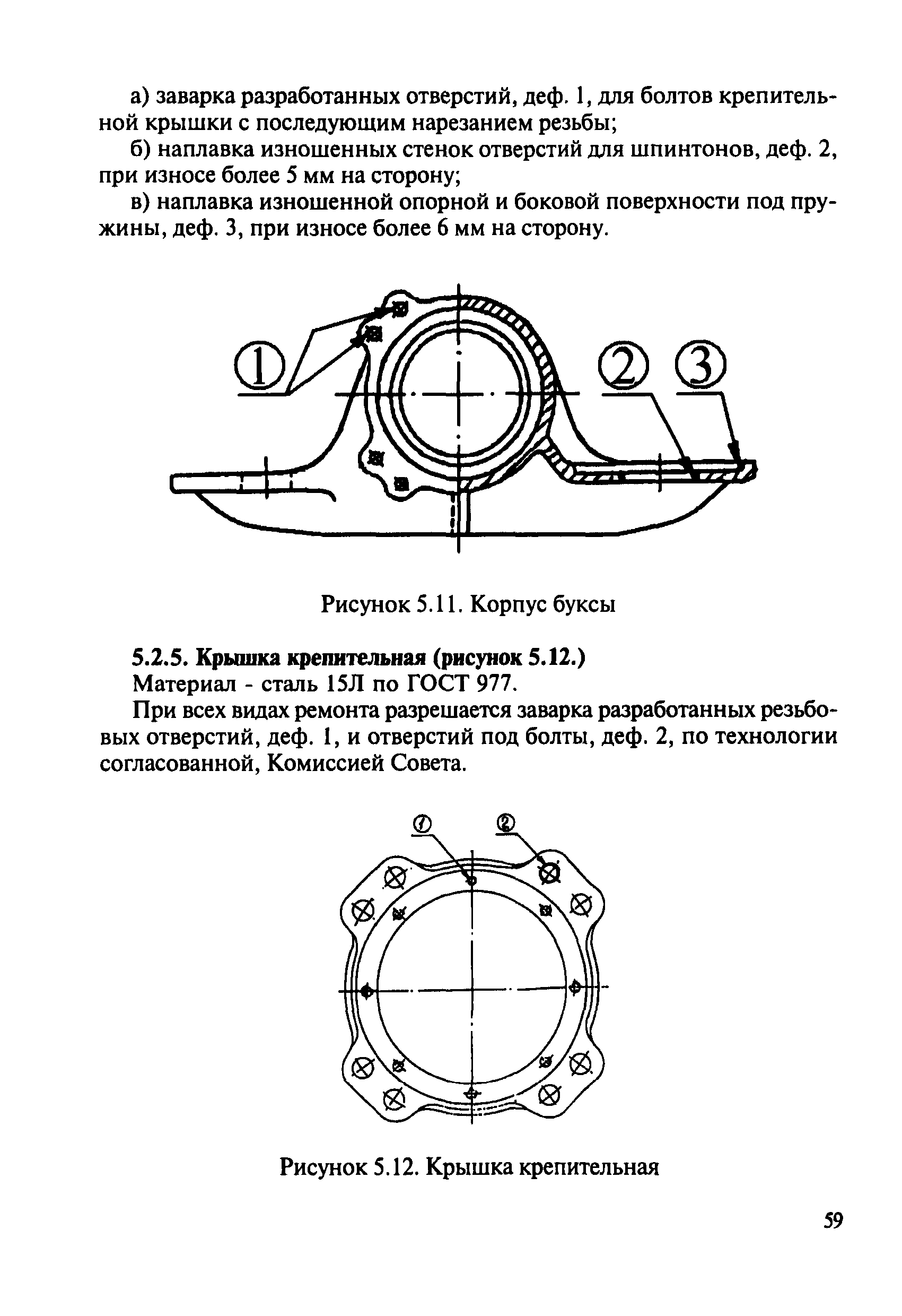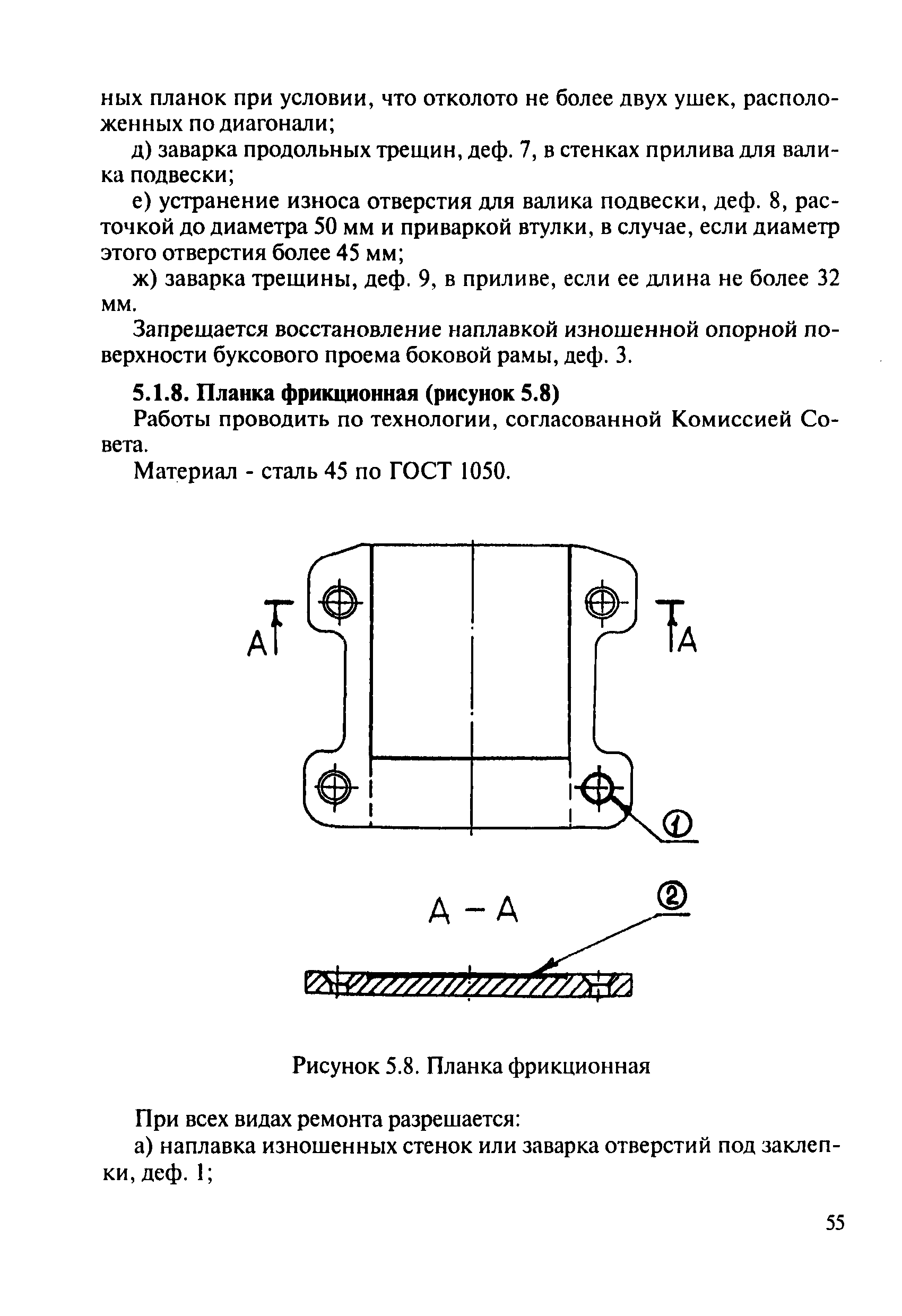 | Оглавление: | 1. Область применения 2. Нормативные ссылки 3. Основные указания по организации и выполнению сварочно-наплавочных работ 3.1 Организация сварочно-наплавочных работ 3.2 Общие требования к проведению сварочно-наплавочных работ 3.3 Подготовка узлов и деталей вагонов к сварке и наплавке 3.4 Наплавка изношенных поверхностей 3.5 Сварка 3.6 Контроль качества сварных соединений 3.7 Виды дефектов и способы их устранения 3.8 Заварка трещин и усиление поврежденных мест 3.9 Приемка выполненных работ 4. Требования безопасности и охраны окружающей среды 5. Требования к ремонту сваркой деталей и узлов 5.1 Тележка модели 18-100, 18-101 5.2 Тележка рефрижераторного типа КВЗ-И2 5.3 Детали тормозов 5.4 Автосцепное устройство 5.5 Вагонная рама и ее детали 5.6 Кузова вагонов 5.7 Внутреннее оборудование рефрижераторных вагонов секций ЦБ-5, БМЗ-5 и АРВ 5.8 Цистерны 5.9 Вагон для битума 5.10 Вагон (хоппер) для зерна, цемента, сырья минеральных удобрений 5.11 Хоппер-дозатор, вагон (хоппер) для горячих окатышей и агломерата |