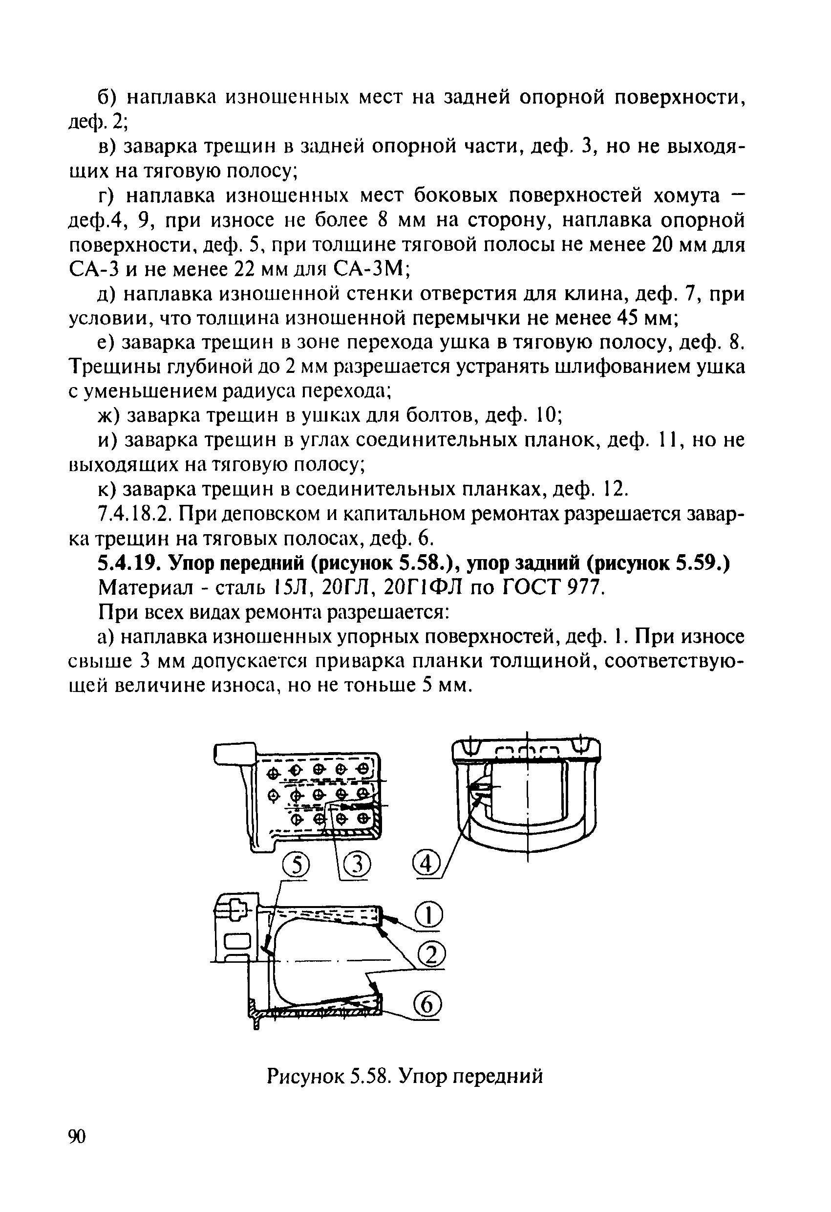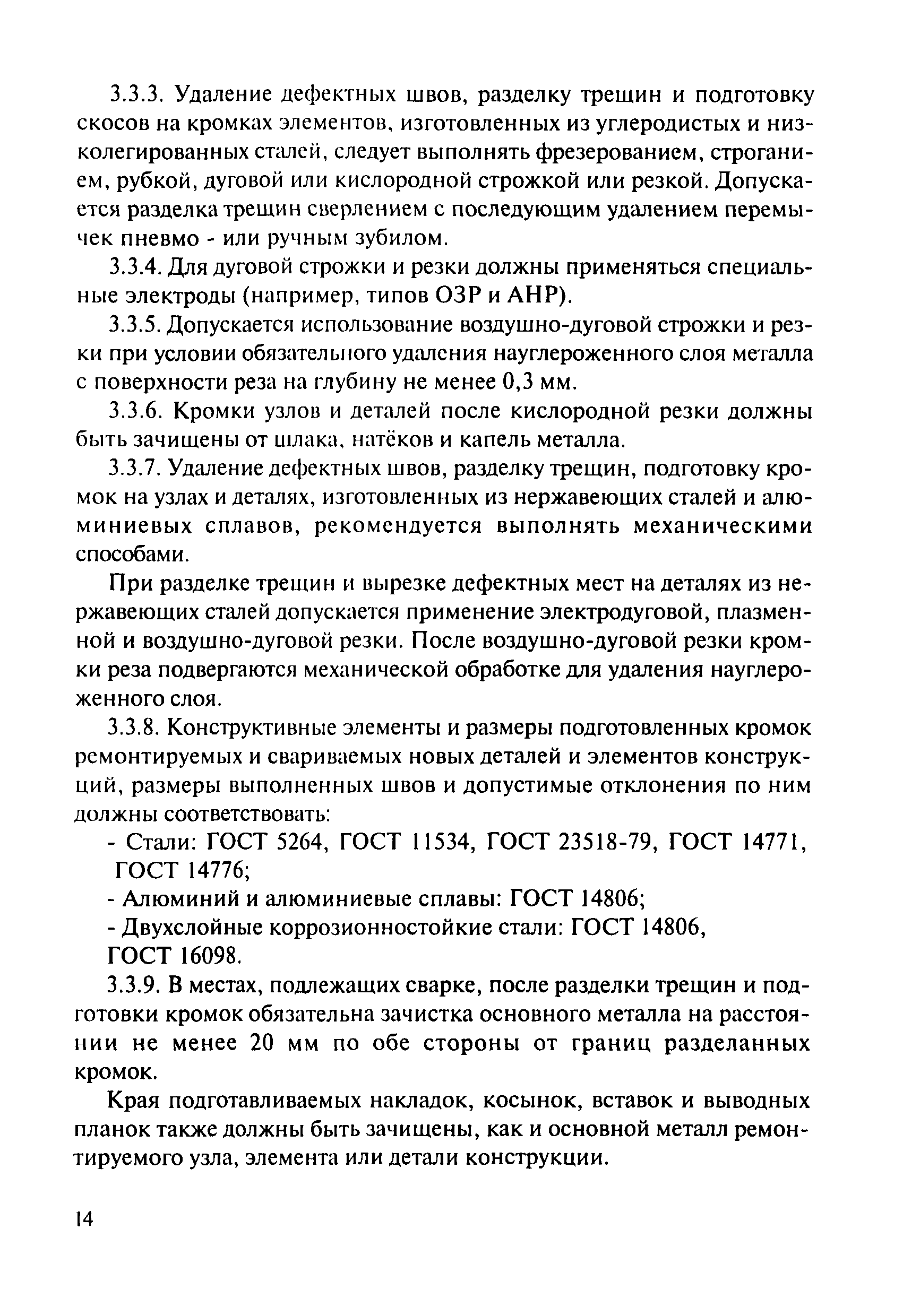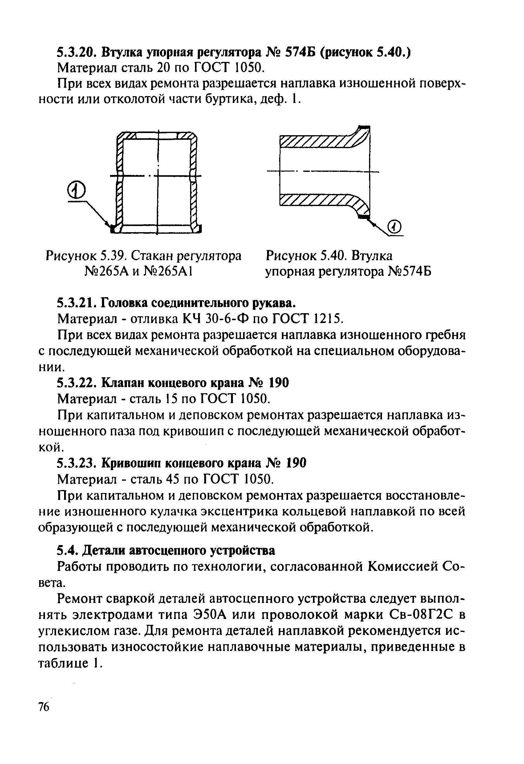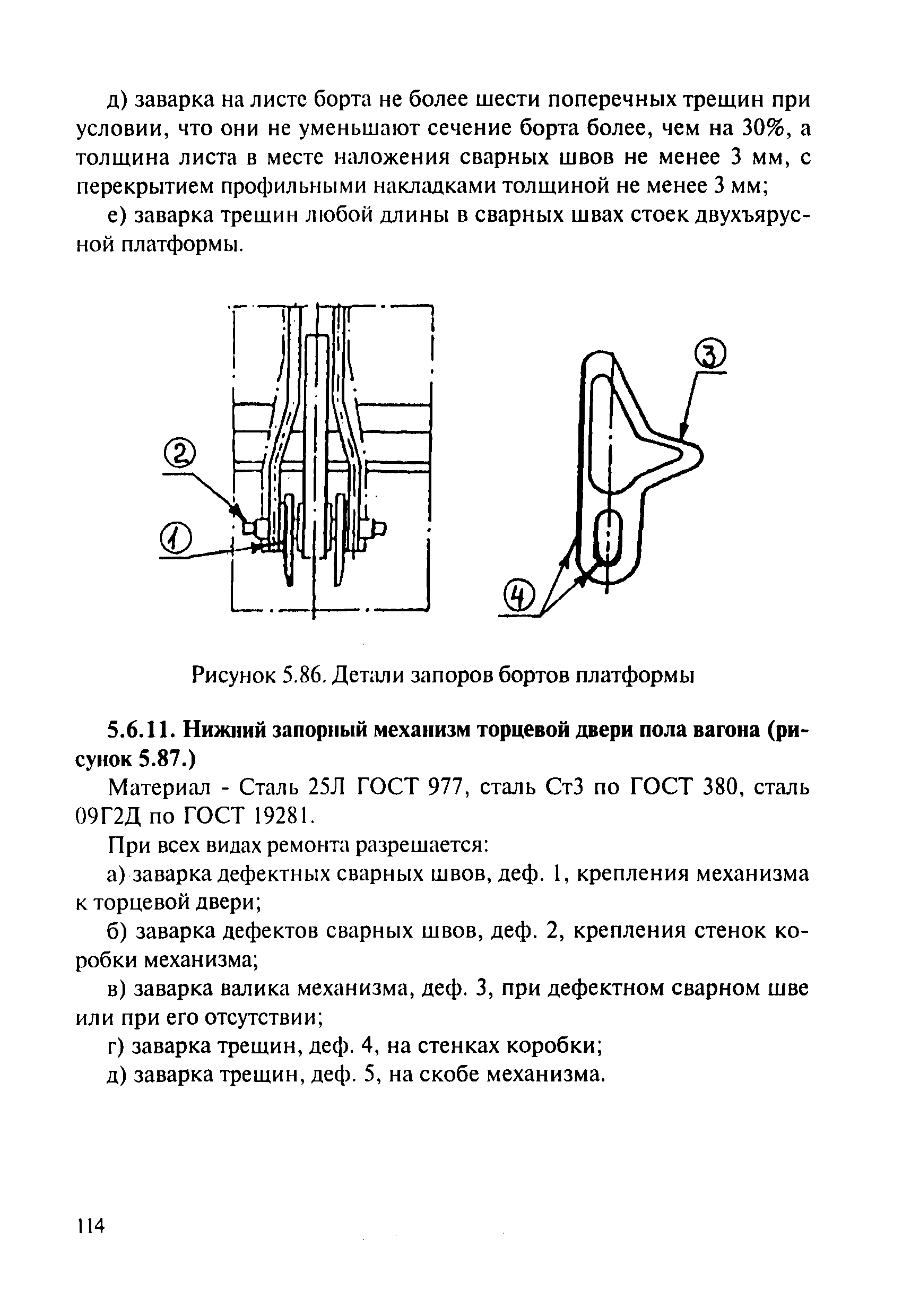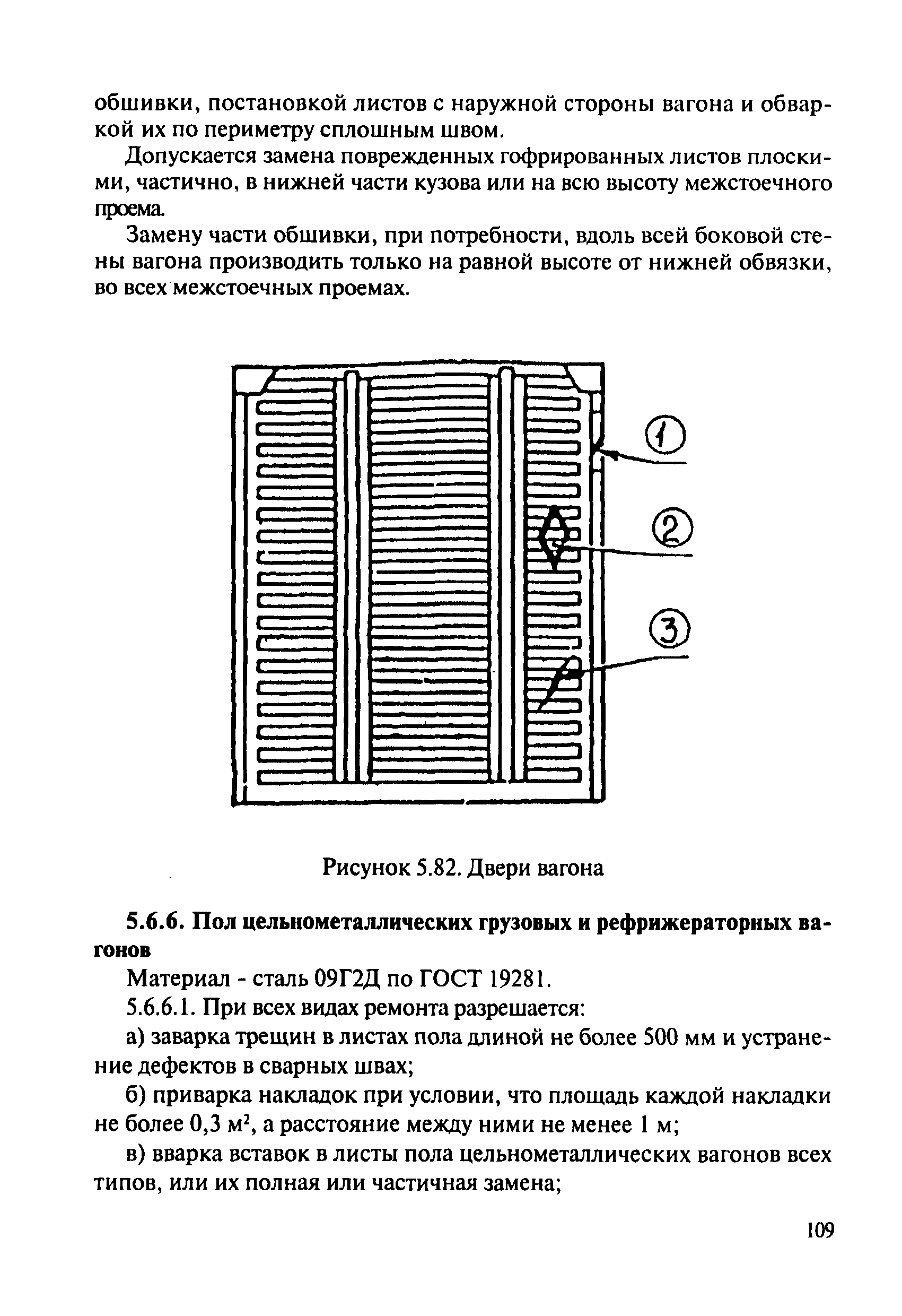 | Оглавление: | 1. Область применения 2. Нормативные ссылки 3. Основные указания по организации и выполнению сварочно-наплавочных работ 3.1 Организация сварочно-наплавочных работ 3.2 Общие требования к проведению сварочно-наплавочных работ 3.3 Подготовка узлов и деталей вагонов к сварке и наплавке 3.4 Наплавка изношенных поверхностей 3.5 Сварка 3.6 Контроль качества сварных соединений 3.7 Виды дефектов и способы их устранения 3.8 Заварка трещин и усиление поврежденных мест 3.9 Приемка выполненных работ 4. Требования безопасности и охраны окружающей среды 5. Требования к ремонту сваркой деталей и узлов 5.1 Тележка модели 18-100, 18-101 5.2 Тележка рефрижераторного типа КВЗ-И2 5.3 Детали тормозов 5.4 Автосцепное устройство 5.5 Вагонная рама и ее детали 5.6 Кузова вагонов 5.7 Внутреннее оборудование рефрижераторных вагонов секций ЦБ-5, БМЗ-5 и АРВ 5.8 Цистерны 5.9 Вагон для битума 5.10 Вагон (хоппер) для зерна, цемента, сырья минеральных удобрений 5.11 Хоппер-дозатор, вагон (хоппер) для горячих окатышей и агломерата |