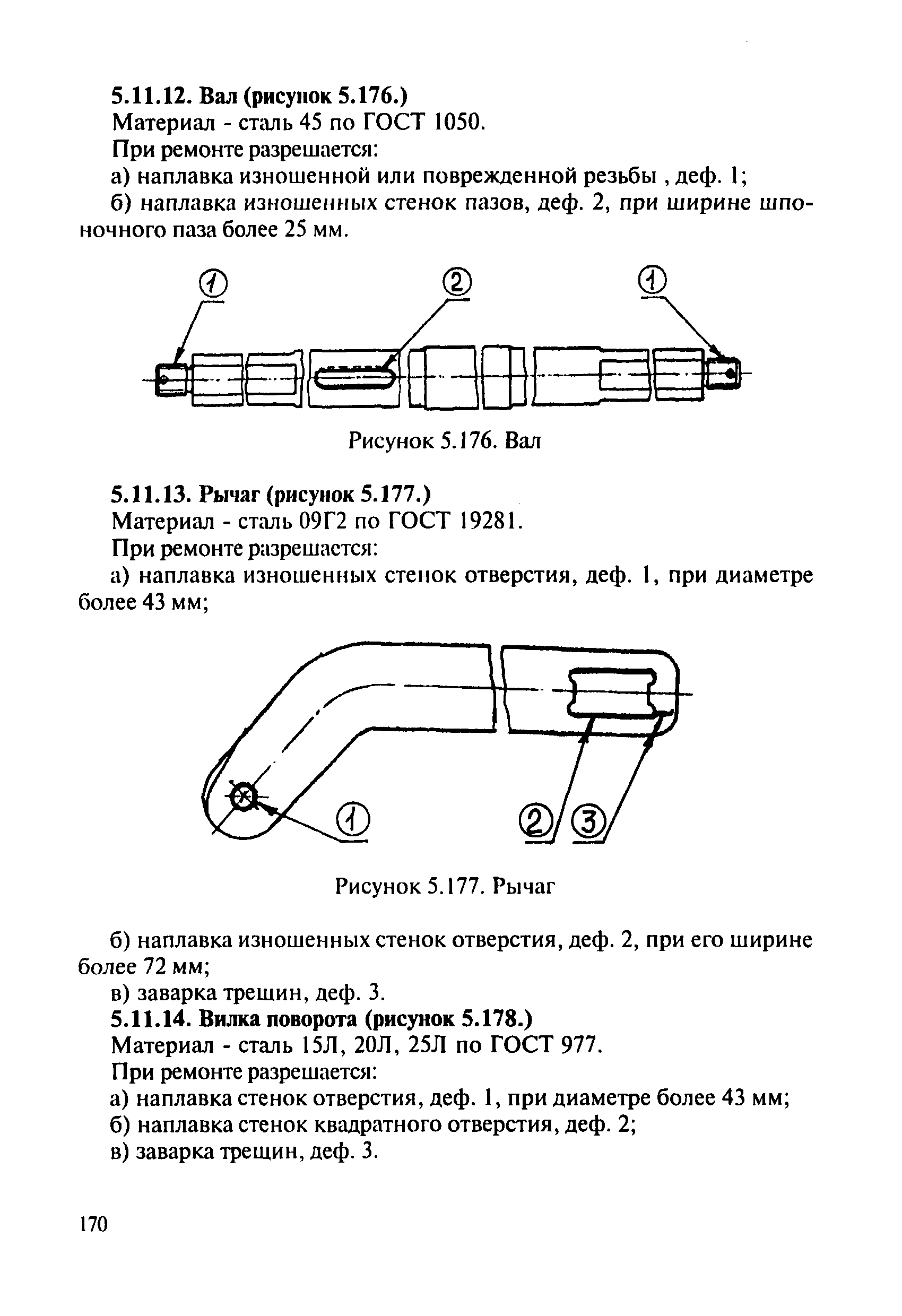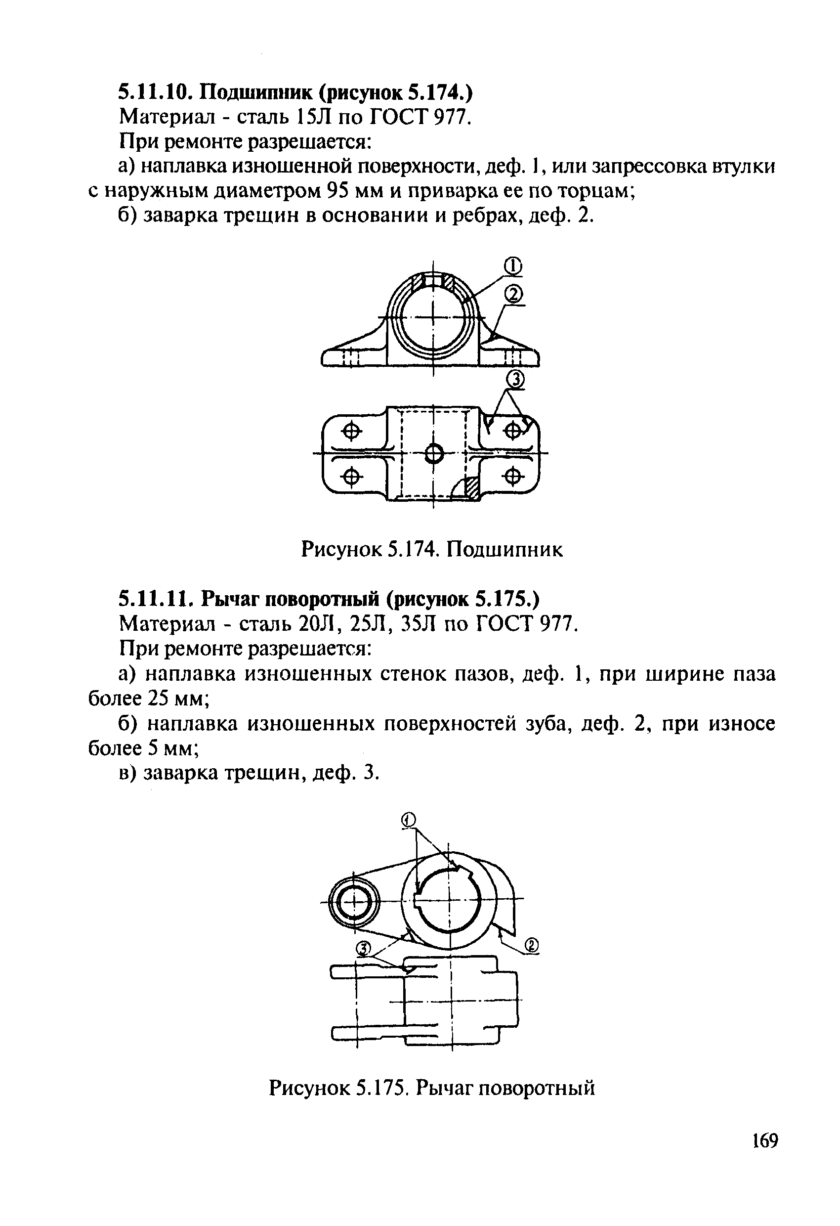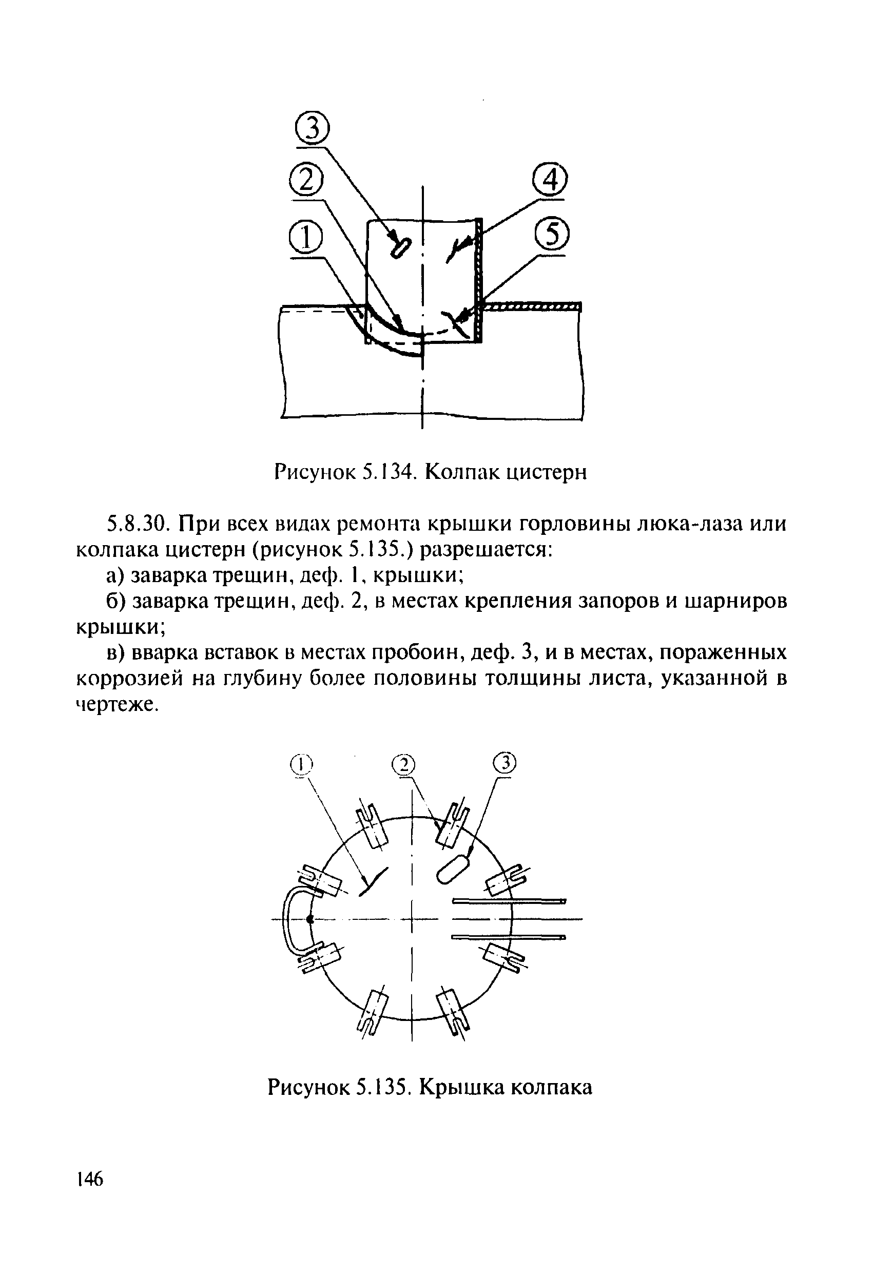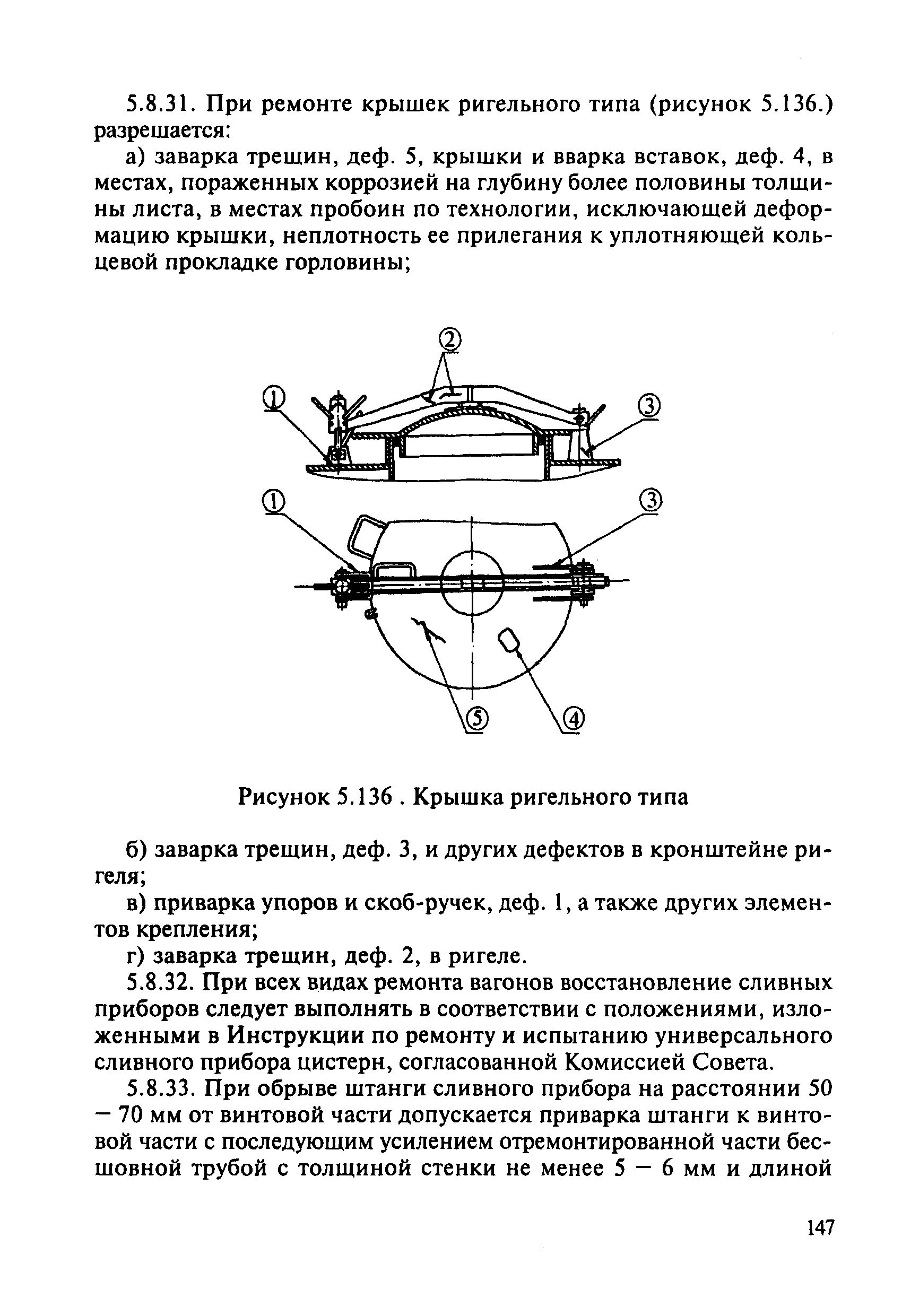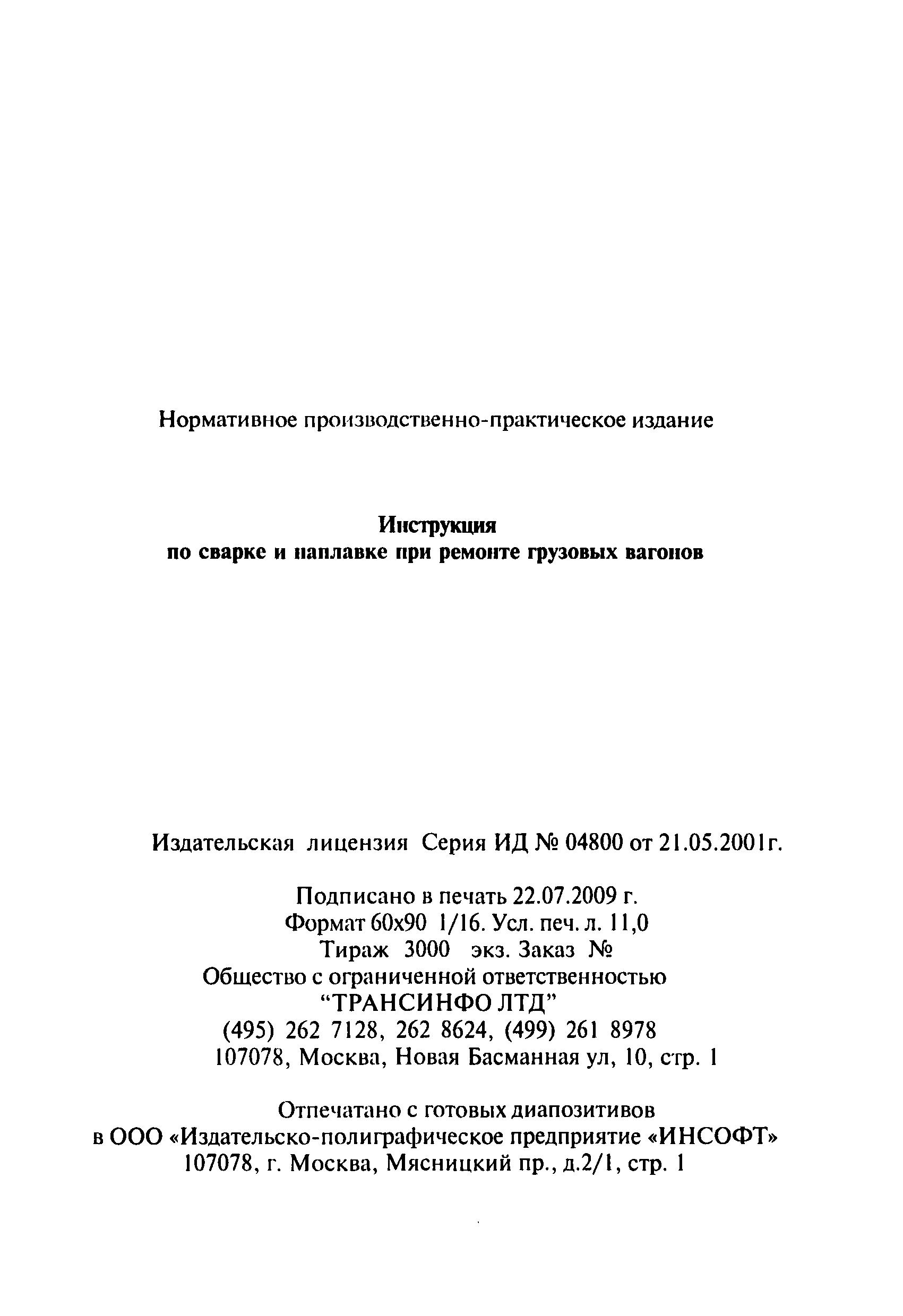 | Оглавление: | 1. Область применения 2. Нормативные ссылки 3. Основные указания по организации и выполнению сварочно-наплавочных работ 3.1 Организация сварочно-наплавочных работ 3.2 Общие требования к проведению сварочно-наплавочных работ 3.3 Подготовка узлов и деталей вагонов к сварке и наплавке 3.4 Наплавка изношенных поверхностей 3.5 Сварка 3.6 Контроль качества сварных соединений 3.7 Виды дефектов и способы их устранения 3.8 Заварка трещин и усиление поврежденных мест 3.9 Приемка выполненных работ 4. Требования безопасности и охраны окружающей среды 5. Требования к ремонту сваркой деталей и узлов 5.1 Тележка модели 18-100, 18-101 5.2 Тележка рефрижераторного типа КВЗ-И2 5.3 Детали тормозов 5.4 Автосцепное устройство 5.5 Вагонная рама и ее детали 5.6 Кузова вагонов 5.7 Внутреннее оборудование рефрижераторных вагонов секций ЦБ-5, БМЗ-5 и АРВ 5.8 Цистерны 5.9 Вагон для битума 5.10 Вагон (хоппер) для зерна, цемента, сырья минеральных удобрений 5.11 Хоппер-дозатор, вагон (хоппер) для горячих окатышей и агломерата |