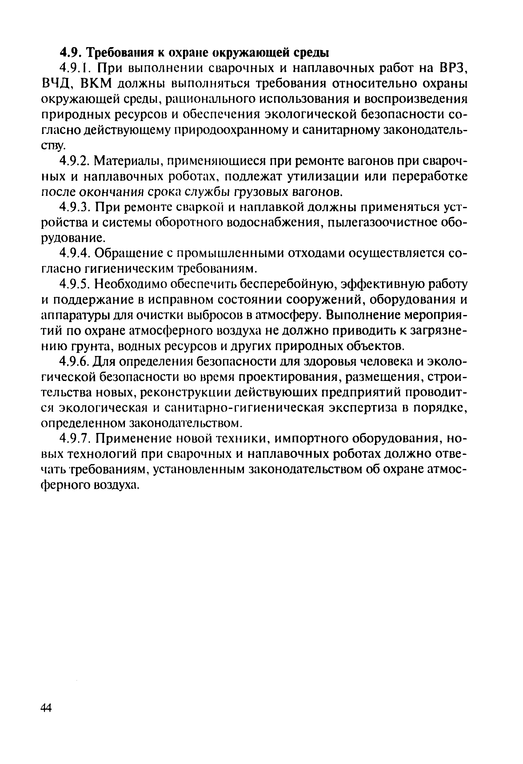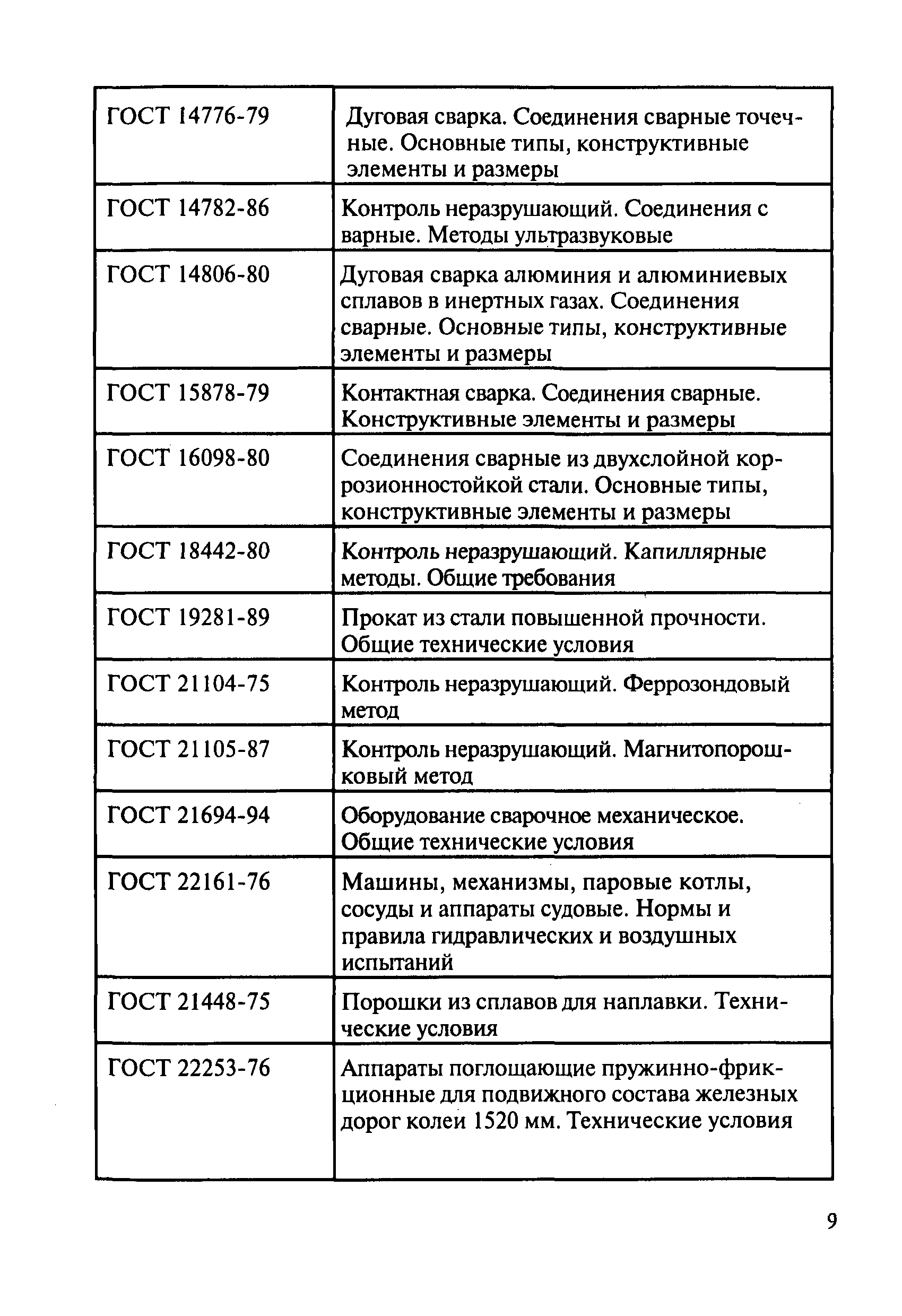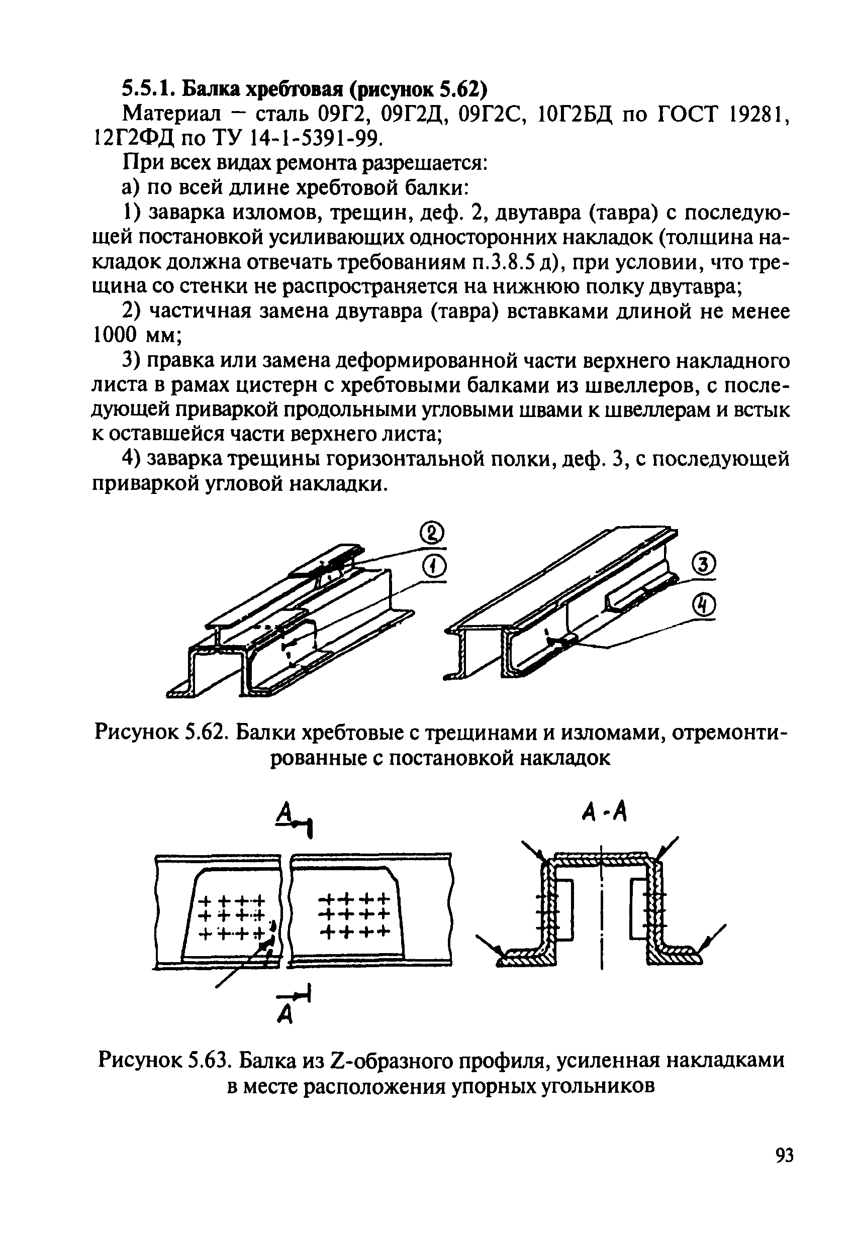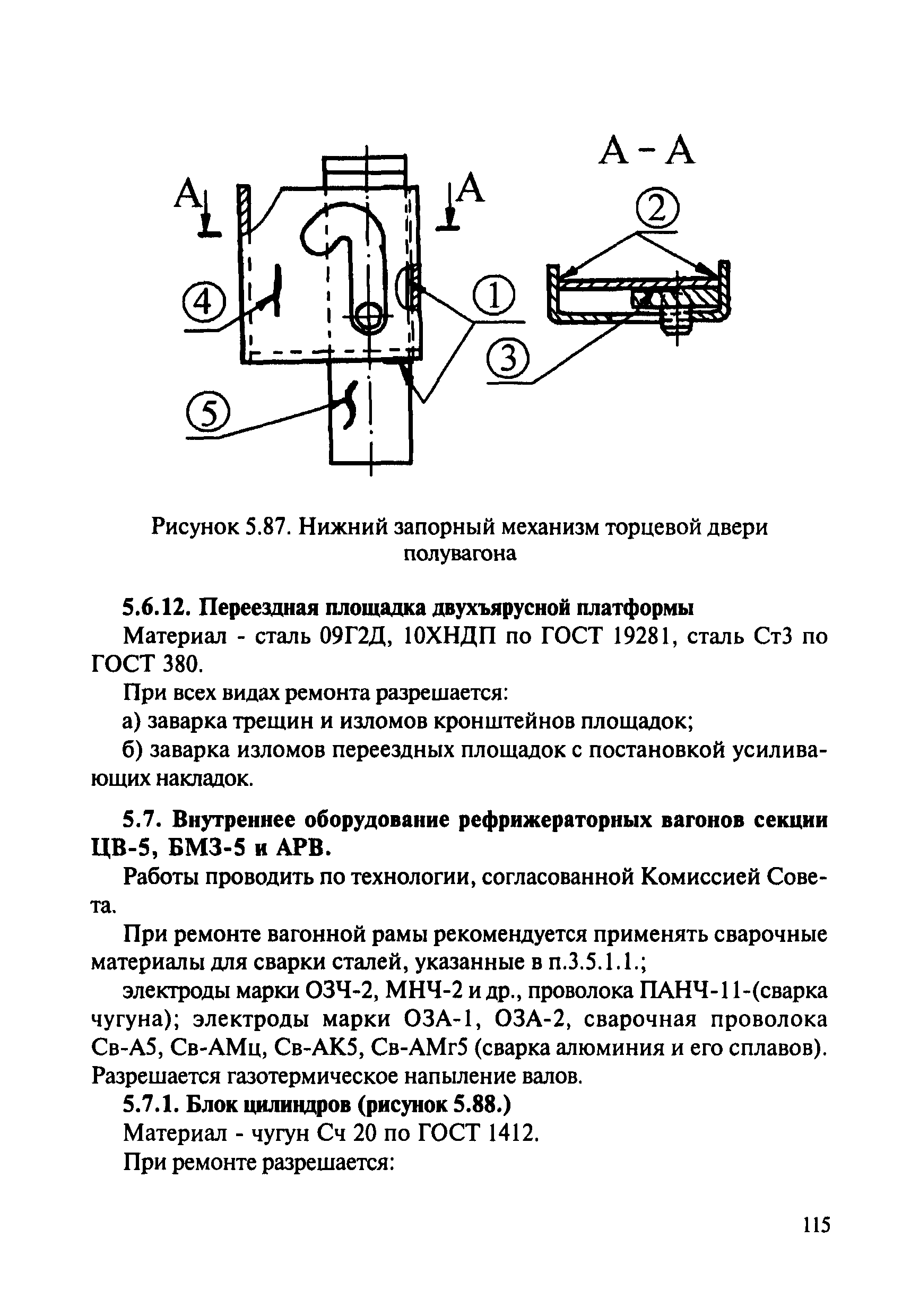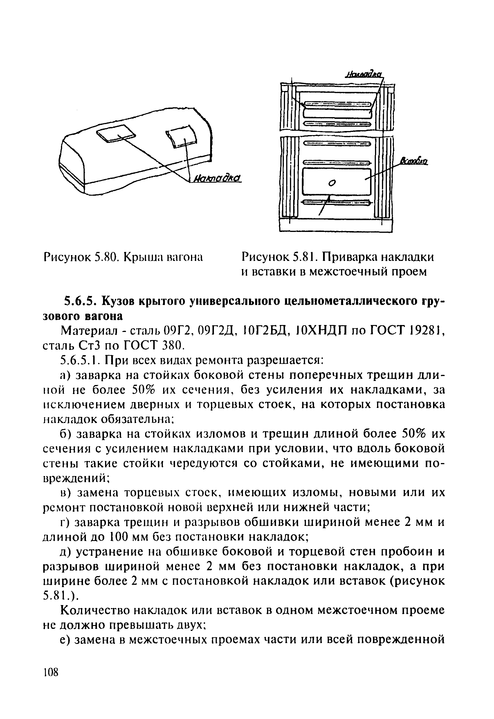 | Оглавление: | 1. Область применения 2. Нормативные ссылки 3. Основные указания по организации и выполнению сварочно-наплавочных работ 3.1 Организация сварочно-наплавочных работ 3.2 Общие требования к проведению сварочно-наплавочных работ 3.3 Подготовка узлов и деталей вагонов к сварке и наплавке 3.4 Наплавка изношенных поверхностей 3.5 Сварка 3.6 Контроль качества сварных соединений 3.7 Виды дефектов и способы их устранения 3.8 Заварка трещин и усиление поврежденных мест 3.9 Приемка выполненных работ 4. Требования безопасности и охраны окружающей среды 5. Требования к ремонту сваркой деталей и узлов 5.1 Тележка модели 18-100, 18-101 5.2 Тележка рефрижераторного типа КВЗ-И2 5.3 Детали тормозов 5.4 Автосцепное устройство 5.5 Вагонная рама и ее детали 5.6 Кузова вагонов 5.7 Внутреннее оборудование рефрижераторных вагонов секций ЦБ-5, БМЗ-5 и АРВ 5.8 Цистерны 5.9 Вагон для битума 5.10 Вагон (хоппер) для зерна, цемента, сырья минеральных удобрений 5.11 Хоппер-дозатор, вагон (хоппер) для горячих окатышей и агломерата |