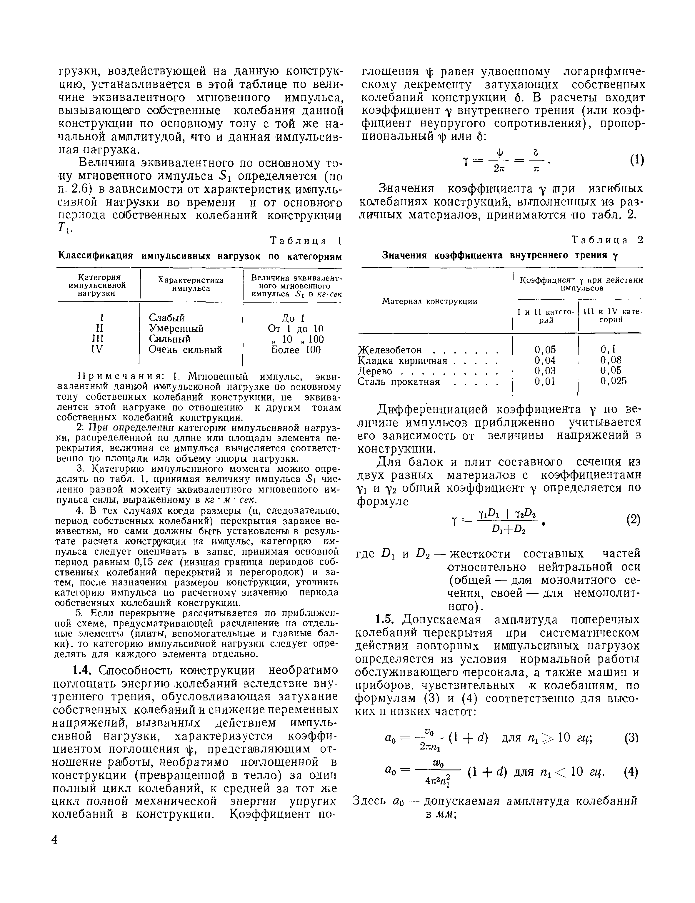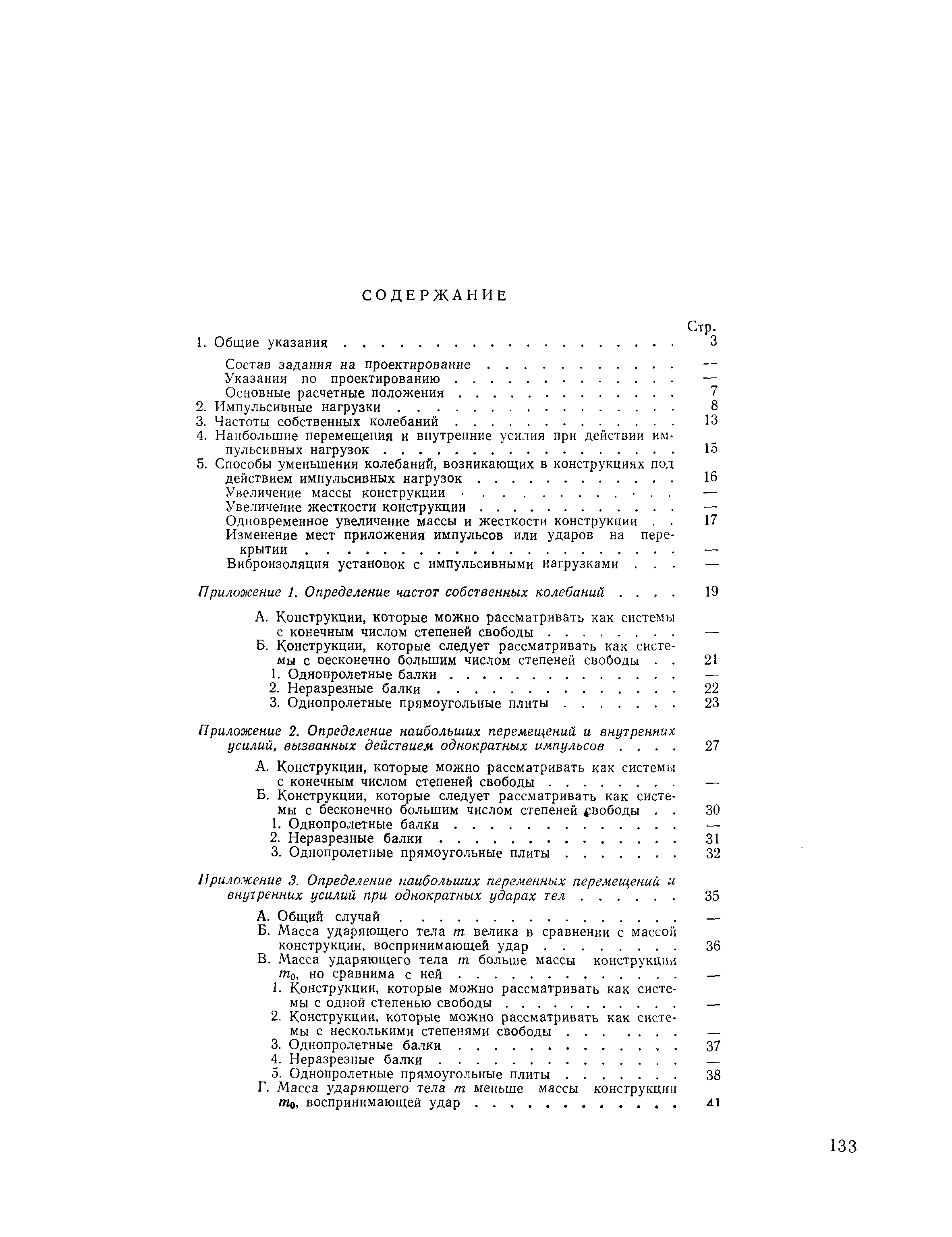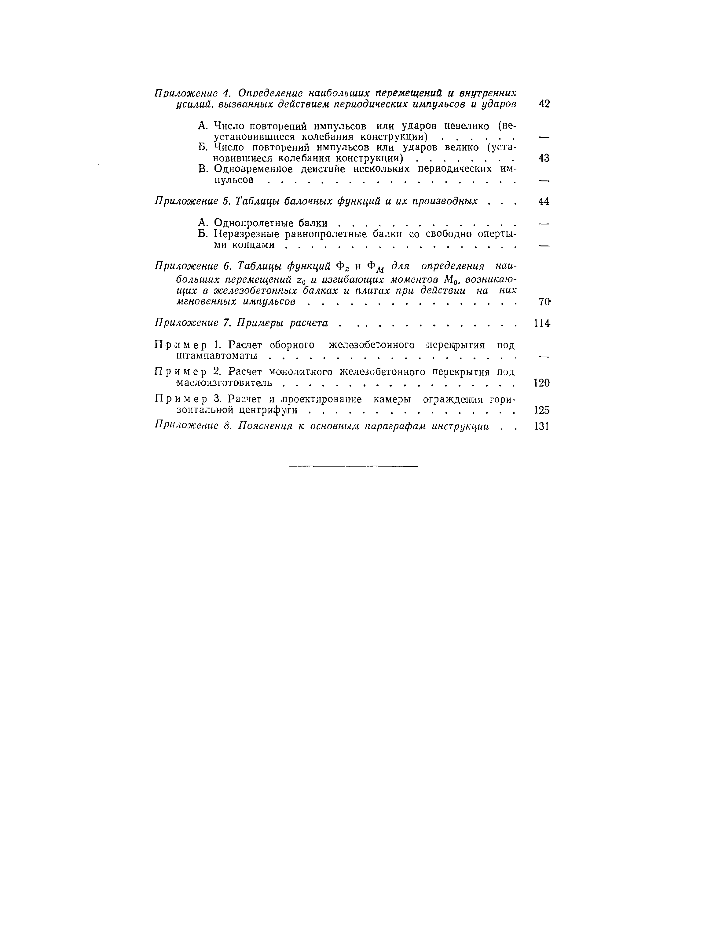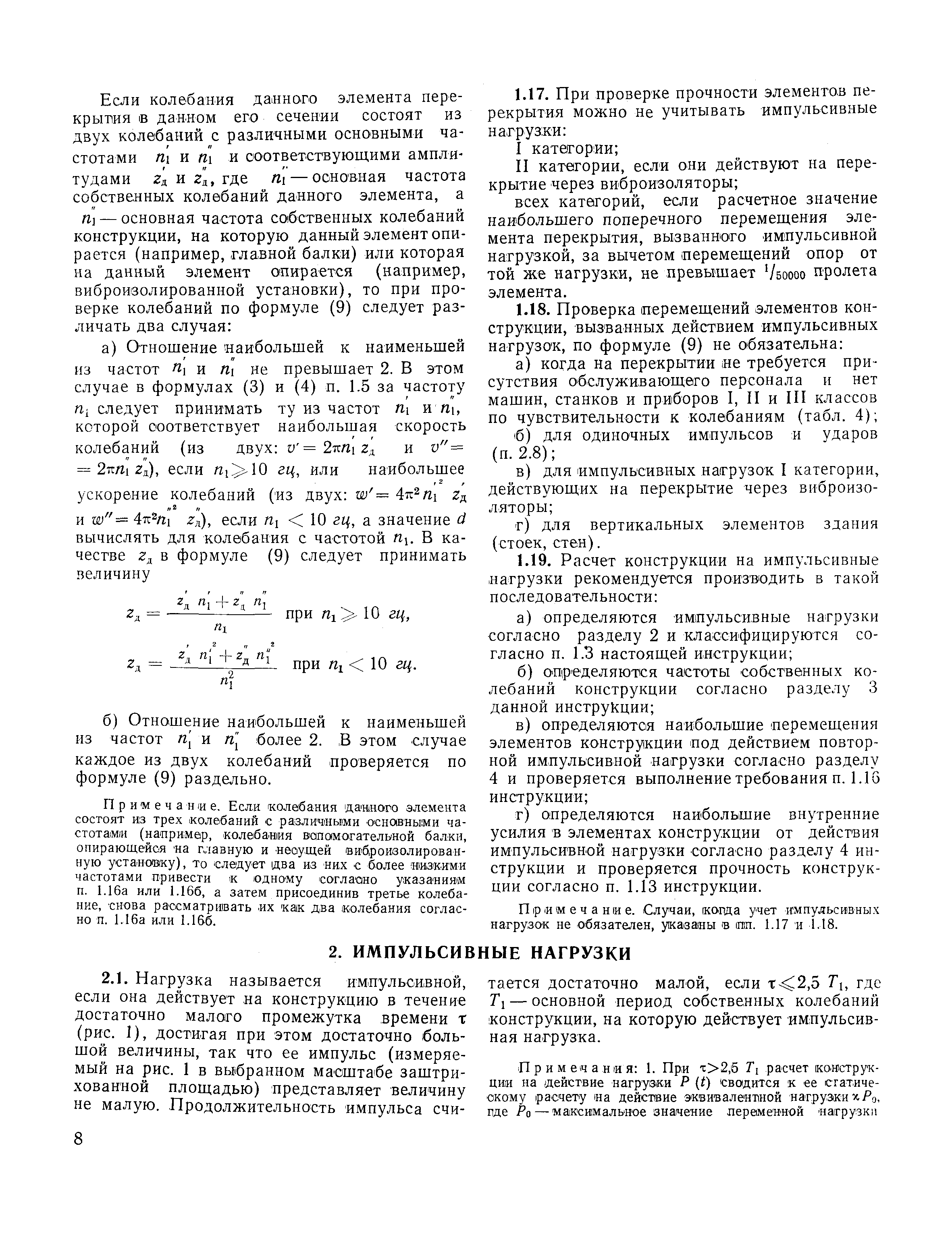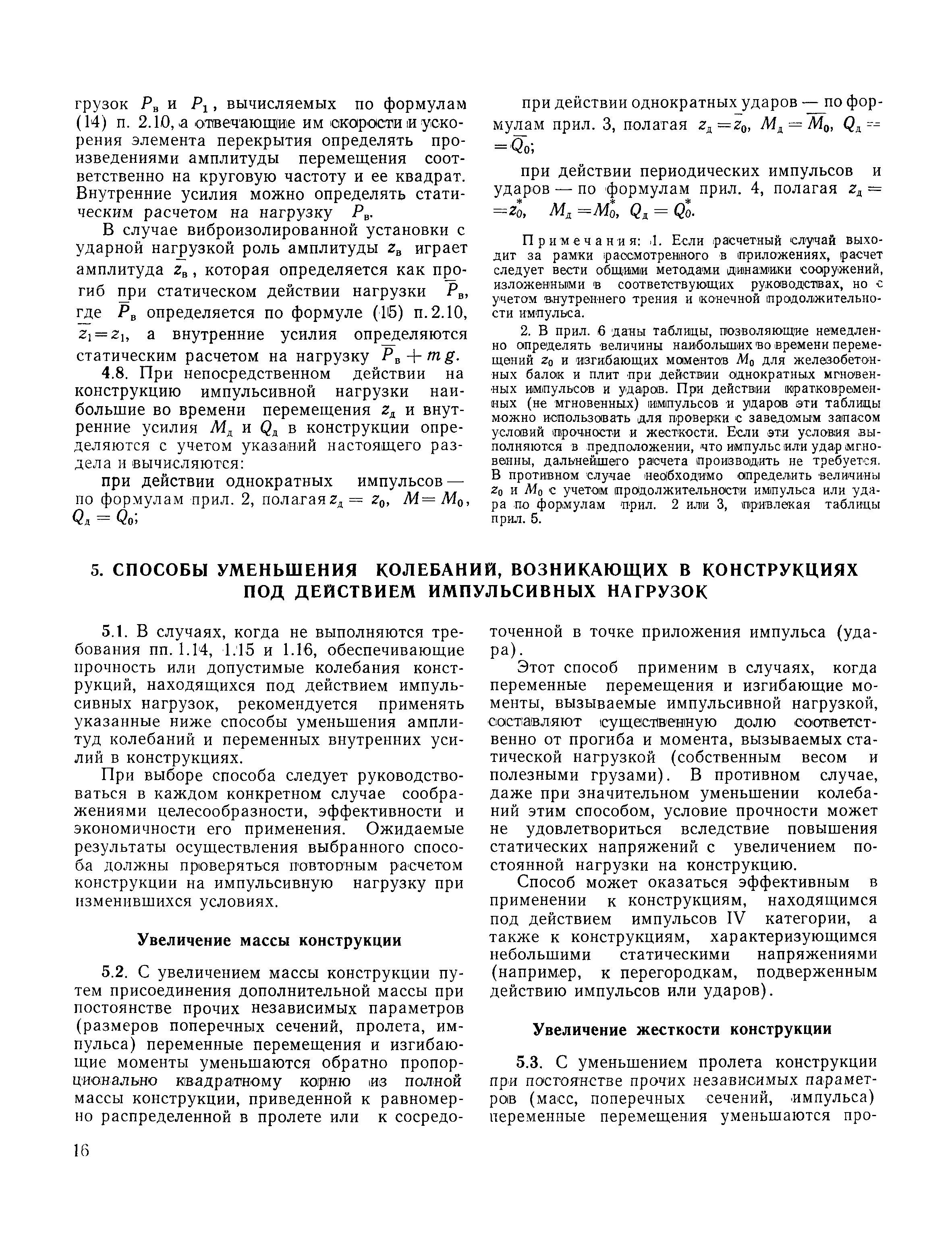 | Оглавление: | 1. Общие указания Состав задания на проектирование Указания по проектированию Основные расчетные положения 2. Импульсные нагрузки 3. Частоты собственных колебаний 4. Наибольшие перемещения и внутренние усилия при действии импульсивных нагрузок 5. Способы уменьшения колебаний, возникающих в конструкциях под действием импульсивных нагрузок Увеличение массы конструкции Увеличение жесткости конструкции Одновременное увеличение массы и жесткости конструкции Изменение мест приложения импульсов или ударов на перекрытия Виброизоляция установок с импульсивными нагрузками Приложение 1. Определение частот собственных колебаний Приложение 2. Определение наибольших перемещений и внутренних усилий, вызванных действием однократных импульсов Приложение 3. Определение наибольших переменных перемещений и внутренних усилий при однократных ударах тел Приложение 4. Определение наибольших перемещений и внутренних усилий, вызванных действием периодических импульсов и ударов Приложение 5. Таблицы балочных функций и их производных Приложение 6. Таблицы функций Фz и Фм для определения наибольших перемещений Zо и изгибающих моментов Мо, возникающих в железобетонных балках и плитах при действии на них мгновенных импульсов Приложение 7. Примеры расчета Приложение 8. Пояснения к основным параграфам инструкции |