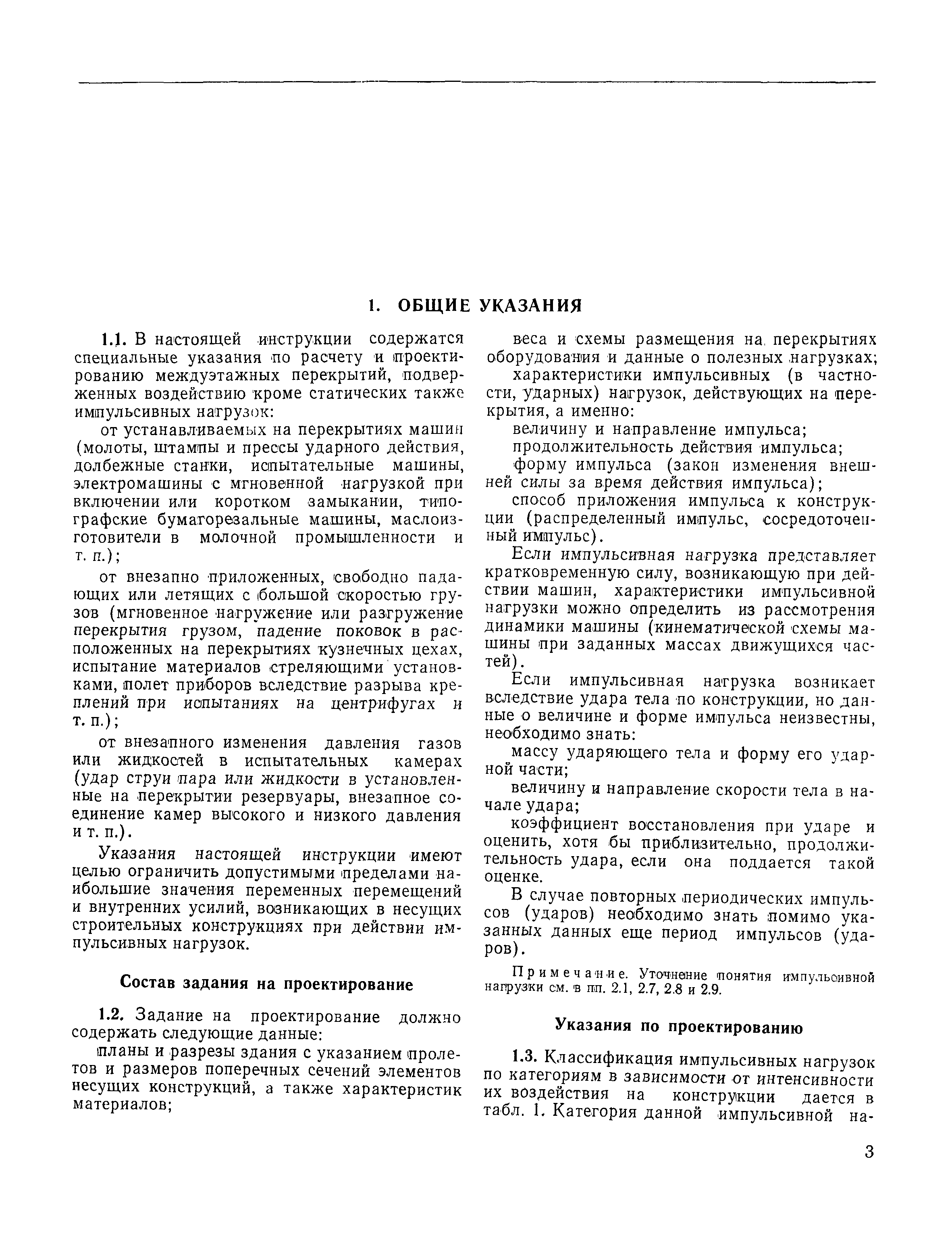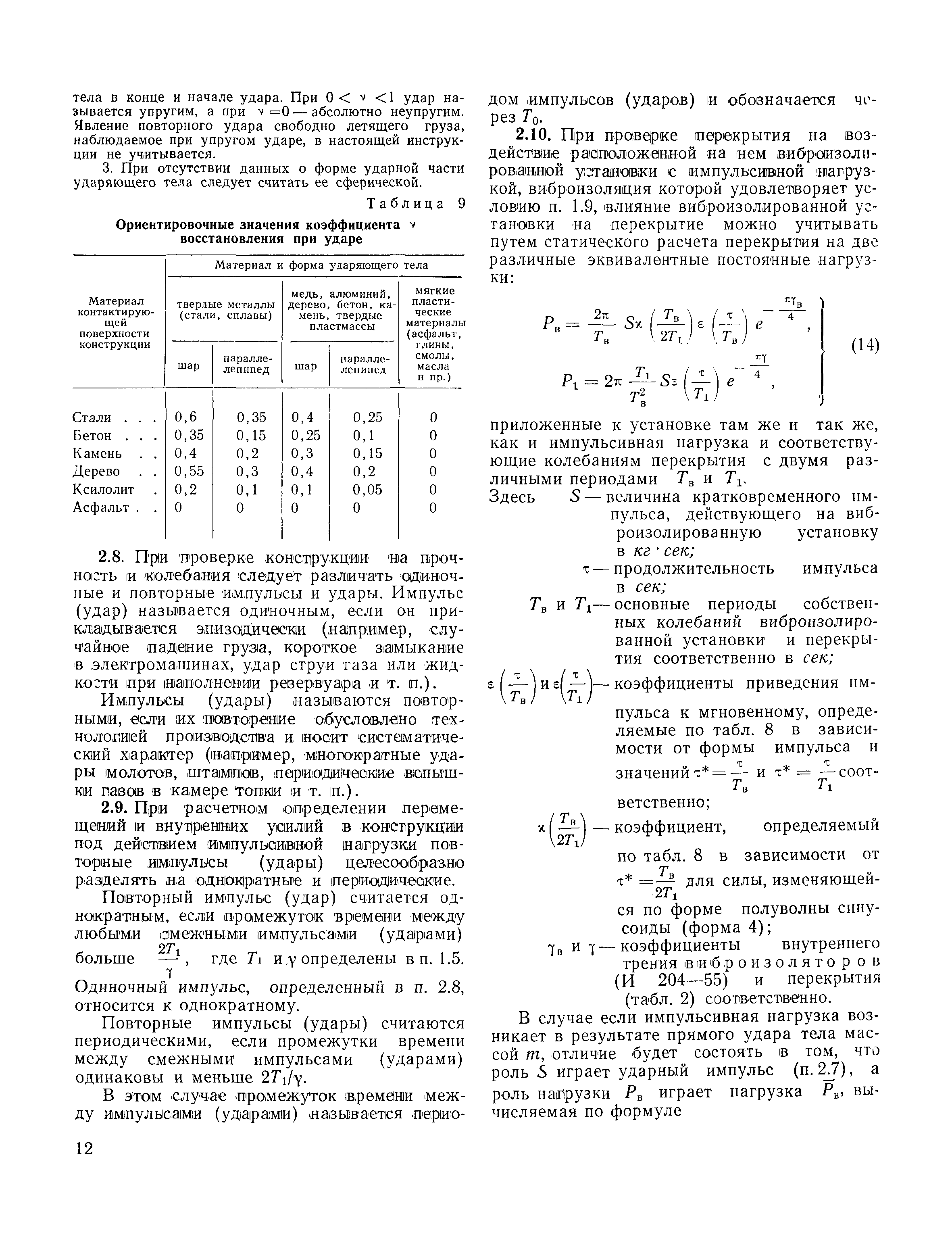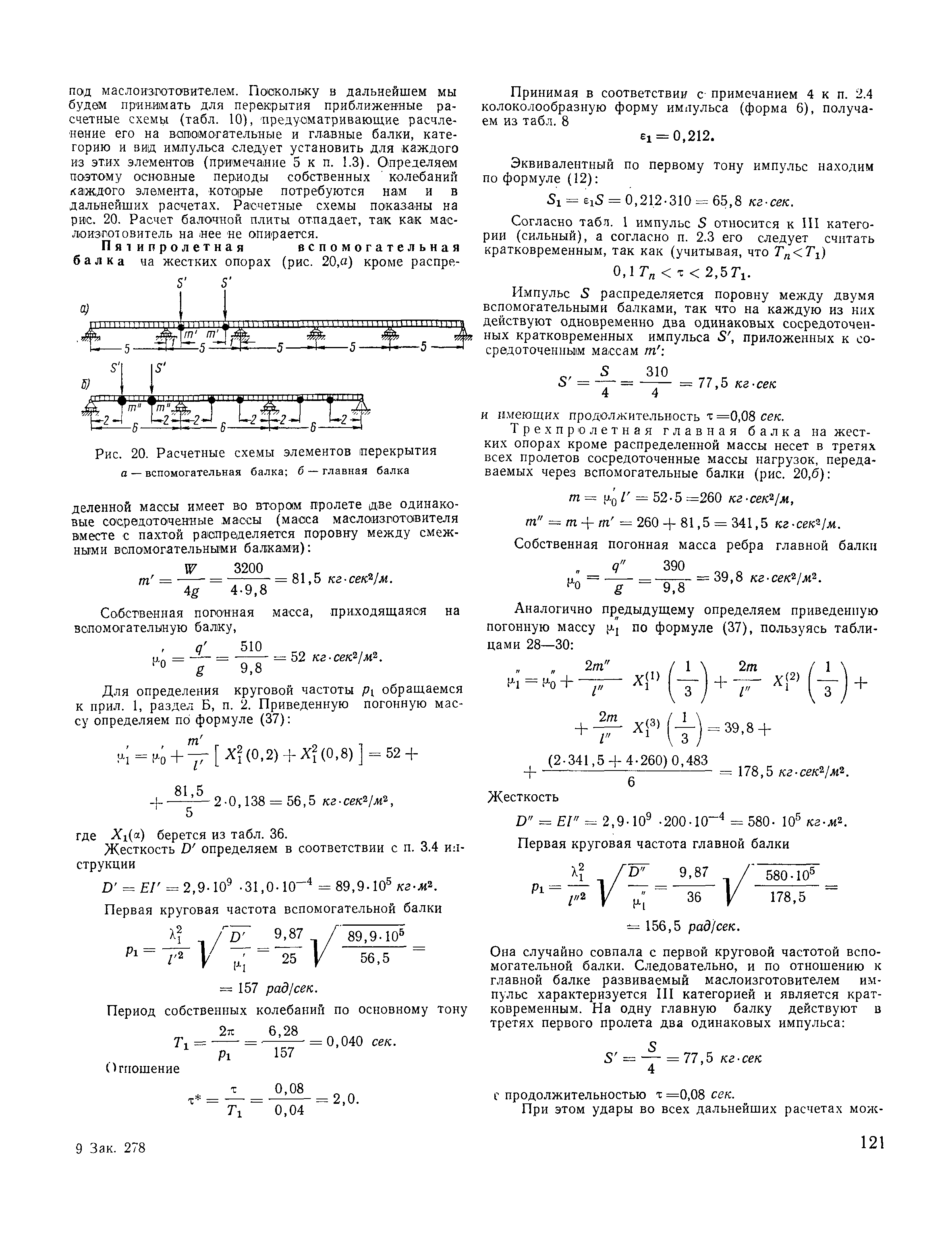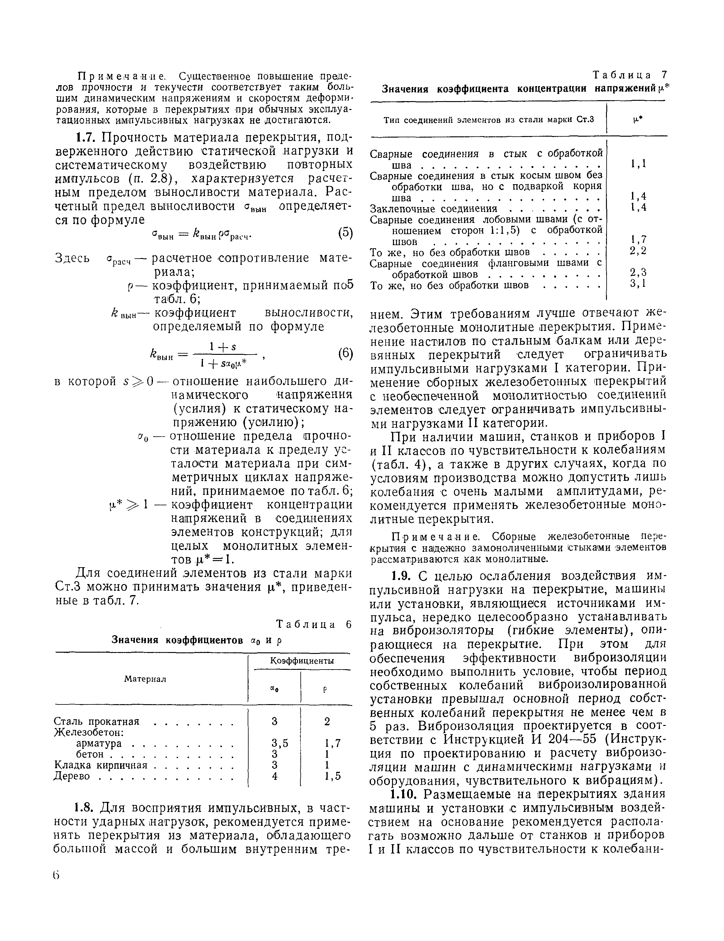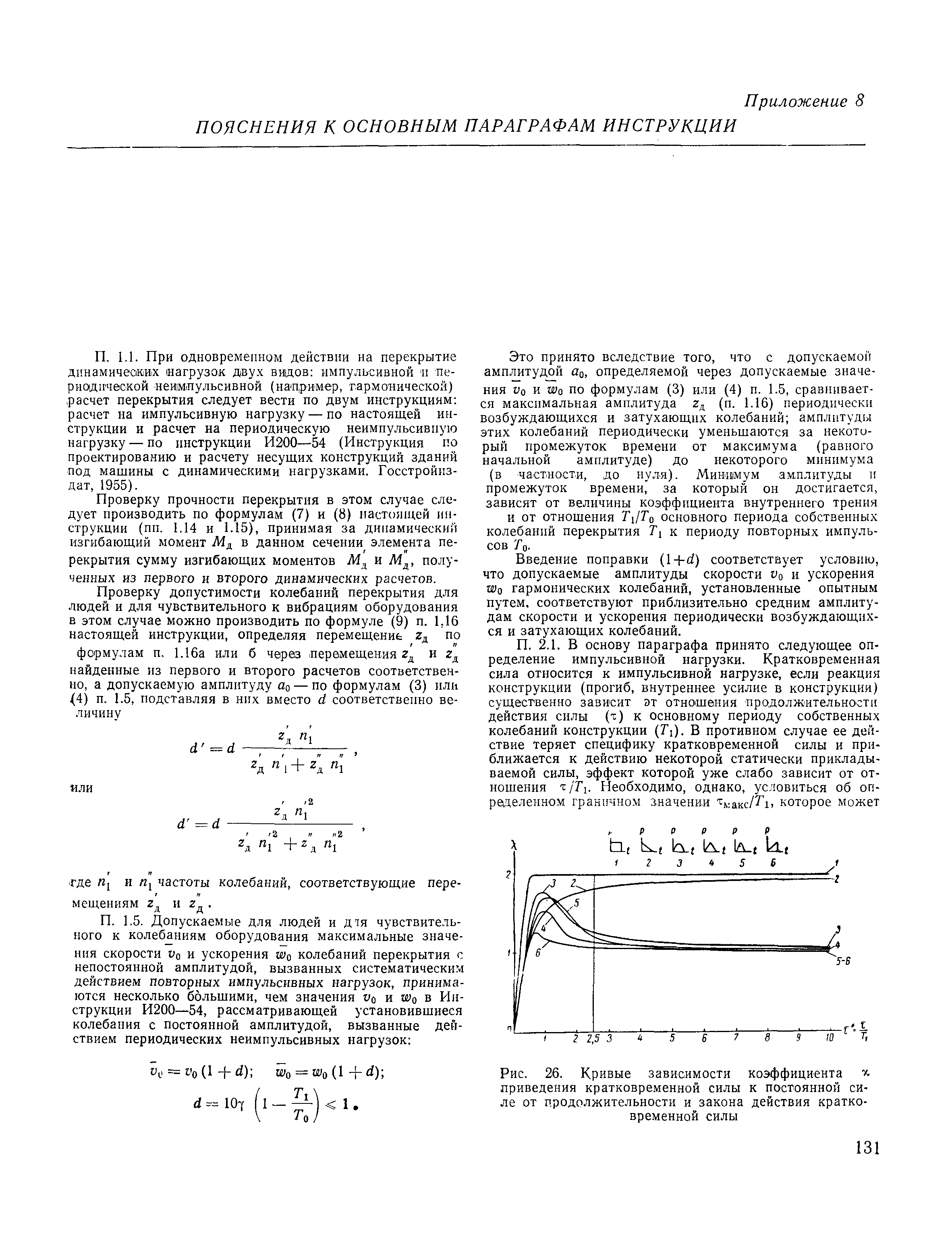 | Оглавление: | 1. Общие указания Состав задания на проектирование Указания по проектированию Основные расчетные положения 2. Импульсные нагрузки 3. Частоты собственных колебаний 4. Наибольшие перемещения и внутренние усилия при действии импульсивных нагрузок 5. Способы уменьшения колебаний, возникающих в конструкциях под действием импульсивных нагрузок Увеличение массы конструкции Увеличение жесткости конструкции Одновременное увеличение массы и жесткости конструкции Изменение мест приложения импульсов или ударов на перекрытия Виброизоляция установок с импульсивными нагрузками Приложение 1. Определение частот собственных колебаний Приложение 2. Определение наибольших перемещений и внутренних усилий, вызванных действием однократных импульсов Приложение 3. Определение наибольших переменных перемещений и внутренних усилий при однократных ударах тел Приложение 4. Определение наибольших перемещений и внутренних усилий, вызванных действием периодических импульсов и ударов Приложение 5. Таблицы балочных функций и их производных Приложение 6. Таблицы функций Фz и Фм для определения наибольших перемещений Zо и изгибающих моментов Мо, возникающих в железобетонных балках и плитах при действии на них мгновенных импульсов Приложение 7. Примеры расчета Приложение 8. Пояснения к основным параграфам инструкции |