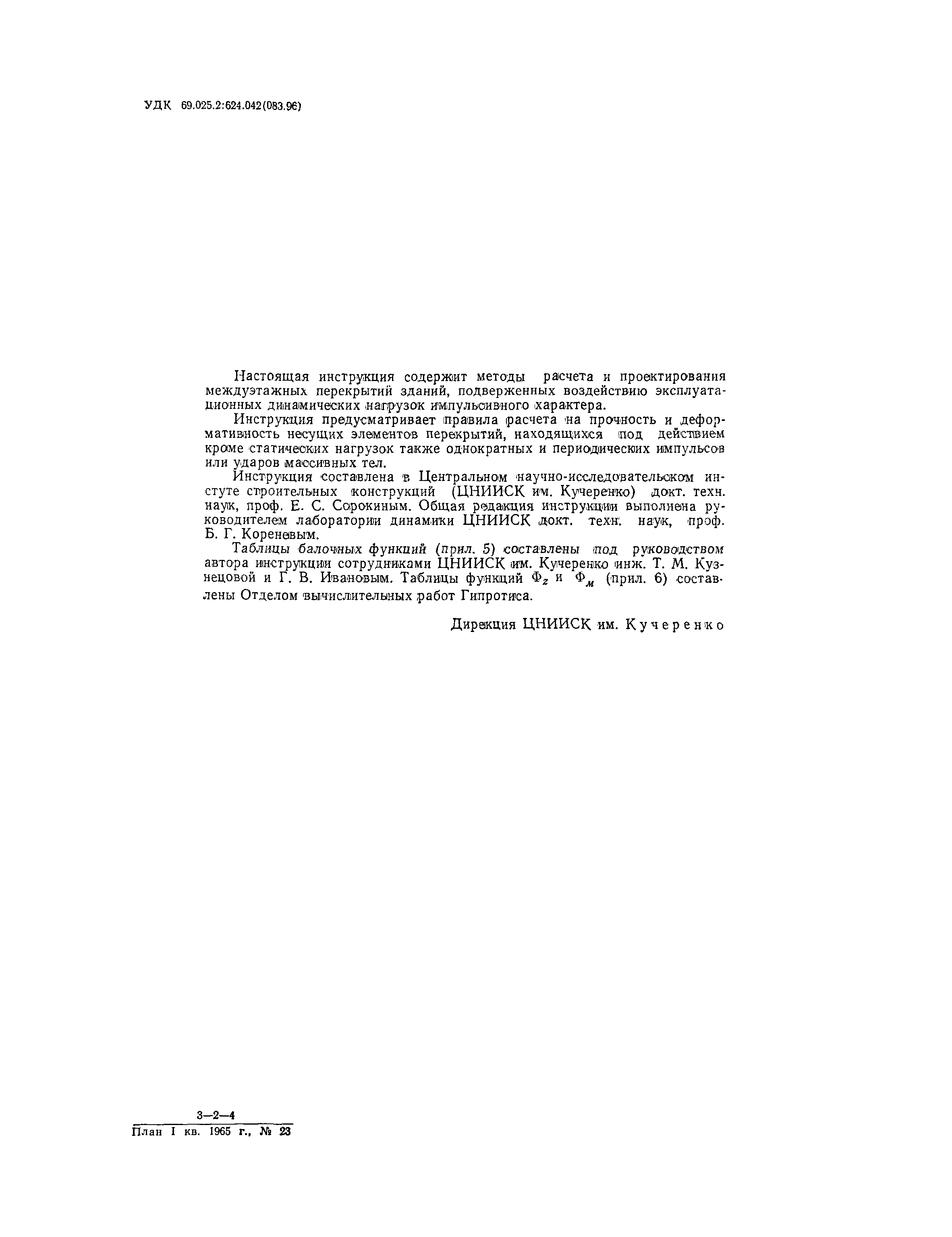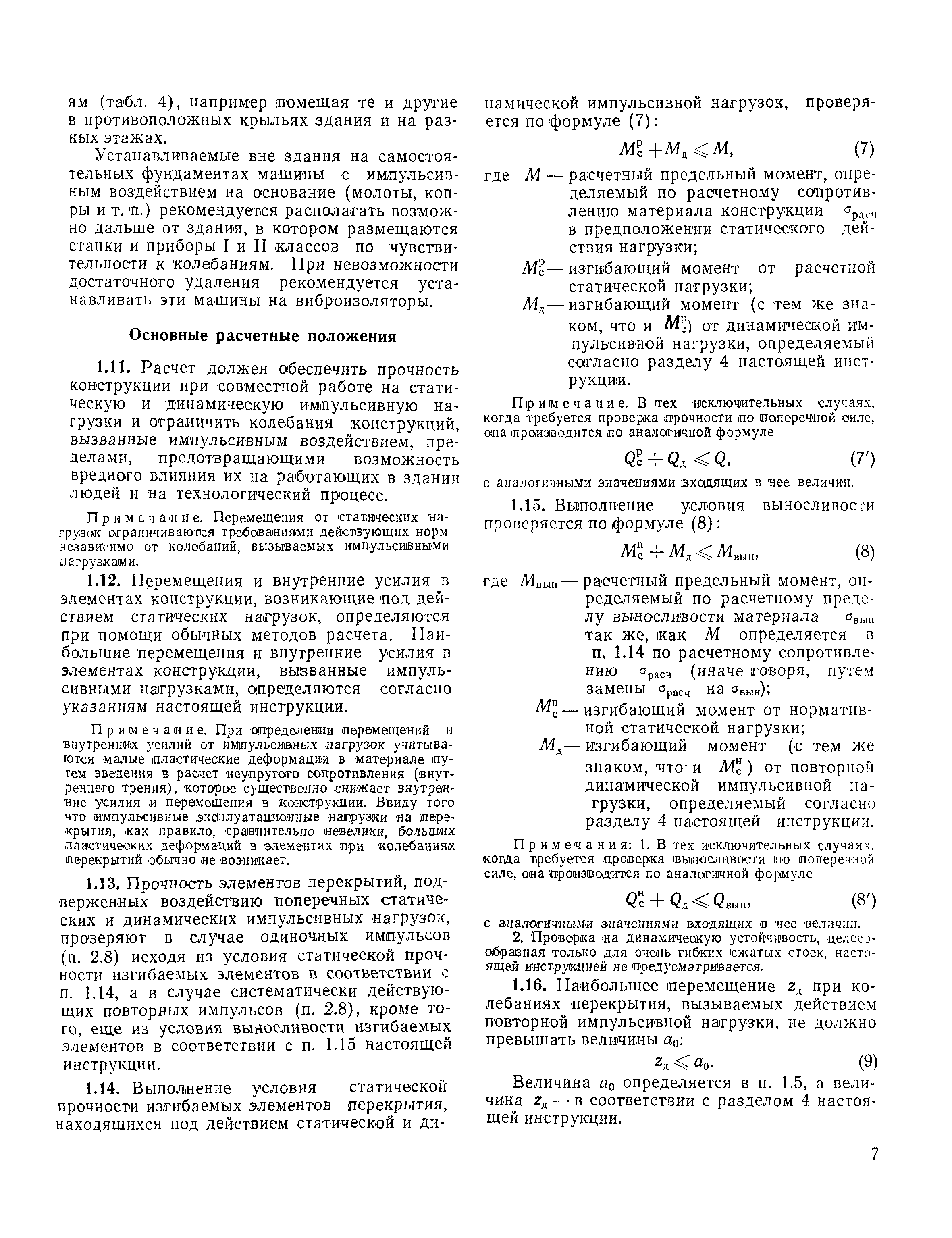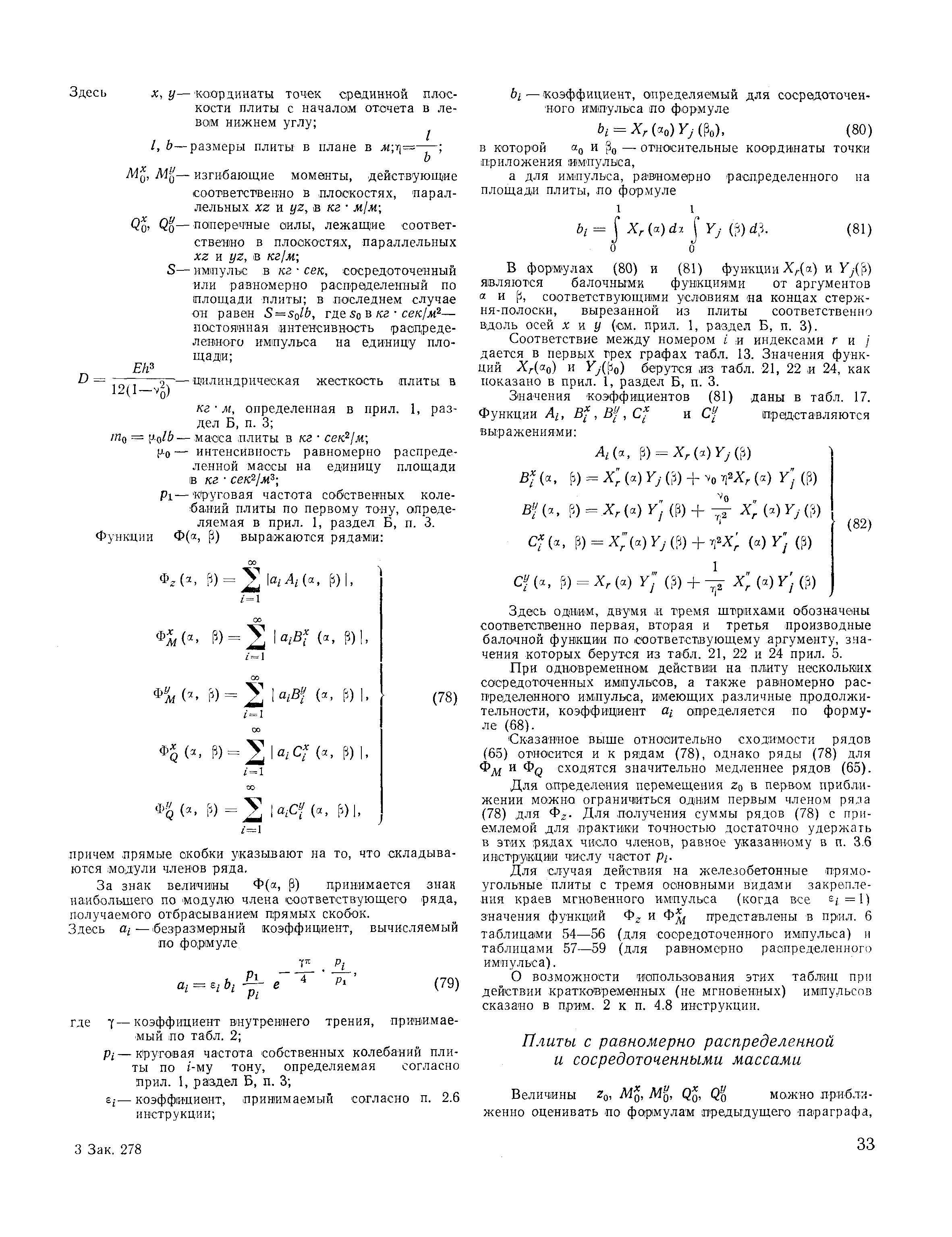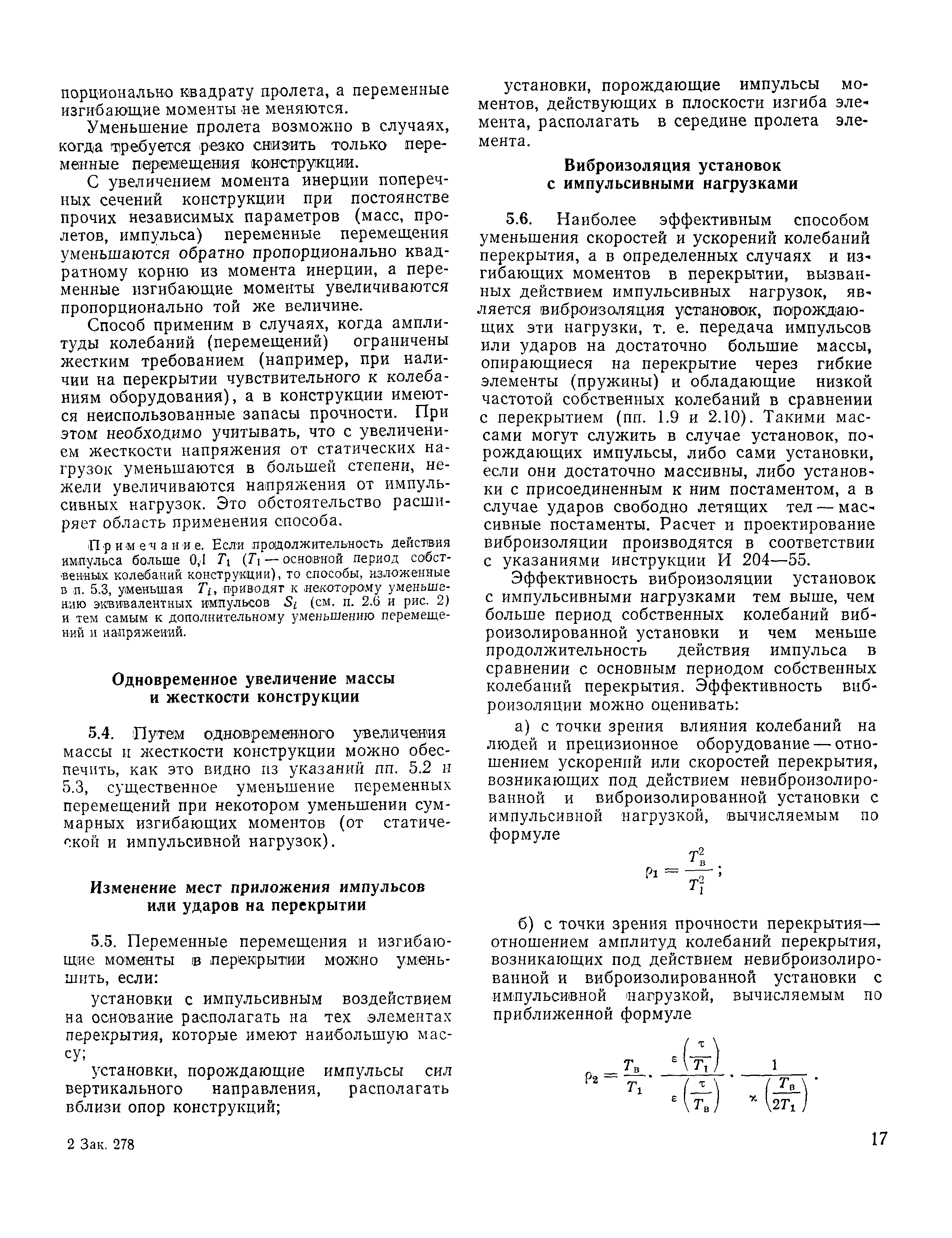 | Оглавление: | 1. Общие указания Состав задания на проектирование Указания по проектированию Основные расчетные положения 2. Импульсные нагрузки 3. Частоты собственных колебаний 4. Наибольшие перемещения и внутренние усилия при действии импульсивных нагрузок 5. Способы уменьшения колебаний, возникающих в конструкциях под действием импульсивных нагрузок Увеличение массы конструкции Увеличение жесткости конструкции Одновременное увеличение массы и жесткости конструкции Изменение мест приложения импульсов или ударов на перекрытия Виброизоляция установок с импульсивными нагрузками Приложение 1. Определение частот собственных колебаний Приложение 2. Определение наибольших перемещений и внутренних усилий, вызванных действием однократных импульсов Приложение 3. Определение наибольших переменных перемещений и внутренних усилий при однократных ударах тел Приложение 4. Определение наибольших перемещений и внутренних усилий, вызванных действием периодических импульсов и ударов Приложение 5. Таблицы балочных функций и их производных Приложение 6. Таблицы функций Фz и Фм для определения наибольших перемещений Zо и изгибающих моментов Мо, возникающих в железобетонных балках и плитах при действии на них мгновенных импульсов Приложение 7. Примеры расчета Приложение 8. Пояснения к основным параграфам инструкции |