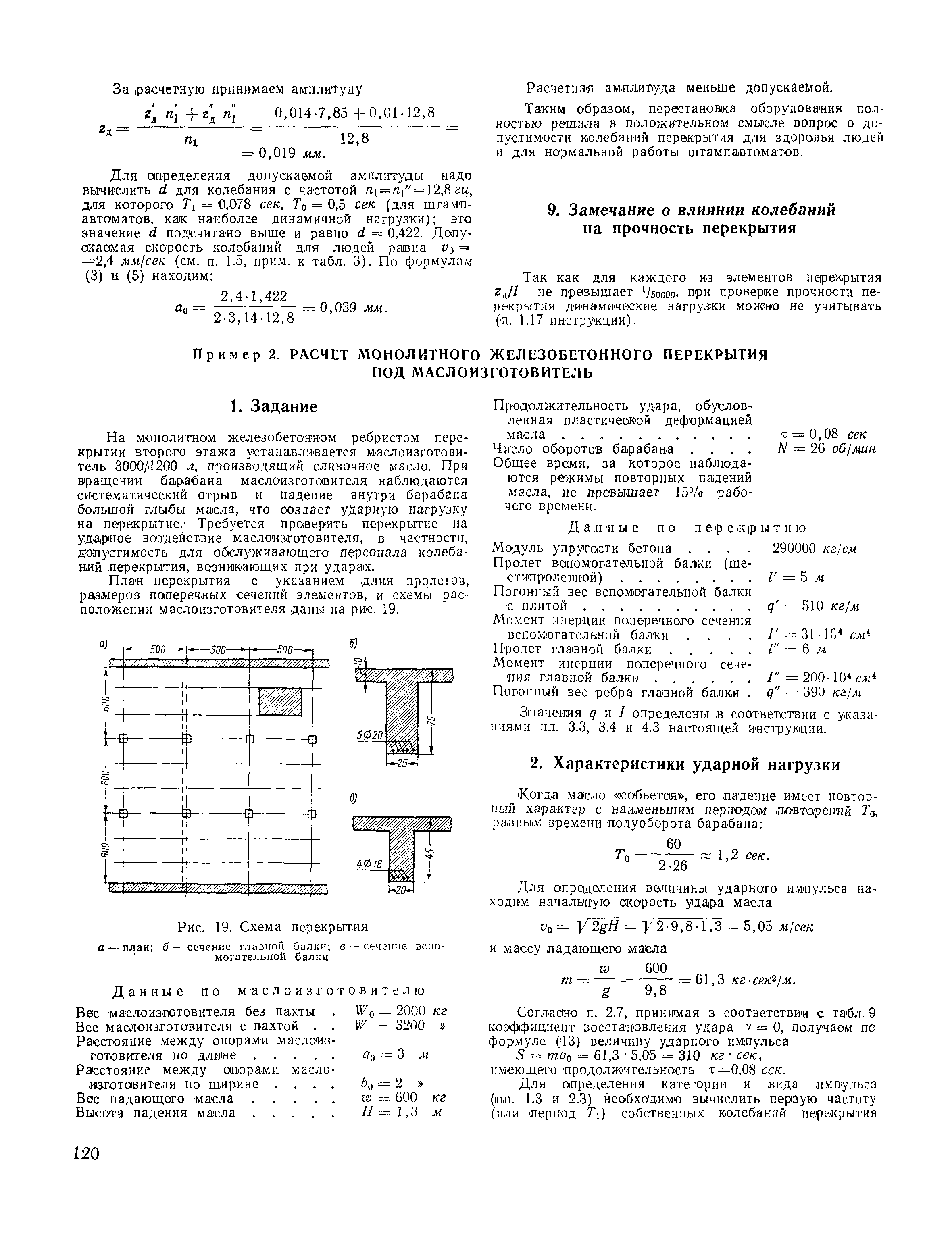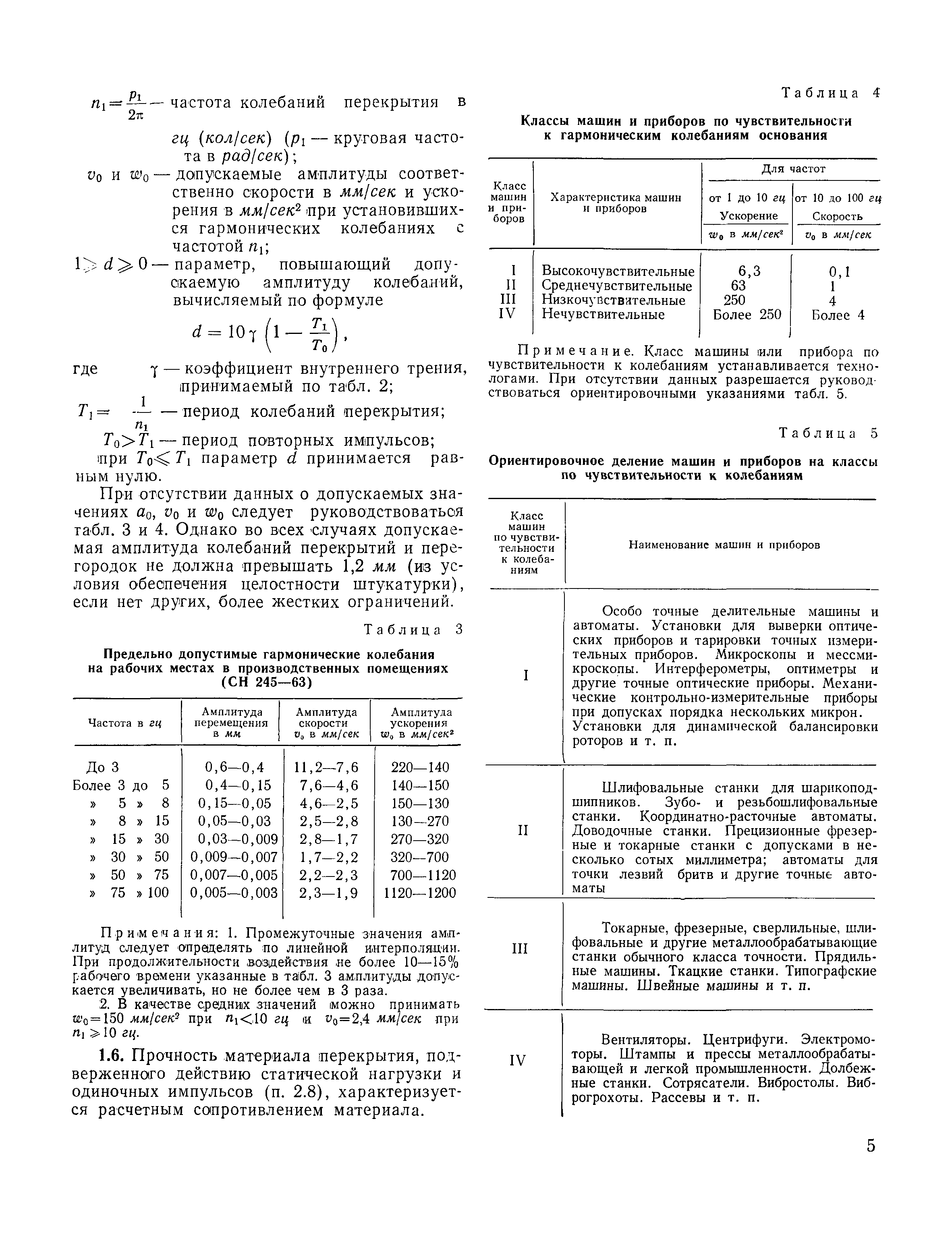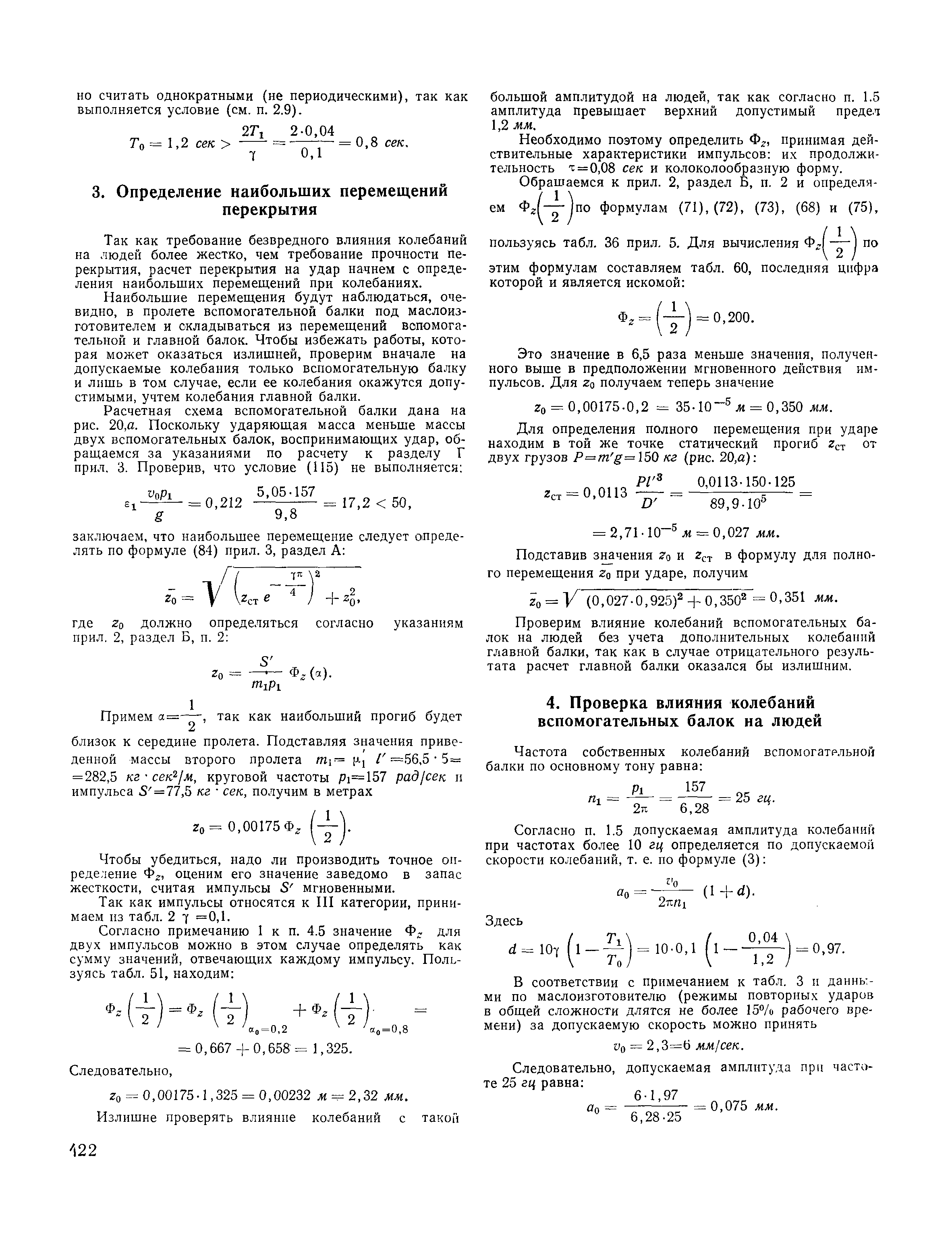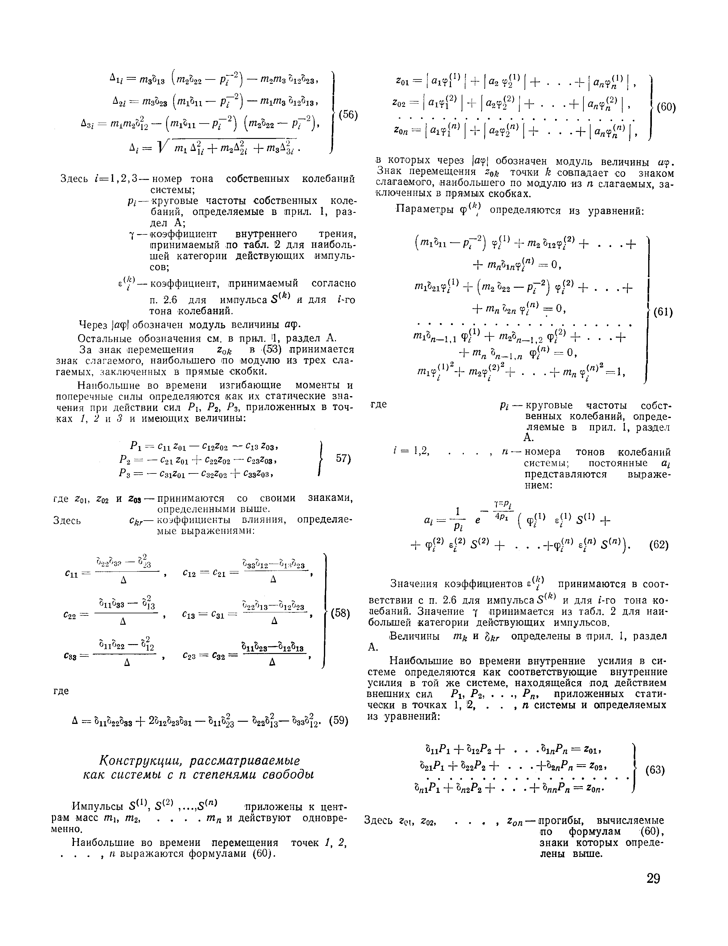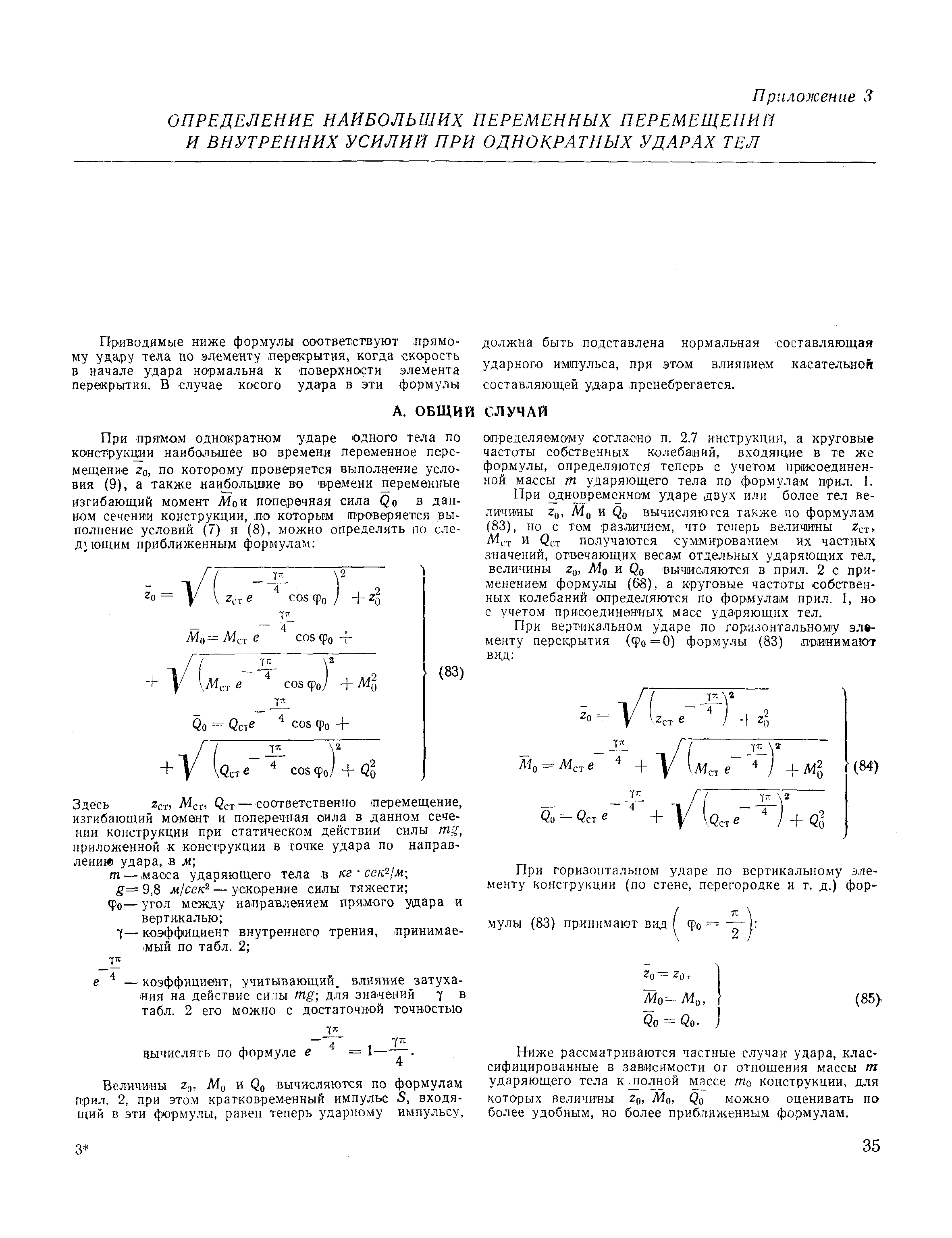 | Оглавление: | 1. Общие указания Состав задания на проектирование Указания по проектированию Основные расчетные положения 2. Импульсные нагрузки 3. Частоты собственных колебаний 4. Наибольшие перемещения и внутренние усилия при действии импульсивных нагрузок 5. Способы уменьшения колебаний, возникающих в конструкциях под действием импульсивных нагрузок Увеличение массы конструкции Увеличение жесткости конструкции Одновременное увеличение массы и жесткости конструкции Изменение мест приложения импульсов или ударов на перекрытия Виброизоляция установок с импульсивными нагрузками Приложение 1. Определение частот собственных колебаний Приложение 2. Определение наибольших перемещений и внутренних усилий, вызванных действием однократных импульсов Приложение 3. Определение наибольших переменных перемещений и внутренних усилий при однократных ударах тел Приложение 4. Определение наибольших перемещений и внутренних усилий, вызванных действием периодических импульсов и ударов Приложение 5. Таблицы балочных функций и их производных Приложение 6. Таблицы функций Фz и Фм для определения наибольших перемещений Zо и изгибающих моментов Мо, возникающих в железобетонных балках и плитах при действии на них мгновенных импульсов Приложение 7. Примеры расчета Приложение 8. Пояснения к основным параграфам инструкции |