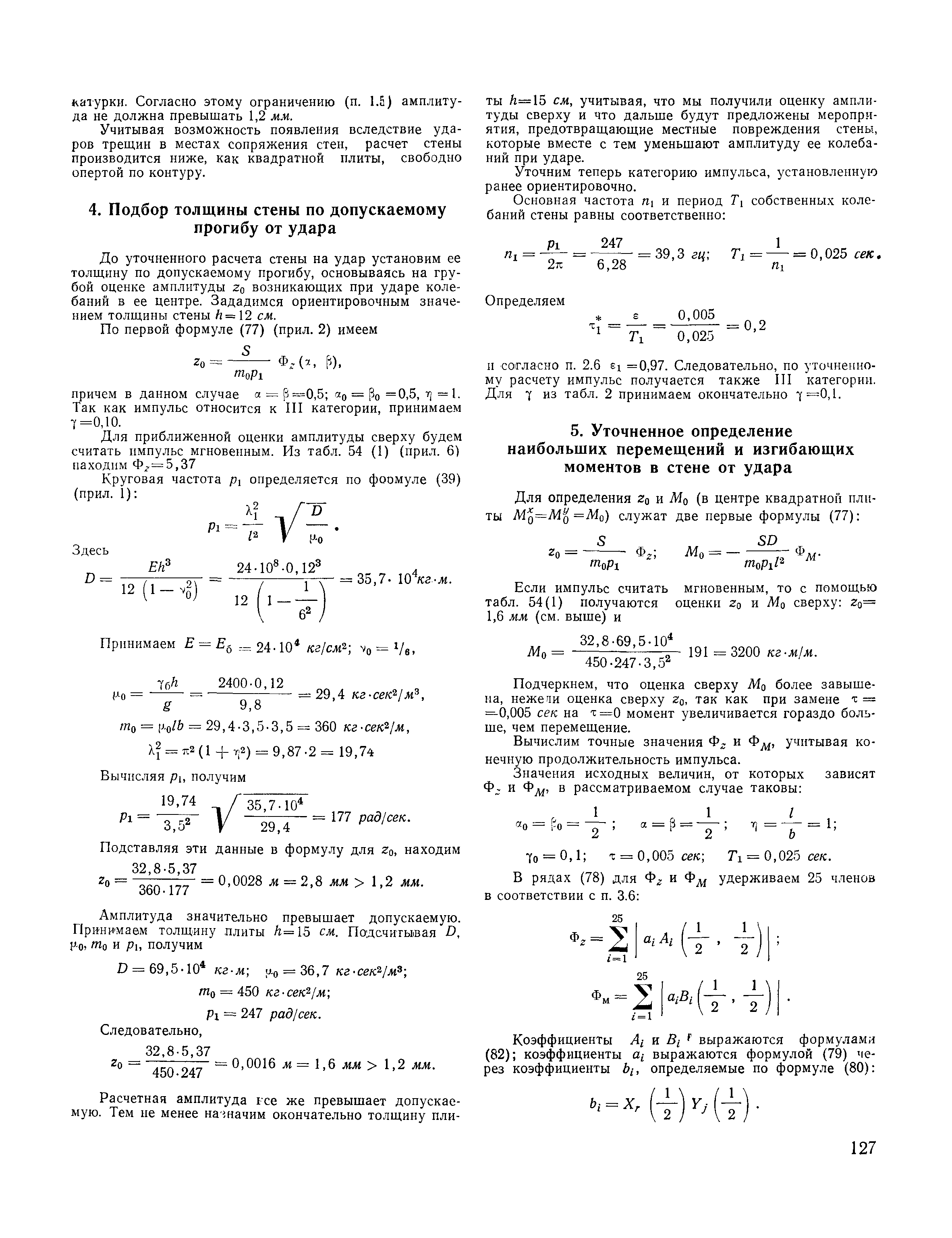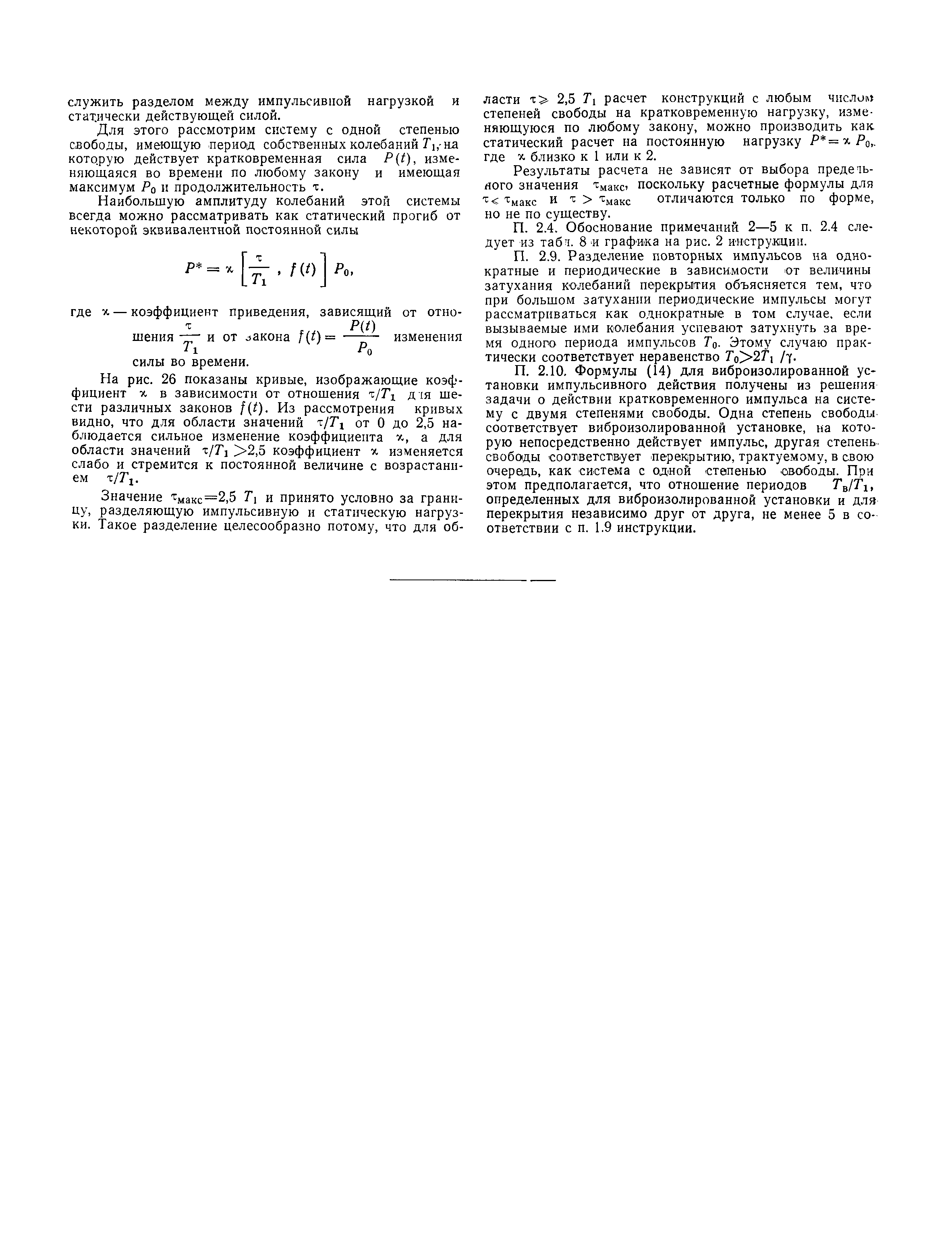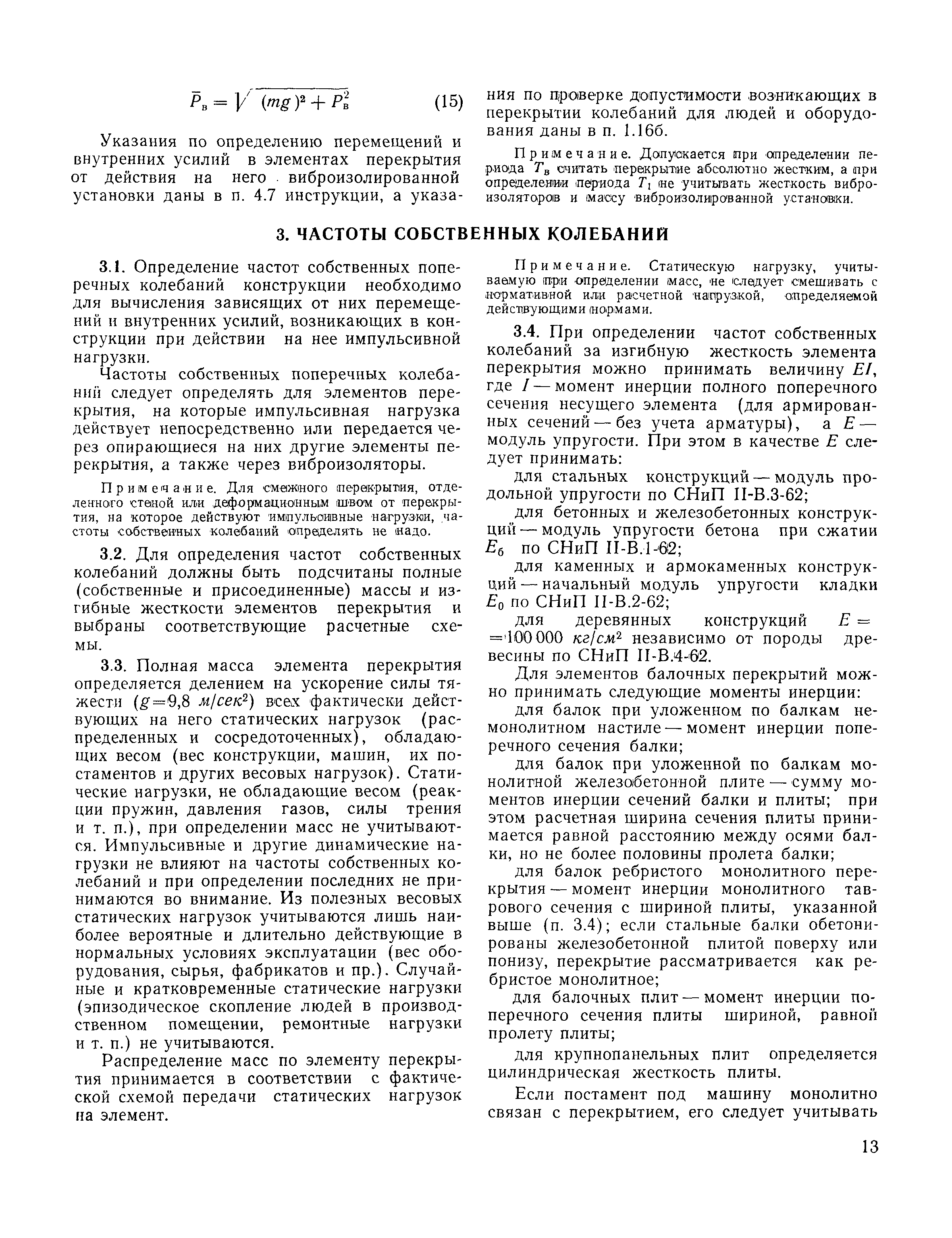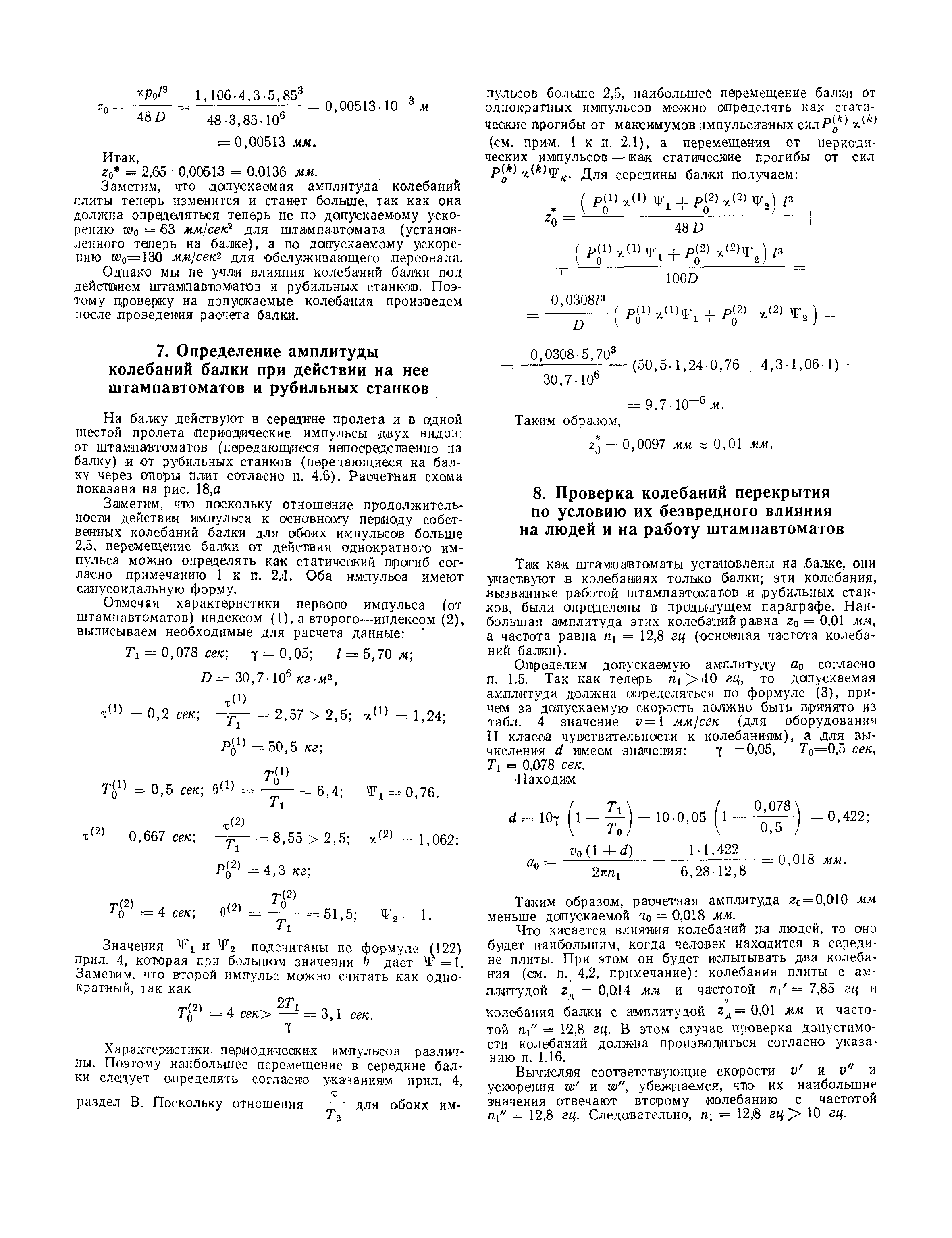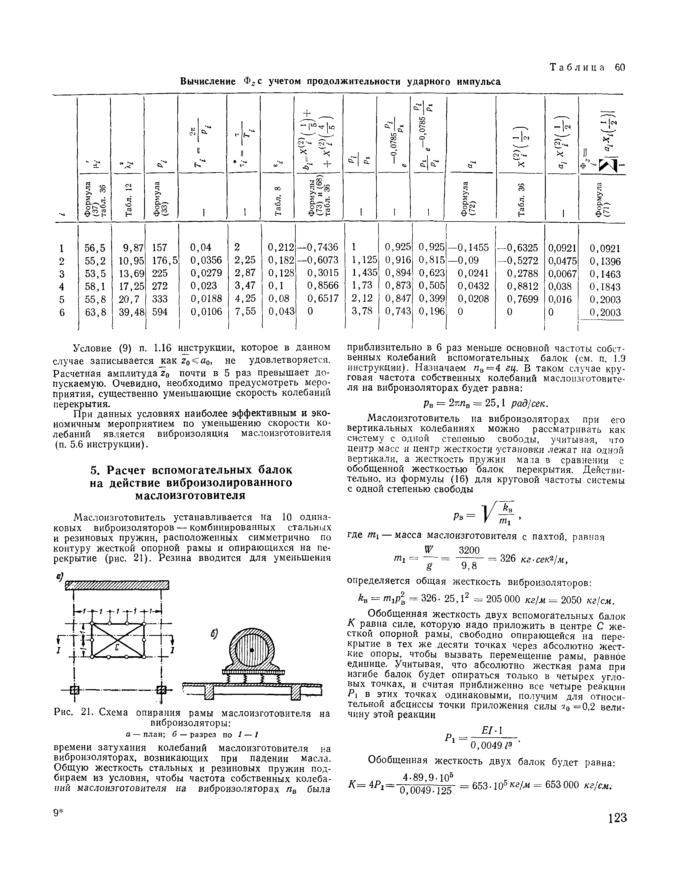 | Оглавление: | 1. Общие указания Состав задания на проектирование Указания по проектированию Основные расчетные положения 2. Импульсные нагрузки 3. Частоты собственных колебаний 4. Наибольшие перемещения и внутренние усилия при действии импульсивных нагрузок 5. Способы уменьшения колебаний, возникающих в конструкциях под действием импульсивных нагрузок Увеличение массы конструкции Увеличение жесткости конструкции Одновременное увеличение массы и жесткости конструкции Изменение мест приложения импульсов или ударов на перекрытия Виброизоляция установок с импульсивными нагрузками Приложение 1. Определение частот собственных колебаний Приложение 2. Определение наибольших перемещений и внутренних усилий, вызванных действием однократных импульсов Приложение 3. Определение наибольших переменных перемещений и внутренних усилий при однократных ударах тел Приложение 4. Определение наибольших перемещений и внутренних усилий, вызванных действием периодических импульсов и ударов Приложение 5. Таблицы балочных функций и их производных Приложение 6. Таблицы функций Фz и Фм для определения наибольших перемещений Zо и изгибающих моментов Мо, возникающих в железобетонных балках и плитах при действии на них мгновенных импульсов Приложение 7. Примеры расчета Приложение 8. Пояснения к основным параграфам инструкции |