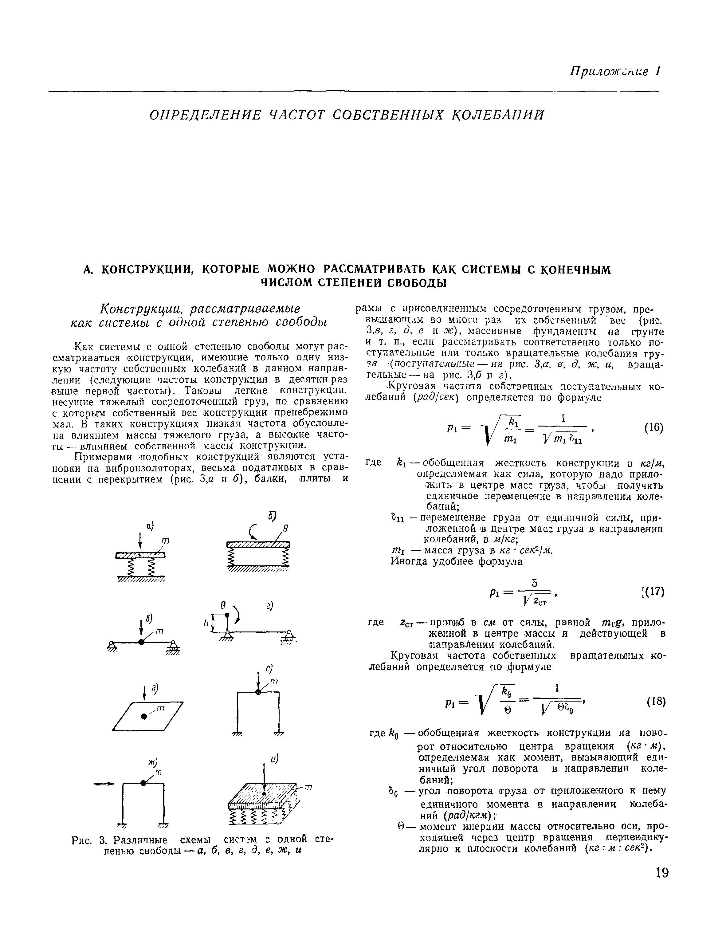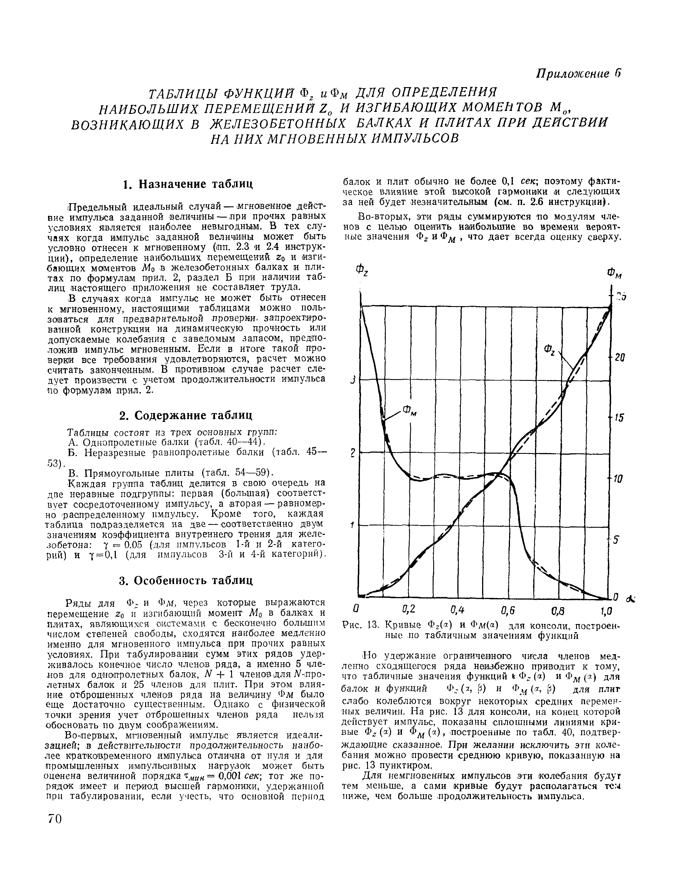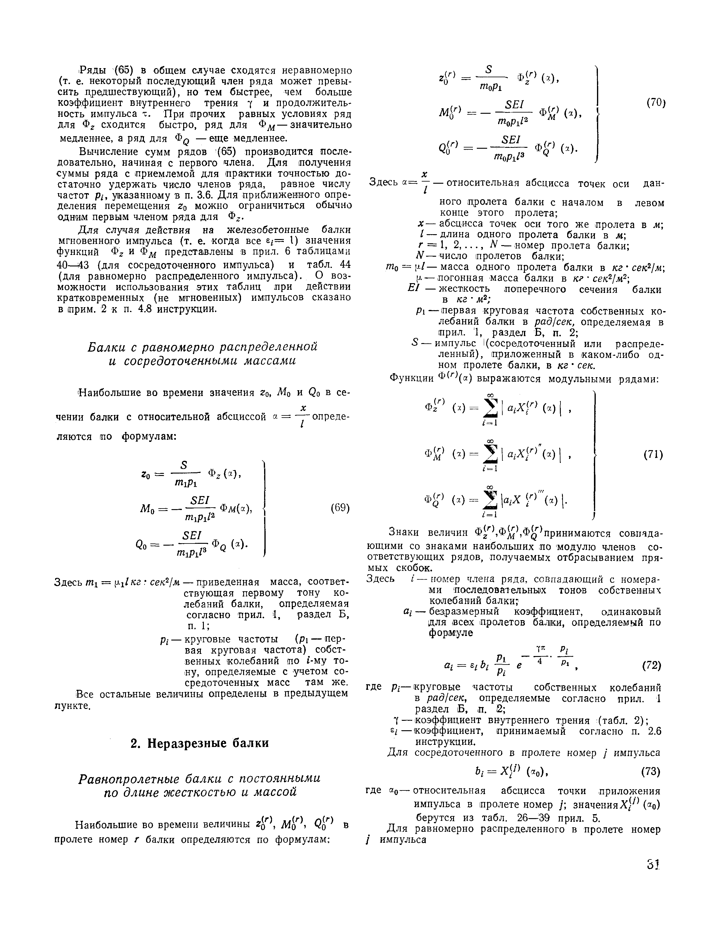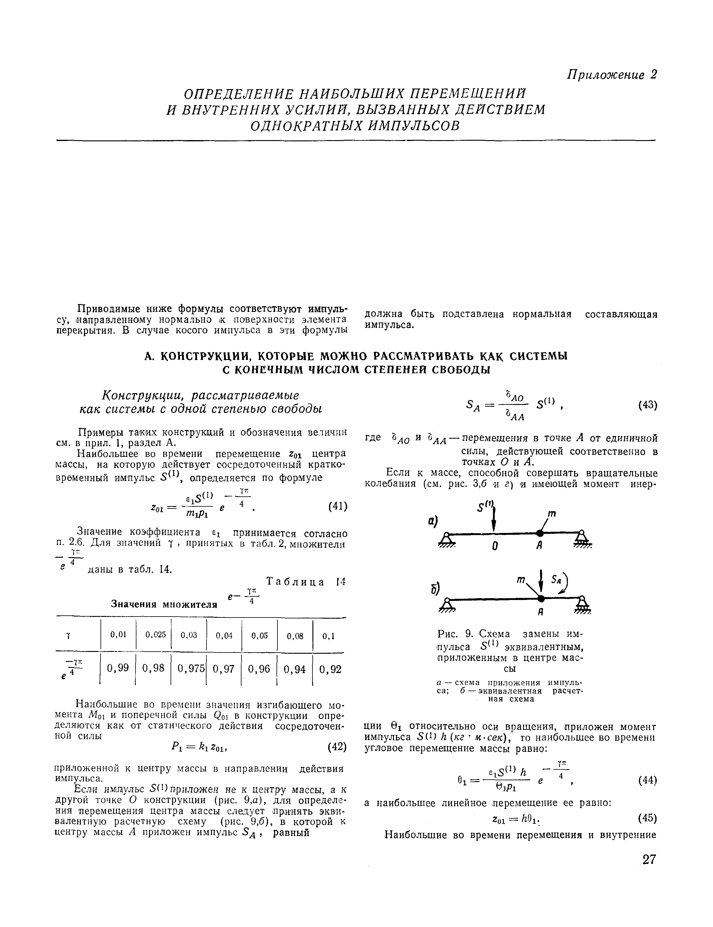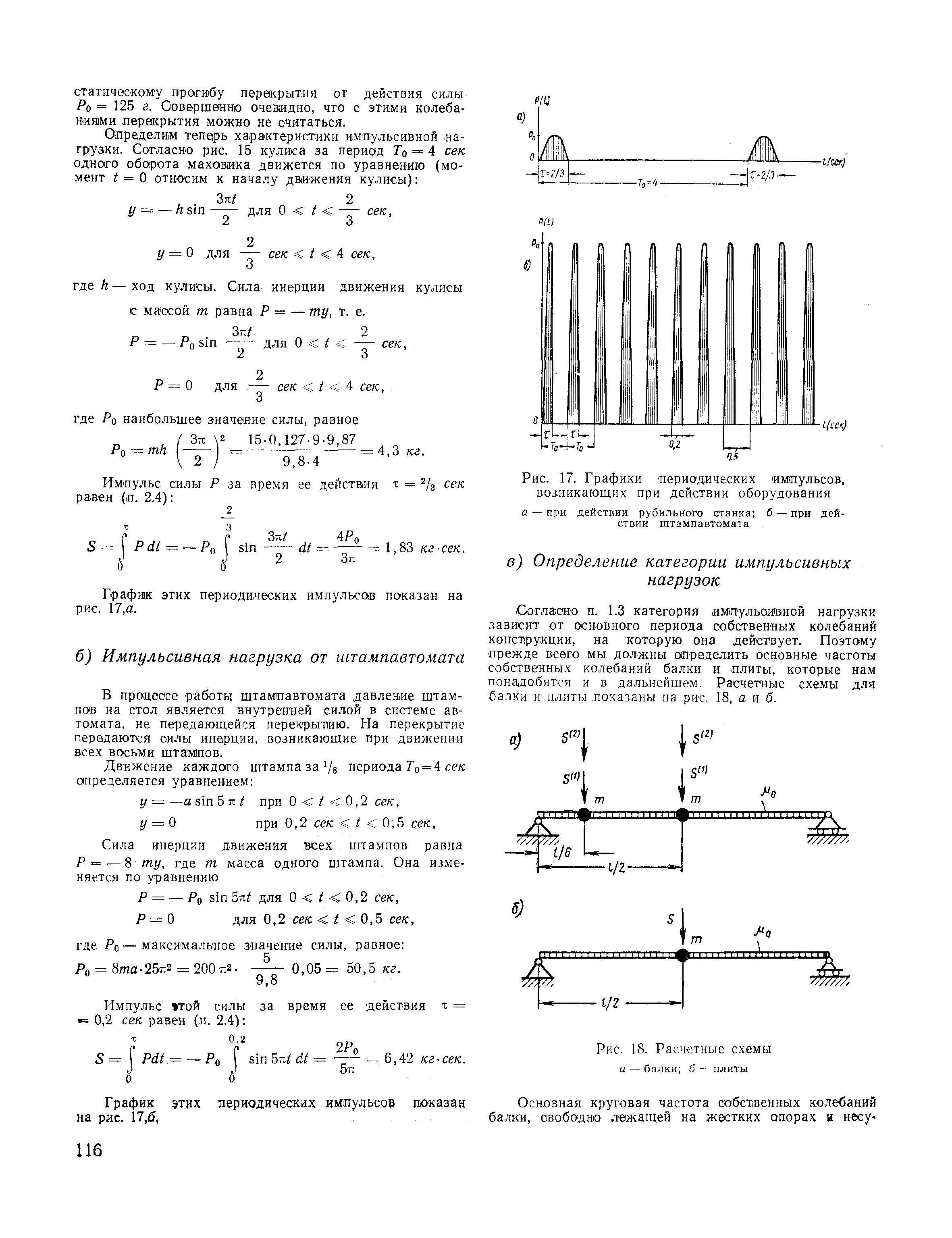 | Оглавление: | 1. Общие указания Состав задания на проектирование Указания по проектированию Основные расчетные положения 2. Импульсные нагрузки 3. Частоты собственных колебаний 4. Наибольшие перемещения и внутренние усилия при действии импульсивных нагрузок 5. Способы уменьшения колебаний, возникающих в конструкциях под действием импульсивных нагрузок Увеличение массы конструкции Увеличение жесткости конструкции Одновременное увеличение массы и жесткости конструкции Изменение мест приложения импульсов или ударов на перекрытия Виброизоляция установок с импульсивными нагрузками Приложение 1. Определение частот собственных колебаний Приложение 2. Определение наибольших перемещений и внутренних усилий, вызванных действием однократных импульсов Приложение 3. Определение наибольших переменных перемещений и внутренних усилий при однократных ударах тел Приложение 4. Определение наибольших перемещений и внутренних усилий, вызванных действием периодических импульсов и ударов Приложение 5. Таблицы балочных функций и их производных Приложение 6. Таблицы функций Фz и Фм для определения наибольших перемещений Zо и изгибающих моментов Мо, возникающих в железобетонных балках и плитах при действии на них мгновенных импульсов Приложение 7. Примеры расчета Приложение 8. Пояснения к основным параграфам инструкции |