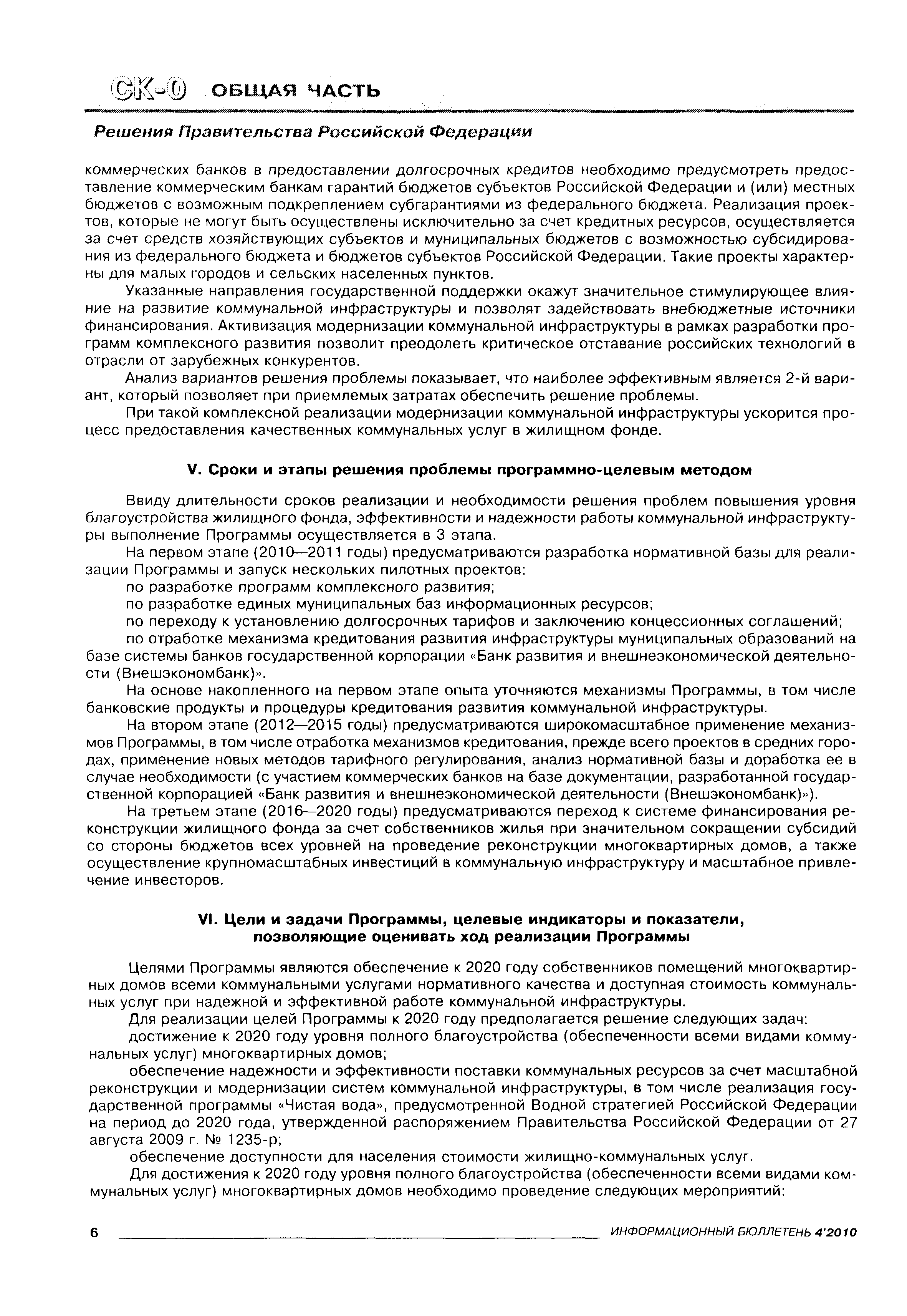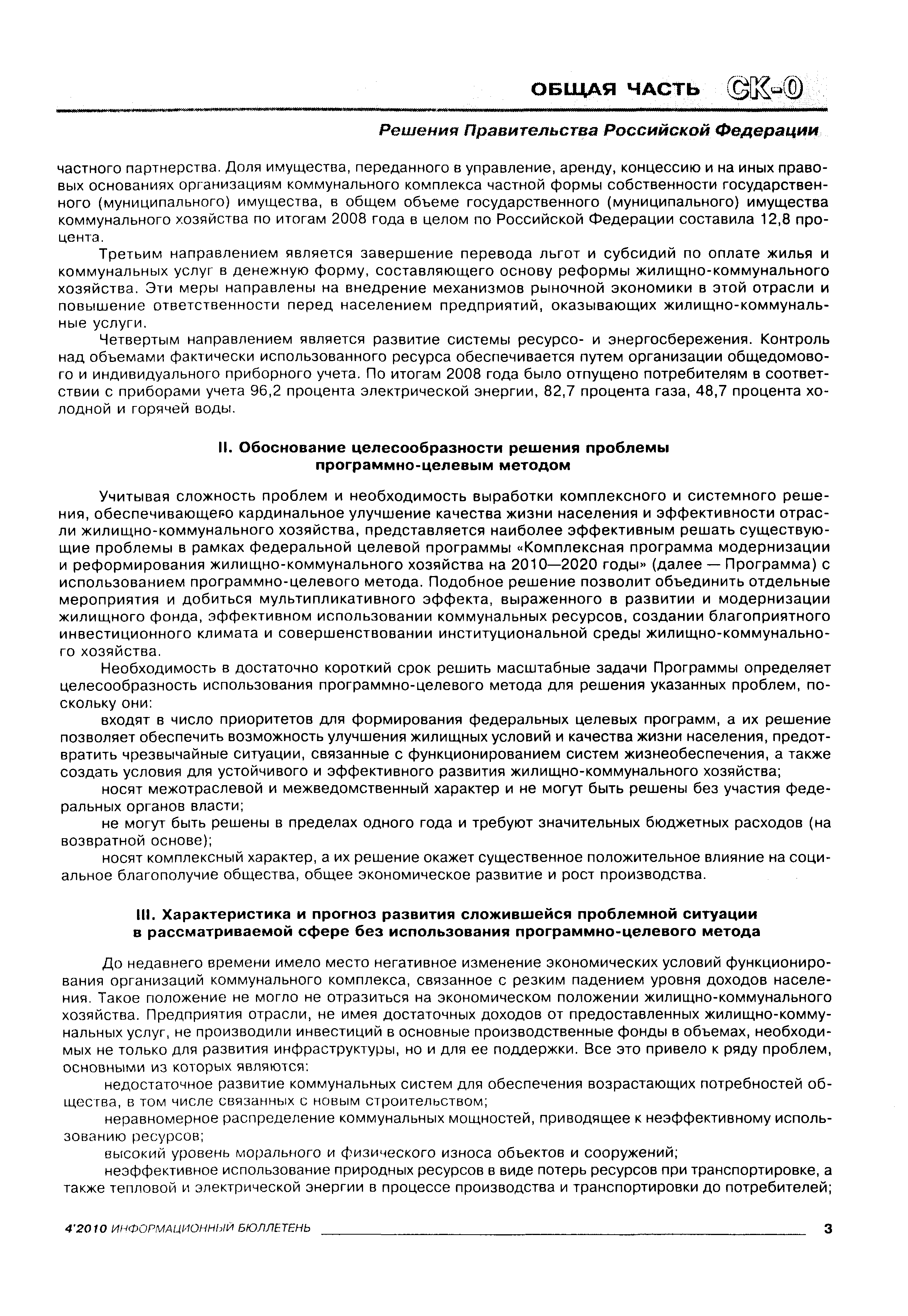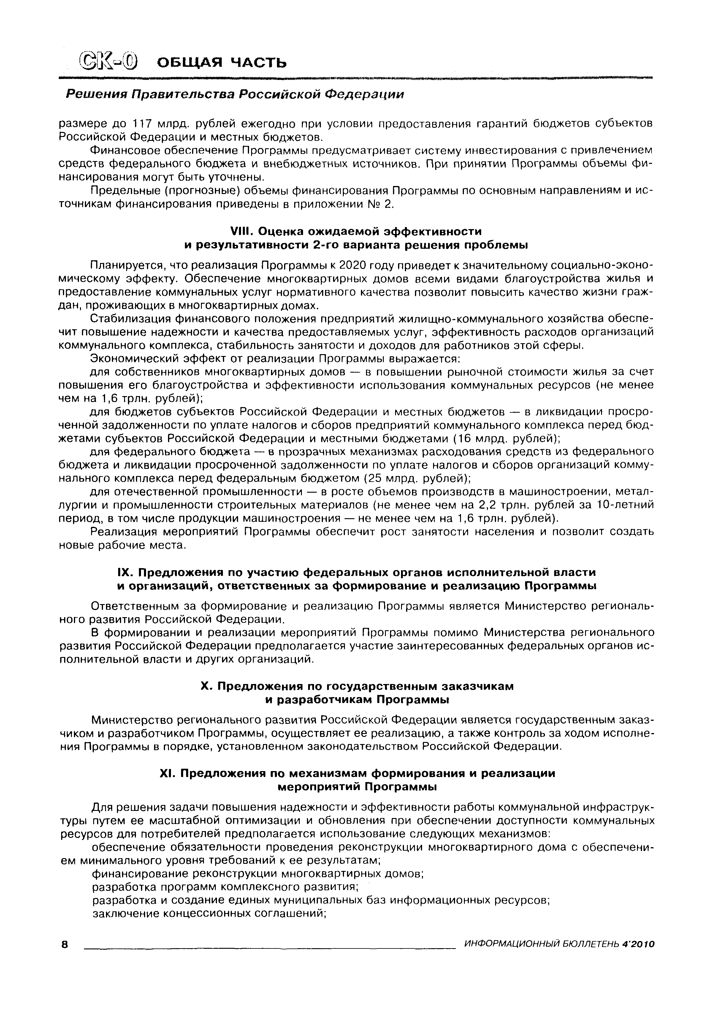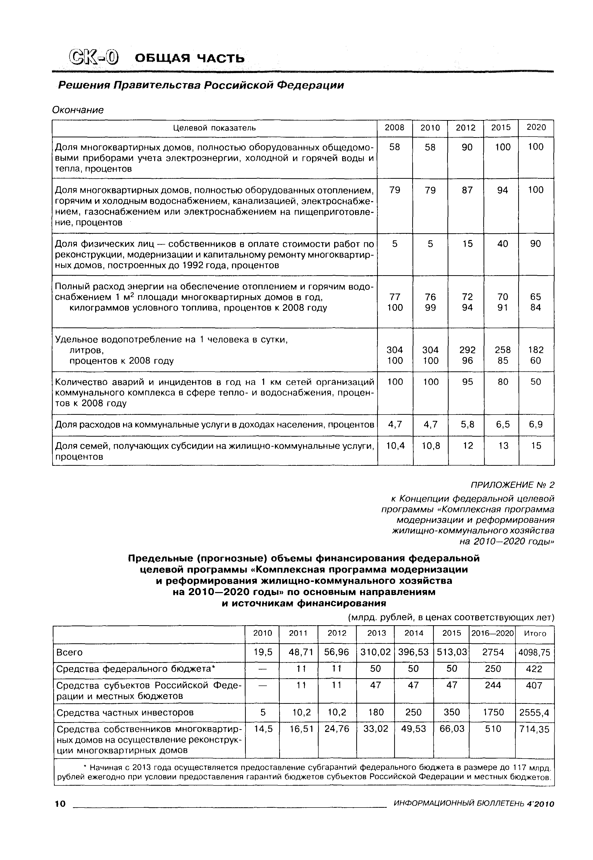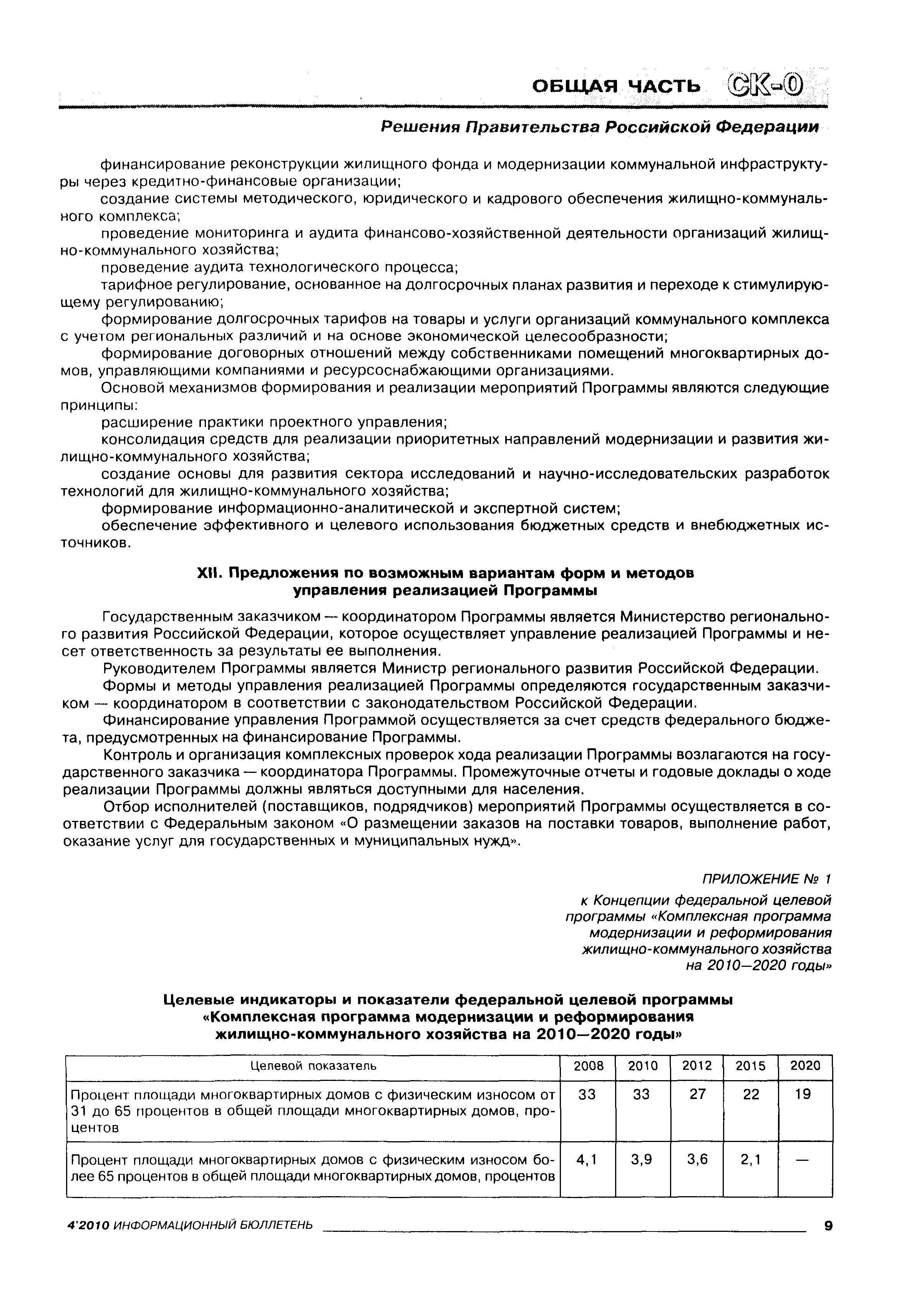 | Оглавление: | I. Обоснование соответствия решаемой проблемы и целей Программы приоритетным задачам социально-экономического развития Российской Федерации II. Обоснование целесообразности решения проблемы программно-целевым методом III. Характеристика и прогноз развития сложившейся проблемной ситуации в рассматриваемой сфере без использования программно-целевого метода IV. Возможные варианты решения проблем, оценка преимуществ и рисков, возникающих при различных вариантах решения проблемы V. Сроки и этапы решения проблемы программно-целевым методом VI. Цели и задачи Программы, целевые индикаторы и показатели, позволяющие оценивать ход реализации Программы VII. Объемы и источники финансирования Программы VIII. Оценка ожидаемой эффективности и результативности 2-го варианта решения проблемы IX. Предложения по участию федеральных органов исполнительной власти и организаций, ответственных за формирование и реализацию Программы X. Предложения по государственным заказчикам и разработчикам Программы XI. Предложения по механизмам формирования и реализации мероприятий Программы XII. Предложения по возможным вариантам форм и методов управления реализацией Программы Приложение 1. Целевые индикаторы и показатели федеральной целевой программы «Комплексная программа модернизации и реформирования жилищно-коммунального хозяйства на 2010-2020 годы» Приложение 2. Предельные (прогнозные) объемы финансирования федеральной целевой программы «Комплексная программа модернизации и реформирования жилищно-коммунального хозяйства на 2010-2020 годы» по основным направлениям и источникам финансирования |