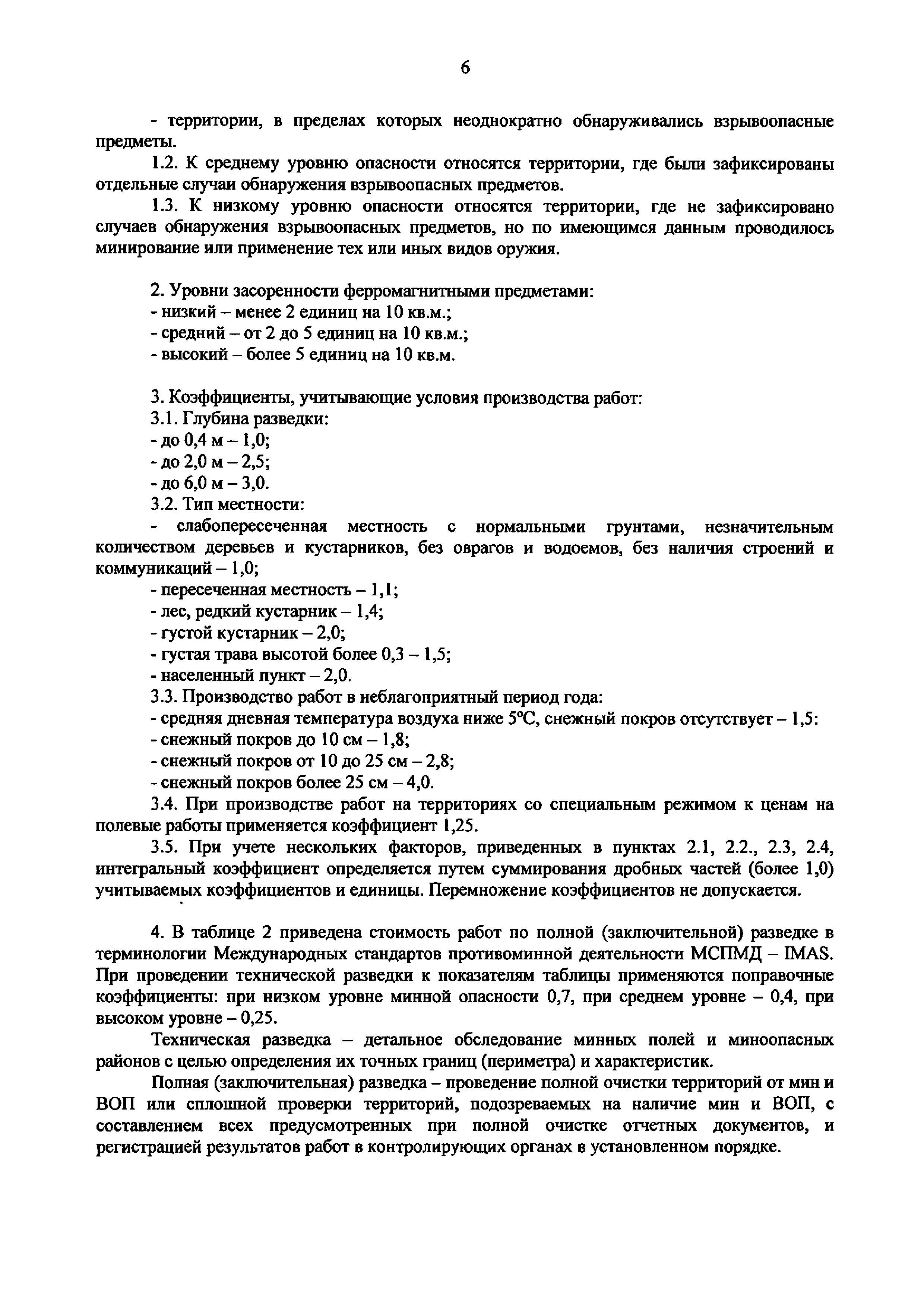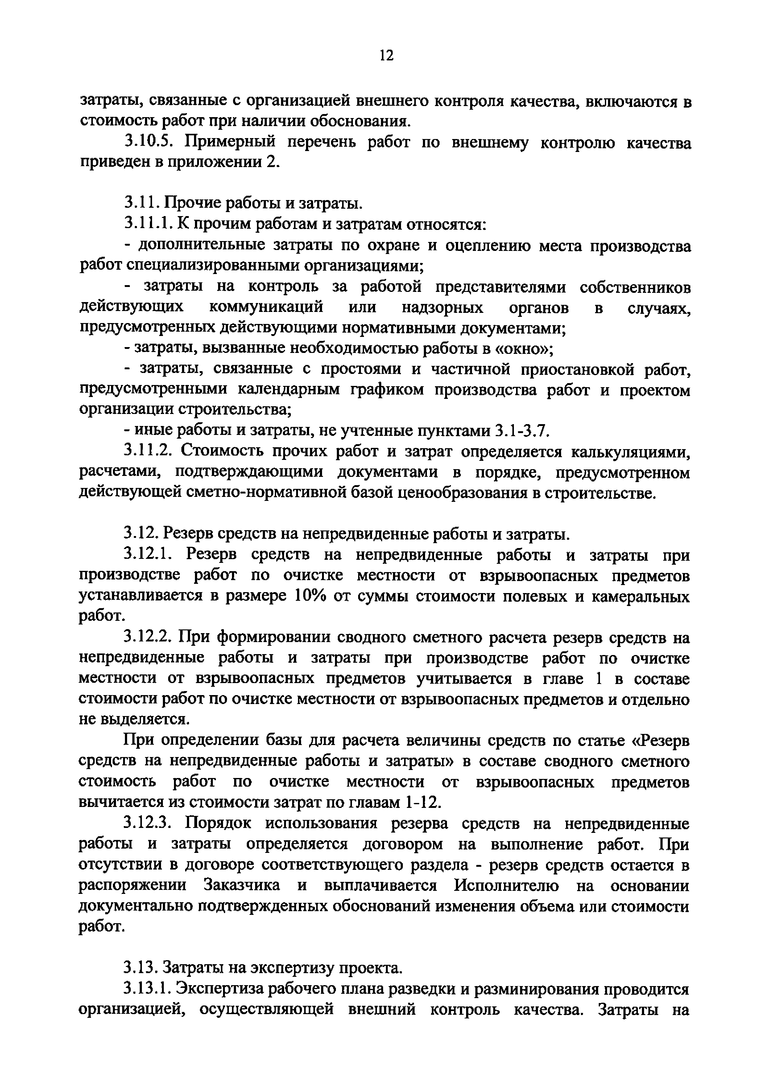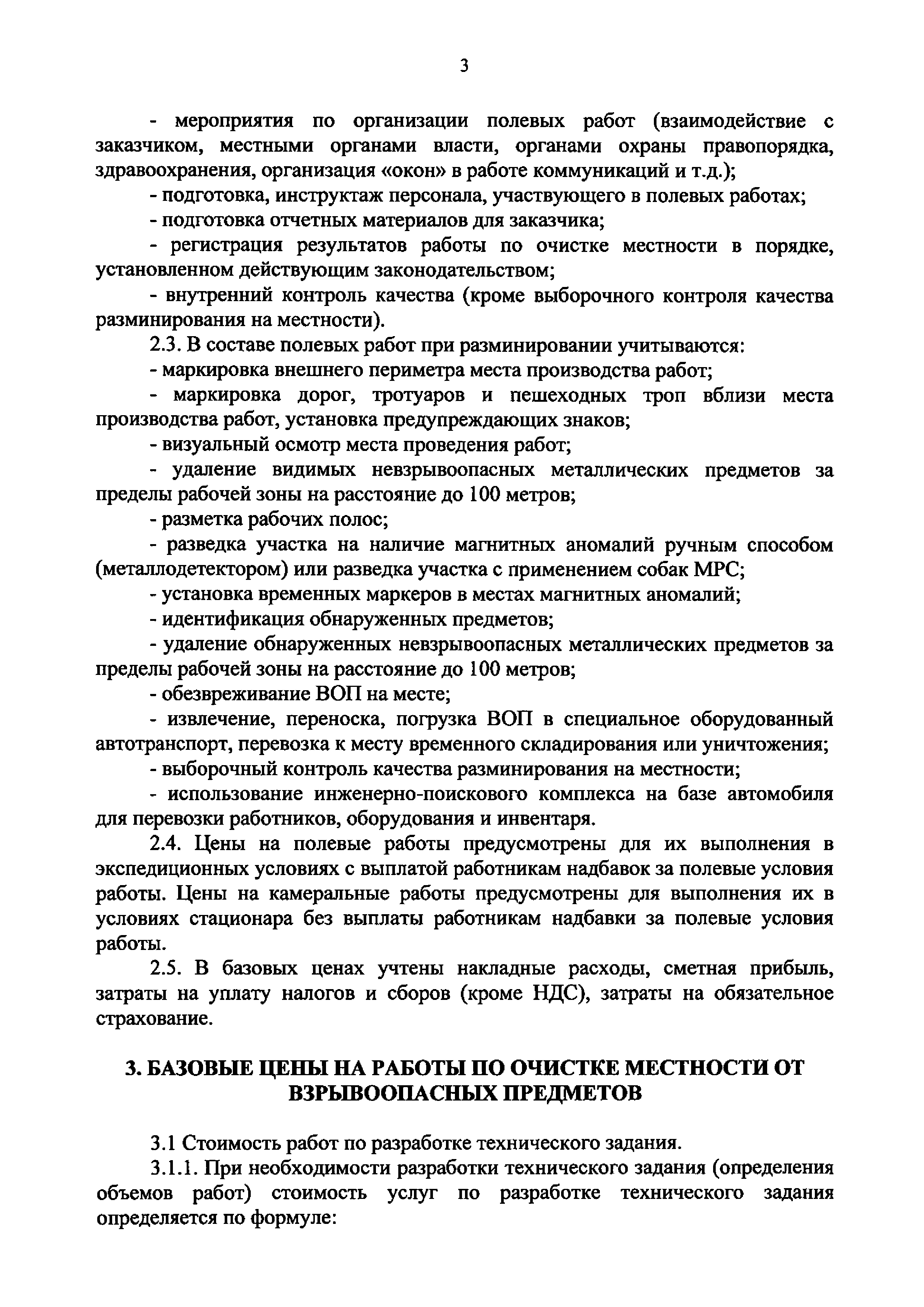 | Оглавление: | 1. Общие положения 2. Состав работ и элементы затрат 3. Базовые цены на работы по очистке местности от взрывоопасных предметов 4. Определение объемов работ 5. Сметная документация 6. Приведение стоимости к текущему и прогнозному уровню цен. Определение начальной (максимальной) цены контракта Приложение 1 (Пример) Смета на выполнение работ по очистке местности от взрывоопасных предметов Приложение 2 Примерный перечень работ по внешнему контролю качества Приложение 3 Термины и определения |