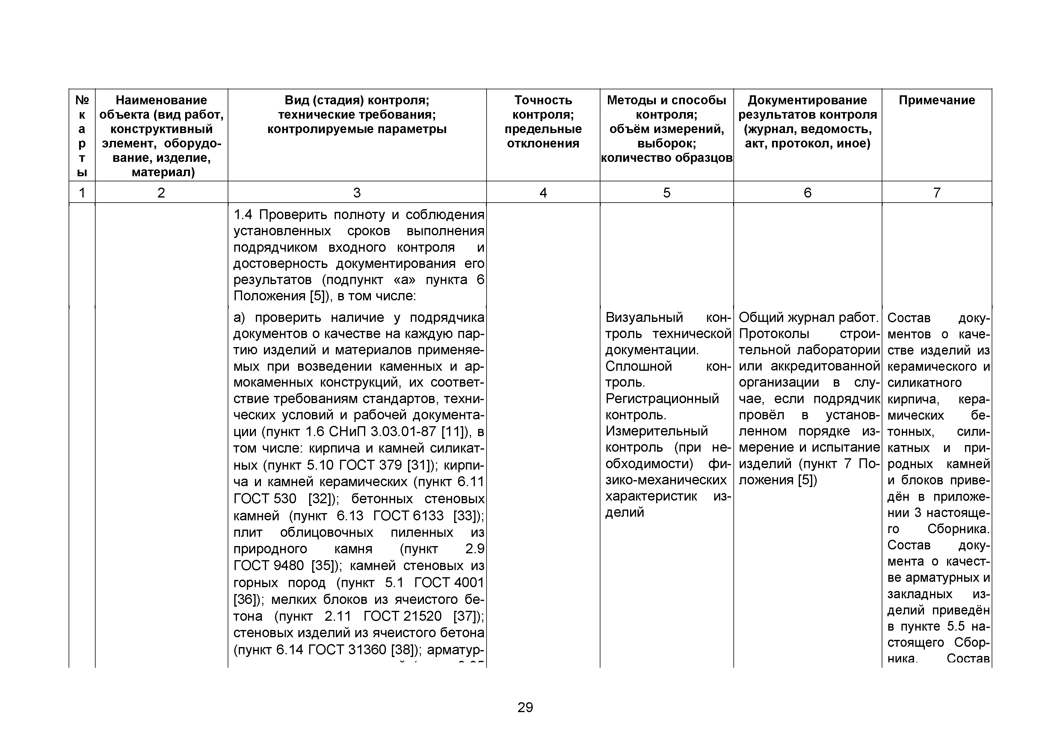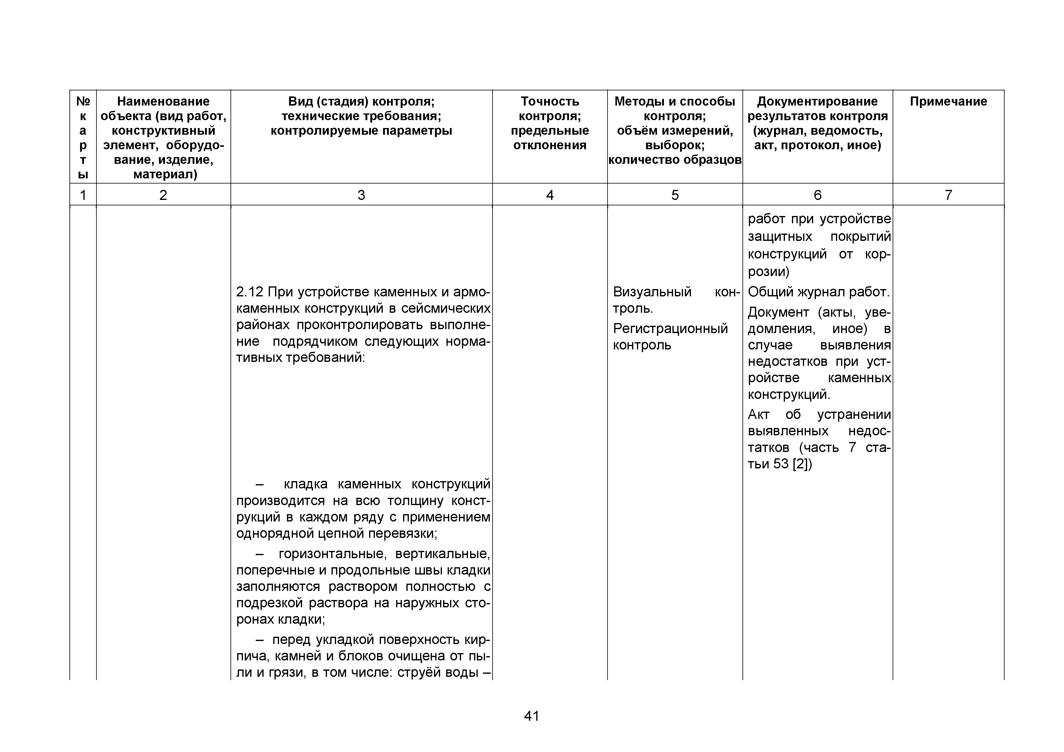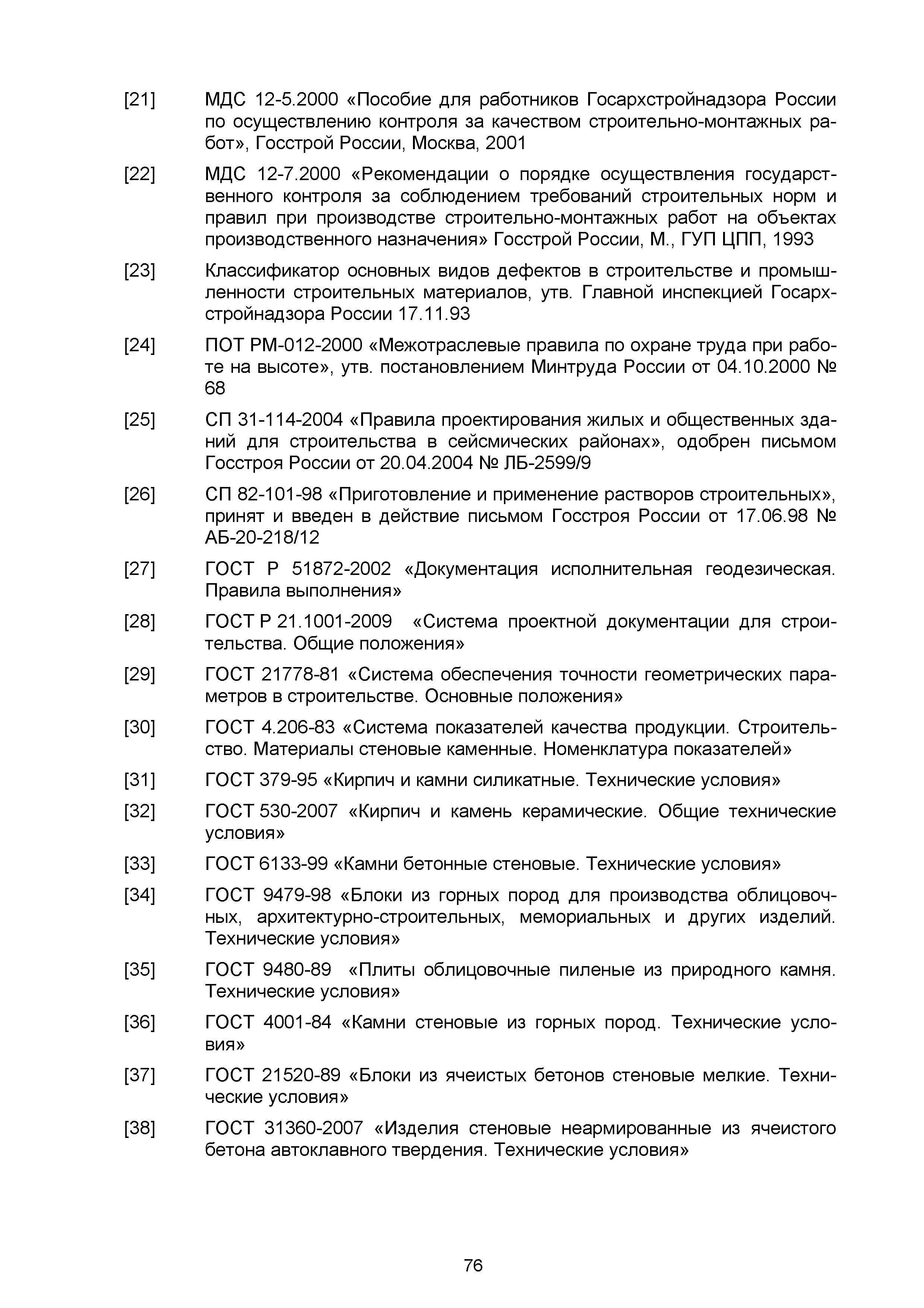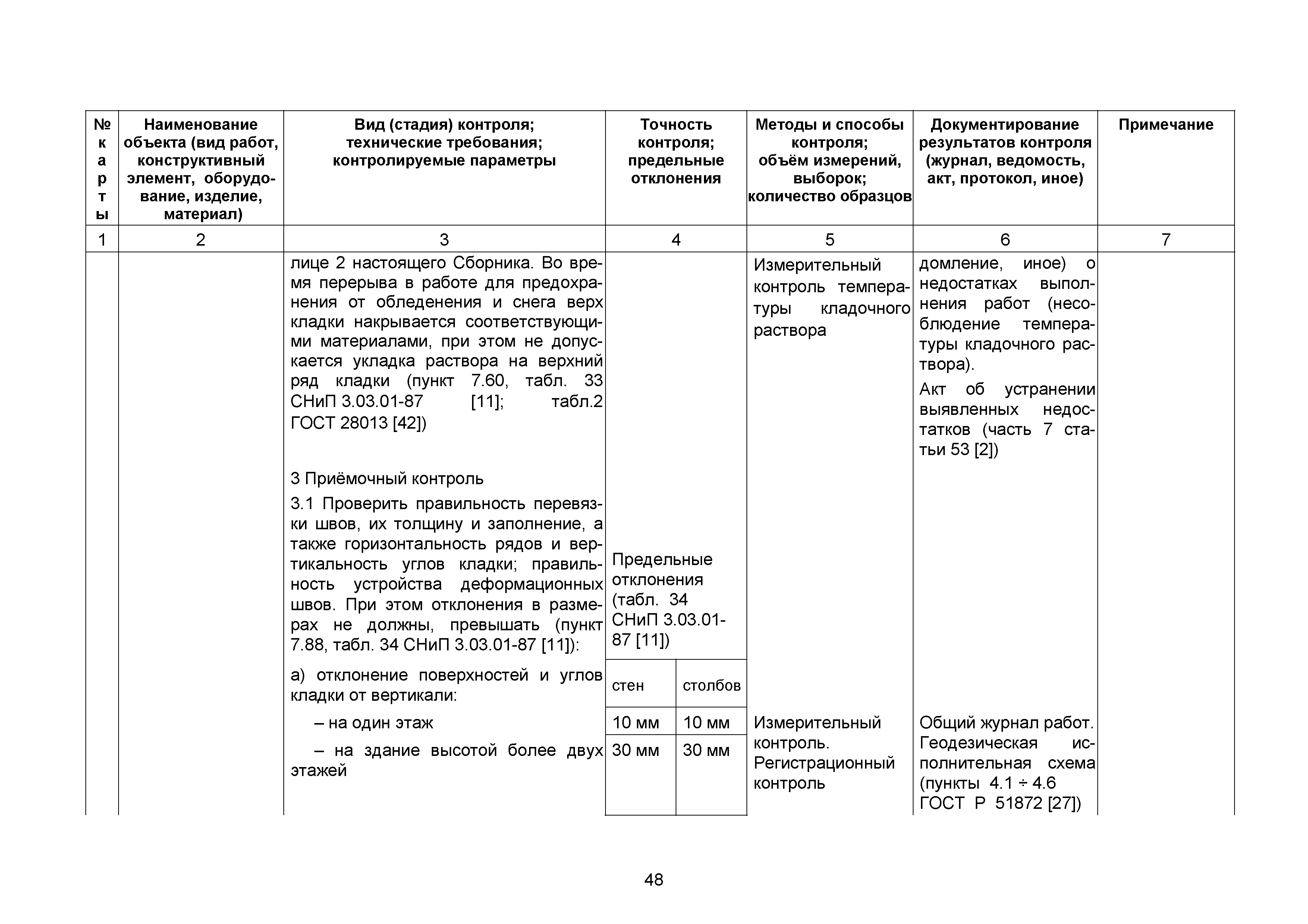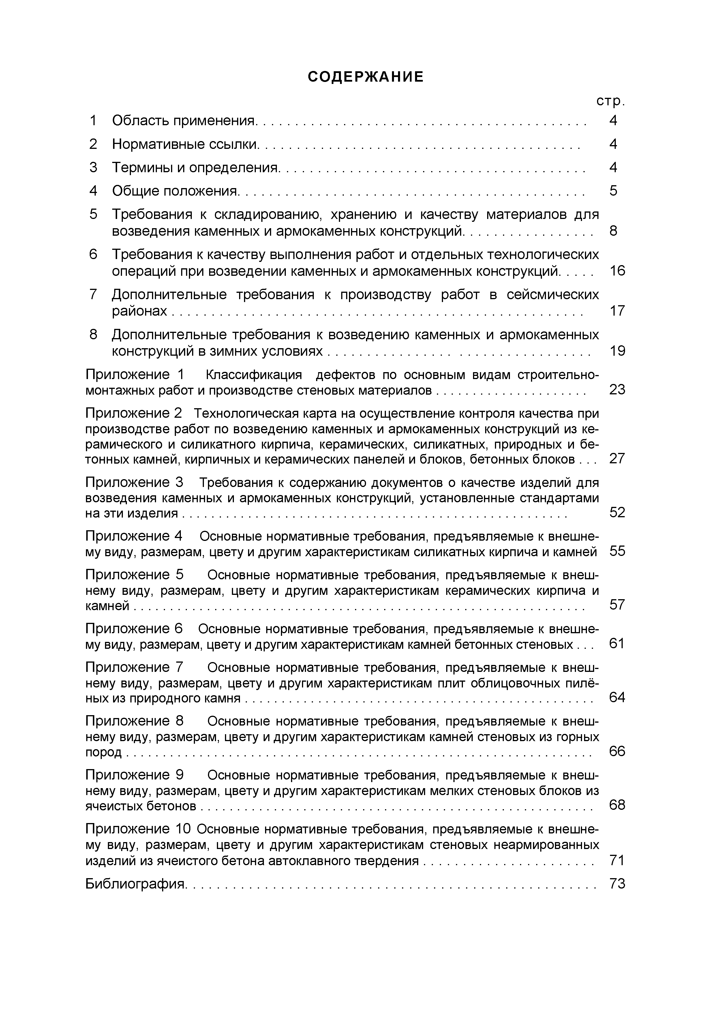 | Оглавление: | 1 Область применения 2 Нормативные ссылки 3 Термины и определения 4 Общие положения 5 Требования к складированию, хранению и качеству материалов для возведения каменных и армокаменных конструкций 6 Требования к качеству выполнения работ и отдельных технологических операций при возведении каменных и армокаменных конструкций 7 Дополнительные требования к производству работ в сейсмических районах 8 Дополнительные требования к возведению каменных и армокаменных конструкций в зимних условиях Приложение 1. Классификация дефектов по основным видам строительно-монтажных работ и производстве стеновых материалов Приложение 2. Технологическая карта на осуществление контроля качества при производстве работ по возведению каменных и армокаменных конструкций из керамического и силикатного кирпича, керамических, силикатных, природных и бетонных камней, кирпичных и керамических панелей и блоков, бетонных блоков Приложение 3. Требования к содержанию документов о качестве изделий для возведения каменных и армокаменных конструкций, установленные стандартами на эти изделия Приложение 4. Основные нормативные требования, предъявляемые к внешнему виду, размерам, цвету и другим характеристикам силикатных кирпича и камней Приложение 5. Основные нормативные требования, предъявляемые к внешнему виду, размерам, цвету и другим характеристикам керамических кирпича и камней Приложение 6. Основные нормативные требования, предъявляемые к внешнему виду, размерам, цвету и другим характеристикам камней бетонных стеновых Приложение 7. Основные нормативные требования, предъявляемые к внешнему виду, размерам, цвету и другим характеристикам плит облицовочных пиленых из природного камня Приложение 8. Основные нормативные требования, предъявляемые к внешнему виду, размерам, цвету и другим характеристикам камней стеновых из горных пород Приложение 9. Основные нормативные требования, предъявляемые к внешнему виду, размерам, цвету и другим характеристикам мелких стеновых блоков из ячеистых бетонов Приложение 10. Основные нормативные требования, предъявляемые к внешнему виду, размерам, цвету и другим характеристикам стеновых неармированных изделий из ячеистого бетона автоклавного твердения Библиография |