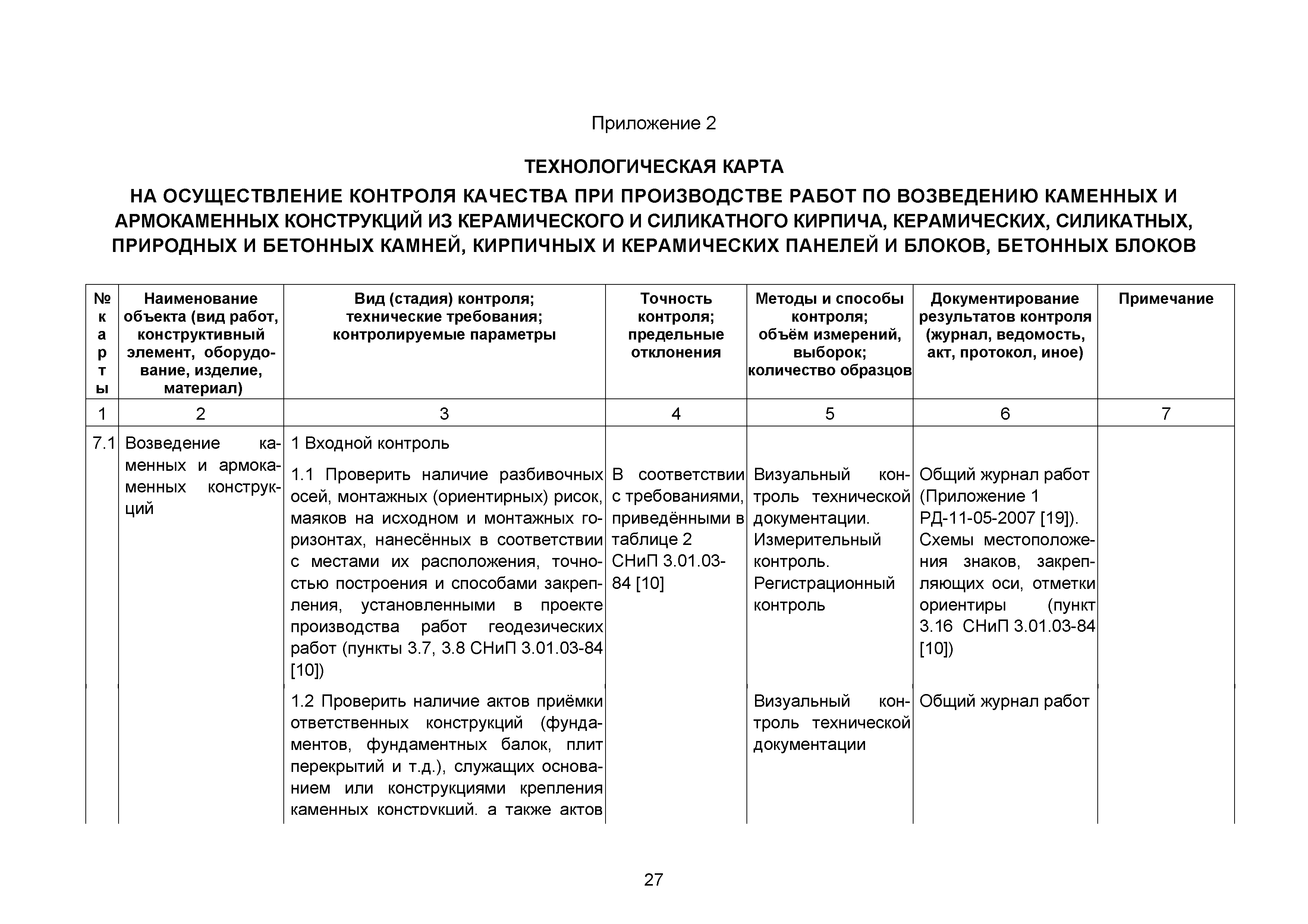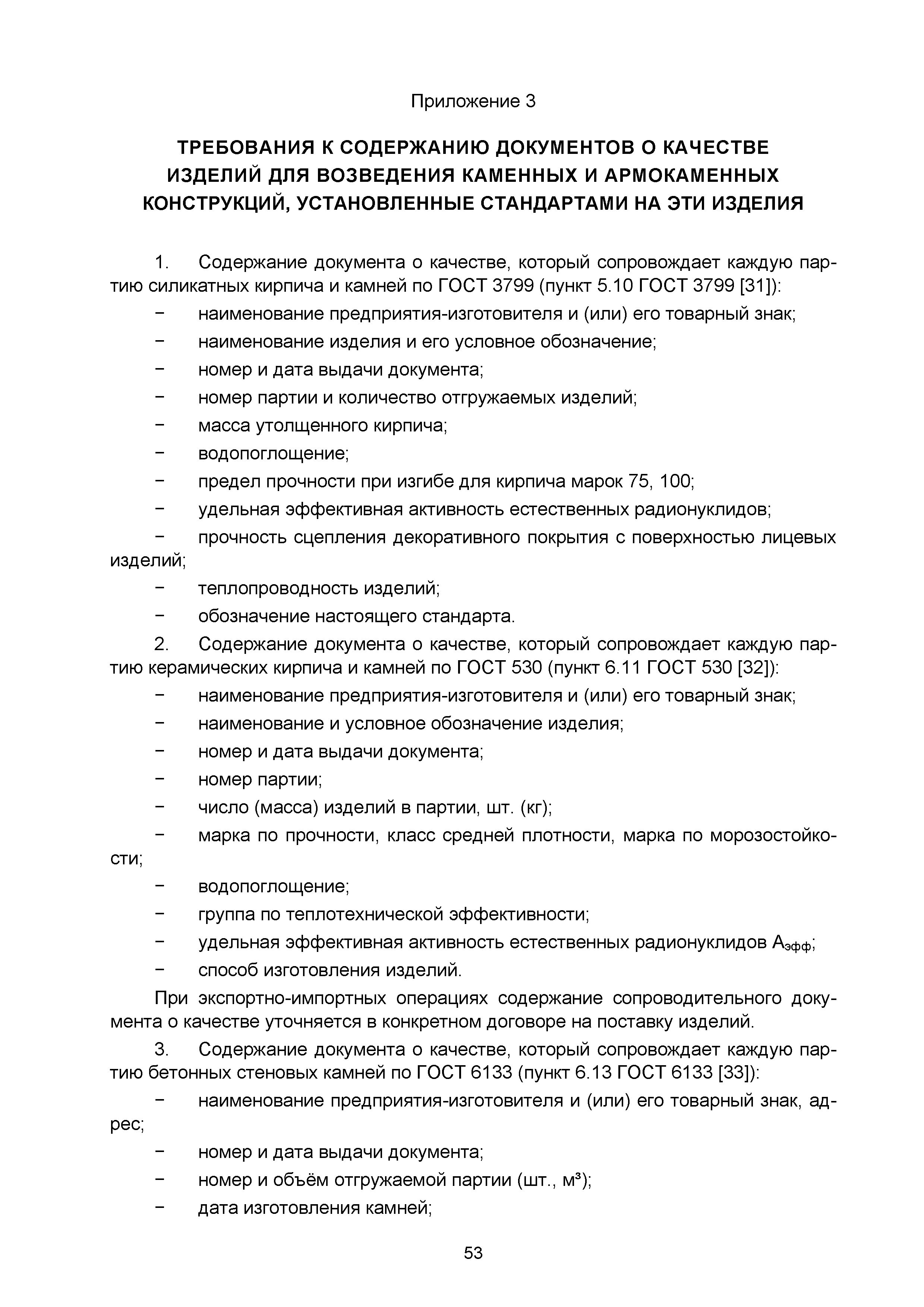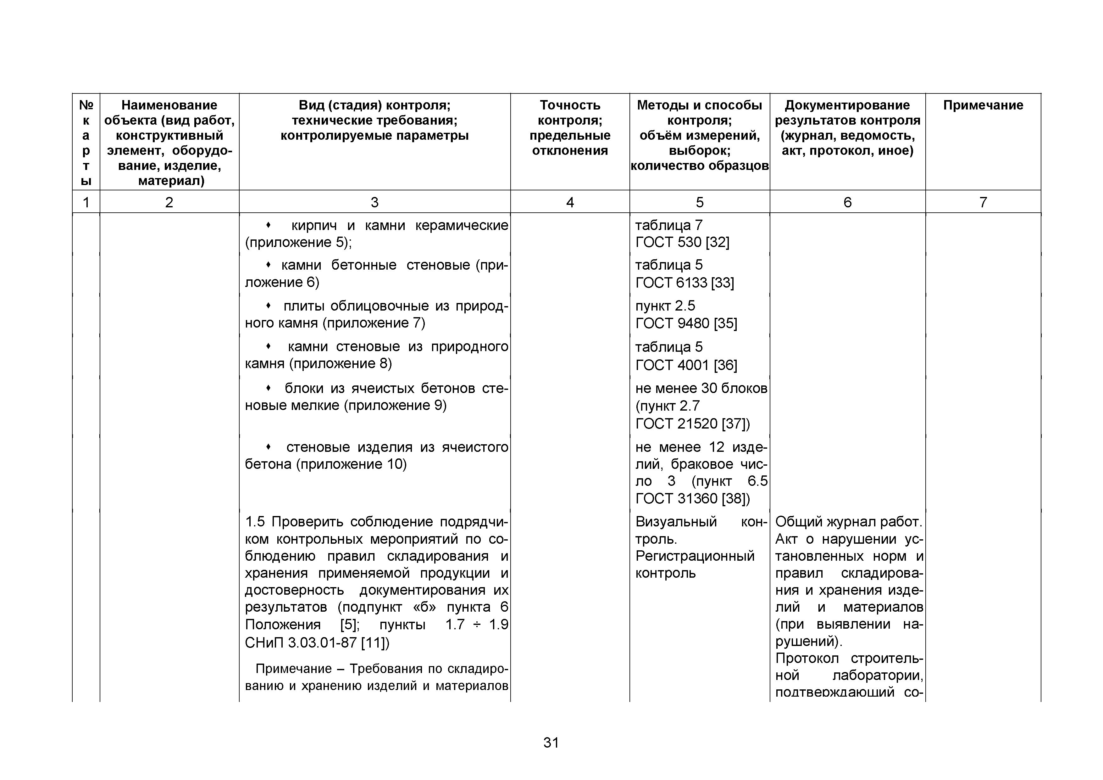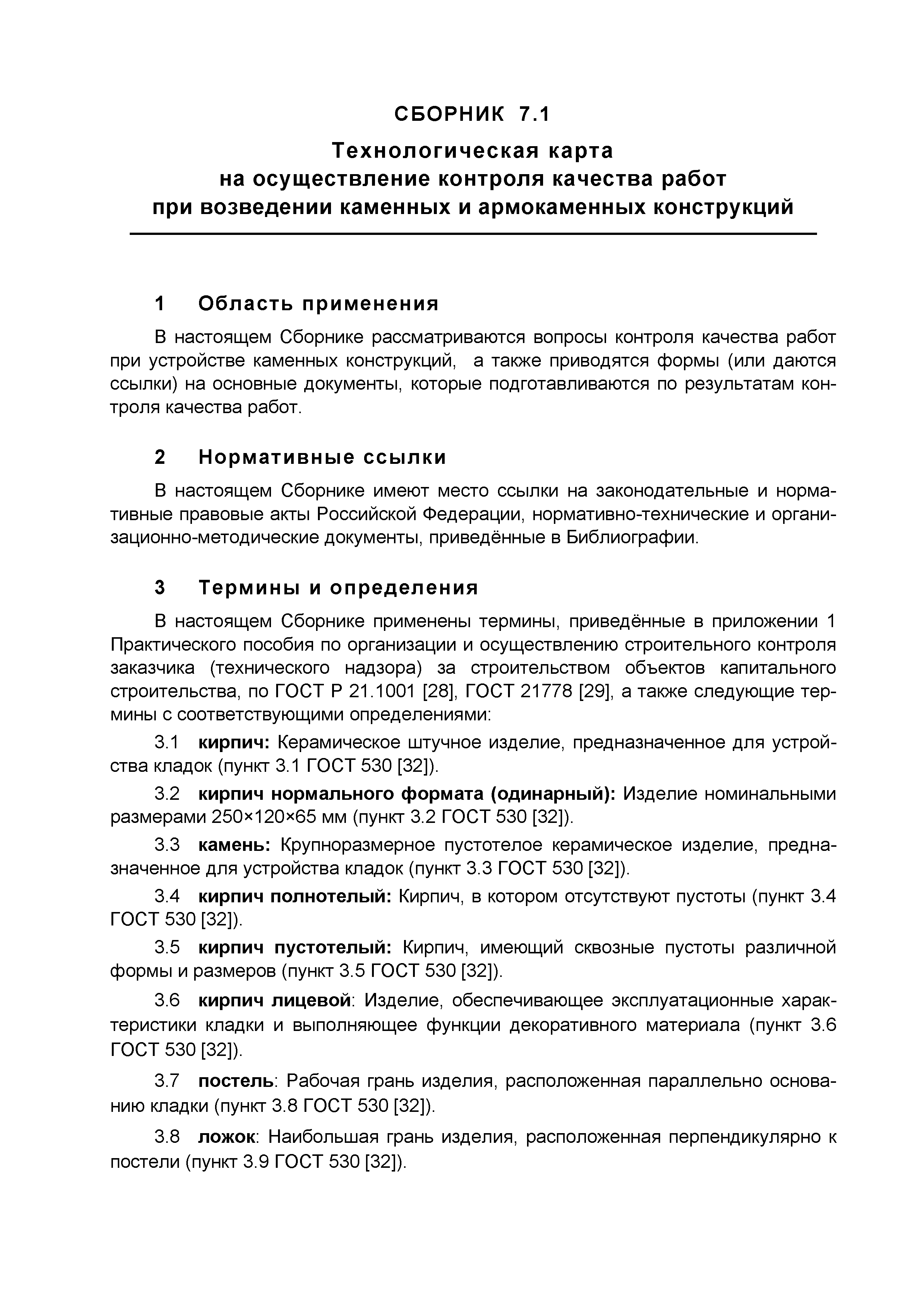 | Оглавление: | 1 Область применения 2 Нормативные ссылки 3 Термины и определения 4 Общие положения 5 Требования к складированию, хранению и качеству материалов для возведения каменных и армокаменных конструкций 6 Требования к качеству выполнения работ и отдельных технологических операций при возведении каменных и армокаменных конструкций 7 Дополнительные требования к производству работ в сейсмических районах 8 Дополнительные требования к возведению каменных и армокаменных конструкций в зимних условиях Приложение 1. Классификация дефектов по основным видам строительно-монтажных работ и производстве стеновых материалов Приложение 2. Технологическая карта на осуществление контроля качества при производстве работ по возведению каменных и армокаменных конструкций из керамического и силикатного кирпича, керамических, силикатных, природных и бетонных камней, кирпичных и керамических панелей и блоков, бетонных блоков Приложение 3. Требования к содержанию документов о качестве изделий для возведения каменных и армокаменных конструкций, установленные стандартами на эти изделия Приложение 4. Основные нормативные требования, предъявляемые к внешнему виду, размерам, цвету и другим характеристикам силикатных кирпича и камней Приложение 5. Основные нормативные требования, предъявляемые к внешнему виду, размерам, цвету и другим характеристикам керамических кирпича и камней Приложение 6. Основные нормативные требования, предъявляемые к внешнему виду, размерам, цвету и другим характеристикам камней бетонных стеновых Приложение 7. Основные нормативные требования, предъявляемые к внешнему виду, размерам, цвету и другим характеристикам плит облицовочных пиленых из природного камня Приложение 8. Основные нормативные требования, предъявляемые к внешнему виду, размерам, цвету и другим характеристикам камней стеновых из горных пород Приложение 9. Основные нормативные требования, предъявляемые к внешнему виду, размерам, цвету и другим характеристикам мелких стеновых блоков из ячеистых бетонов Приложение 10. Основные нормативные требования, предъявляемые к внешнему виду, размерам, цвету и другим характеристикам стеновых неармированных изделий из ячеистого бетона автоклавного твердения Библиография |