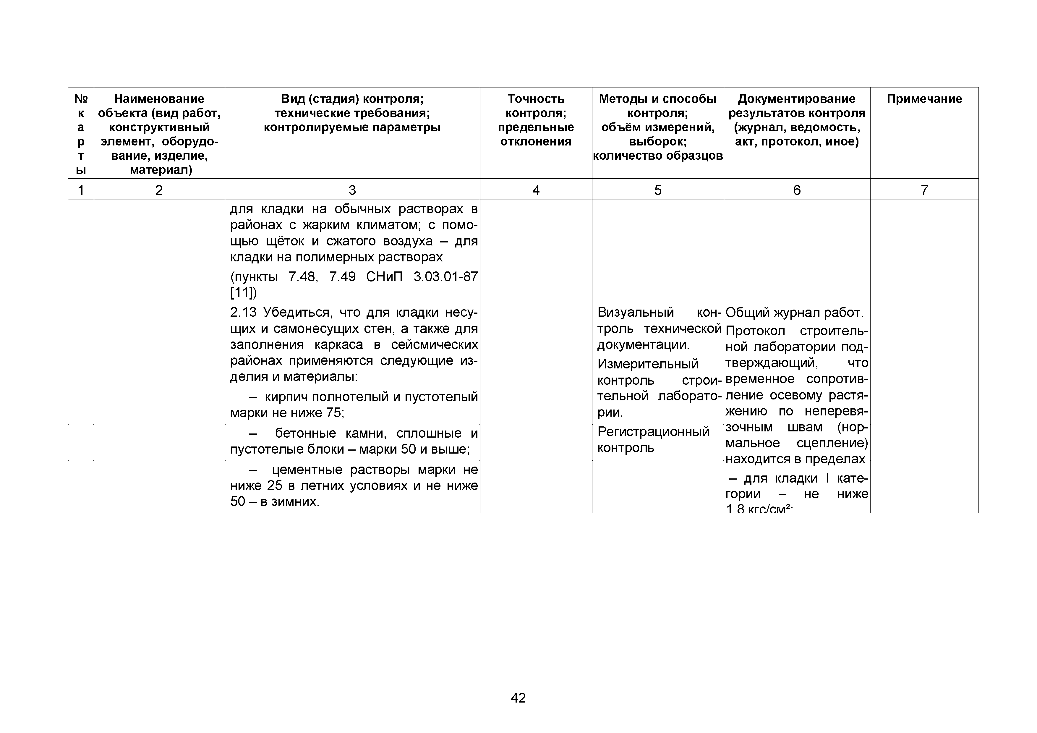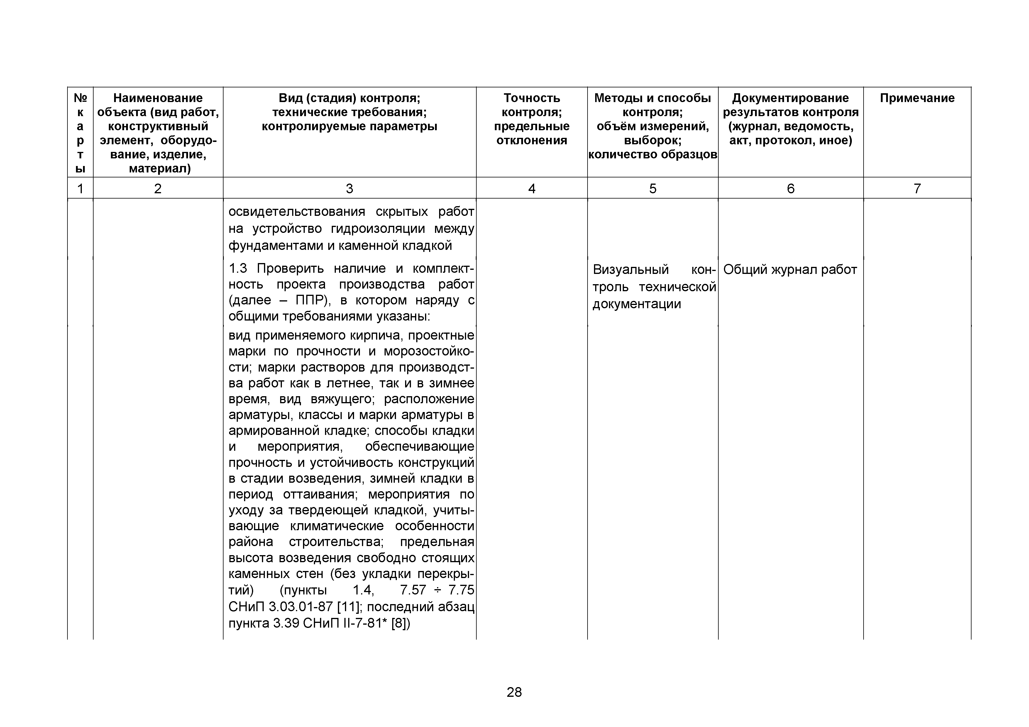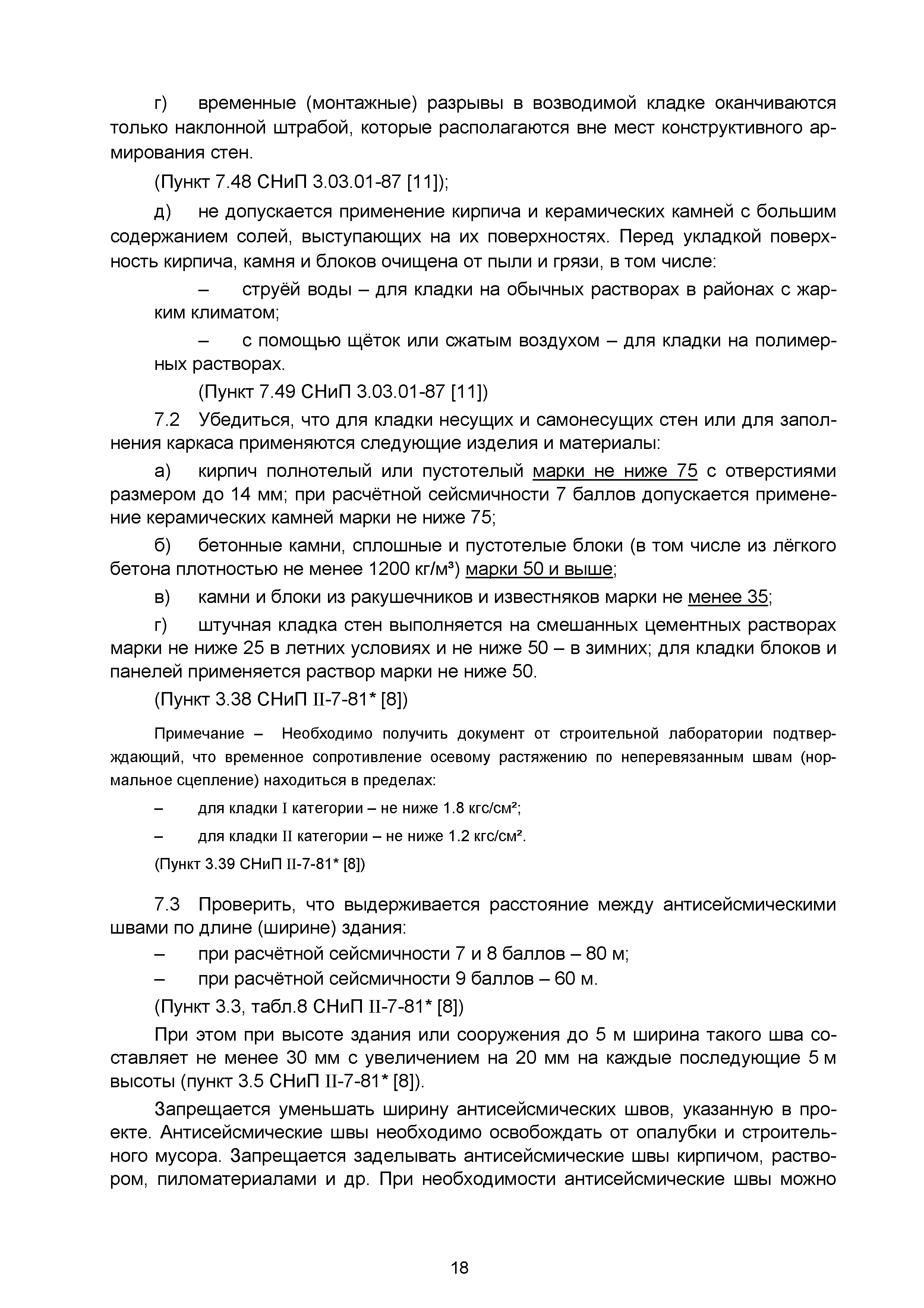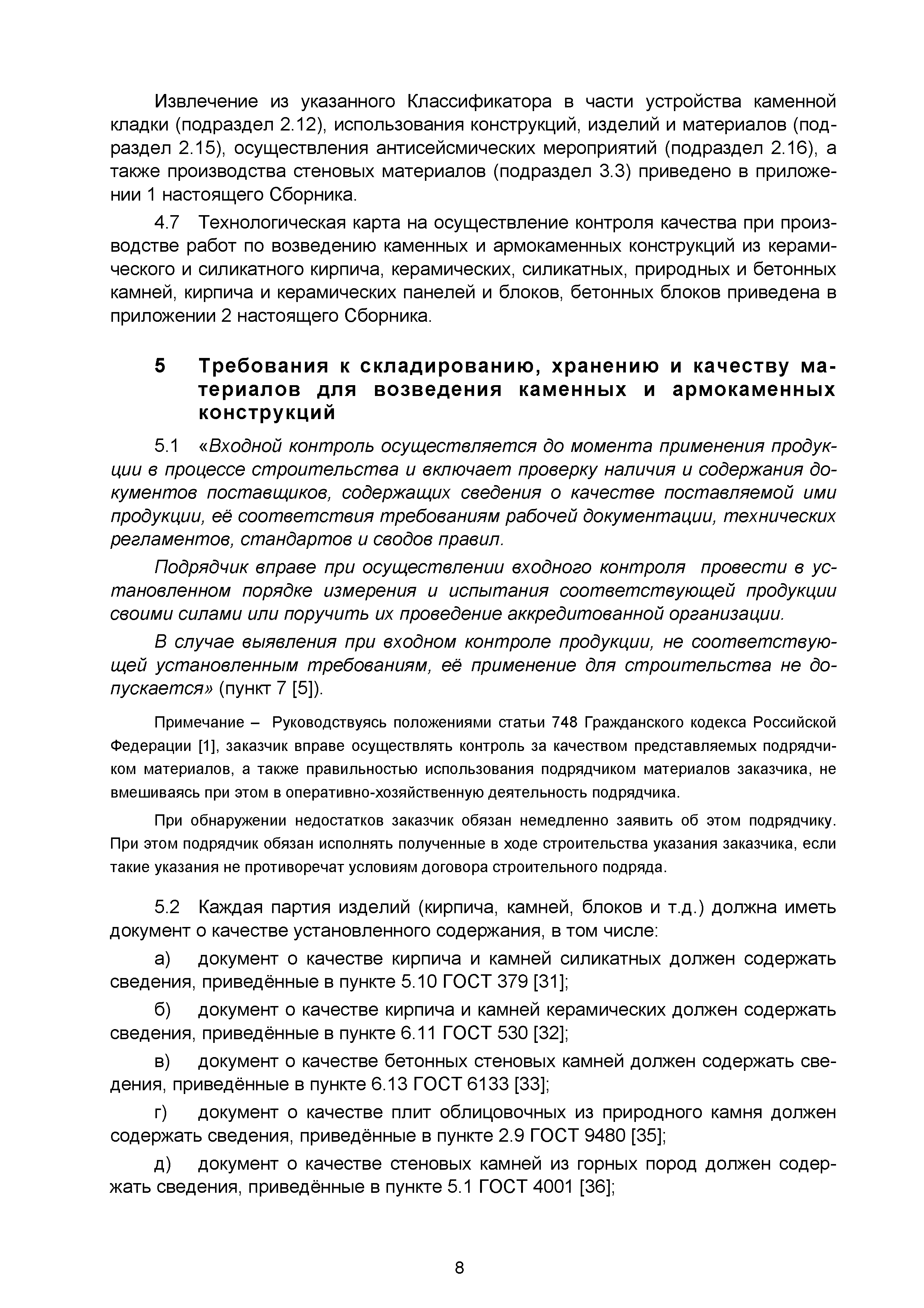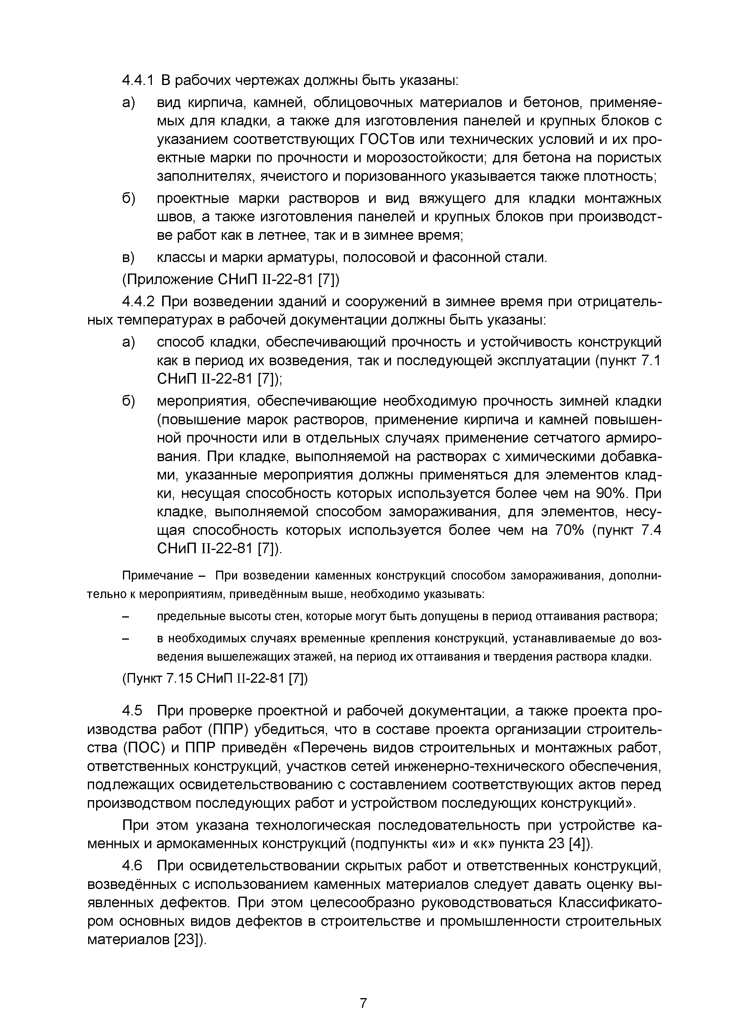 | Оглавление: | 1 Область применения 2 Нормативные ссылки 3 Термины и определения 4 Общие положения 5 Требования к складированию, хранению и качеству материалов для возведения каменных и армокаменных конструкций 6 Требования к качеству выполнения работ и отдельных технологических операций при возведении каменных и армокаменных конструкций 7 Дополнительные требования к производству работ в сейсмических районах 8 Дополнительные требования к возведению каменных и армокаменных конструкций в зимних условиях Приложение 1. Классификация дефектов по основным видам строительно-монтажных работ и производстве стеновых материалов Приложение 2. Технологическая карта на осуществление контроля качества при производстве работ по возведению каменных и армокаменных конструкций из керамического и силикатного кирпича, керамических, силикатных, природных и бетонных камней, кирпичных и керамических панелей и блоков, бетонных блоков Приложение 3. Требования к содержанию документов о качестве изделий для возведения каменных и армокаменных конструкций, установленные стандартами на эти изделия Приложение 4. Основные нормативные требования, предъявляемые к внешнему виду, размерам, цвету и другим характеристикам силикатных кирпича и камней Приложение 5. Основные нормативные требования, предъявляемые к внешнему виду, размерам, цвету и другим характеристикам керамических кирпича и камней Приложение 6. Основные нормативные требования, предъявляемые к внешнему виду, размерам, цвету и другим характеристикам камней бетонных стеновых Приложение 7. Основные нормативные требования, предъявляемые к внешнему виду, размерам, цвету и другим характеристикам плит облицовочных пиленых из природного камня Приложение 8. Основные нормативные требования, предъявляемые к внешнему виду, размерам, цвету и другим характеристикам камней стеновых из горных пород Приложение 9. Основные нормативные требования, предъявляемые к внешнему виду, размерам, цвету и другим характеристикам мелких стеновых блоков из ячеистых бетонов Приложение 10. Основные нормативные требования, предъявляемые к внешнему виду, размерам, цвету и другим характеристикам стеновых неармированных изделий из ячеистого бетона автоклавного твердения Библиография |