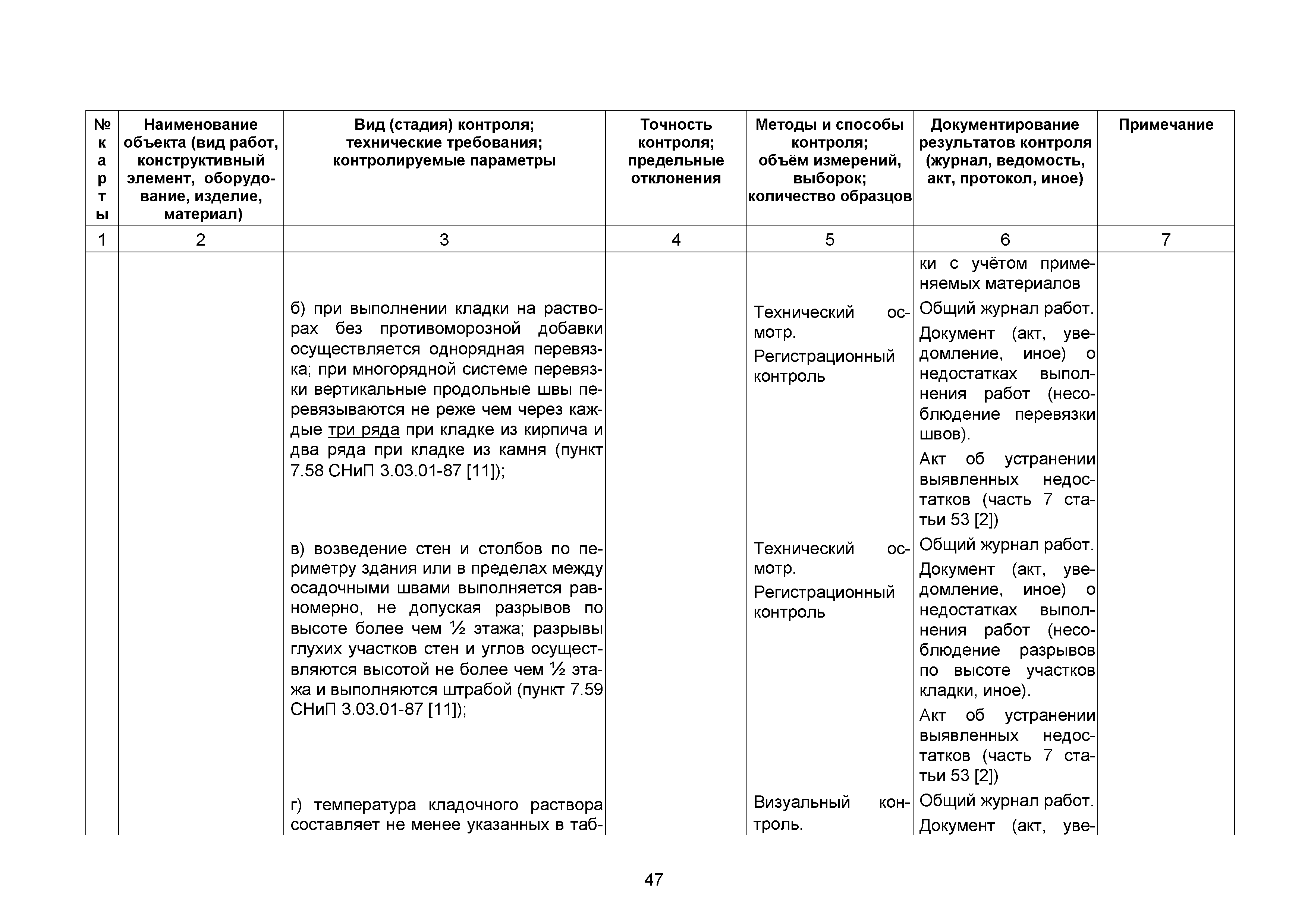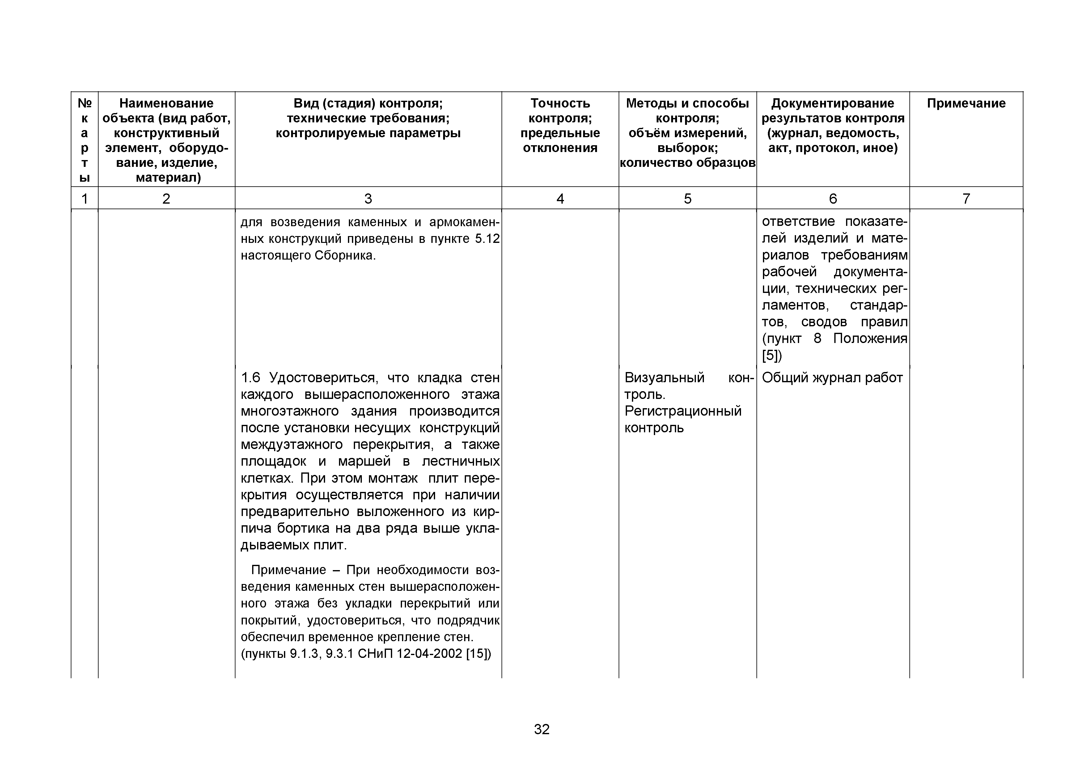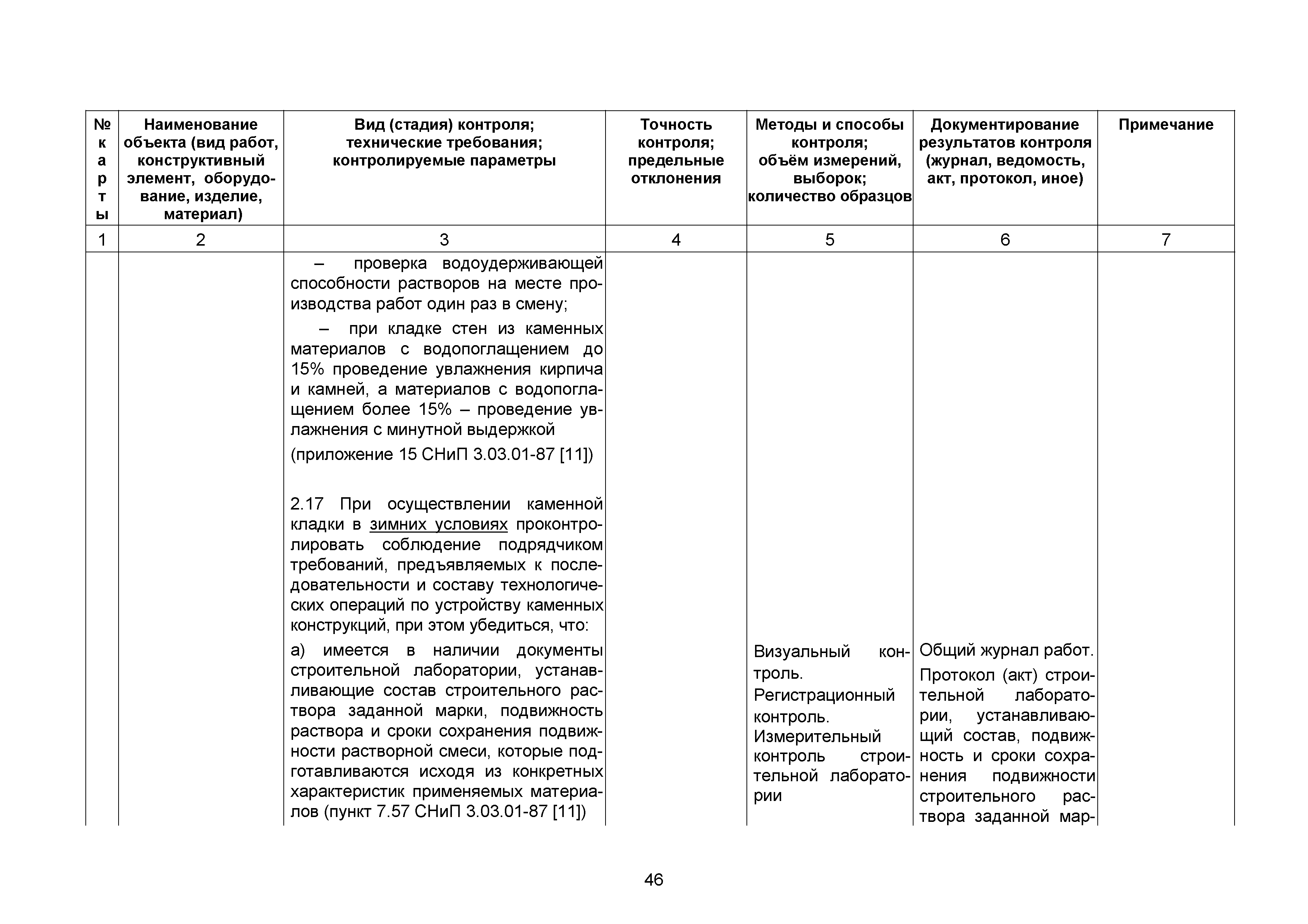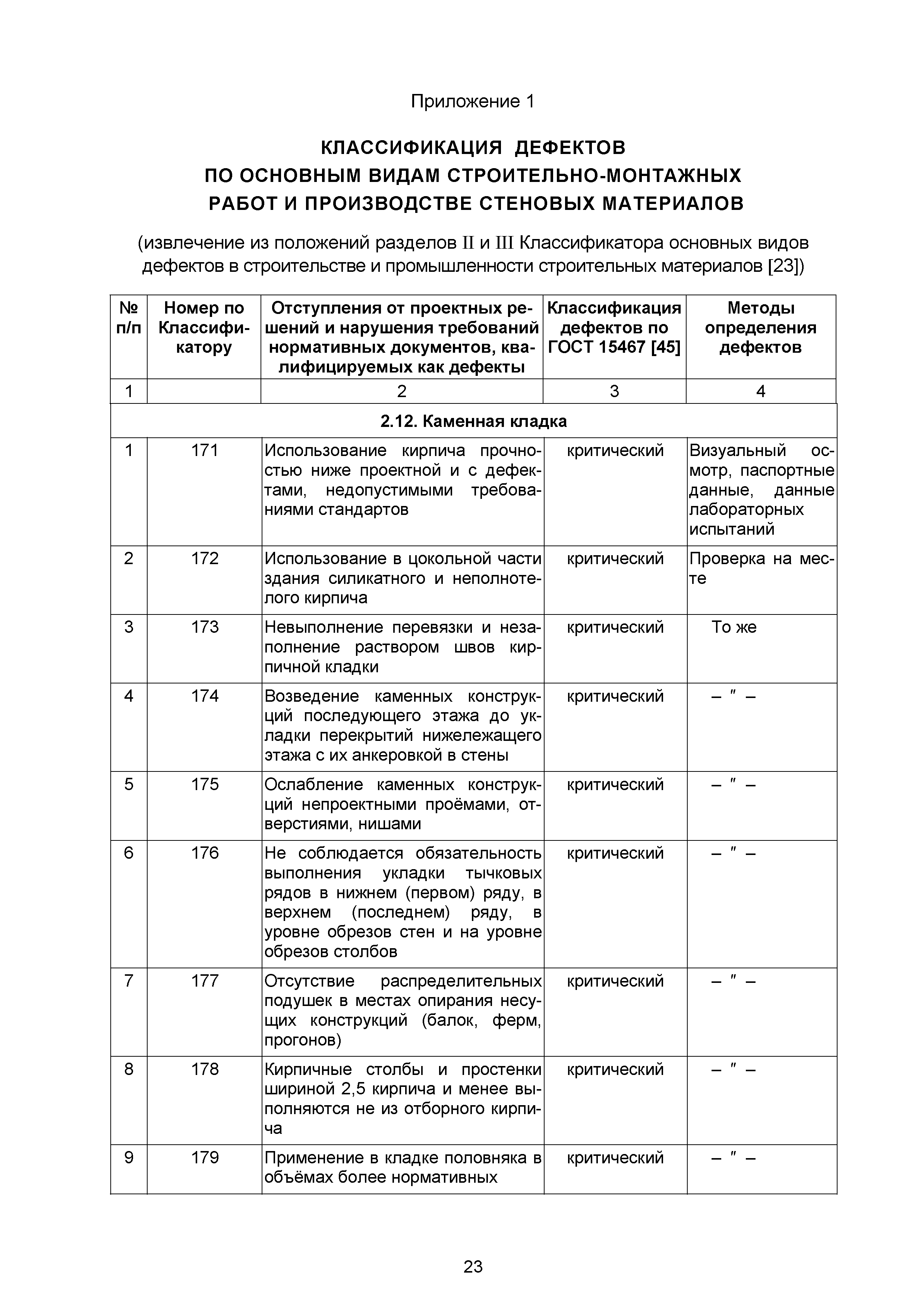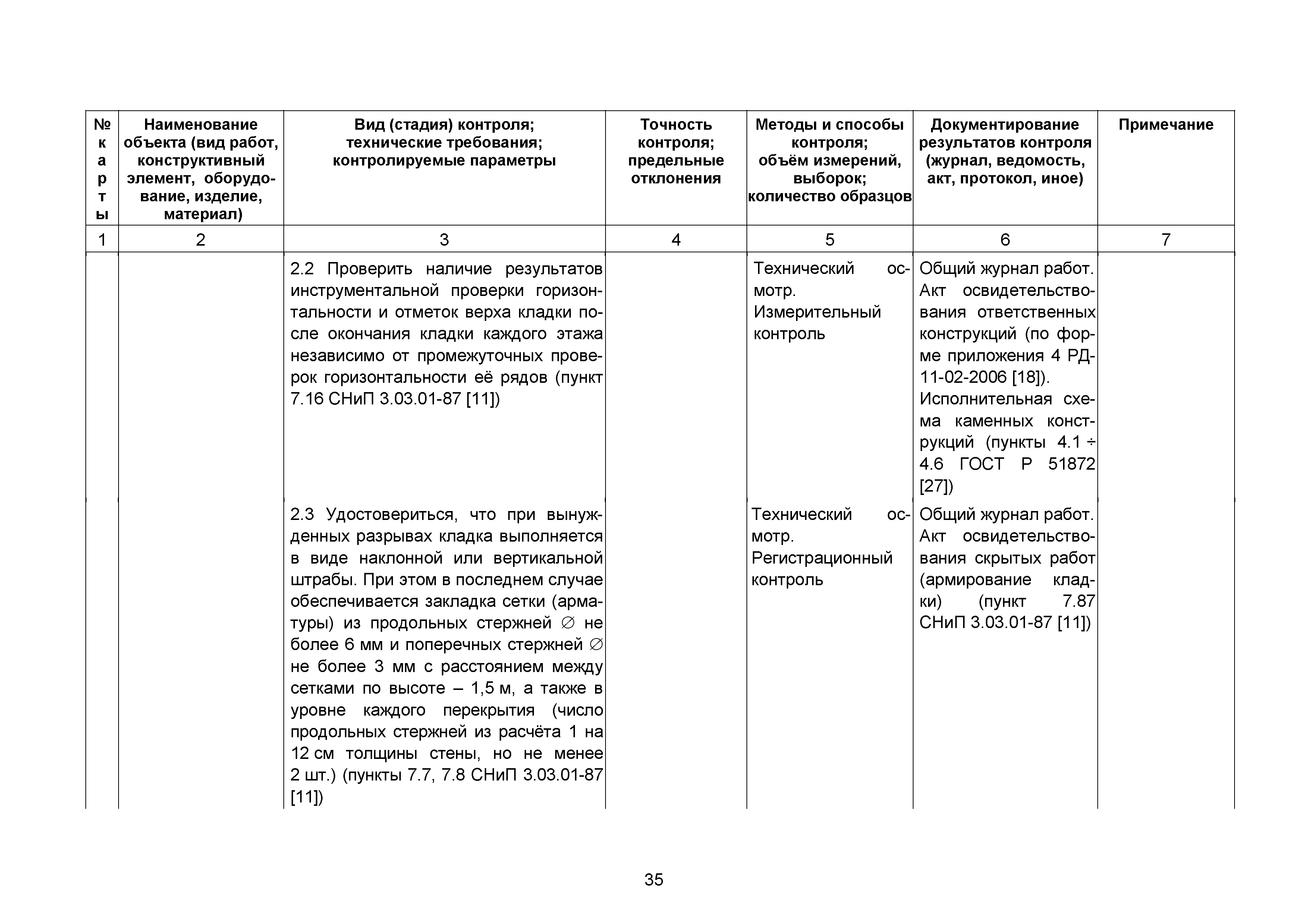 | Оглавление: | 1 Область применения 2 Нормативные ссылки 3 Термины и определения 4 Общие положения 5 Требования к складированию, хранению и качеству материалов для возведения каменных и армокаменных конструкций 6 Требования к качеству выполнения работ и отдельных технологических операций при возведении каменных и армокаменных конструкций 7 Дополнительные требования к производству работ в сейсмических районах 8 Дополнительные требования к возведению каменных и армокаменных конструкций в зимних условиях Приложение 1. Классификация дефектов по основным видам строительно-монтажных работ и производстве стеновых материалов Приложение 2. Технологическая карта на осуществление контроля качества при производстве работ по возведению каменных и армокаменных конструкций из керамического и силикатного кирпича, керамических, силикатных, природных и бетонных камней, кирпичных и керамических панелей и блоков, бетонных блоков Приложение 3. Требования к содержанию документов о качестве изделий для возведения каменных и армокаменных конструкций, установленные стандартами на эти изделия Приложение 4. Основные нормативные требования, предъявляемые к внешнему виду, размерам, цвету и другим характеристикам силикатных кирпича и камней Приложение 5. Основные нормативные требования, предъявляемые к внешнему виду, размерам, цвету и другим характеристикам керамических кирпича и камней Приложение 6. Основные нормативные требования, предъявляемые к внешнему виду, размерам, цвету и другим характеристикам камней бетонных стеновых Приложение 7. Основные нормативные требования, предъявляемые к внешнему виду, размерам, цвету и другим характеристикам плит облицовочных пиленых из природного камня Приложение 8. Основные нормативные требования, предъявляемые к внешнему виду, размерам, цвету и другим характеристикам камней стеновых из горных пород Приложение 9. Основные нормативные требования, предъявляемые к внешнему виду, размерам, цвету и другим характеристикам мелких стеновых блоков из ячеистых бетонов Приложение 10. Основные нормативные требования, предъявляемые к внешнему виду, размерам, цвету и другим характеристикам стеновых неармированных изделий из ячеистого бетона автоклавного твердения Библиография |