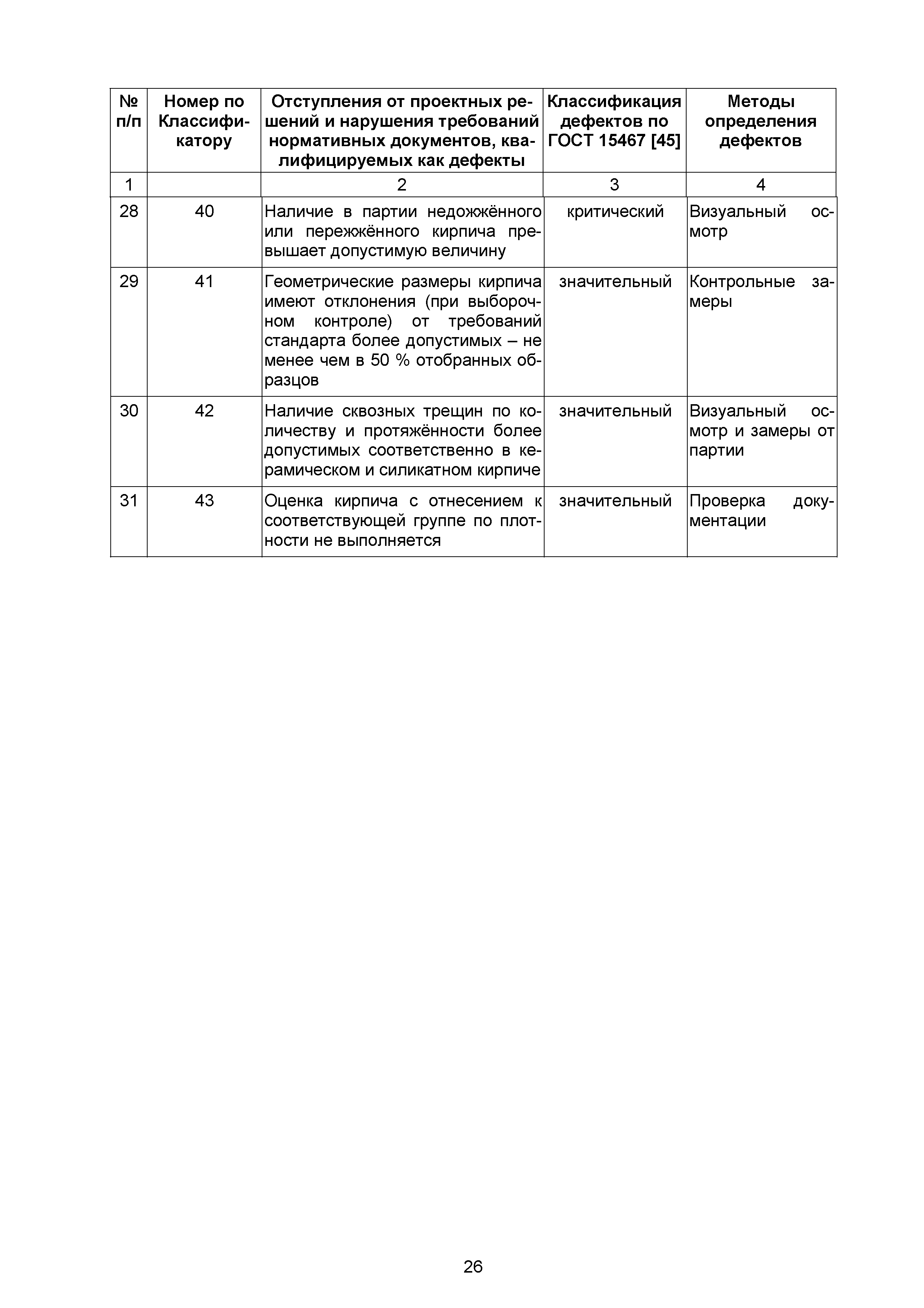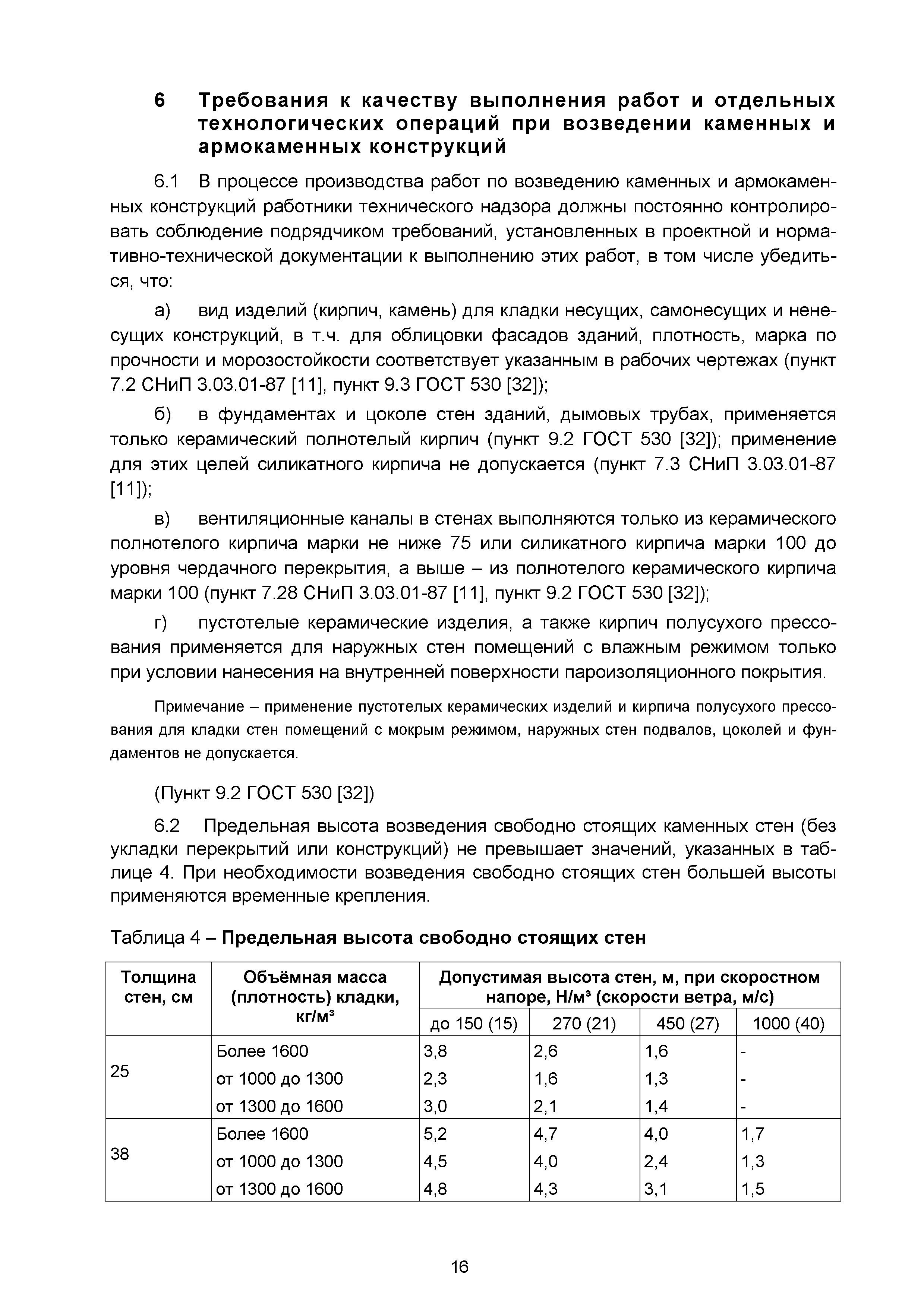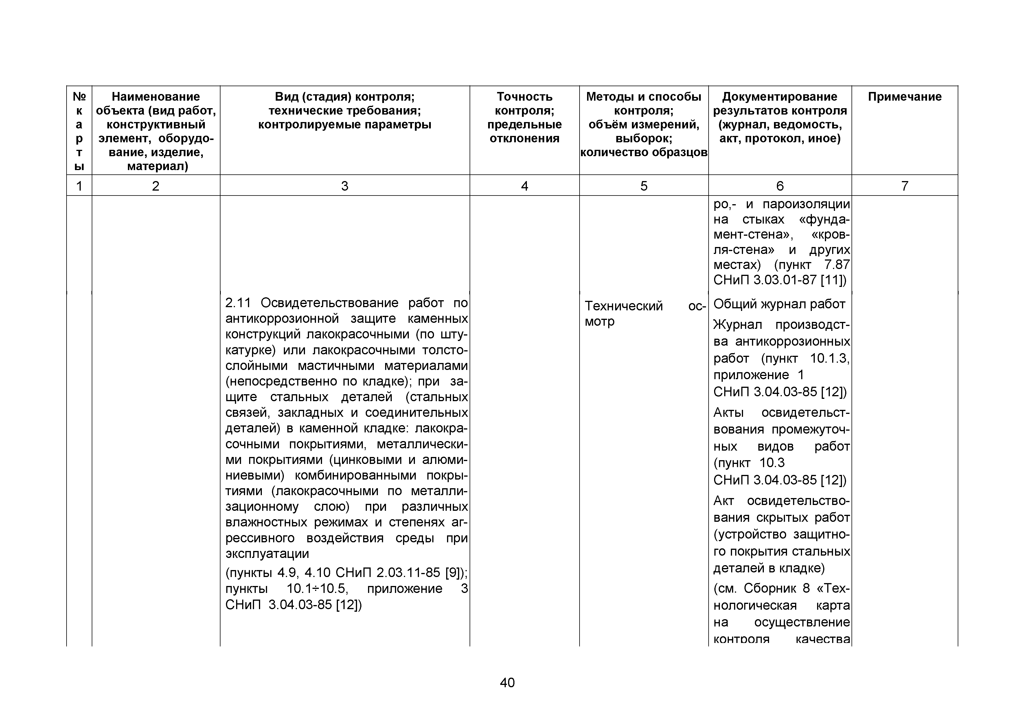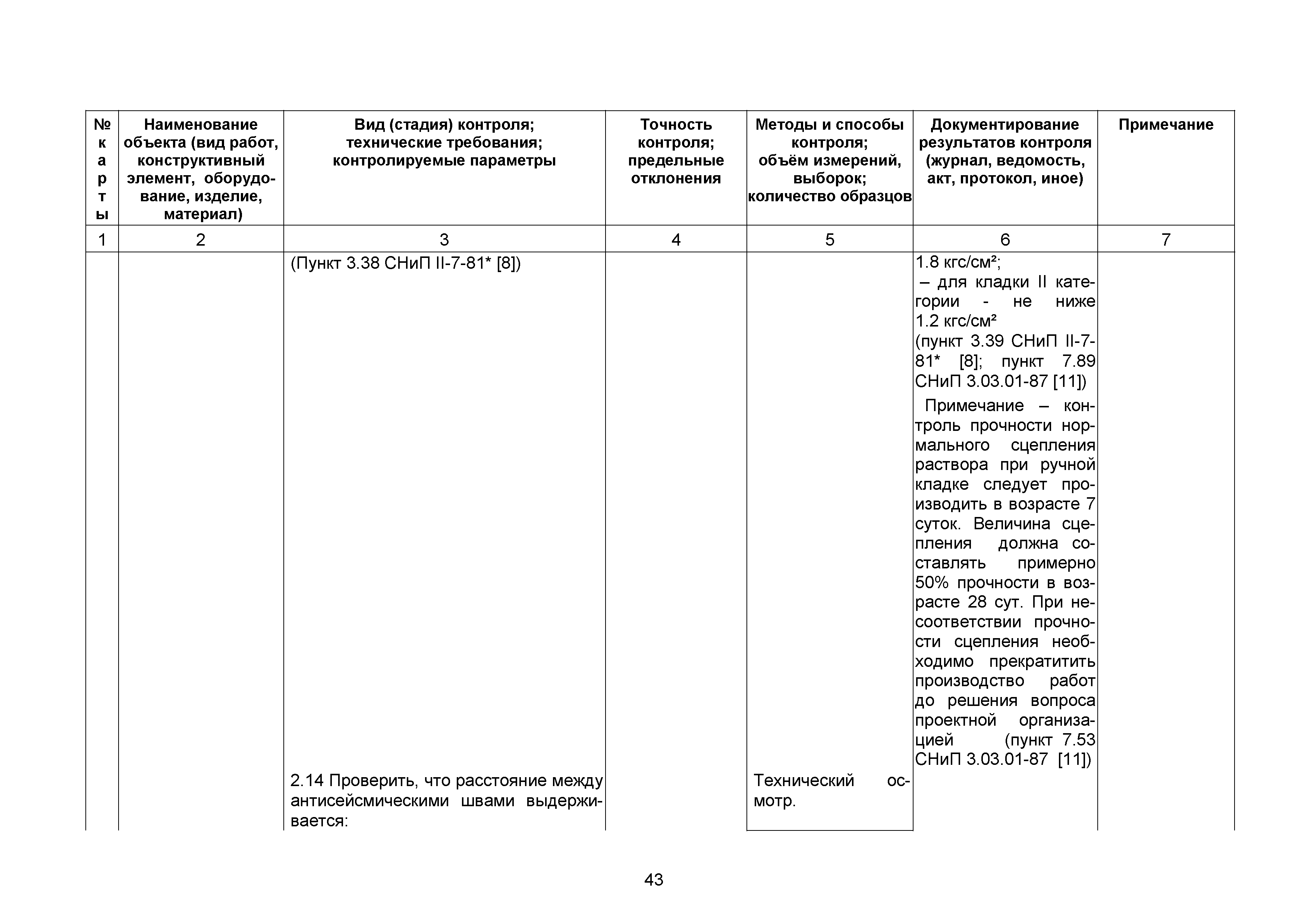 | Оглавление: | 1 Область применения 2 Нормативные ссылки 3 Термины и определения 4 Общие положения 5 Требования к складированию, хранению и качеству материалов для возведения каменных и армокаменных конструкций 6 Требования к качеству выполнения работ и отдельных технологических операций при возведении каменных и армокаменных конструкций 7 Дополнительные требования к производству работ в сейсмических районах 8 Дополнительные требования к возведению каменных и армокаменных конструкций в зимних условиях Приложение 1. Классификация дефектов по основным видам строительно-монтажных работ и производстве стеновых материалов Приложение 2. Технологическая карта на осуществление контроля качества при производстве работ по возведению каменных и армокаменных конструкций из керамического и силикатного кирпича, керамических, силикатных, природных и бетонных камней, кирпичных и керамических панелей и блоков, бетонных блоков Приложение 3. Требования к содержанию документов о качестве изделий для возведения каменных и армокаменных конструкций, установленные стандартами на эти изделия Приложение 4. Основные нормативные требования, предъявляемые к внешнему виду, размерам, цвету и другим характеристикам силикатных кирпича и камней Приложение 5. Основные нормативные требования, предъявляемые к внешнему виду, размерам, цвету и другим характеристикам керамических кирпича и камней Приложение 6. Основные нормативные требования, предъявляемые к внешнему виду, размерам, цвету и другим характеристикам камней бетонных стеновых Приложение 7. Основные нормативные требования, предъявляемые к внешнему виду, размерам, цвету и другим характеристикам плит облицовочных пиленых из природного камня Приложение 8. Основные нормативные требования, предъявляемые к внешнему виду, размерам, цвету и другим характеристикам камней стеновых из горных пород Приложение 9. Основные нормативные требования, предъявляемые к внешнему виду, размерам, цвету и другим характеристикам мелких стеновых блоков из ячеистых бетонов Приложение 10. Основные нормативные требования, предъявляемые к внешнему виду, размерам, цвету и другим характеристикам стеновых неармированных изделий из ячеистого бетона автоклавного твердения Библиография |