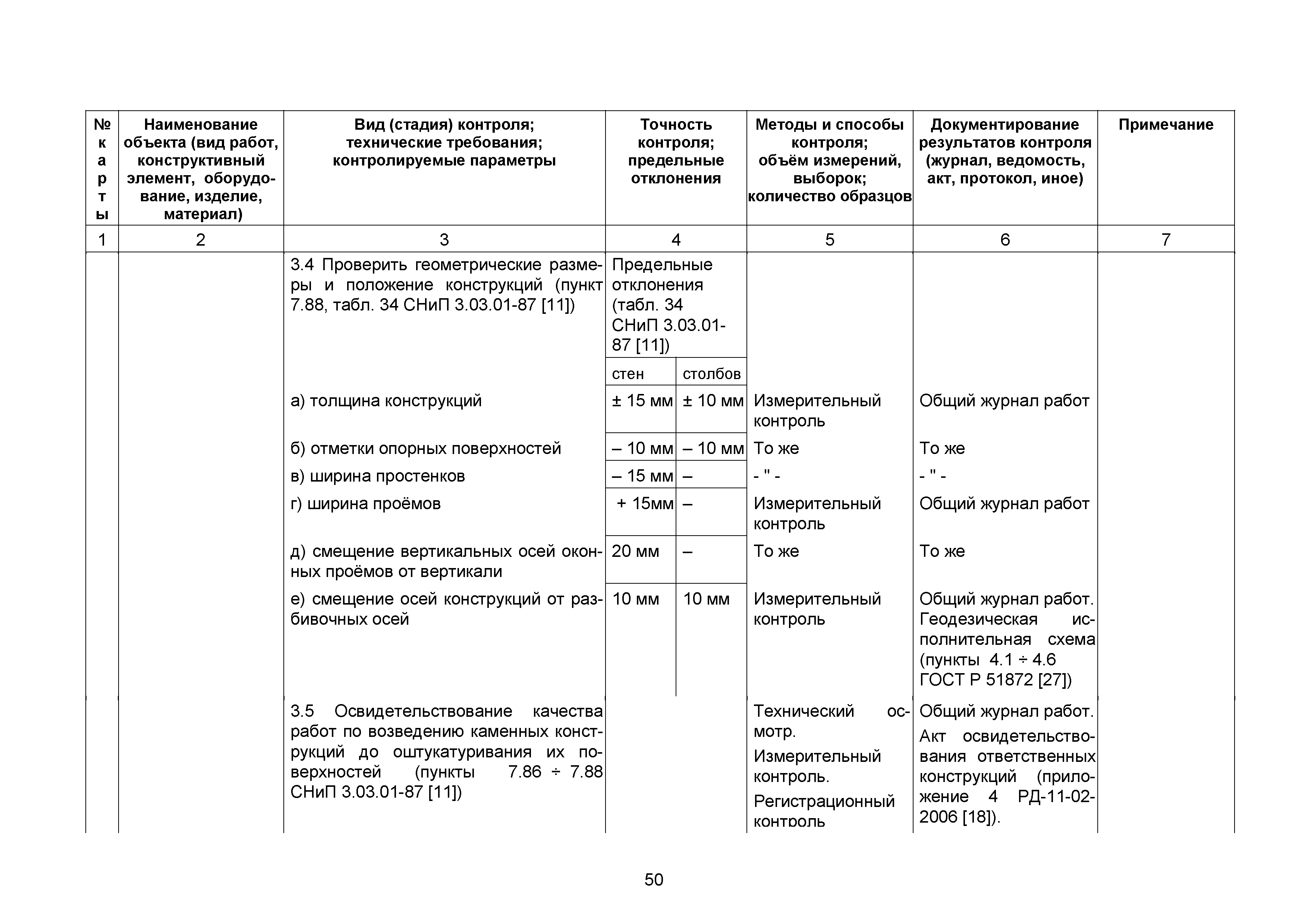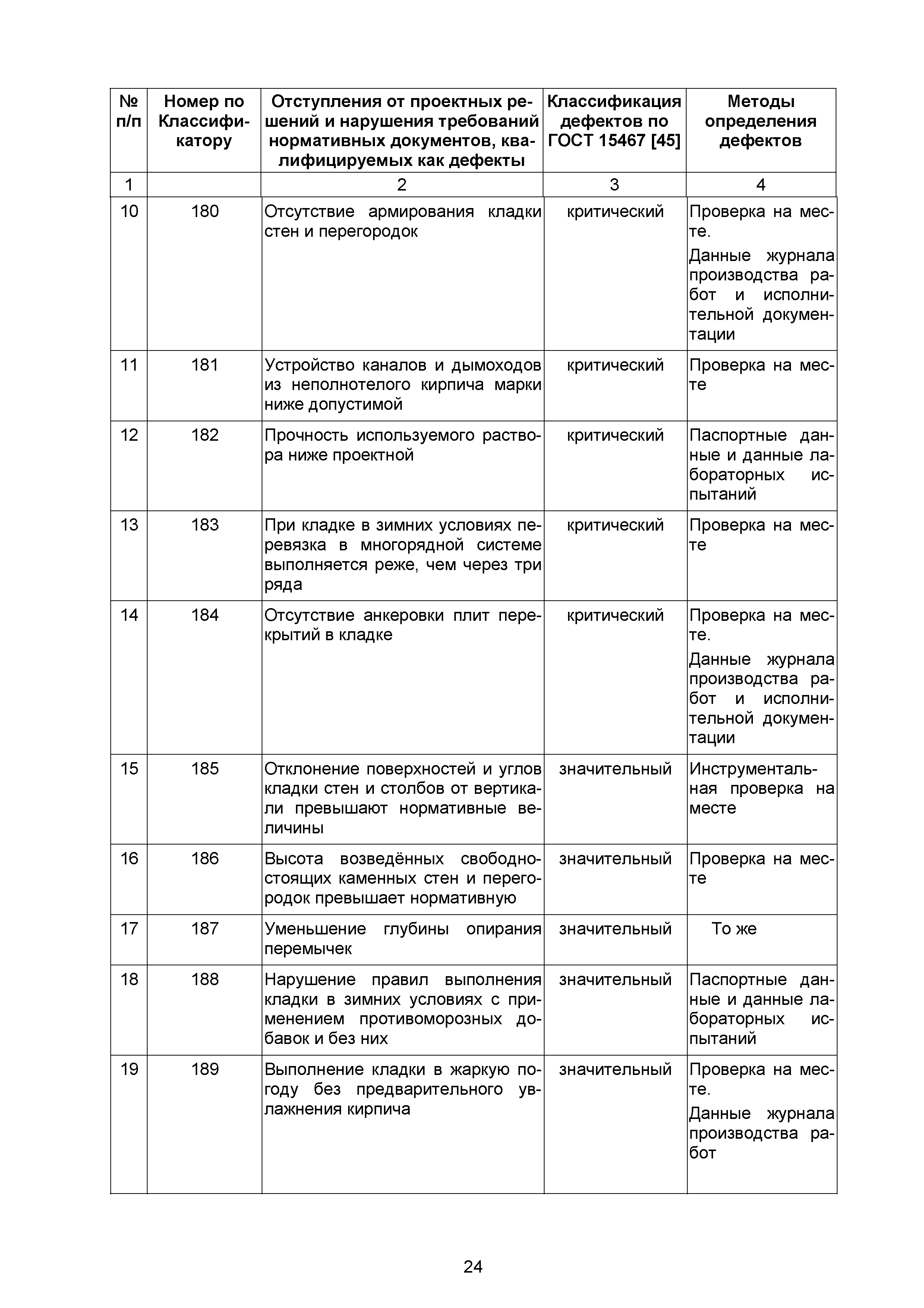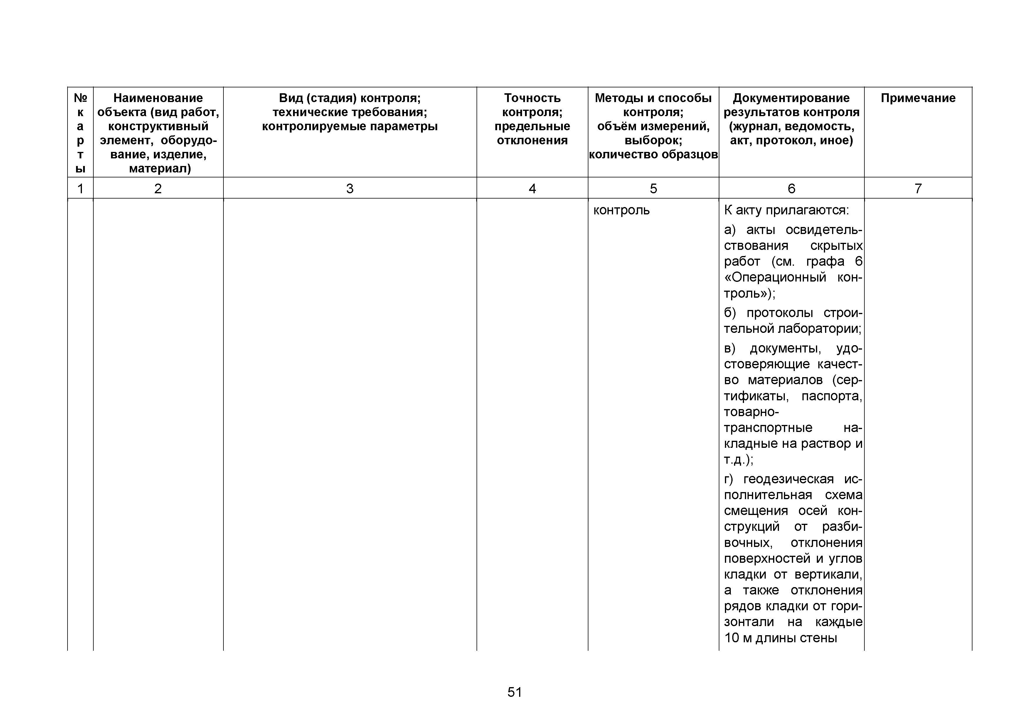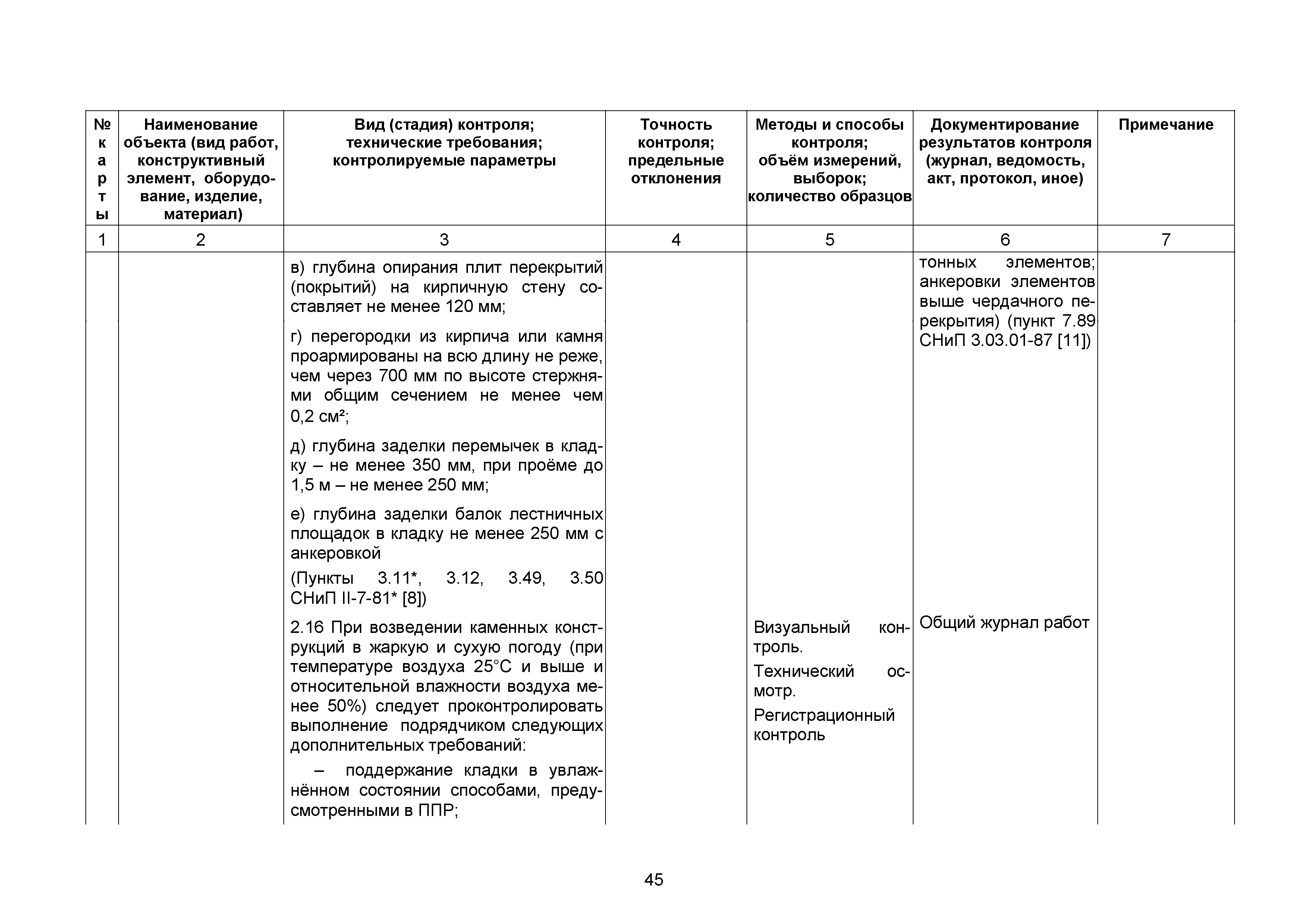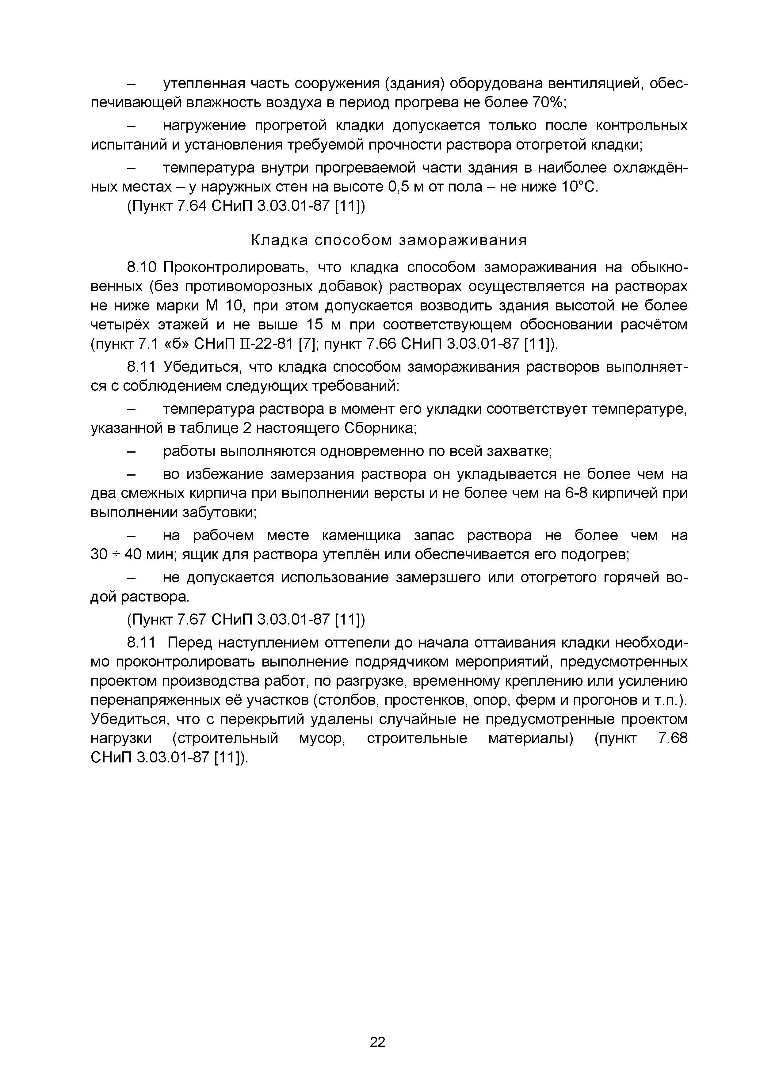 | Оглавление: | 1 Область применения 2 Нормативные ссылки 3 Термины и определения 4 Общие положения 5 Требования к складированию, хранению и качеству материалов для возведения каменных и армокаменных конструкций 6 Требования к качеству выполнения работ и отдельных технологических операций при возведении каменных и армокаменных конструкций 7 Дополнительные требования к производству работ в сейсмических районах 8 Дополнительные требования к возведению каменных и армокаменных конструкций в зимних условиях Приложение 1. Классификация дефектов по основным видам строительно-монтажных работ и производстве стеновых материалов Приложение 2. Технологическая карта на осуществление контроля качества при производстве работ по возведению каменных и армокаменных конструкций из керамического и силикатного кирпича, керамических, силикатных, природных и бетонных камней, кирпичных и керамических панелей и блоков, бетонных блоков Приложение 3. Требования к содержанию документов о качестве изделий для возведения каменных и армокаменных конструкций, установленные стандартами на эти изделия Приложение 4. Основные нормативные требования, предъявляемые к внешнему виду, размерам, цвету и другим характеристикам силикатных кирпича и камней Приложение 5. Основные нормативные требования, предъявляемые к внешнему виду, размерам, цвету и другим характеристикам керамических кирпича и камней Приложение 6. Основные нормативные требования, предъявляемые к внешнему виду, размерам, цвету и другим характеристикам камней бетонных стеновых Приложение 7. Основные нормативные требования, предъявляемые к внешнему виду, размерам, цвету и другим характеристикам плит облицовочных пиленых из природного камня Приложение 8. Основные нормативные требования, предъявляемые к внешнему виду, размерам, цвету и другим характеристикам камней стеновых из горных пород Приложение 9. Основные нормативные требования, предъявляемые к внешнему виду, размерам, цвету и другим характеристикам мелких стеновых блоков из ячеистых бетонов Приложение 10. Основные нормативные требования, предъявляемые к внешнему виду, размерам, цвету и другим характеристикам стеновых неармированных изделий из ячеистого бетона автоклавного твердения Библиография |