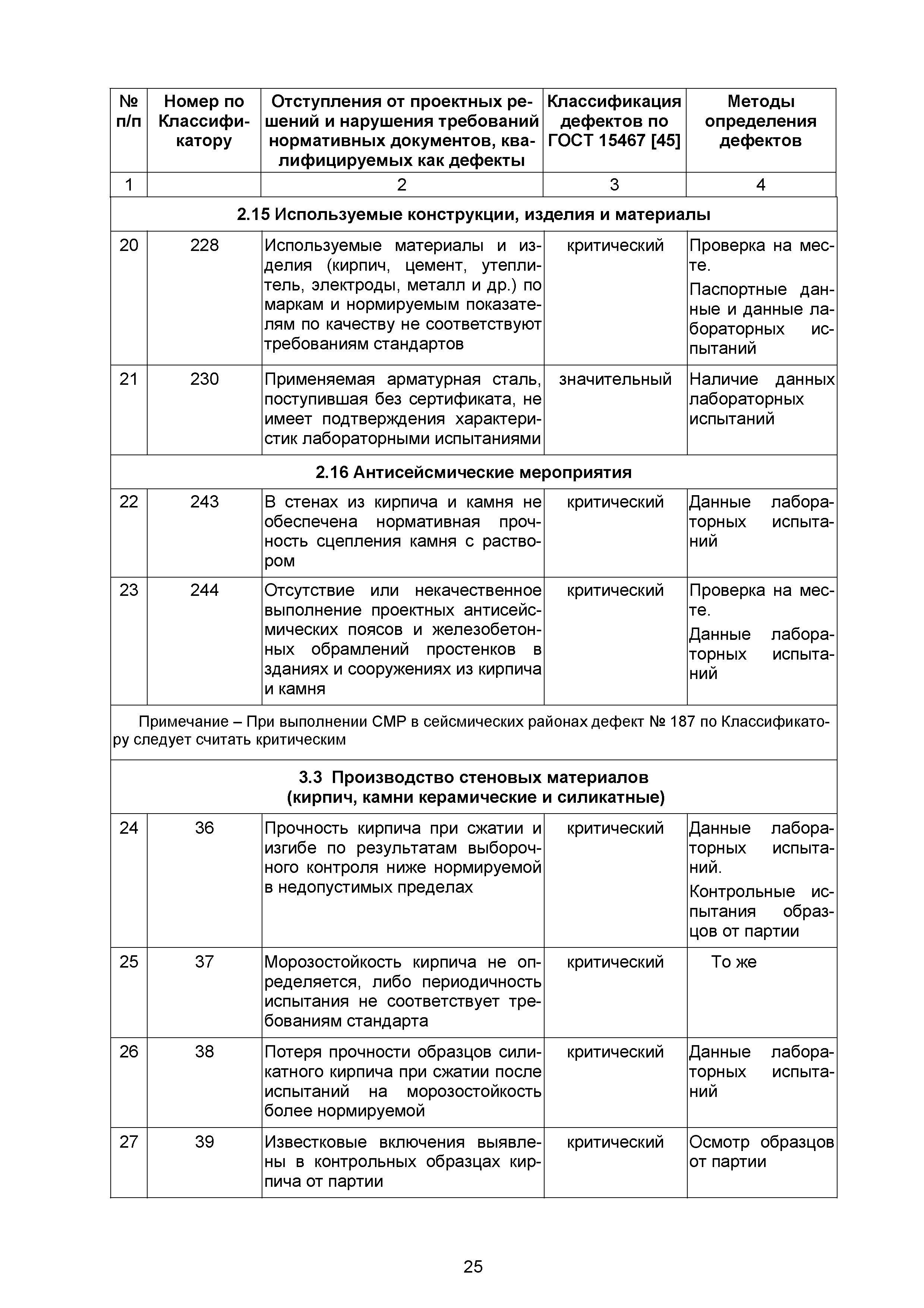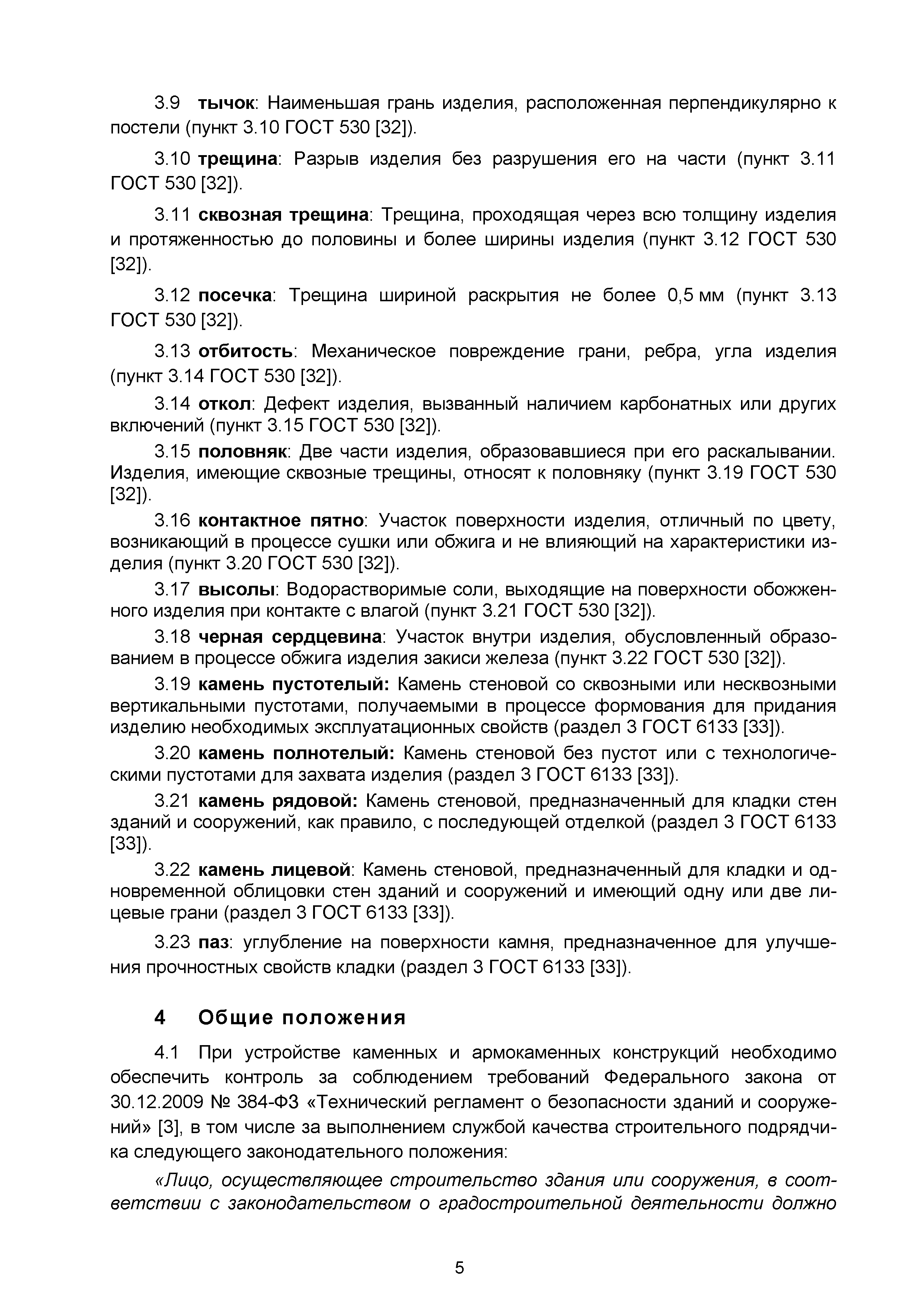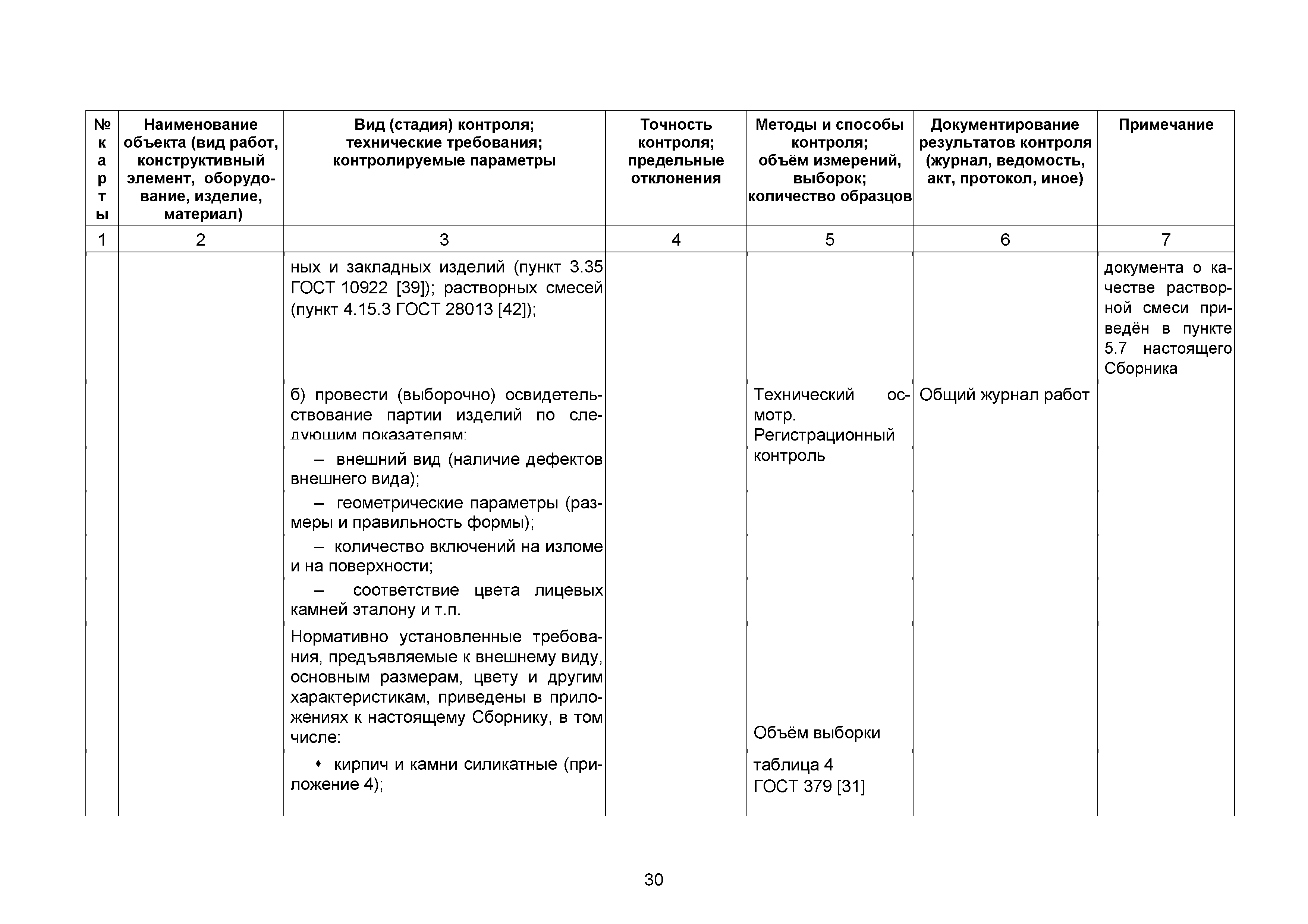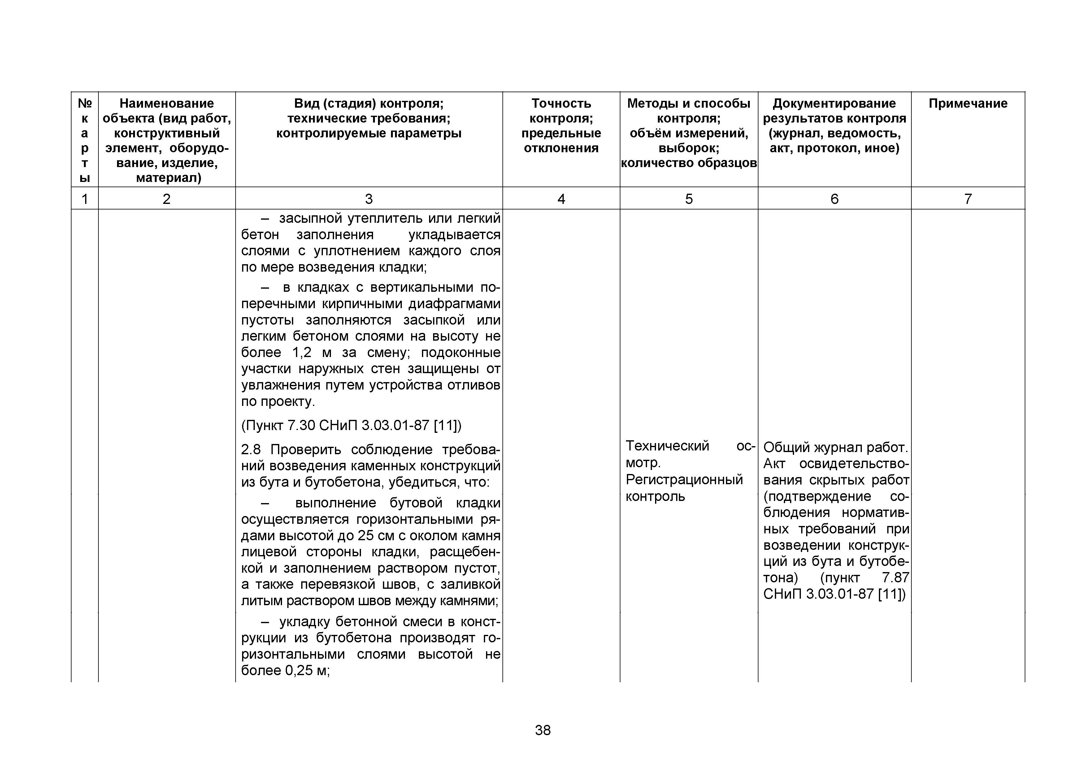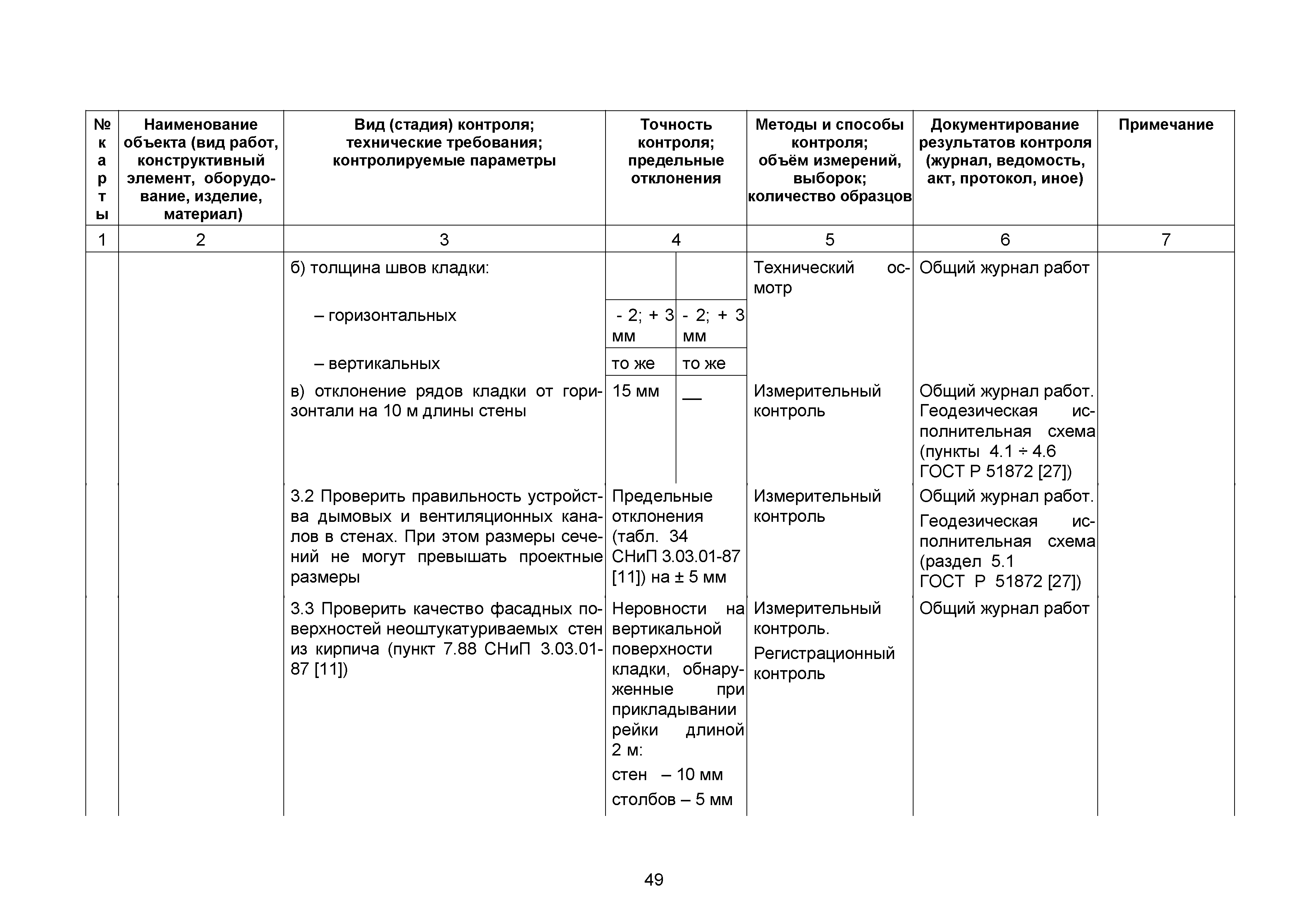 | Оглавление: | 1 Область применения 2 Нормативные ссылки 3 Термины и определения 4 Общие положения 5 Требования к складированию, хранению и качеству материалов для возведения каменных и армокаменных конструкций 6 Требования к качеству выполнения работ и отдельных технологических операций при возведении каменных и армокаменных конструкций 7 Дополнительные требования к производству работ в сейсмических районах 8 Дополнительные требования к возведению каменных и армокаменных конструкций в зимних условиях Приложение 1. Классификация дефектов по основным видам строительно-монтажных работ и производстве стеновых материалов Приложение 2. Технологическая карта на осуществление контроля качества при производстве работ по возведению каменных и армокаменных конструкций из керамического и силикатного кирпича, керамических, силикатных, природных и бетонных камней, кирпичных и керамических панелей и блоков, бетонных блоков Приложение 3. Требования к содержанию документов о качестве изделий для возведения каменных и армокаменных конструкций, установленные стандартами на эти изделия Приложение 4. Основные нормативные требования, предъявляемые к внешнему виду, размерам, цвету и другим характеристикам силикатных кирпича и камней Приложение 5. Основные нормативные требования, предъявляемые к внешнему виду, размерам, цвету и другим характеристикам керамических кирпича и камней Приложение 6. Основные нормативные требования, предъявляемые к внешнему виду, размерам, цвету и другим характеристикам камней бетонных стеновых Приложение 7. Основные нормативные требования, предъявляемые к внешнему виду, размерам, цвету и другим характеристикам плит облицовочных пиленых из природного камня Приложение 8. Основные нормативные требования, предъявляемые к внешнему виду, размерам, цвету и другим характеристикам камней стеновых из горных пород Приложение 9. Основные нормативные требования, предъявляемые к внешнему виду, размерам, цвету и другим характеристикам мелких стеновых блоков из ячеистых бетонов Приложение 10. Основные нормативные требования, предъявляемые к внешнему виду, размерам, цвету и другим характеристикам стеновых неармированных изделий из ячеистого бетона автоклавного твердения Библиография |
