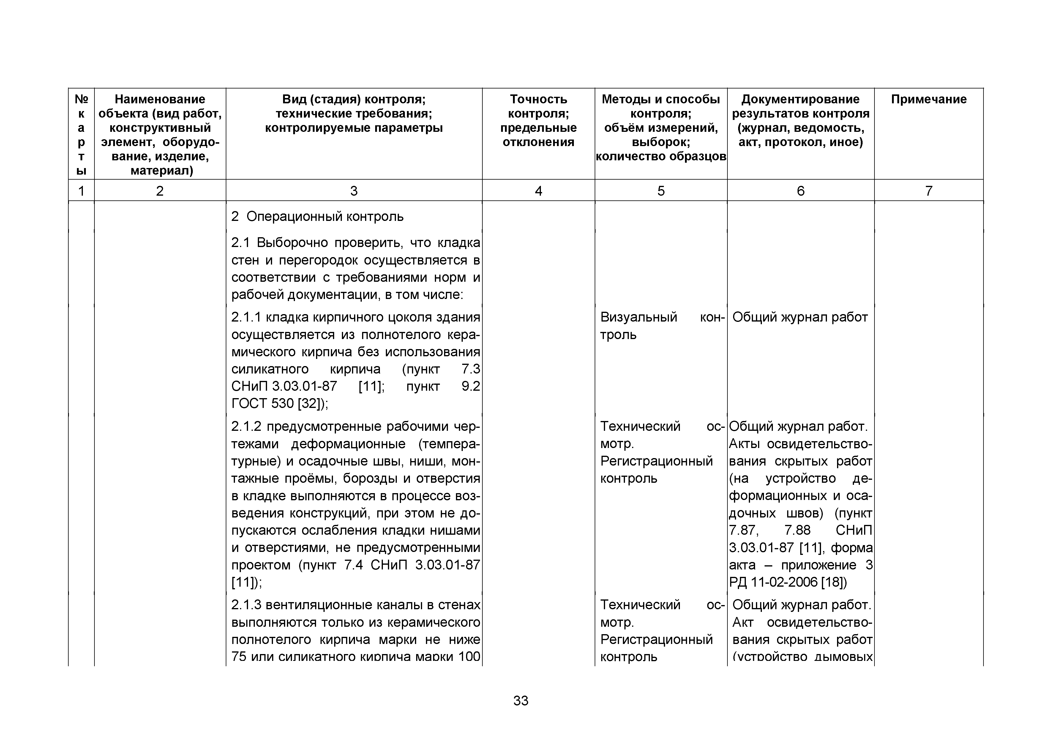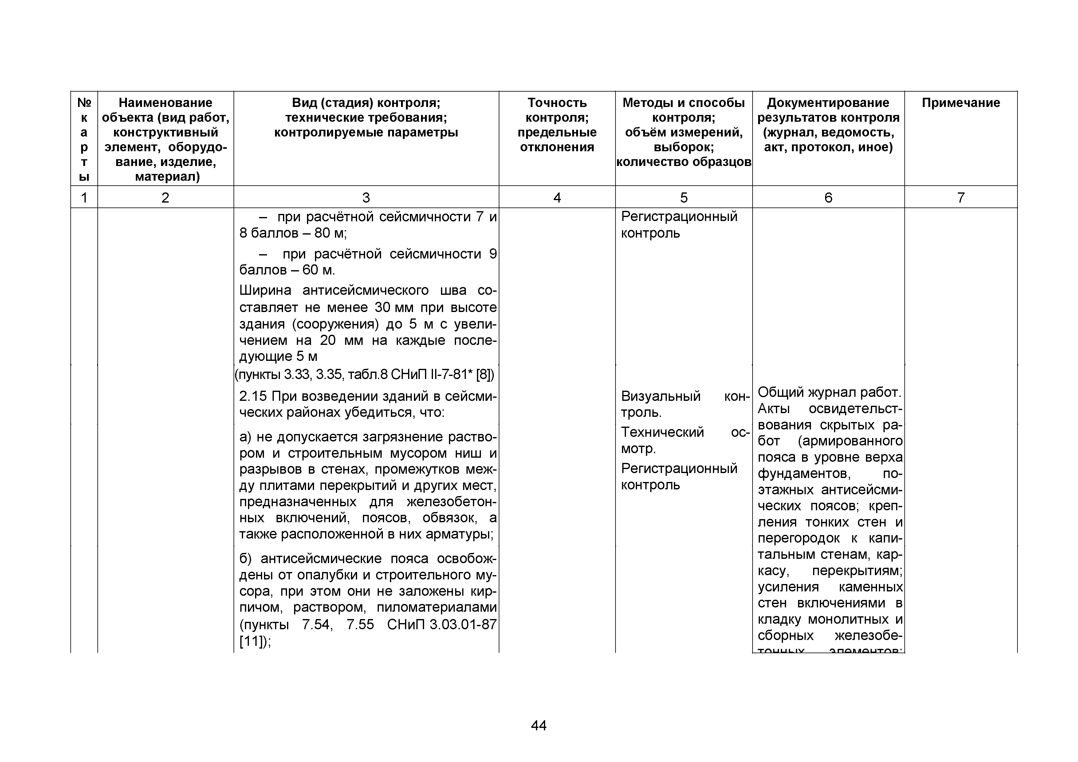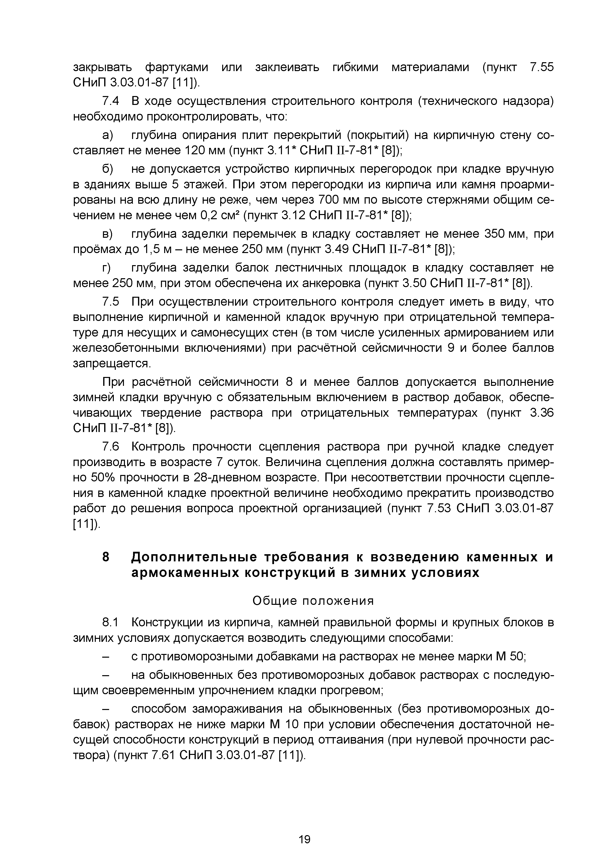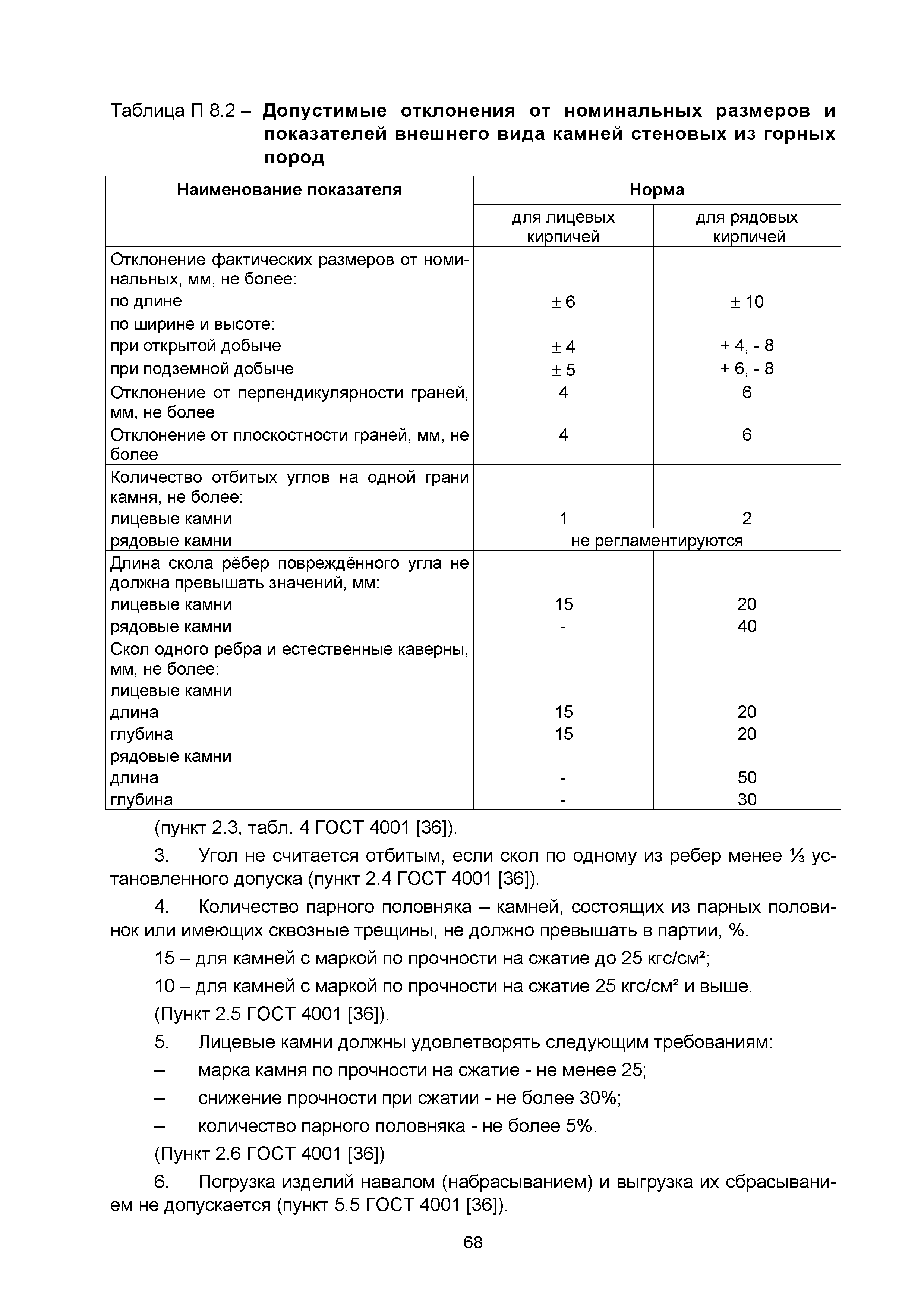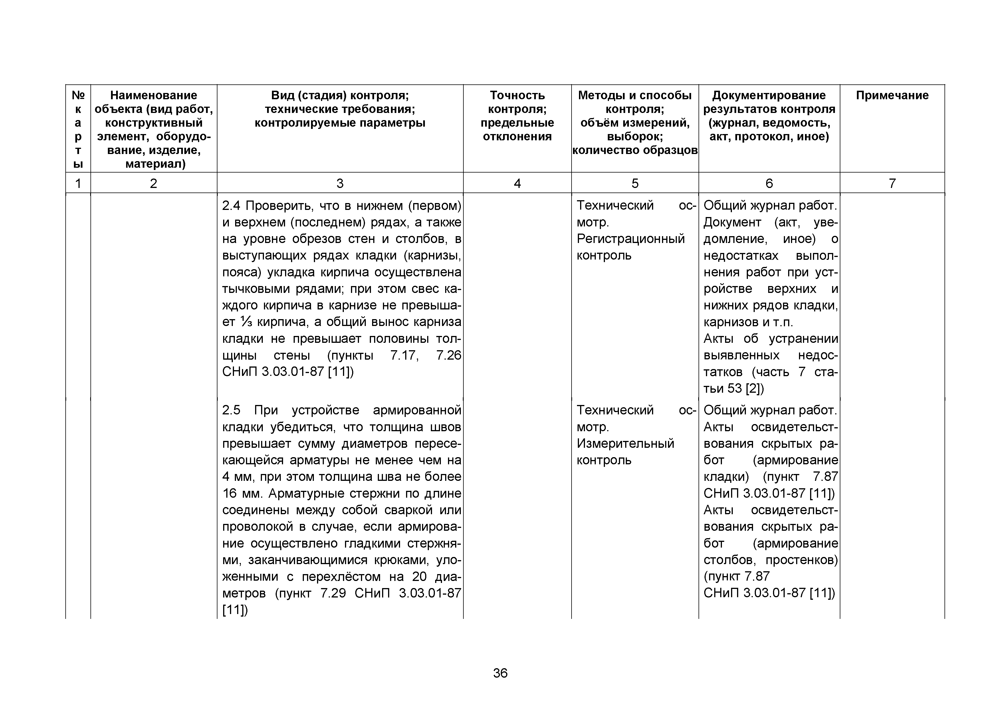 | Оглавление: | 1 Область применения 2 Нормативные ссылки 3 Термины и определения 4 Общие положения 5 Требования к складированию, хранению и качеству материалов для возведения каменных и армокаменных конструкций 6 Требования к качеству выполнения работ и отдельных технологических операций при возведении каменных и армокаменных конструкций 7 Дополнительные требования к производству работ в сейсмических районах 8 Дополнительные требования к возведению каменных и армокаменных конструкций в зимних условиях Приложение 1. Классификация дефектов по основным видам строительно-монтажных работ и производстве стеновых материалов Приложение 2. Технологическая карта на осуществление контроля качества при производстве работ по возведению каменных и армокаменных конструкций из керамического и силикатного кирпича, керамических, силикатных, природных и бетонных камней, кирпичных и керамических панелей и блоков, бетонных блоков Приложение 3. Требования к содержанию документов о качестве изделий для возведения каменных и армокаменных конструкций, установленные стандартами на эти изделия Приложение 4. Основные нормативные требования, предъявляемые к внешнему виду, размерам, цвету и другим характеристикам силикатных кирпича и камней Приложение 5. Основные нормативные требования, предъявляемые к внешнему виду, размерам, цвету и другим характеристикам керамических кирпича и камней Приложение 6. Основные нормативные требования, предъявляемые к внешнему виду, размерам, цвету и другим характеристикам камней бетонных стеновых Приложение 7. Основные нормативные требования, предъявляемые к внешнему виду, размерам, цвету и другим характеристикам плит облицовочных пиленых из природного камня Приложение 8. Основные нормативные требования, предъявляемые к внешнему виду, размерам, цвету и другим характеристикам камней стеновых из горных пород Приложение 9. Основные нормативные требования, предъявляемые к внешнему виду, размерам, цвету и другим характеристикам мелких стеновых блоков из ячеистых бетонов Приложение 10. Основные нормативные требования, предъявляемые к внешнему виду, размерам, цвету и другим характеристикам стеновых неармированных изделий из ячеистого бетона автоклавного твердения Библиография |