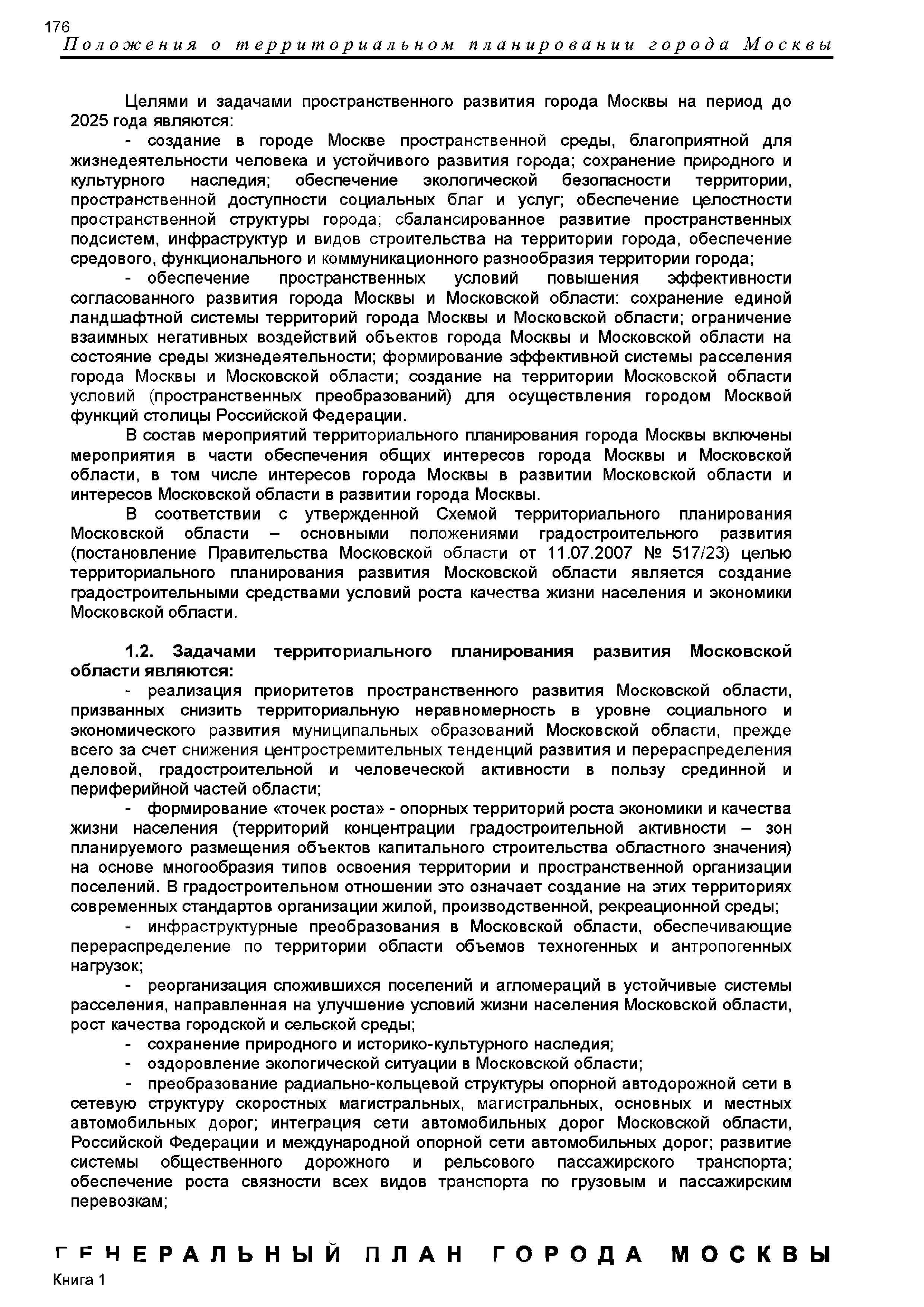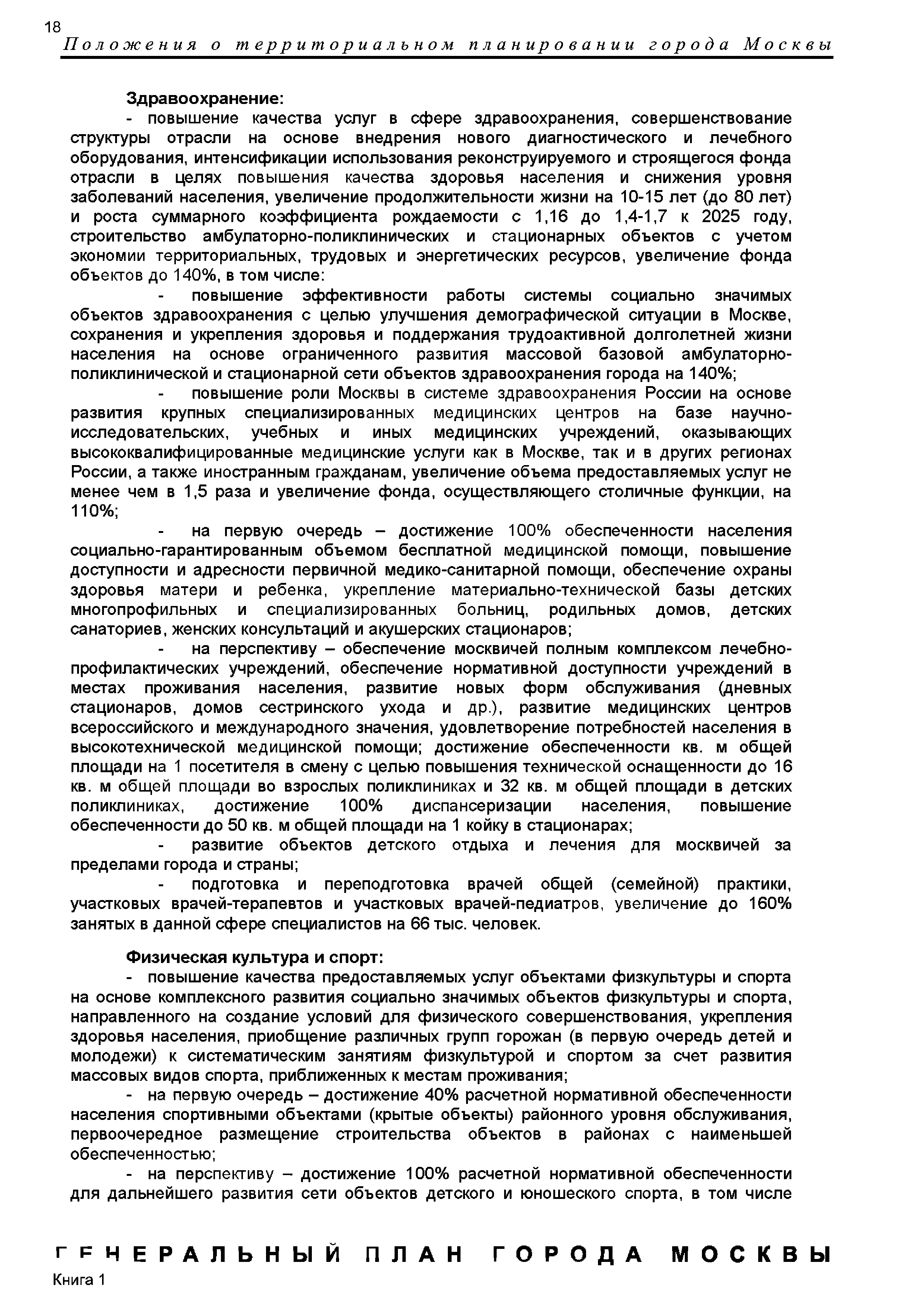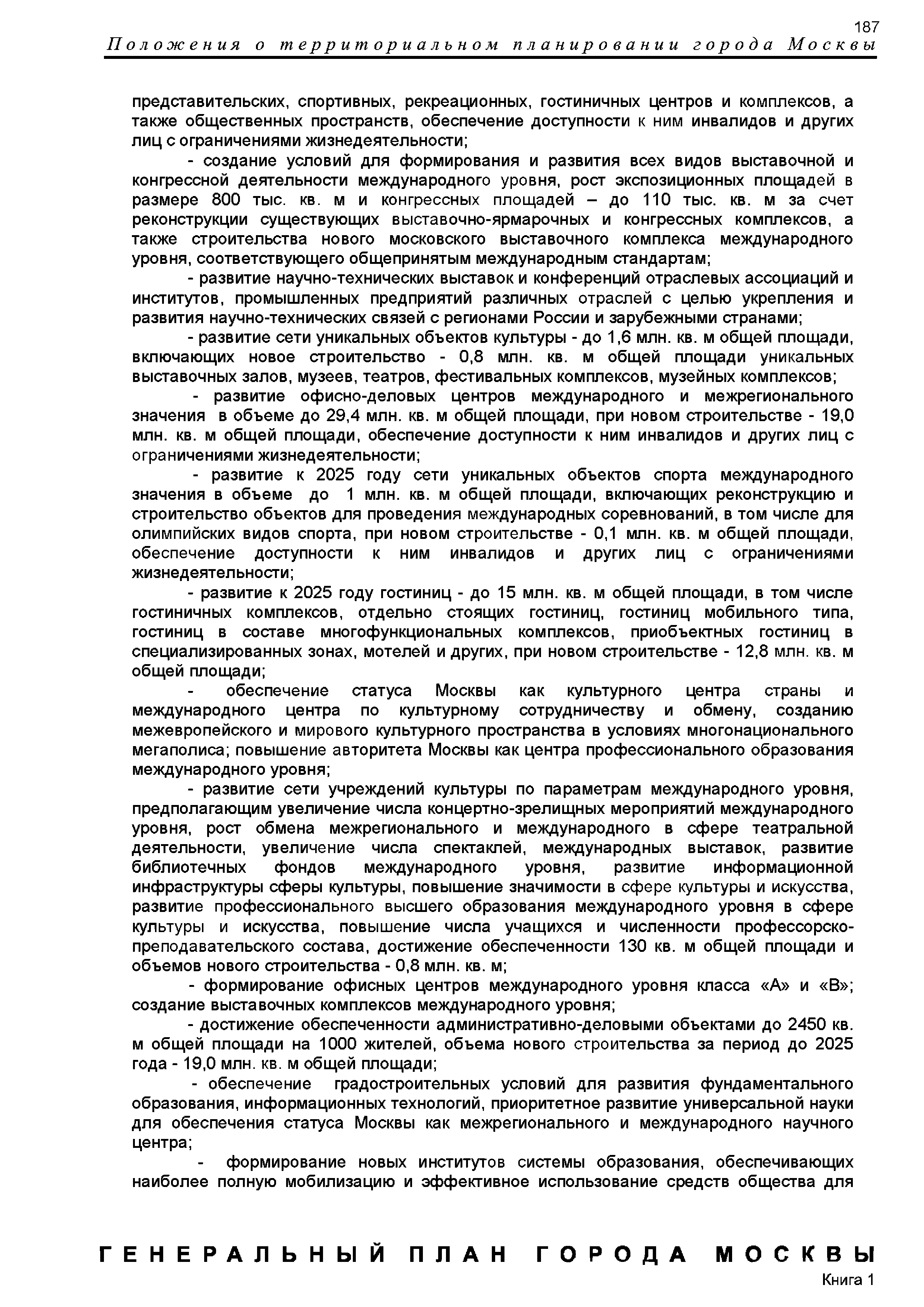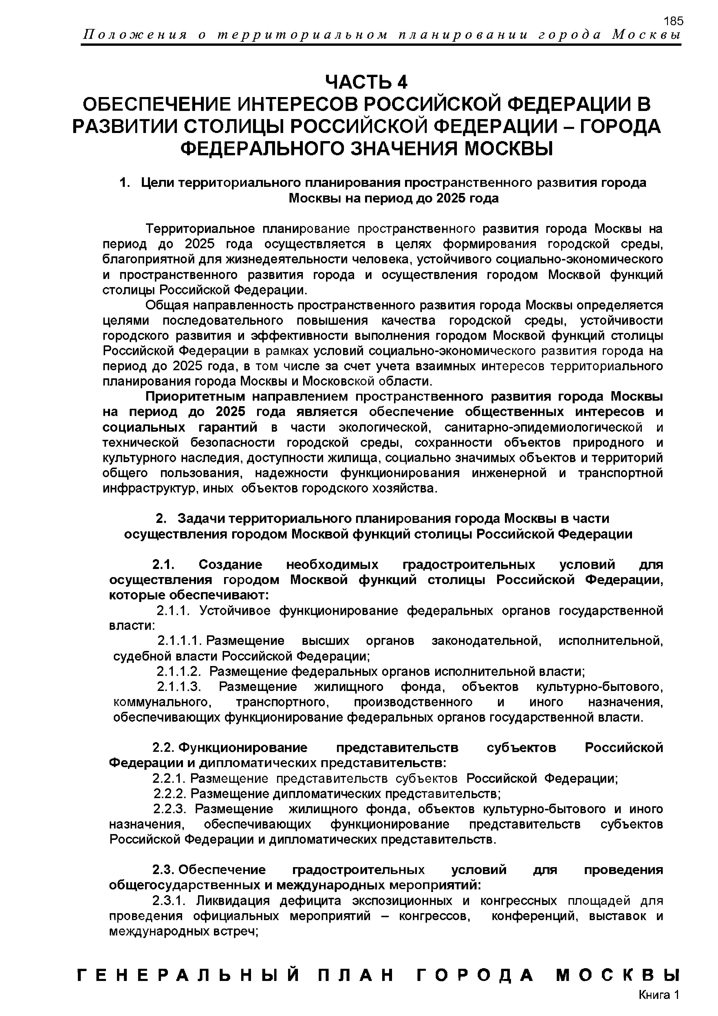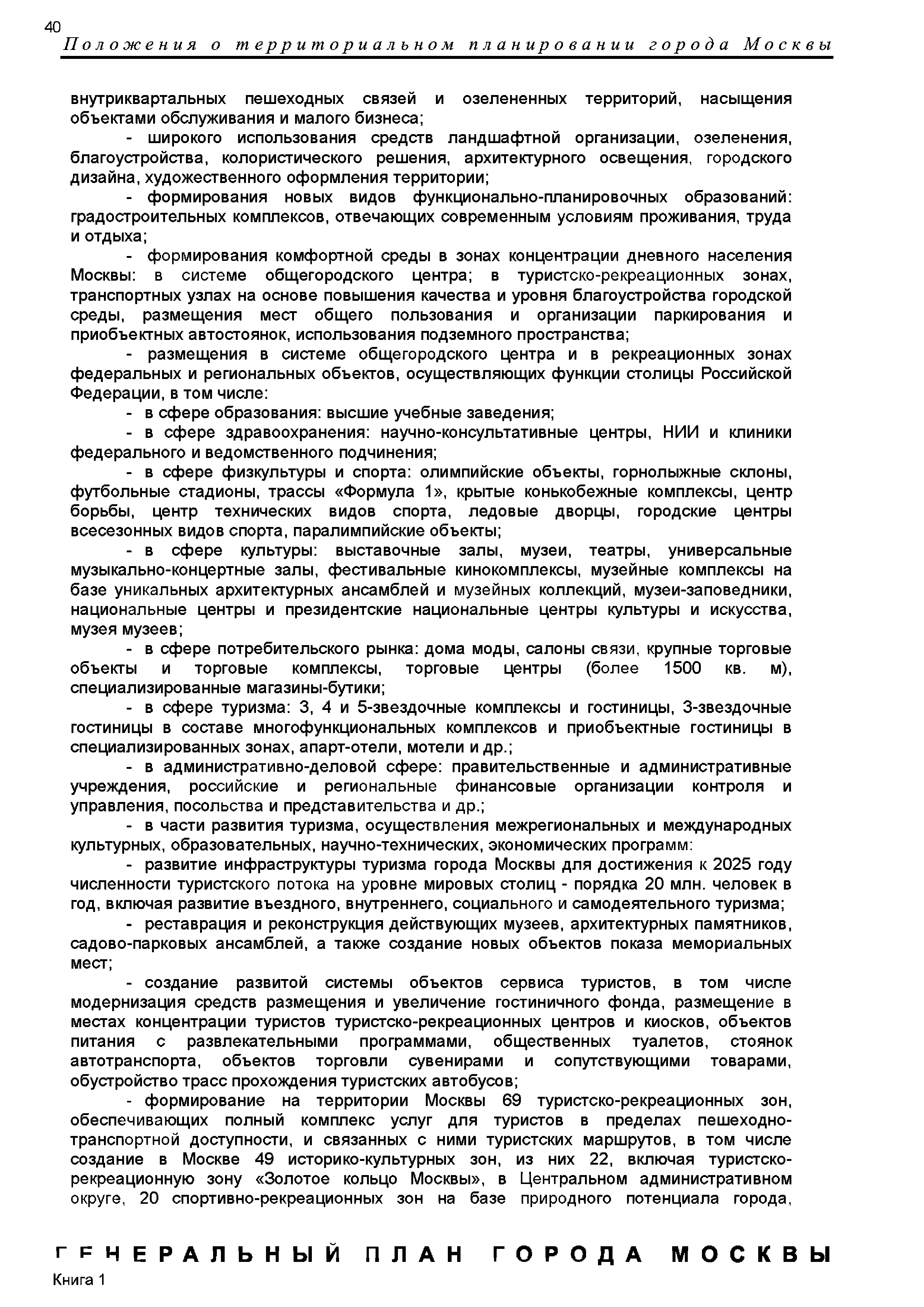 | Оглавление: | Содержание Часть 1. Социально-экономические предпосылки развития города Москвы 1. Общие положения 1.1. Цели и задачи социально-экономического развития города Москвы 1.2. Повышение качества жизни и уровня воспроизводства населения 1.3. Устойчивое и сбалансированное развитие отраслей экономики города Москвы и рост валового регионального продукта 1.4. Повышение эффективности использования накопленного потенциала и ресурсов города 1.5. Мероприятия социально-экономического развития города Москвы Часть 2. Территориальное планирование развития города Москвы 1. Цели территориального планирования пространственного развития города Москвы на период до 2025 года 2. Задачи территориального планирования пространственного развития города Москвы на период до 2025 года, направленные на обеспечение общественных интересов, социальных гарантий, последовательное повышение качества городской среды и устойчивости развития города 3. Основные группы мероприятий территориального планирования города Москвы 3.1. Мероприятия в области планировочной организации и функционального зонирования территории 3.2. Инженерно-технические мероприятия по охране окружающей среды и защите населения и территории от опасных воздействий природного и техногенного характера 3.3. Мероприятия по сохранению, восстановлению объектов культурного наследия и реабилитации исторической среды 3.4. Мероприятия по сохранению и реабилитации особо охраняемых природных территорий 3.5. Мероприятия по размещению и строительству, реконструкции, реновации, капитальному ремонту объектов капитального строительства жилищного, общественного, административного, делового, производственного назначения 3.6. Мероприятия по развитию, размещению и строительству, реконструкции систем и объектов транспортной инфраструктуры и совершенствованию их функционирования 3.7. Мероприятия по развитию, размещению и строительству, реконструкции систем и объектов инженерной инфраструктуры и совершенствованию их функционирования 3.8. Мероприятия по развитию, размещению и строительству, реконструкции социально значимых объектов социальной инфраструктуры 3.9. Мероприятия в области ландшафтного и садово-паркового строительства, комплексного благоустройства и художественного оформления территории 4. Показатели территориального планирования развития города Москвы 4.1. Основные показатели развития особо охраняемых природных территорий, природных и озелененных территорий, охраны окружающей среды и защиты населения и территорий от опасных воздействий 4.2. Основные показатели развития социальной инфраструктуры 4.3. Основные показатели в области жилищного строительства 4.4. Основные показатели развития транспортной инфраструктуры 4.5. Основные показатели развития инженерной инфраструктуры Часть 3. Обеспечение совместных интересов субъектов Российской Федерации - города федерального значения Москвы и Московской области в сфере территориального планирования 1. Цели и задачи территориального планирования в части обеспечения совместных интересов города Москвы и Московской области 2. Мероприятия территориального планирования в части обеспечения совместных интересов города Москвы и Московской области 2.1. Формирование эффективной системы расселения города Москвы и Московской области 2