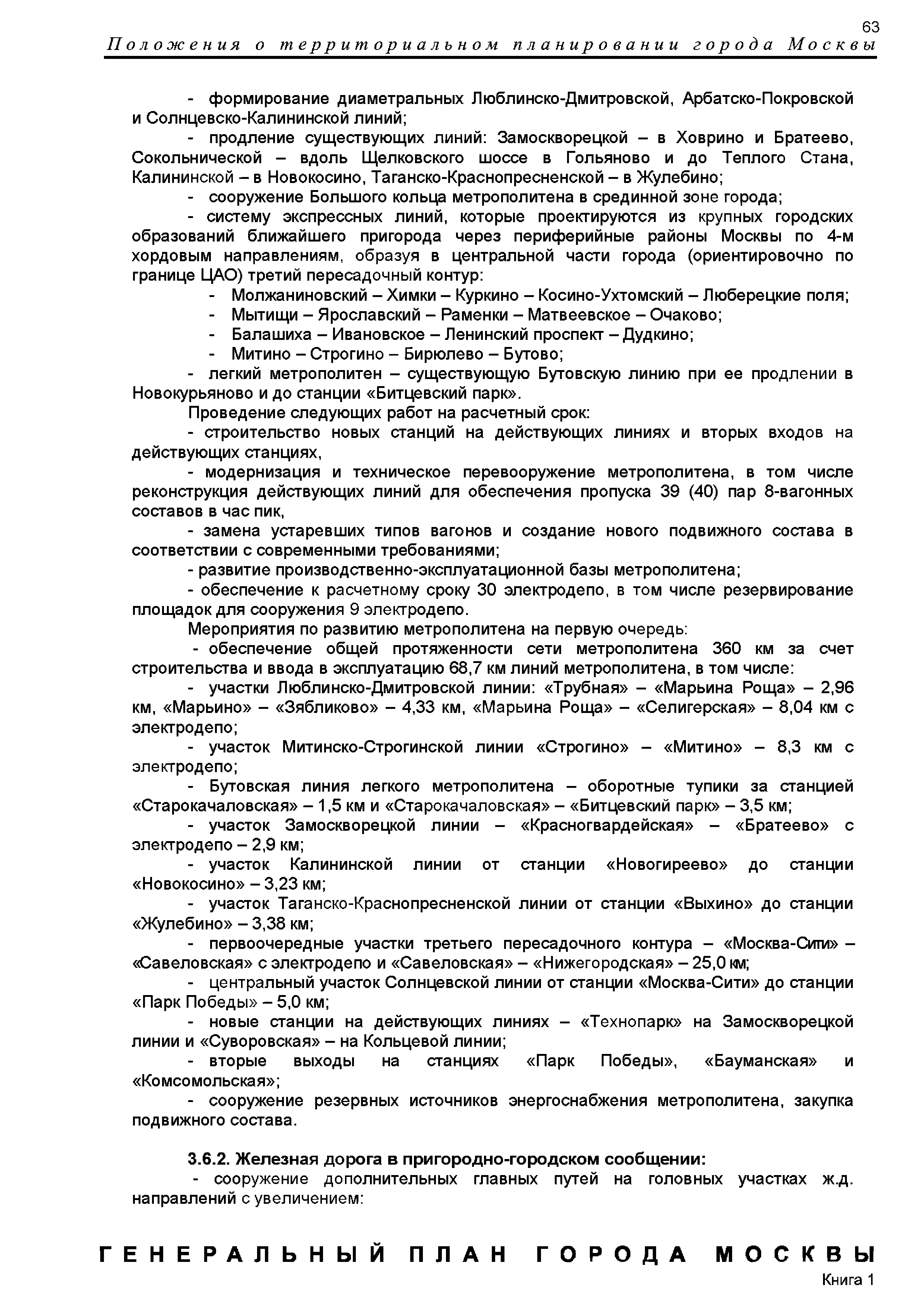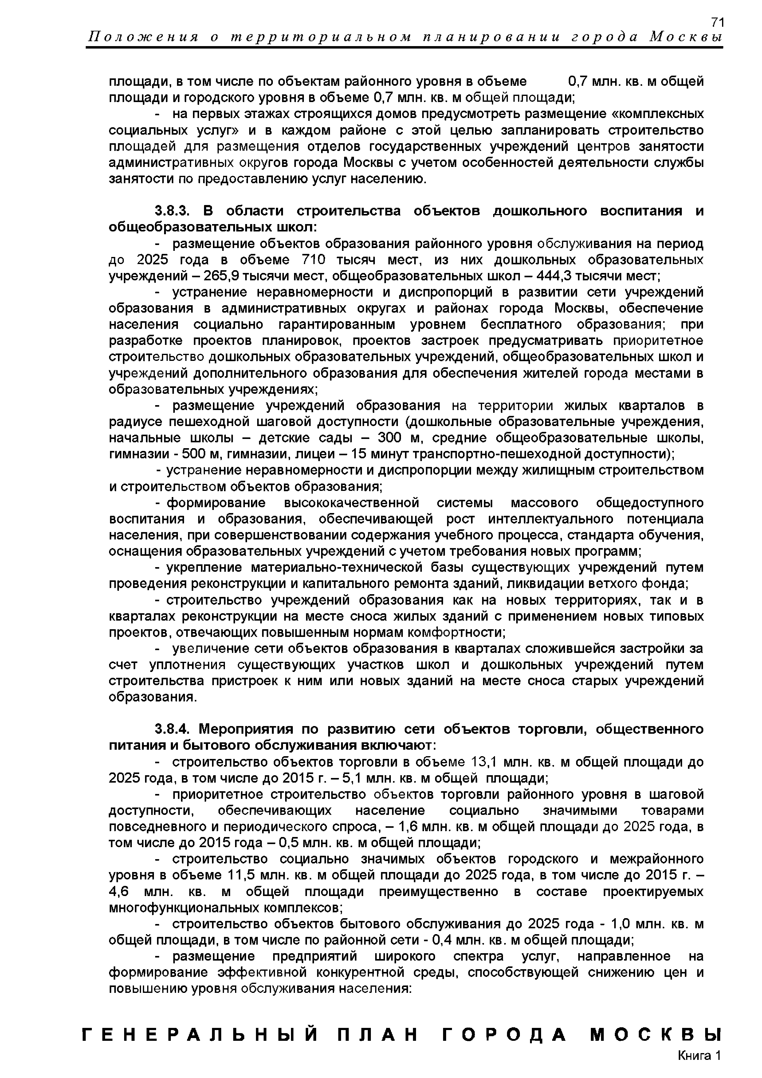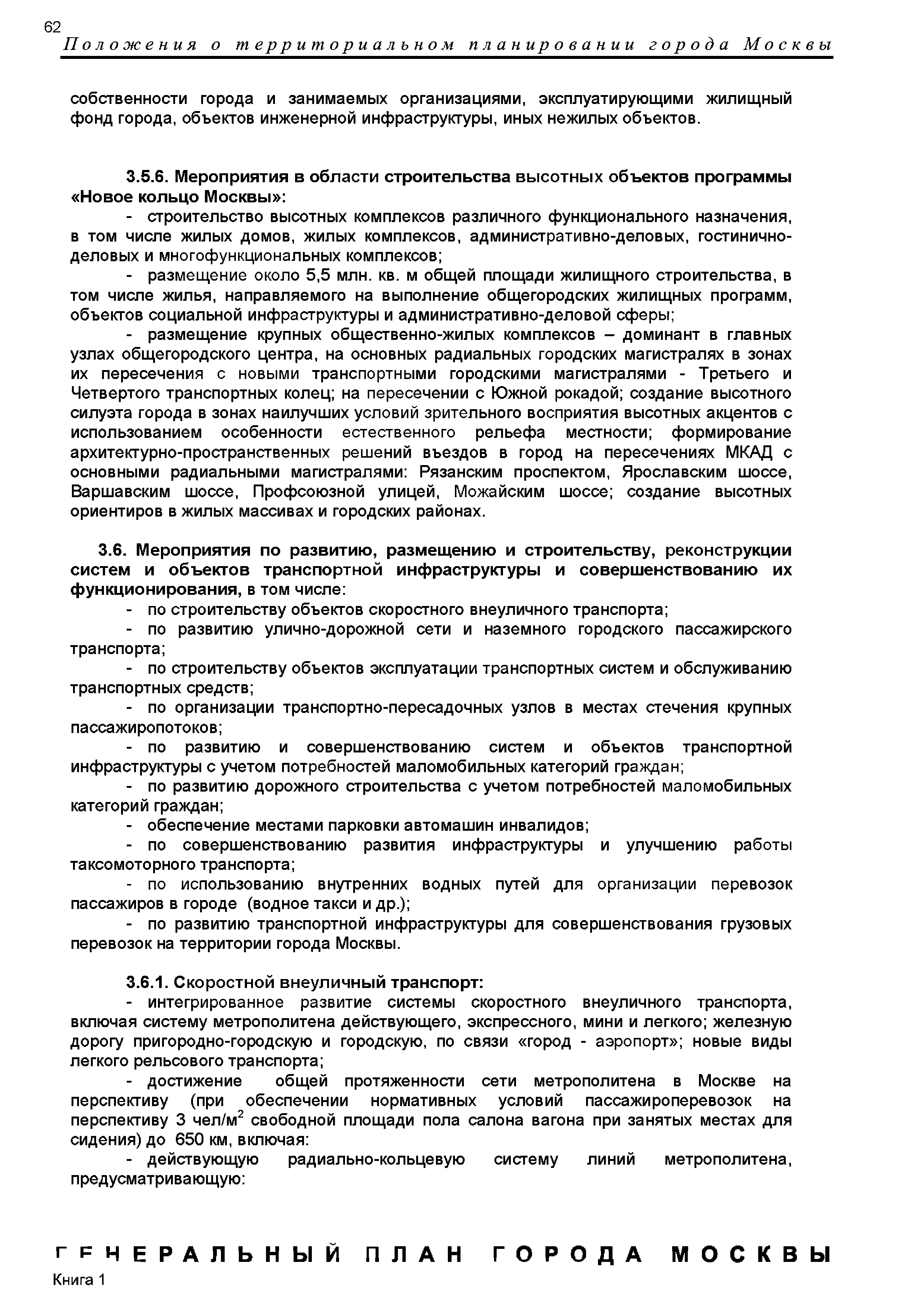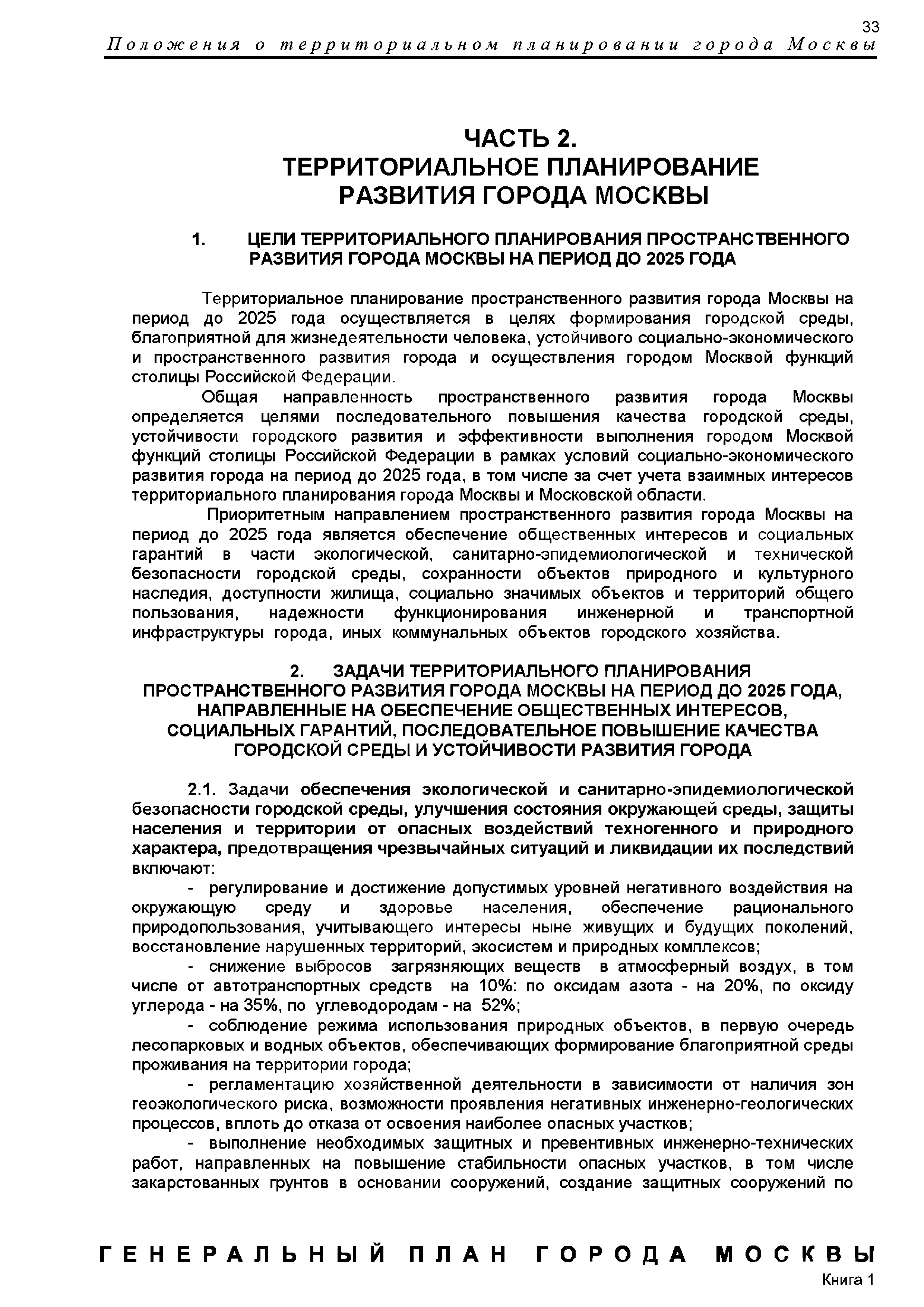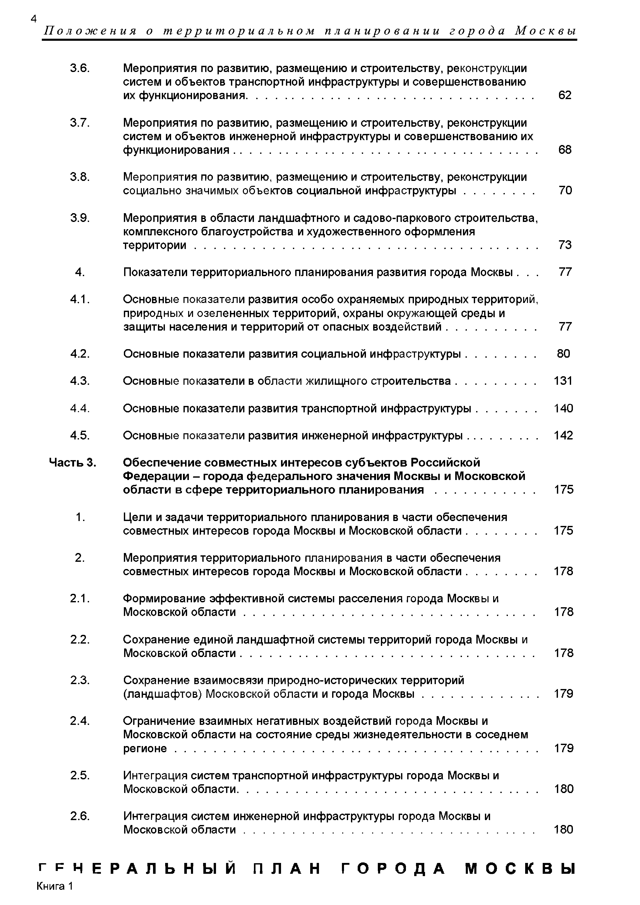 | Оглавление: | Содержание Часть 1. Социально-экономические предпосылки развития города Москвы 1. Общие положения 1.1. Цели и задачи социально-экономического развития города Москвы 1.2. Повышение качества жизни и уровня воспроизводства населения 1.3. Устойчивое и сбалансированное развитие отраслей экономики города Москвы и рост валового регионального продукта 1.4. Повышение эффективности использования накопленного потенциала и ресурсов города 1.5. Мероприятия социально-экономического развития города Москвы Часть 2. Территориальное планирование развития города Москвы 1. Цели территориального планирования пространственного развития города Москвы на период до 2025 года 2. Задачи территориального планирования пространственного развития города Москвы на период до 2025 года, направленные на обеспечение общественных интересов, социальных гарантий, последовательное повышение качества городской среды и устойчивости развития города 3. Основные группы мероприятий территориального планирования города Москвы 3.1. Мероприятия в области планировочной организации и функционального зонирования территории 3.2. Инженерно-технические мероприятия по охране окружающей среды и защите населения и территории от опасных воздействий природного и техногенного характера 3.3. Мероприятия по сохранению, восстановлению объектов культурного наследия и реабилитации исторической среды 3.4. Мероприятия по сохранению и реабилитации особо охраняемых природных территорий 3.5. Мероприятия по размещению и строительству, реконструкции, реновации, капитальному ремонту объектов капитального строительства жилищного, общественного, административного, делового, производственного назначения 3.6. Мероприятия по развитию, размещению и строительству, реконструкции систем и объектов транспортной инфраструктуры и совершенствованию их функционирования 3.7. Мероприятия по развитию, размещению и строительству, реконструкции систем и объектов инженерной инфраструктуры и совершенствованию их функционирования 3.8. Мероприятия по развитию, размещению и строительству, реконструкции социально значимых объектов социальной инфраструктуры 3.9. Мероприятия в области ландшафтного и садово-паркового строительства, комплексного благоустройства и художественного оформления территории 4. Показатели территориального планирования развития города Москвы 4.1. Основные показатели развития особо охраняемых природных территорий, природных и озелененных территорий, охраны окружающей среды и защиты населения и территорий от опасных воздействий 4.2. Основные показатели развития социальной инфраструктуры 4.3. Основные показатели в области жилищного строительства 4.4. Основные показатели развития транспортной инфраструктуры 4.5. Основные показатели развития инженерной инфраструктуры Часть 3. Обеспечение совместных интересов субъектов Российской Федерации - города федерального значения Москвы и Московской области в сфере территориального планирования 1. Цели и задачи территориального планирования в части обеспечения совместных интересов города Москвы и Московской области 2. Мероприятия территориального планирования в части обеспечения совместных интересов города Москвы и Московской области 2.1. Формирование эффективной системы расселения города Москвы и Московской области 2
