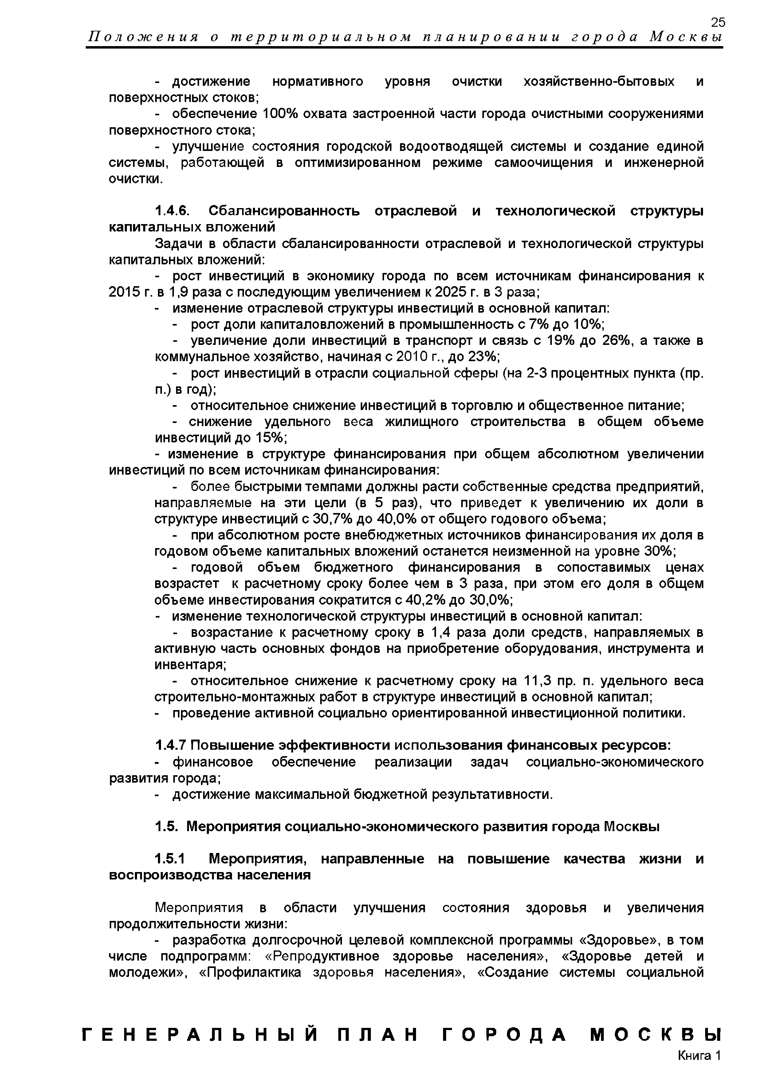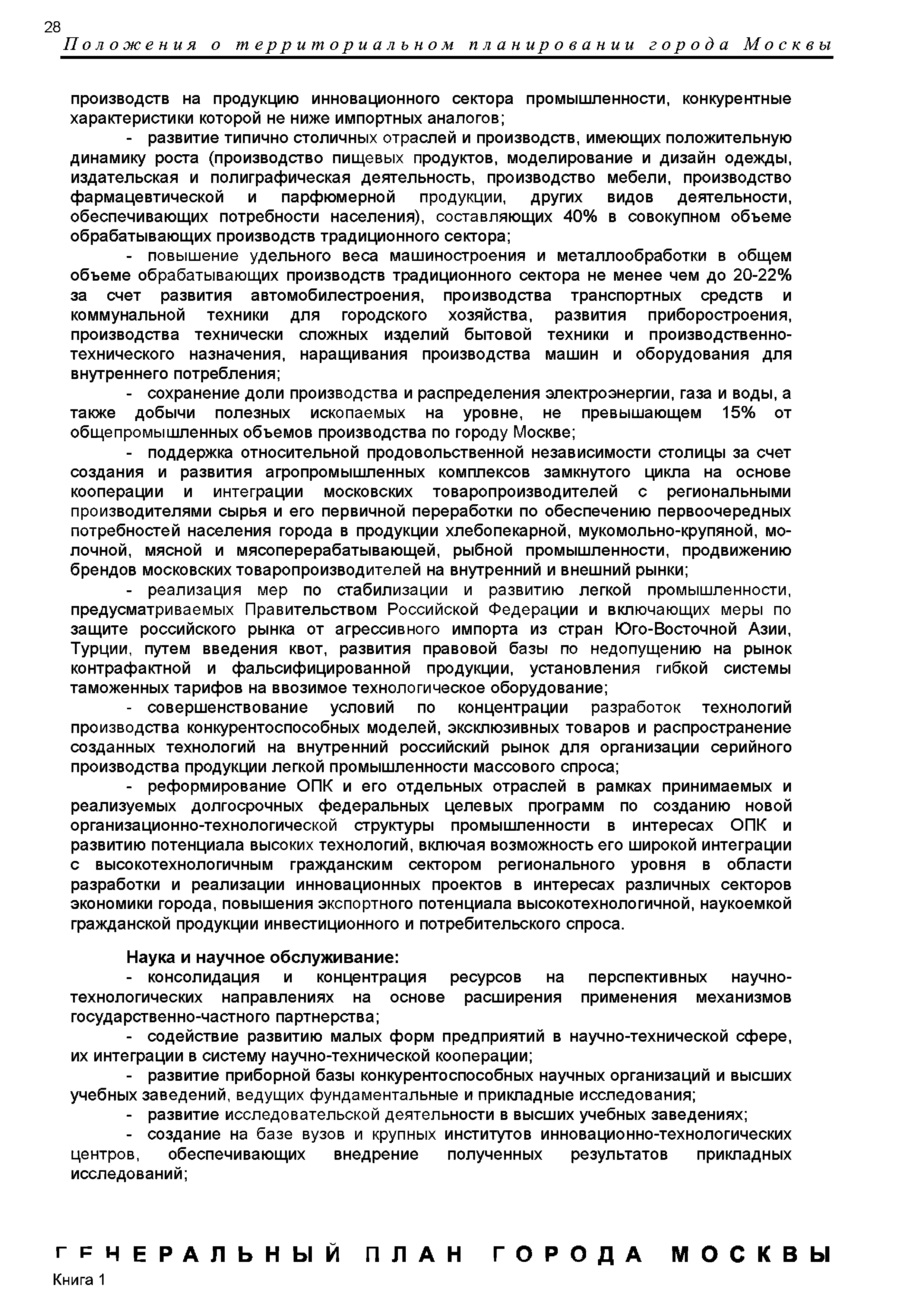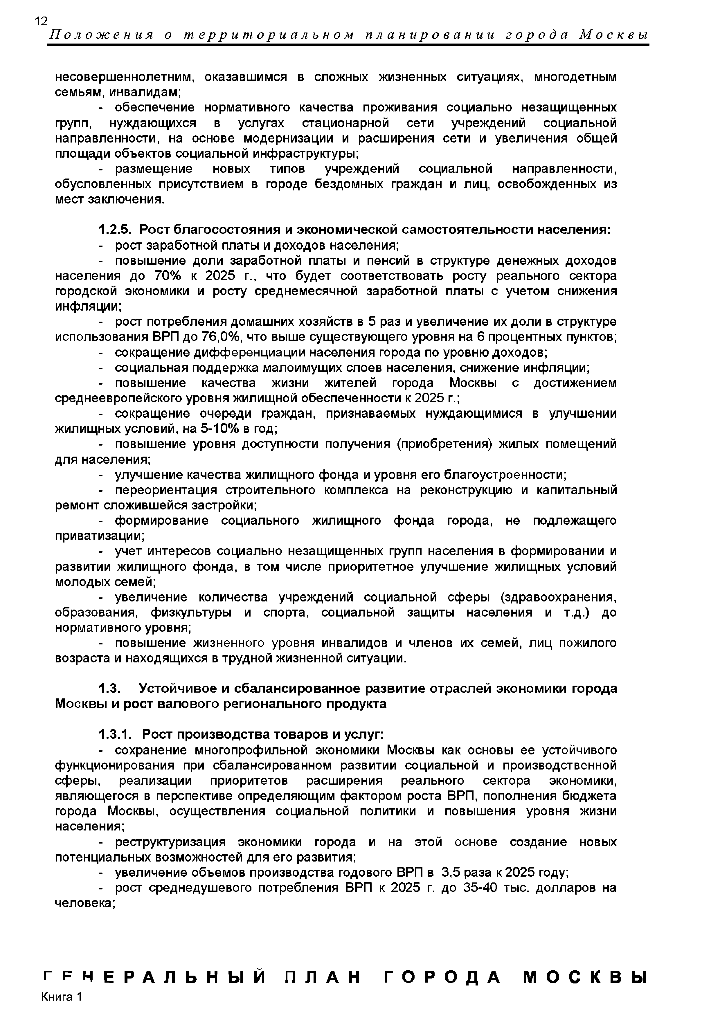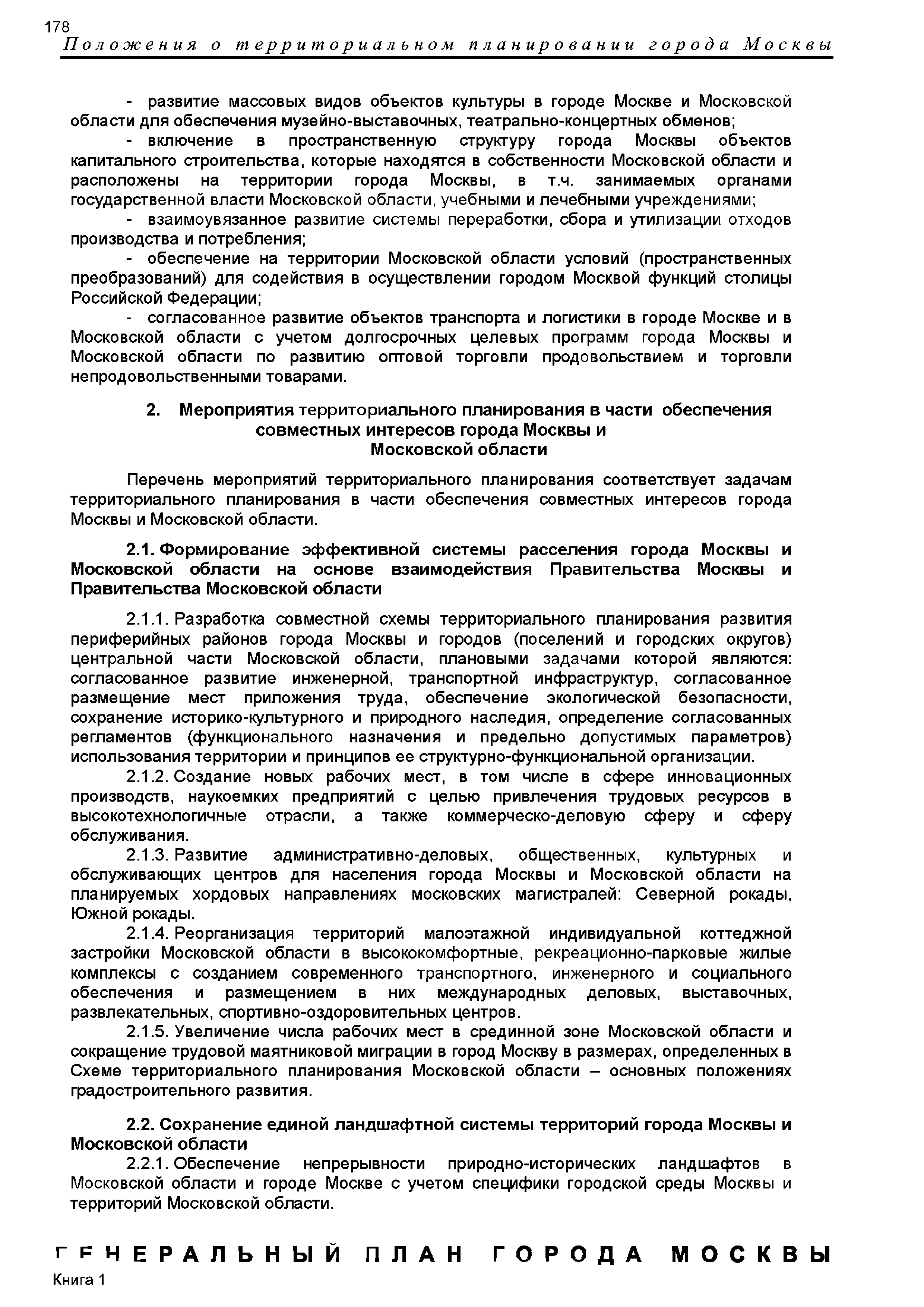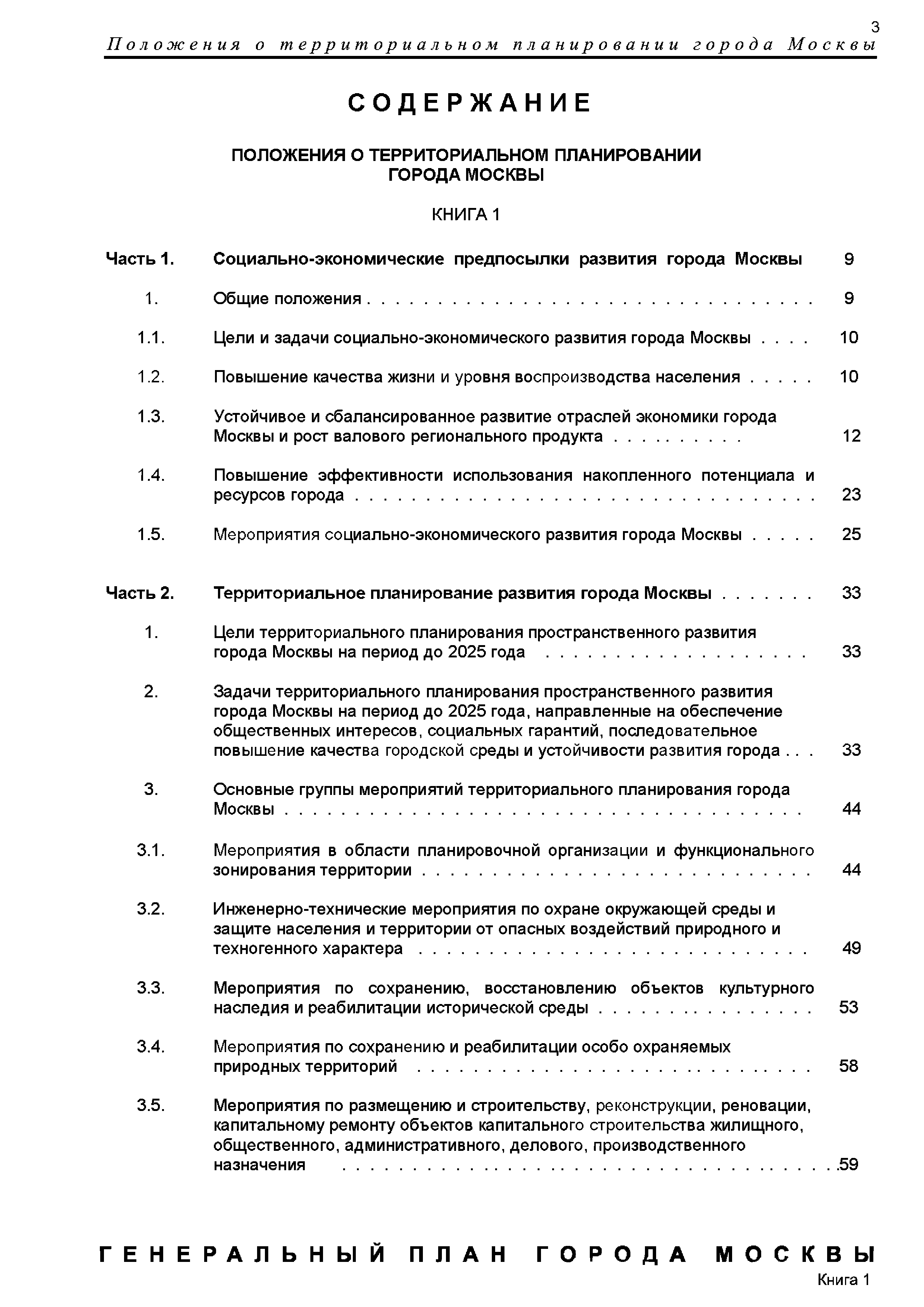 | Оглавление: | Содержание Часть 1. Социально-экономические предпосылки развития города Москвы 1. Общие положения 1.1. Цели и задачи социально-экономического развития города Москвы 1.2. Повышение качества жизни и уровня воспроизводства населения 1.3. Устойчивое и сбалансированное развитие отраслей экономики города Москвы и рост валового регионального продукта 1.4. Повышение эффективности использования накопленного потенциала и ресурсов города 1.5. Мероприятия социально-экономического развития города Москвы Часть 2. Территориальное планирование развития города Москвы 1. Цели территориального планирования пространственного развития города Москвы на период до 2025 года 2. Задачи территориального планирования пространственного развития города Москвы на период до 2025 года, направленные на обеспечение общественных интересов, социальных гарантий, последовательное повышение качества городской среды и устойчивости развития города 3. Основные группы мероприятий территориального планирования города Москвы 3.1. Мероприятия в области планировочной организации и функционального зонирования территории 3.2. Инженерно-технические мероприятия по охране окружающей среды и защите населения и территории от опасных воздействий природного и техногенного характера 3.3. Мероприятия по сохранению, восстановлению объектов культурного наследия и реабилитации исторической среды 3.4. Мероприятия по сохранению и реабилитации особо охраняемых природных территорий 3.5. Мероприятия по размещению и строительству, реконструкции, реновации, капитальному ремонту объектов капитального строительства жилищного, общественного, административного, делового, производственного назначения 3.6. Мероприятия по развитию, размещению и строительству, реконструкции систем и объектов транспортной инфраструктуры и совершенствованию их функционирования 3.7. Мероприятия по развитию, размещению и строительству, реконструкции систем и объектов инженерной инфраструктуры и совершенствованию их функционирования 3.8. Мероприятия по развитию, размещению и строительству, реконструкции социально значимых объектов социальной инфраструктуры 3.9. Мероприятия в области ландшафтного и садово-паркового строительства, комплексного благоустройства и художественного оформления территории 4. Показатели территориального планирования развития города Москвы 4.1. Основные показатели развития особо охраняемых природных территорий, природных и озелененных территорий, охраны окружающей среды и защиты населения и территорий от опасных воздействий 4.2. Основные показатели развития социальной инфраструктуры 4.3. Основные показатели в области жилищного строительства 4.4. Основные показатели развития транспортной инфраструктуры 4.5. Основные показатели развития инженерной инфраструктуры Часть 3. Обеспечение совместных интересов субъектов Российской Федерации - города федерального значения Москвы и Московской области в сфере территориального планирования 1. Цели и задачи территориального планирования в части обеспечения совместных интересов города Москвы и Московской области 2. Мероприятия территориального планирования в части обеспечения совместных интересов города Москвы и Московской области 2.1. Формирование эффективной системы расселения города Москвы и Московской области 2