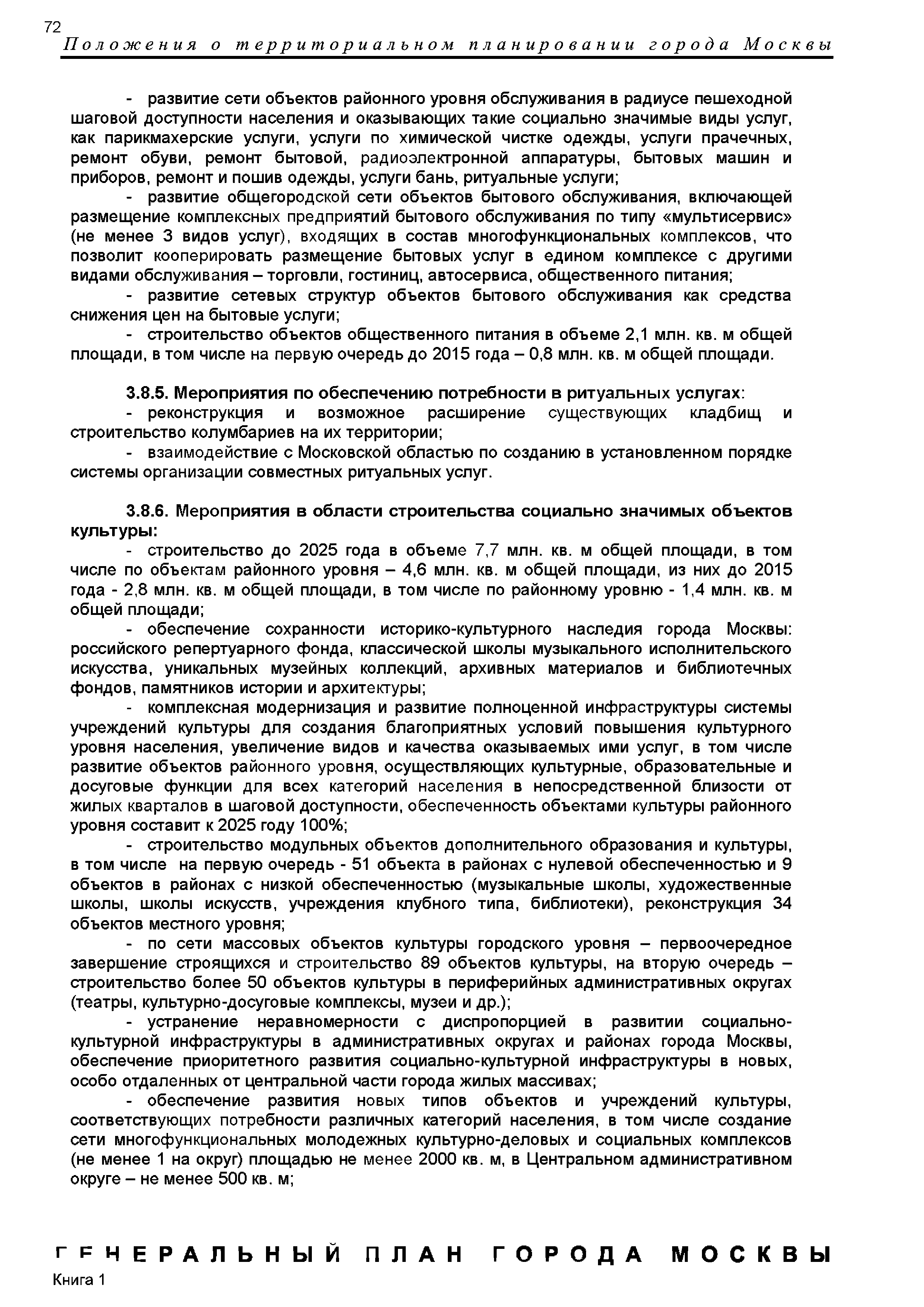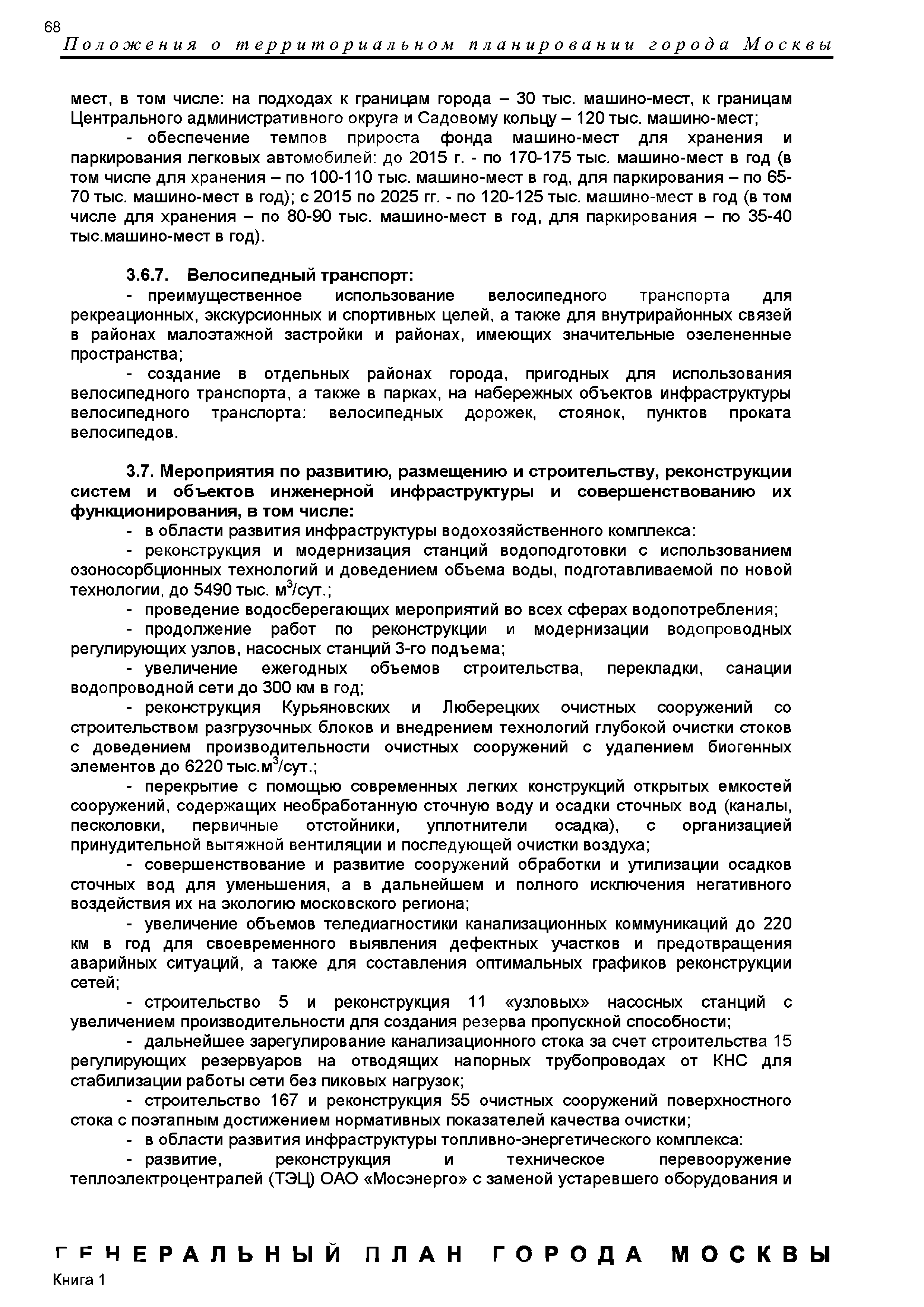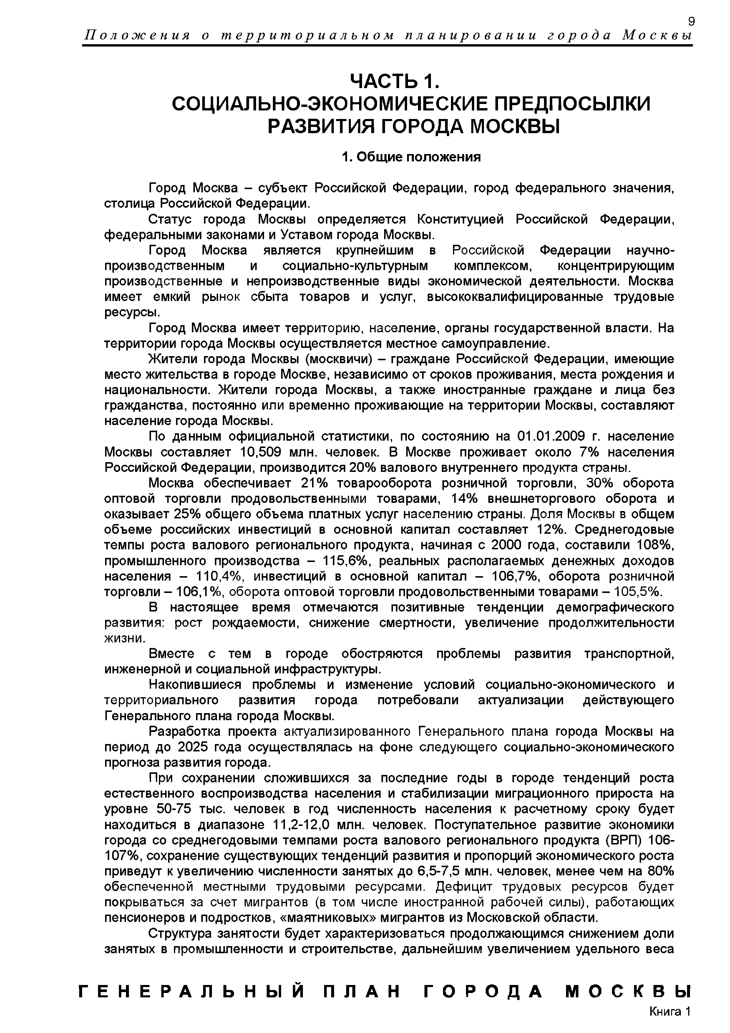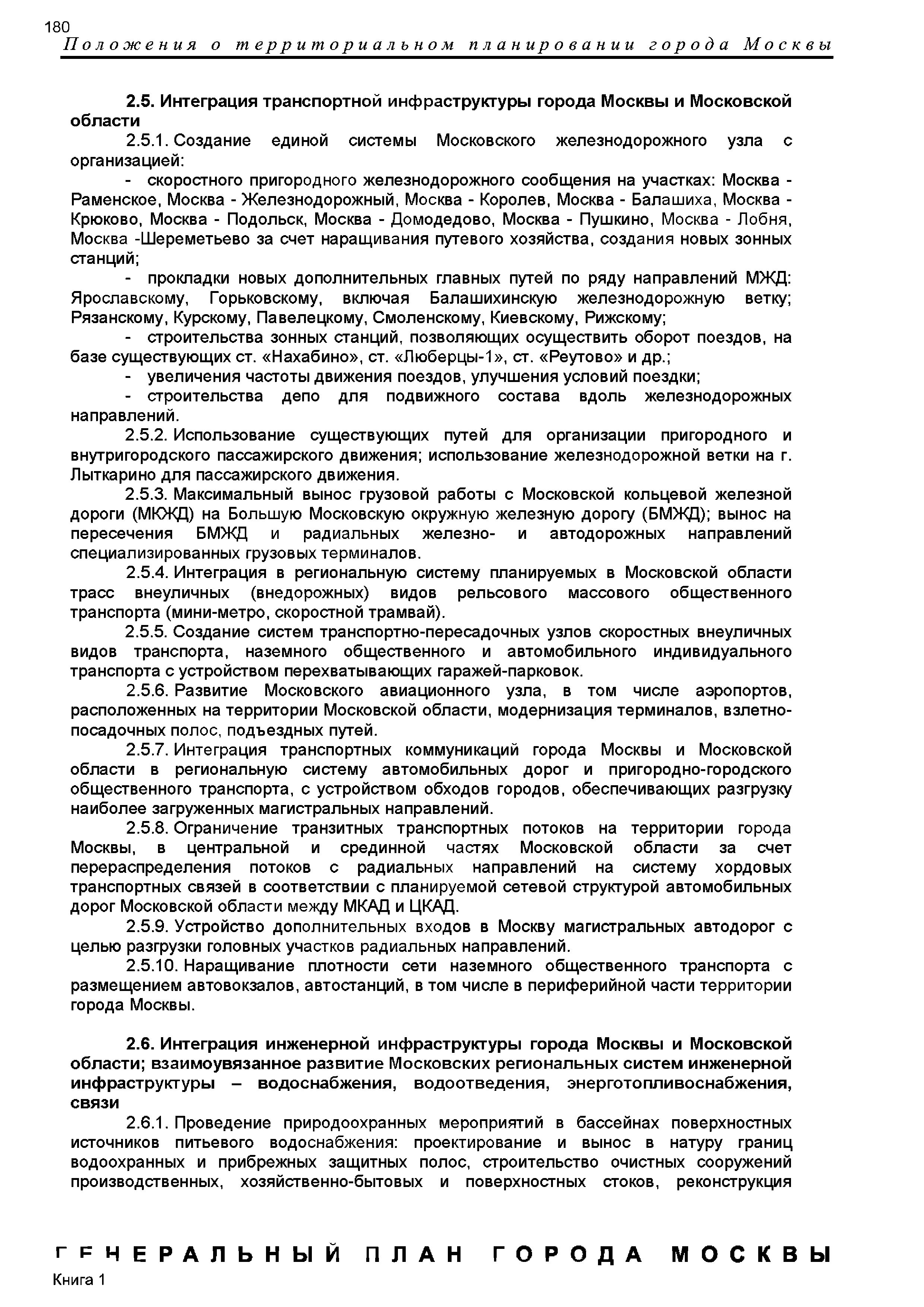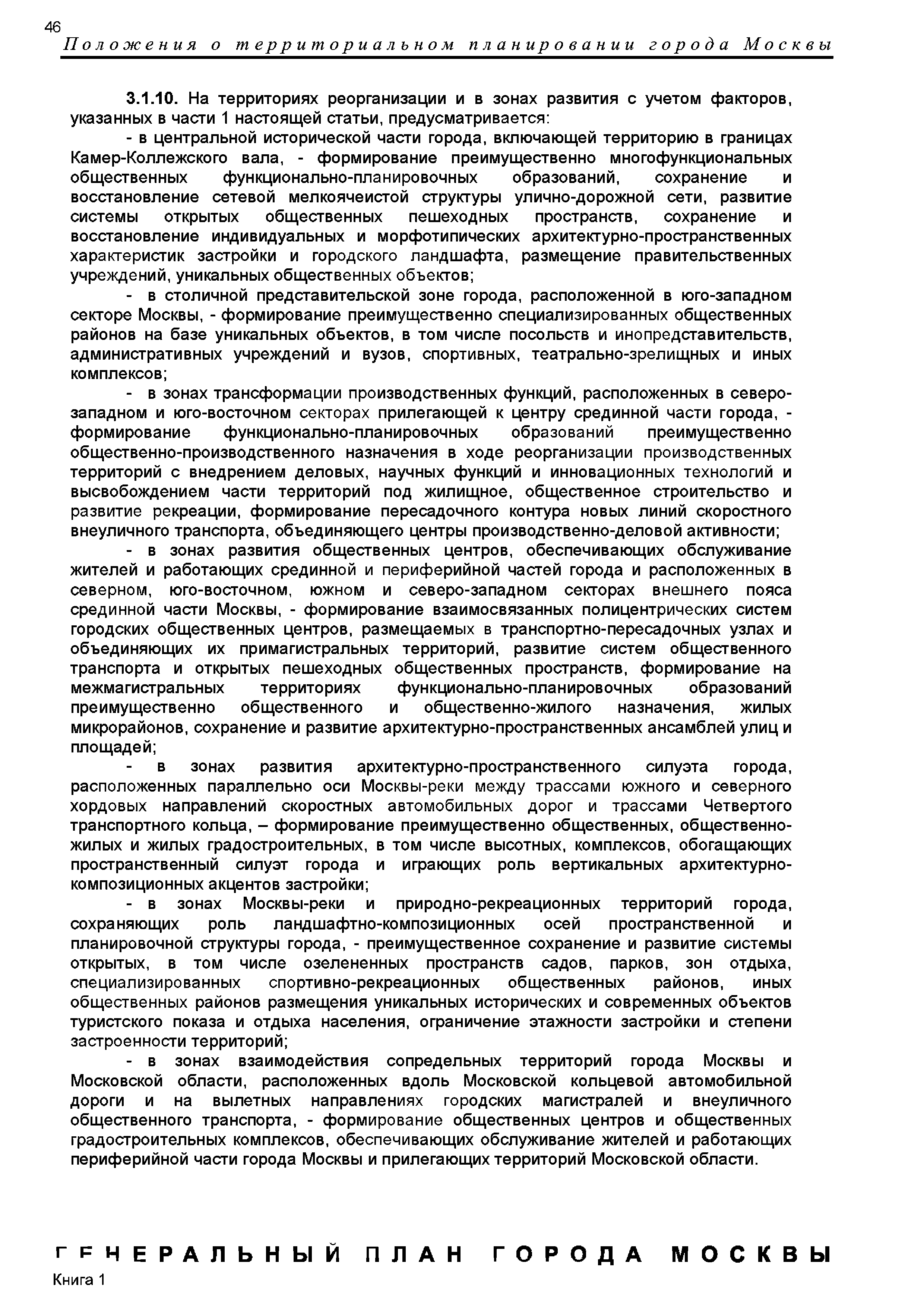 | Оглавление: | Содержание Часть 1. Социально-экономические предпосылки развития города Москвы 1. Общие положения 1.1. Цели и задачи социально-экономического развития города Москвы 1.2. Повышение качества жизни и уровня воспроизводства населения 1.3. Устойчивое и сбалансированное развитие отраслей экономики города Москвы и рост валового регионального продукта 1.4. Повышение эффективности использования накопленного потенциала и ресурсов города 1.5. Мероприятия социально-экономического развития города Москвы Часть 2. Территориальное планирование развития города Москвы 1. Цели территориального планирования пространственного развития города Москвы на период до 2025 года 2. Задачи территориального планирования пространственного развития города Москвы на период до 2025 года, направленные на обеспечение общественных интересов, социальных гарантий, последовательное повышение качества городской среды и устойчивости развития города 3. Основные группы мероприятий территориального планирования города Москвы 3.1. Мероприятия в области планировочной организации и функционального зонирования территории 3.2. Инженерно-технические мероприятия по охране окружающей среды и защите населения и территории от опасных воздействий природного и техногенного характера 3.3. Мероприятия по сохранению, восстановлению объектов культурного наследия и реабилитации исторической среды 3.4. Мероприятия по сохранению и реабилитации особо охраняемых природных территорий 3.5. Мероприятия по размещению и строительству, реконструкции, реновации, капитальному ремонту объектов капитального строительства жилищного, общественного, административного, делового, производственного назначения 3.6. Мероприятия по развитию, размещению и строительству, реконструкции систем и объектов транспортной инфраструктуры и совершенствованию их функционирования 3.7. Мероприятия по развитию, размещению и строительству, реконструкции систем и объектов инженерной инфраструктуры и совершенствованию их функционирования 3.8. Мероприятия по развитию, размещению и строительству, реконструкции социально значимых объектов социальной инфраструктуры 3.9. Мероприятия в области ландшафтного и садово-паркового строительства, комплексного благоустройства и художественного оформления территории 4. Показатели территориального планирования развития города Москвы 4.1. Основные показатели развития особо охраняемых природных территорий, природных и озелененных территорий, охраны окружающей среды и защиты населения и территорий от опасных воздействий 4.2. Основные показатели развития социальной инфраструктуры 4.3. Основные показатели в области жилищного строительства 4.4. Основные показатели развития транспортной инфраструктуры 4.5. Основные показатели развития инженерной инфраструктуры Часть 3. Обеспечение совместных интересов субъектов Российской Федерации - города федерального значения Москвы и Московской области в сфере территориального планирования 1. Цели и задачи территориального планирования в части обеспечения совместных интересов города Москвы и Московской области 2. Мероприятия территориального планирования в части обеспечения совместных интересов города Москвы и Московской области 2.1. Формирование эффективной системы расселения города Москвы и Московской области 2