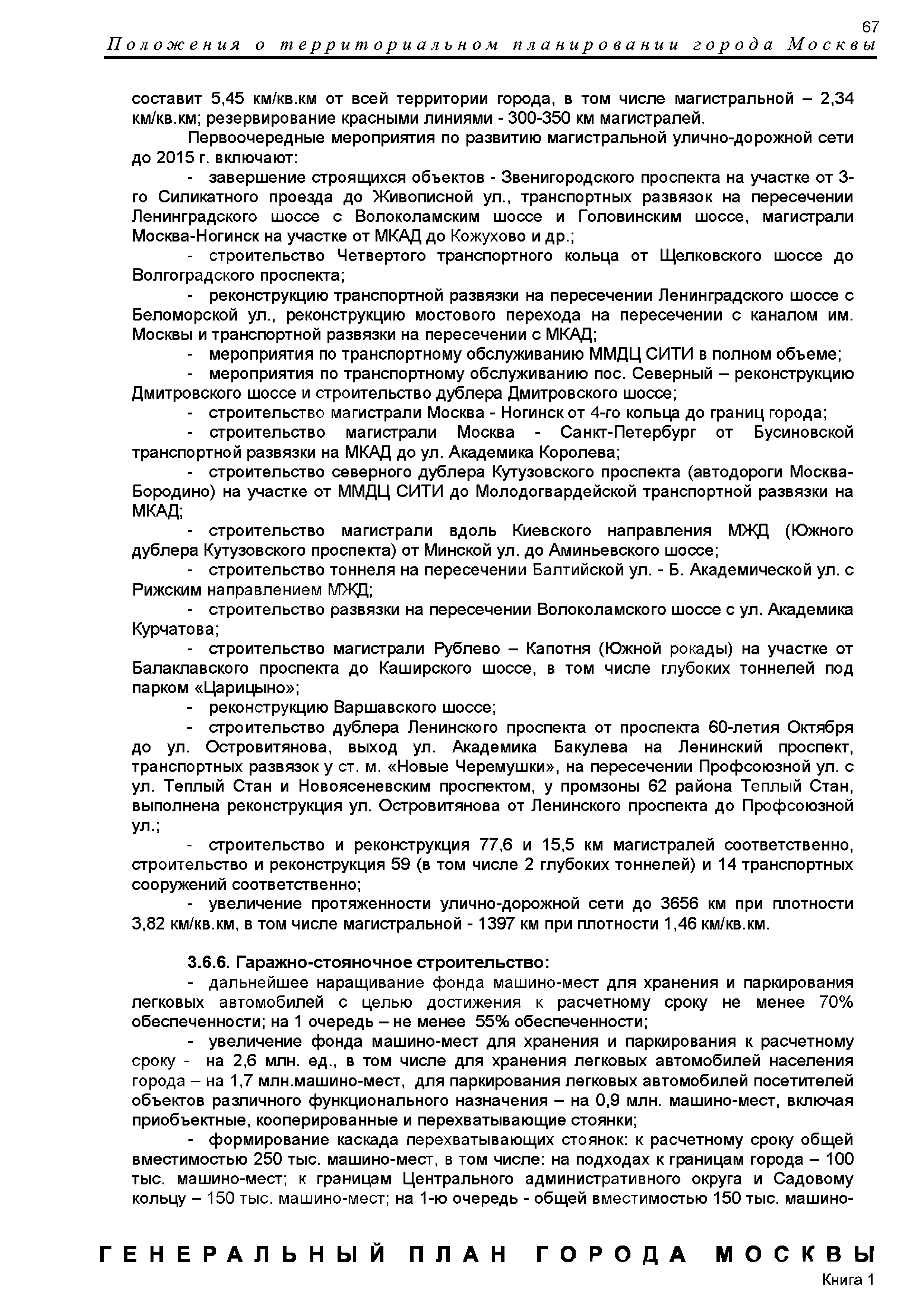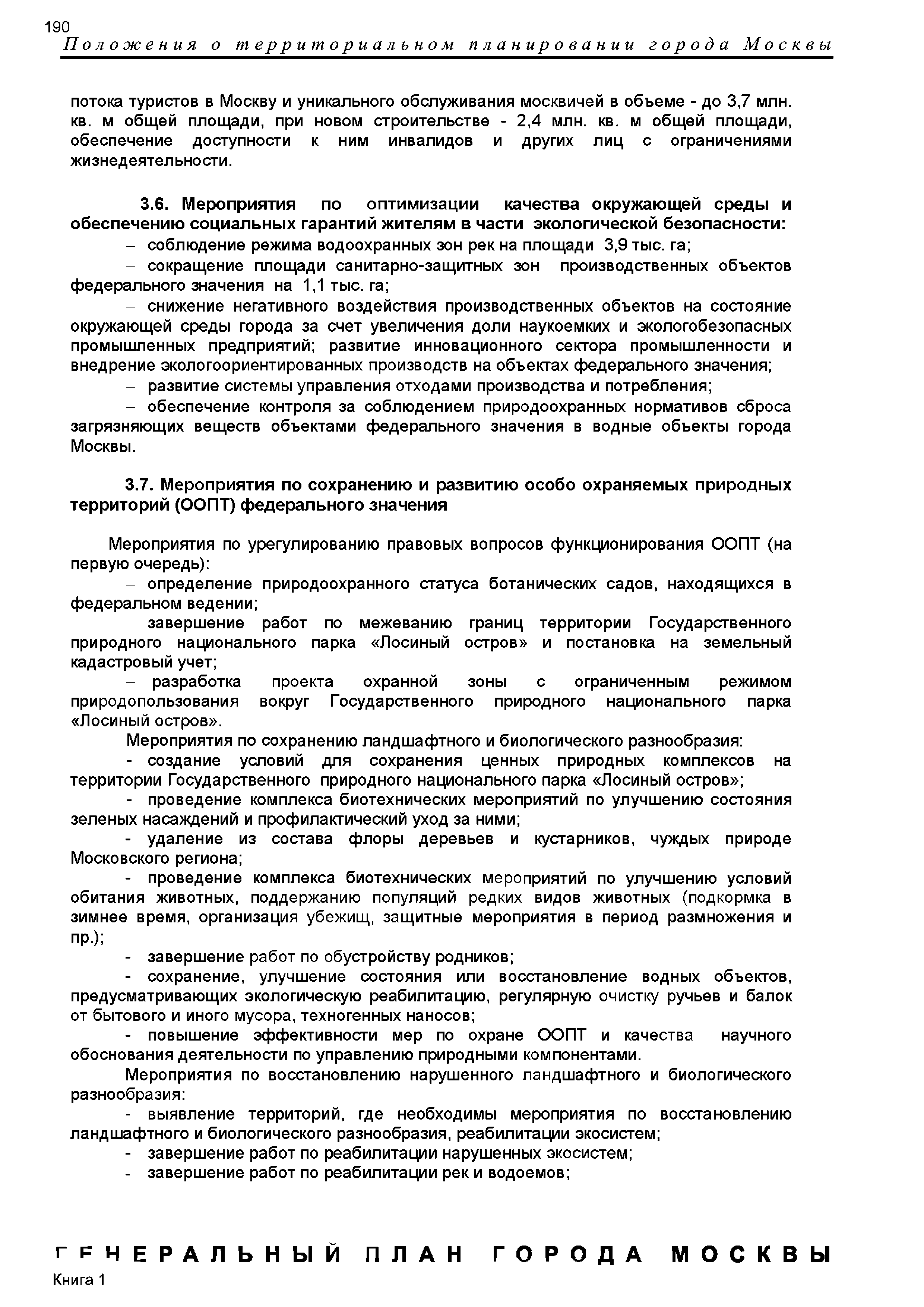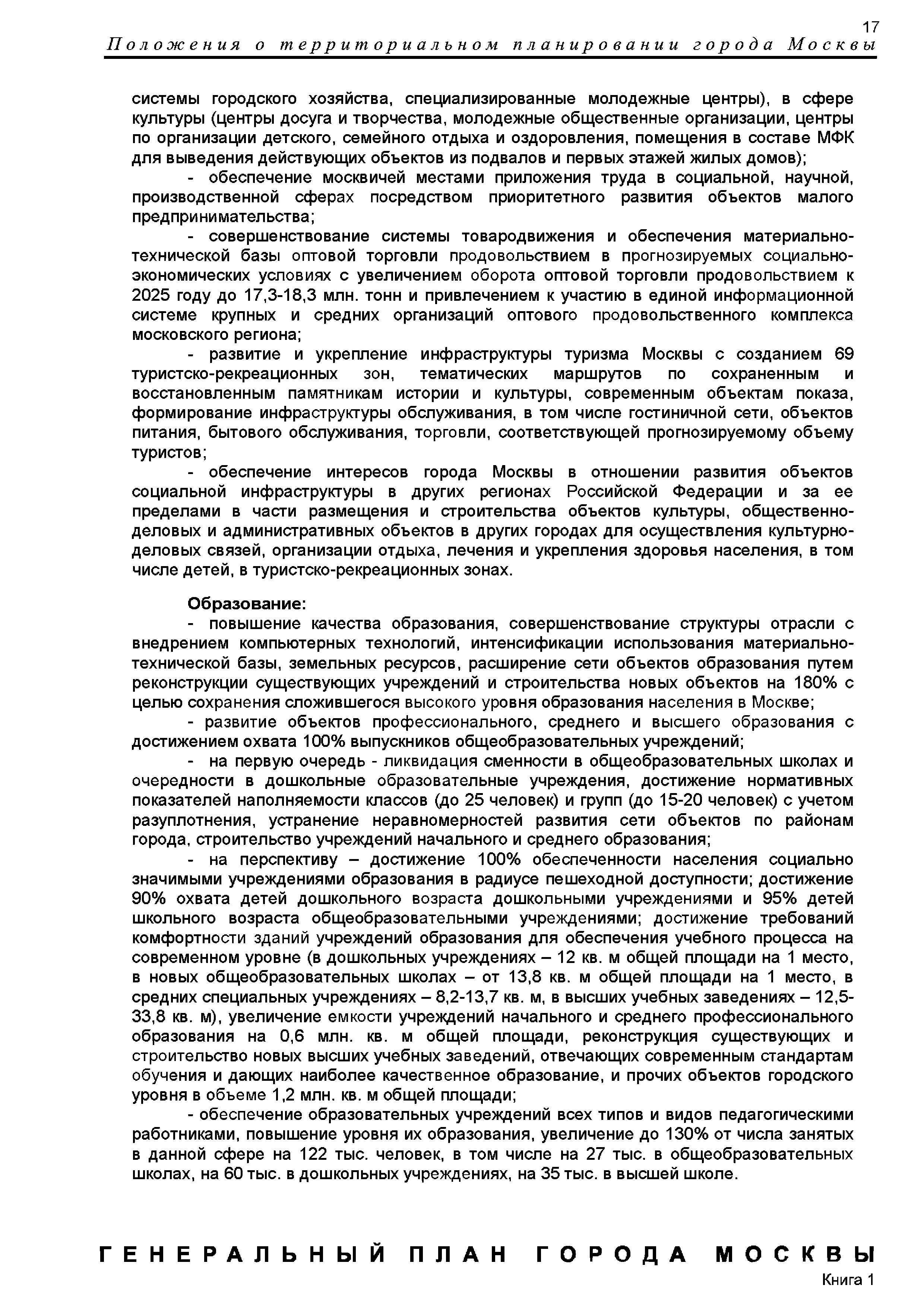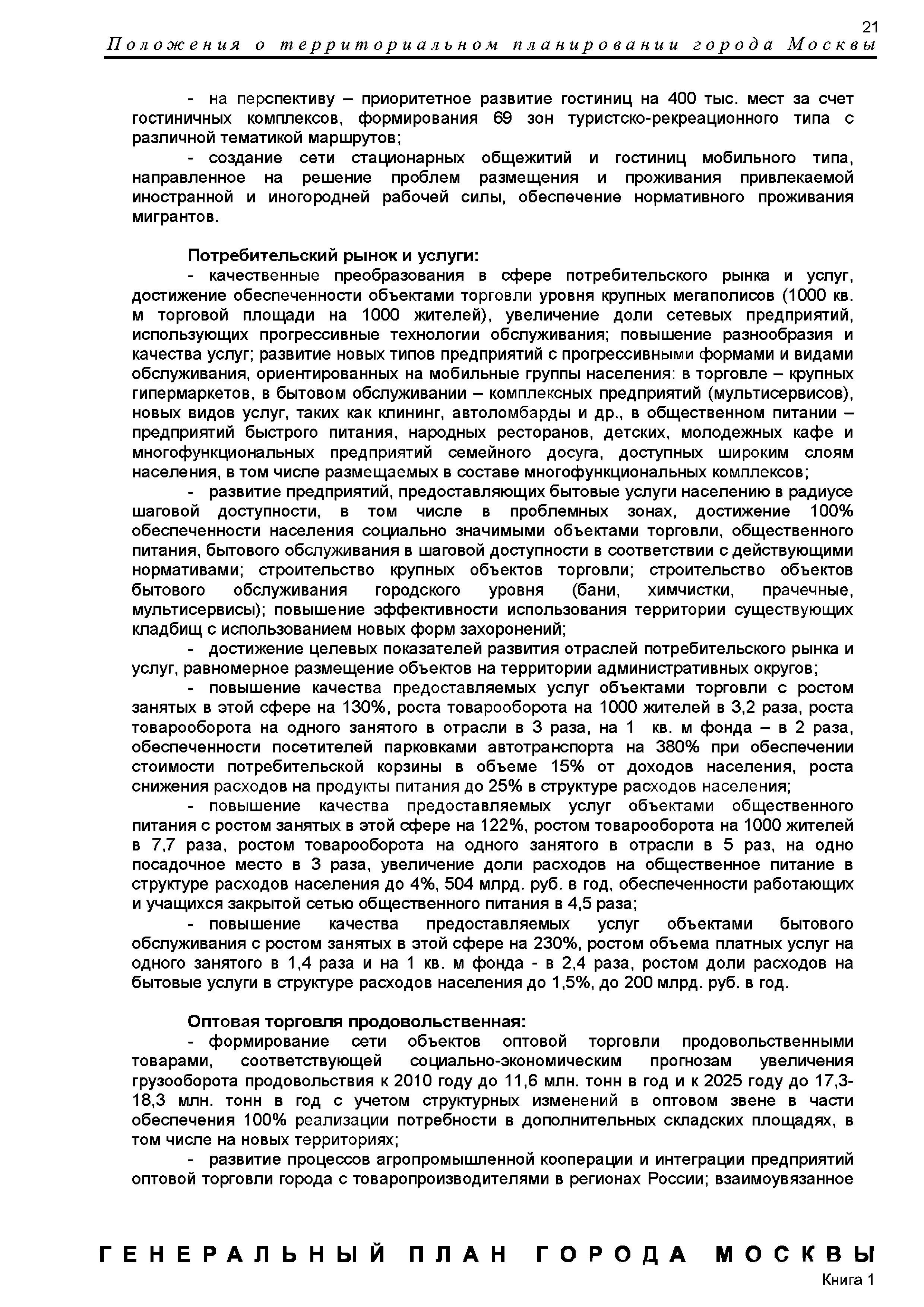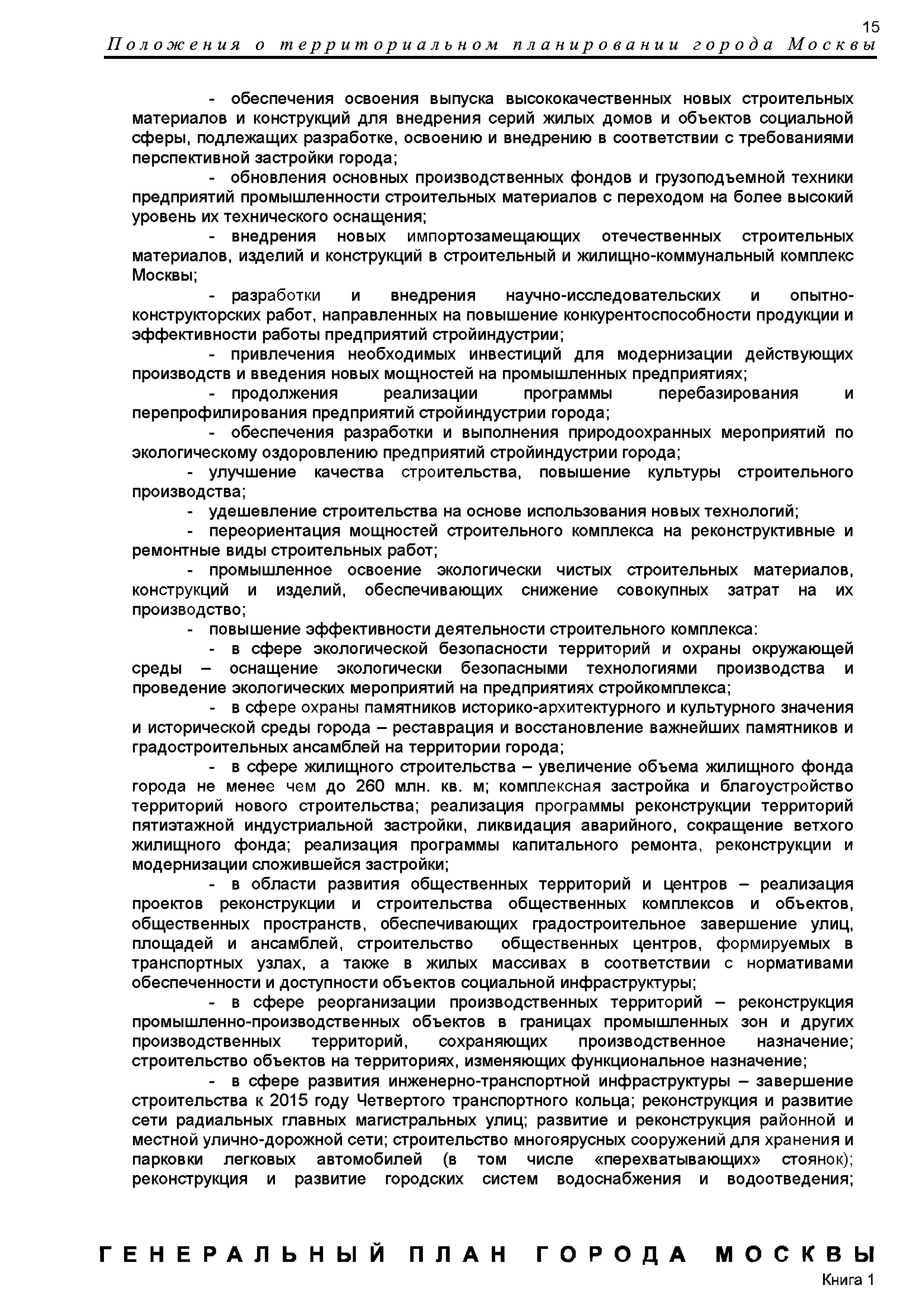| Оглавление: | Содержание Часть 1. Социально-экономические предпосылки развития города Москвы 1. Общие положения 1.1. Цели и задачи социально-экономического развития города Москвы 1.2. Повышение качества жизни и уровня воспроизводства населения 1.3. Устойчивое и сбалансированное развитие отраслей экономики города Москвы и рост валового регионального продукта 1.4. Повышение эффективности использования накопленного потенциала и ресурсов города 1.5. Мероприятия социально-экономического развития города Москвы Часть 2. Территориальное планирование развития города Москвы 1. Цели территориального планирования пространственного развития города Москвы на период до 2025 года 2. Задачи территориального планирования пространственного развития города Москвы на период до 2025 года, направленные на обеспечение общественных интересов, социальных гарантий, последовательное повышение качества городской среды и устойчивости развития города 3. Основные группы мероприятий территориального планирования города Москвы 3.1. Мероприятия в области планировочной организации и функционального зонирования территории 3.2. Инженерно-технические мероприятия по охране окружающей среды и защите населения и территории от опасных воздействий природного и техногенного характера 3.3. Мероприятия по сохранению, восстановлению объектов культурного наследия и реабилитации исторической среды 3.4. Мероприятия по сохранению и реабилитации особо охраняемых природных территорий 3.5. Мероприятия по размещению и строительству, реконструкции, реновации, капитальному ремонту объектов капитального строительства жилищного, общественного, административного, делового, производственного назначения 3.6. Мероприятия по развитию, размещению и строительству, реконструкции систем и объектов транспортной инфраструктуры и совершенствованию их функционирования 3.7. Мероприятия по развитию, размещению и строительству, реконструкции систем и объектов инженерной инфраструктуры и совершенствованию их функционирования 3.8. Мероприятия по развитию, размещению и строительству, реконструкции социально значимых объектов социальной инфраструктуры 3.9. Мероприятия в области ландшафтного и садово-паркового строительства, комплексного благоустройства и художественного оформления территории 4. Показатели территориального планирования развития города Москвы 4.1. Основные показатели развития особо охраняемых природных территорий, природных и озелененных территорий, охраны окружающей среды и защиты населения и территорий от опасных воздействий 4.2. Основные показатели развития социальной инфраструктуры 4.3. Основные показатели в области жилищного строительства 4.4. Основные показатели развития транспортной инфраструктуры 4.5. Основные показатели развития инженерной инфраструктуры Часть 3. Обеспечение совместных интересов субъектов Российской Федерации - города федерального значения Москвы и Московской области в сфере территориального планирования 1. Цели и задачи территориального планирования в части обеспечения совместных интересов города Москвы и Московской области 2. Мероприятия территориального планирования в части обеспечения совместных интересов города Москвы и Московской области 2.1. Формирование эффективной системы расселения города Москвы и Московской области 2