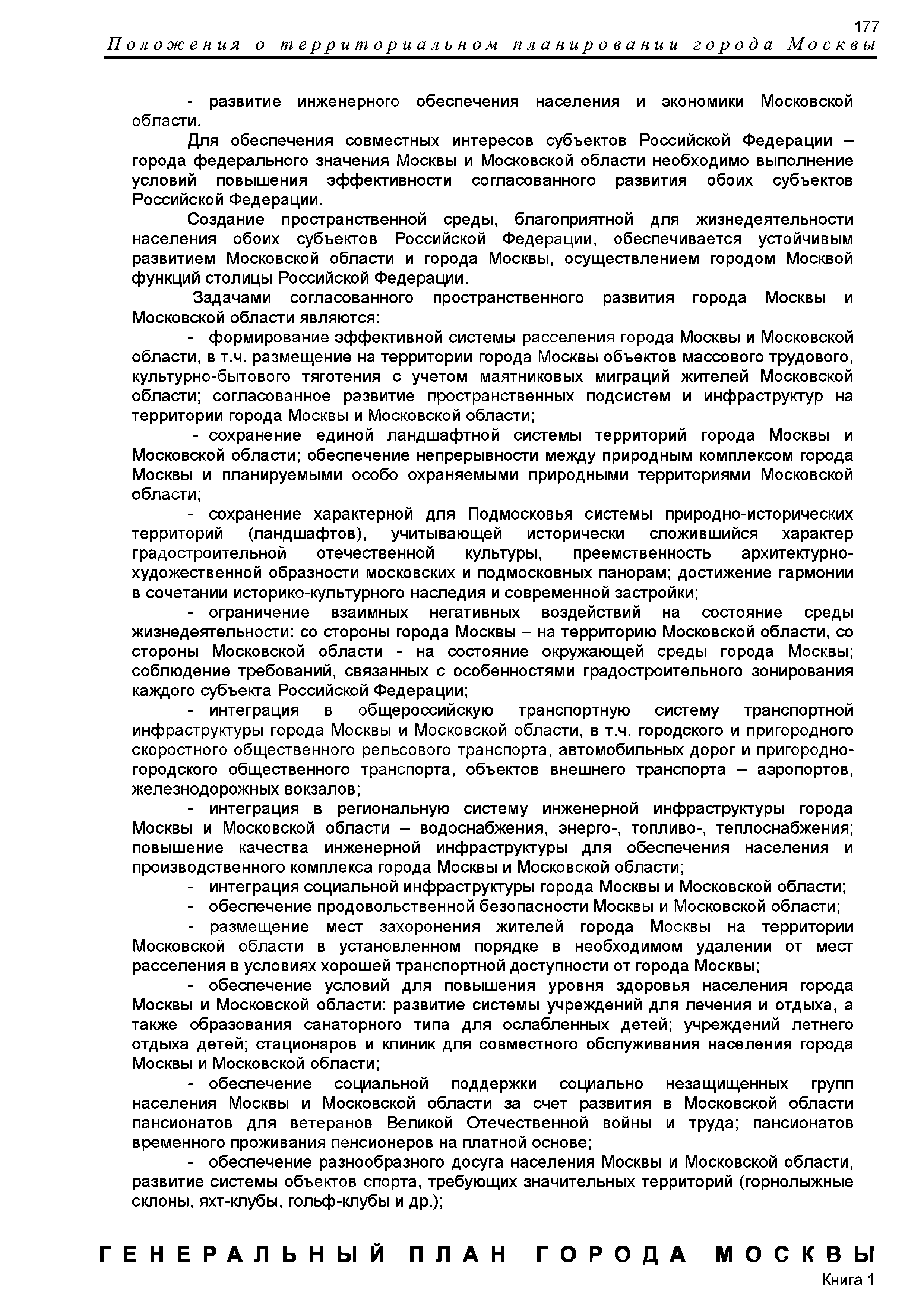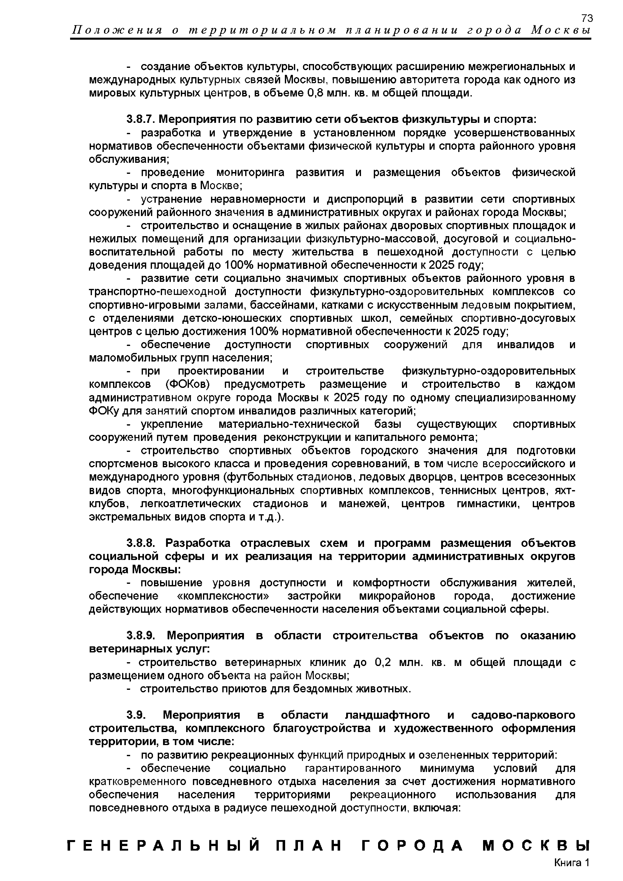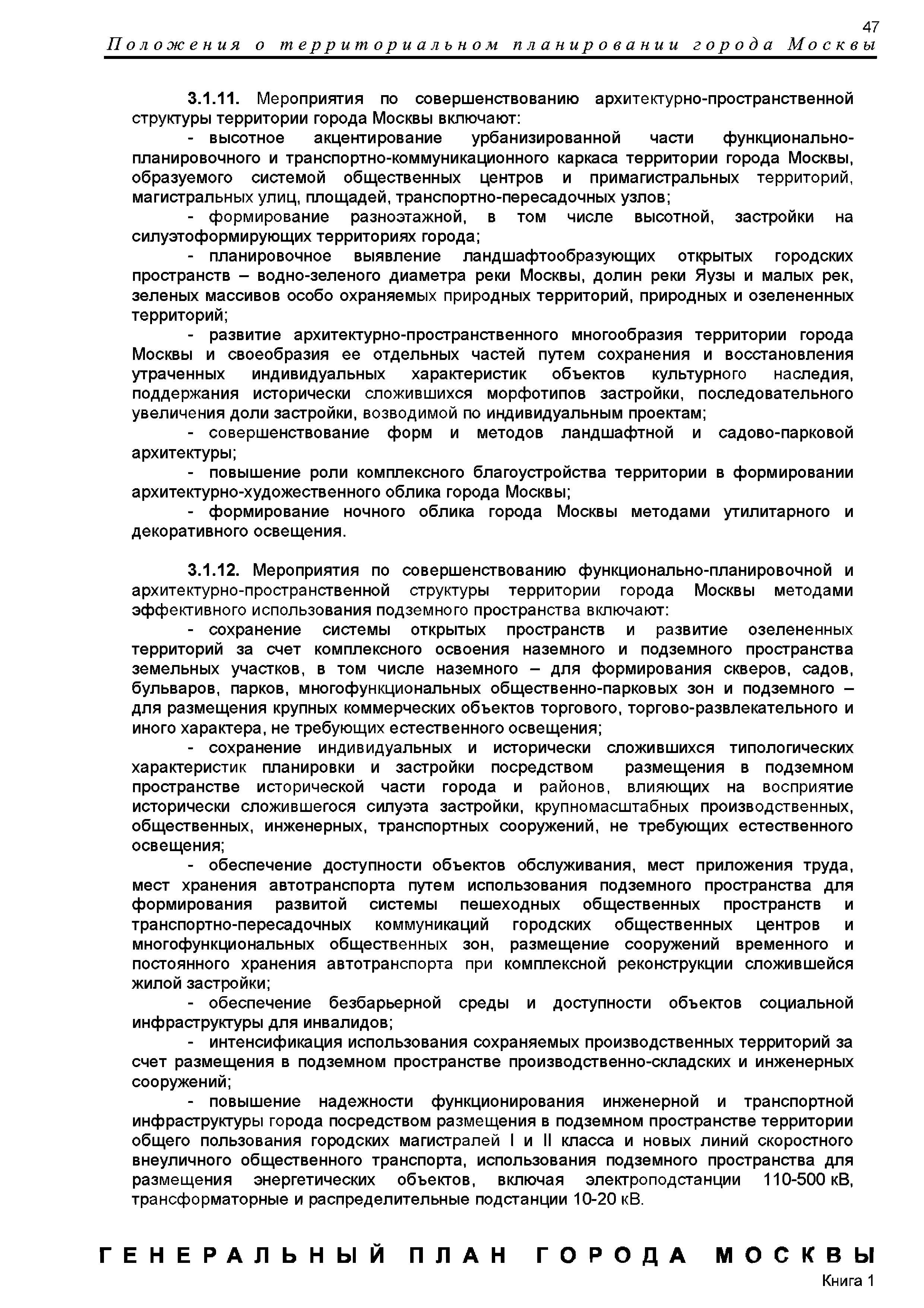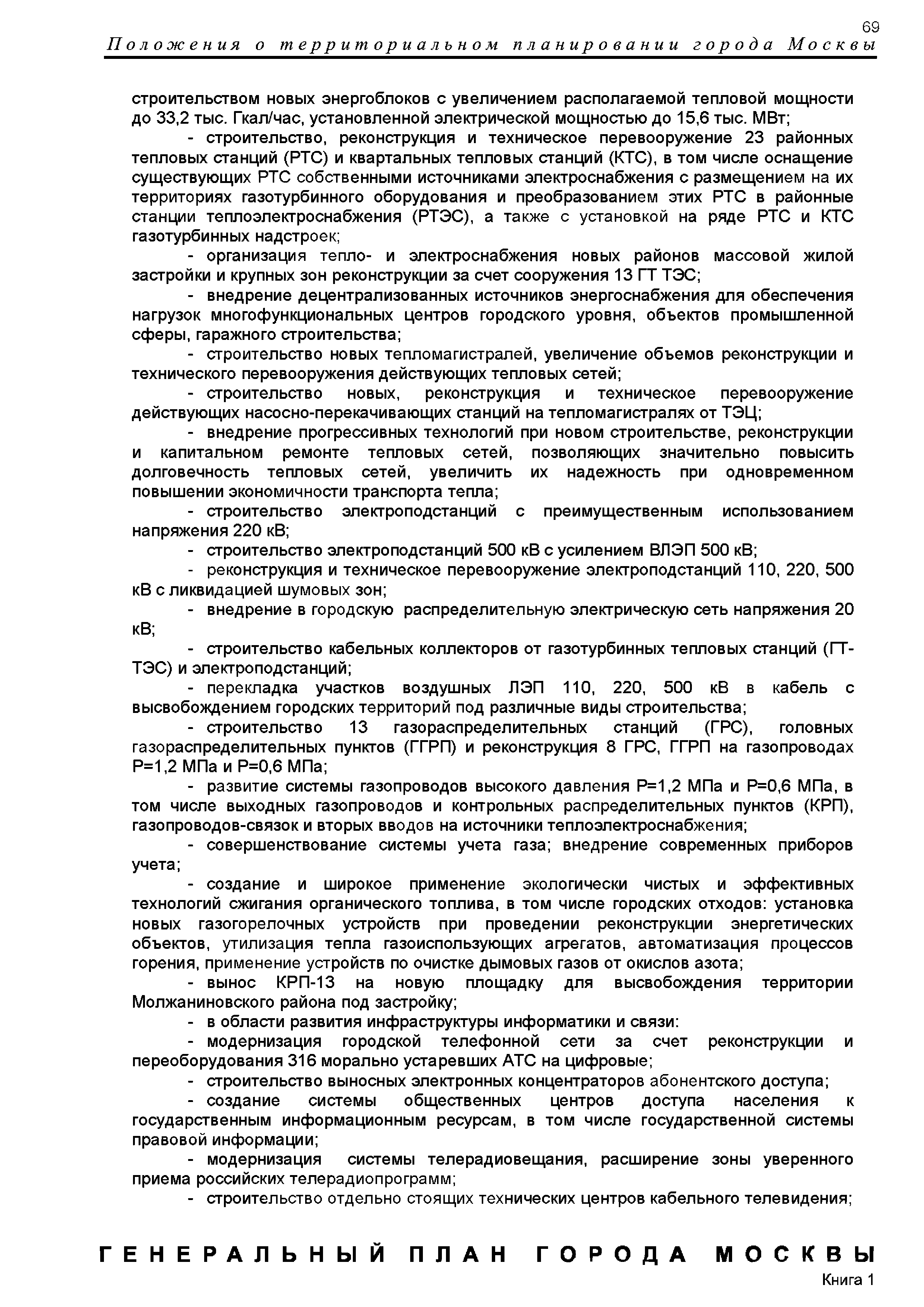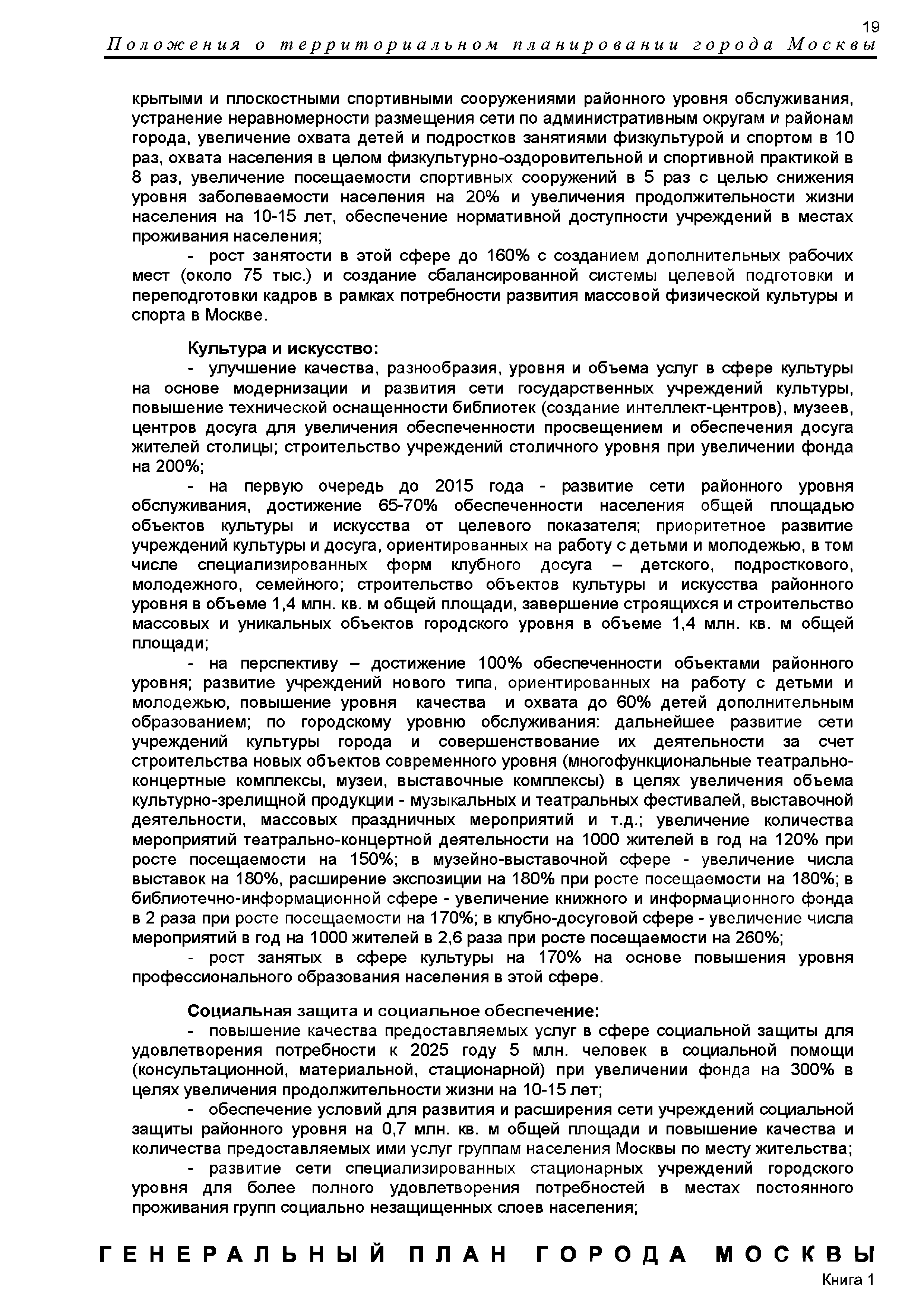 | Оглавление: | Содержание Часть 1. Социально-экономические предпосылки развития города Москвы 1. Общие положения 1.1. Цели и задачи социально-экономического развития города Москвы 1.2. Повышение качества жизни и уровня воспроизводства населения 1.3. Устойчивое и сбалансированное развитие отраслей экономики города Москвы и рост валового регионального продукта 1.4. Повышение эффективности использования накопленного потенциала и ресурсов города 1.5. Мероприятия социально-экономического развития города Москвы Часть 2. Территориальное планирование развития города Москвы 1. Цели территориального планирования пространственного развития города Москвы на период до 2025 года 2. Задачи территориального планирования пространственного развития города Москвы на период до 2025 года, направленные на обеспечение общественных интересов, социальных гарантий, последовательное повышение качества городской среды и устойчивости развития города 3. Основные группы мероприятий территориального планирования города Москвы 3.1. Мероприятия в области планировочной организации и функционального зонирования территории 3.2. Инженерно-технические мероприятия по охране окружающей среды и защите населения и территории от опасных воздействий природного и техногенного характера 3.3. Мероприятия по сохранению, восстановлению объектов культурного наследия и реабилитации исторической среды 3.4. Мероприятия по сохранению и реабилитации особо охраняемых природных территорий 3.5. Мероприятия по размещению и строительству, реконструкции, реновации, капитальному ремонту объектов капитального строительства жилищного, общественного, административного, делового, производственного назначения 3.6. Мероприятия по развитию, размещению и строительству, реконструкции систем и объектов транспортной инфраструктуры и совершенствованию их функционирования 3.7. Мероприятия по развитию, размещению и строительству, реконструкции систем и объектов инженерной инфраструктуры и совершенствованию их функционирования 3.8. Мероприятия по развитию, размещению и строительству, реконструкции социально значимых объектов социальной инфраструктуры 3.9. Мероприятия в области ландшафтного и садово-паркового строительства, комплексного благоустройства и художественного оформления территории 4. Показатели территориального планирования развития города Москвы 4.1. Основные показатели развития особо охраняемых природных территорий, природных и озелененных территорий, охраны окружающей среды и защиты населения и территорий от опасных воздействий 4.2. Основные показатели развития социальной инфраструктуры 4.3. Основные показатели в области жилищного строительства 4.4. Основные показатели развития транспортной инфраструктуры 4.5. Основные показатели развития инженерной инфраструктуры Часть 3. Обеспечение совместных интересов субъектов Российской Федерации - города федерального значения Москвы и Московской области в сфере территориального планирования 1. Цели и задачи территориального планирования в части обеспечения совместных интересов города Москвы и Московской области 2. Мероприятия территориального планирования в части обеспечения совместных интересов города Москвы и Московской области 2.1. Формирование эффективной системы расселения города Москвы и Московской области 2