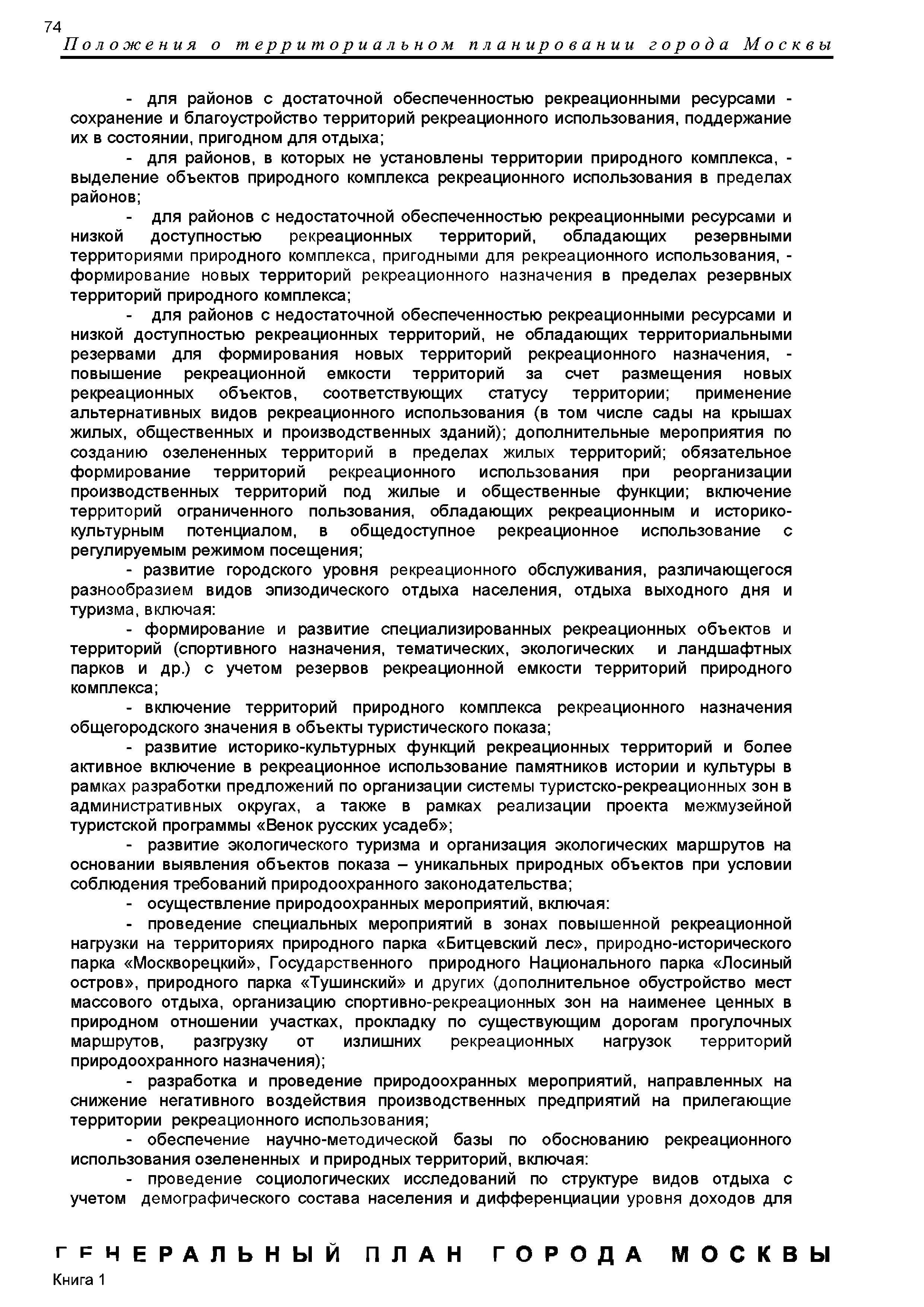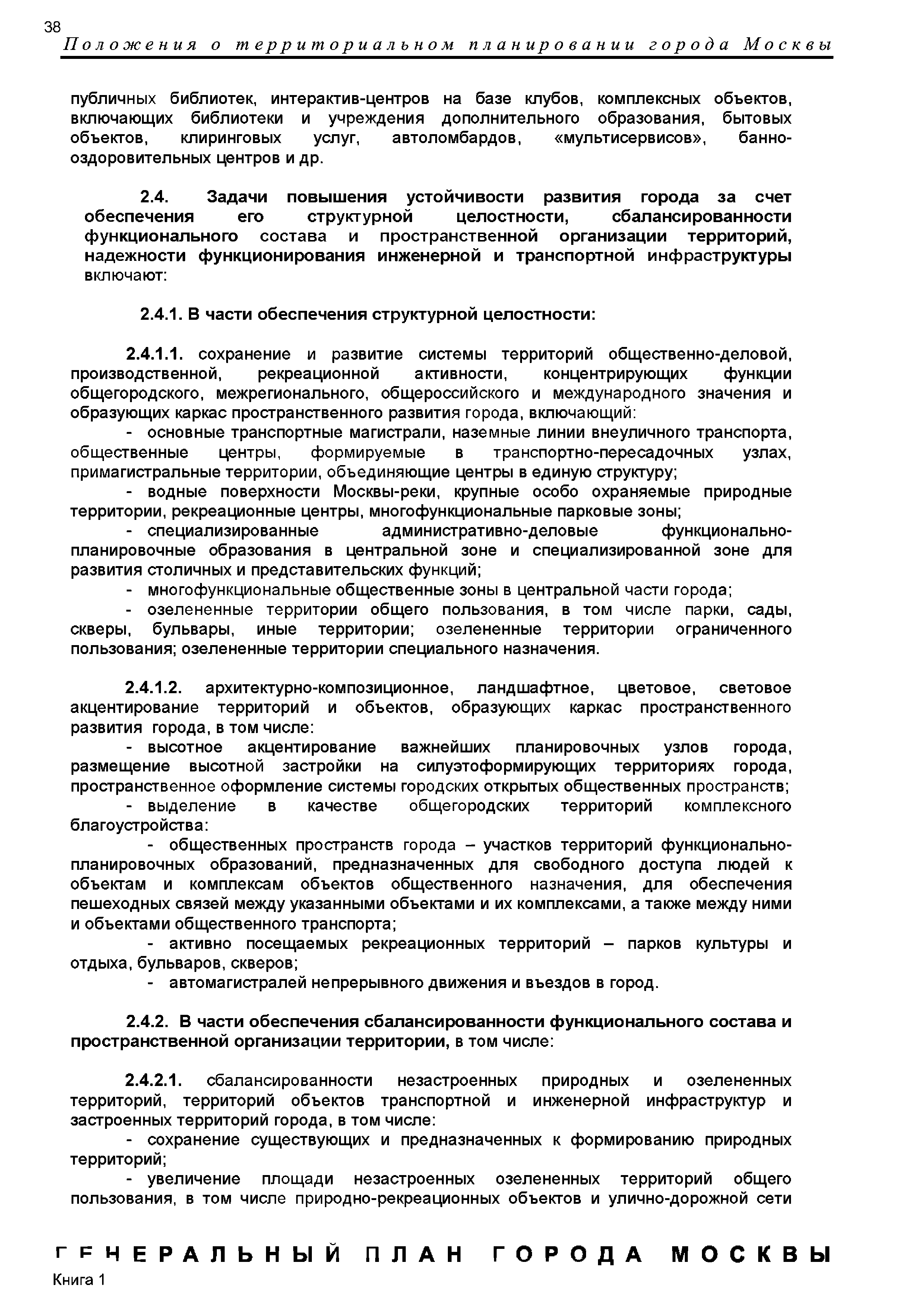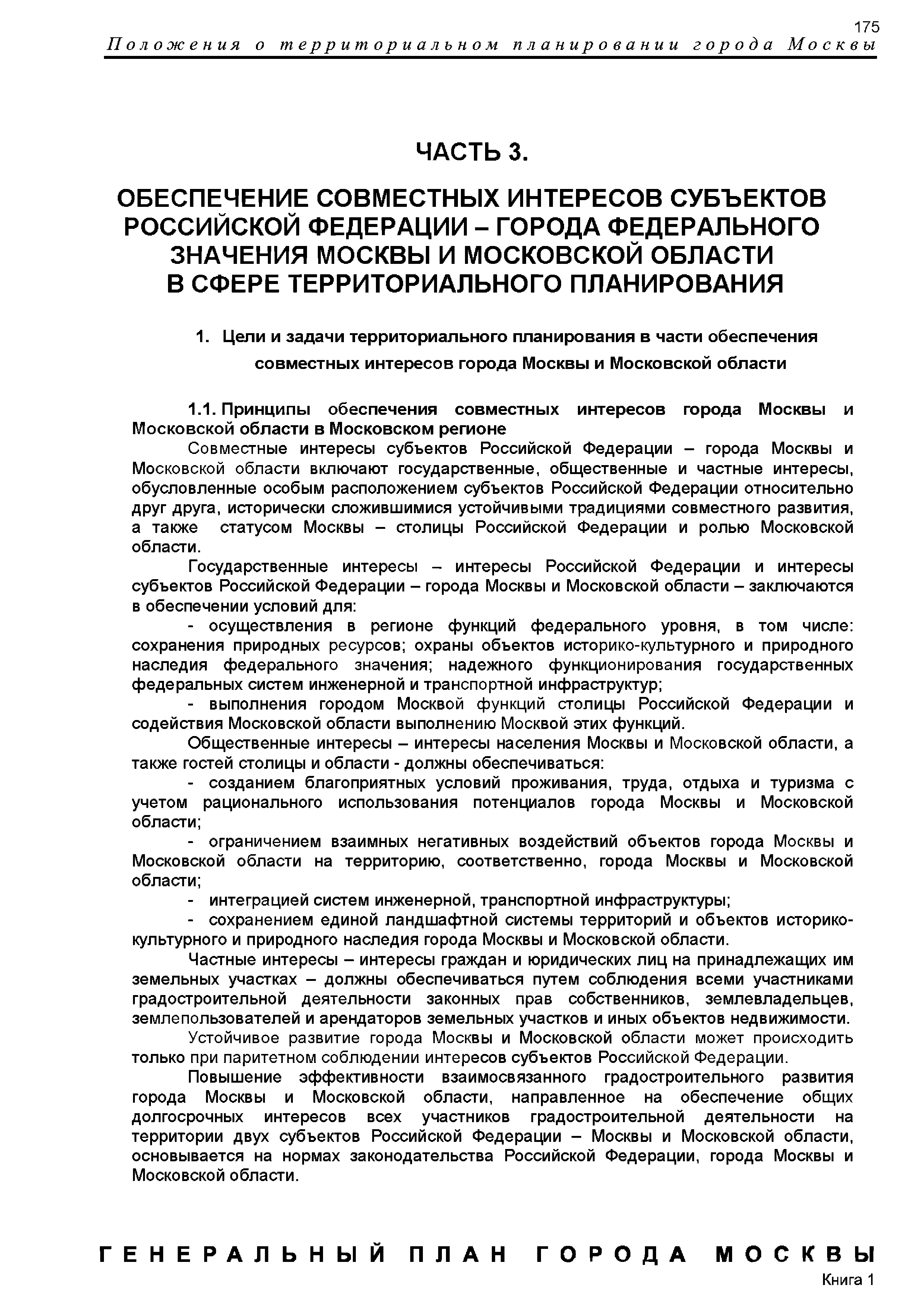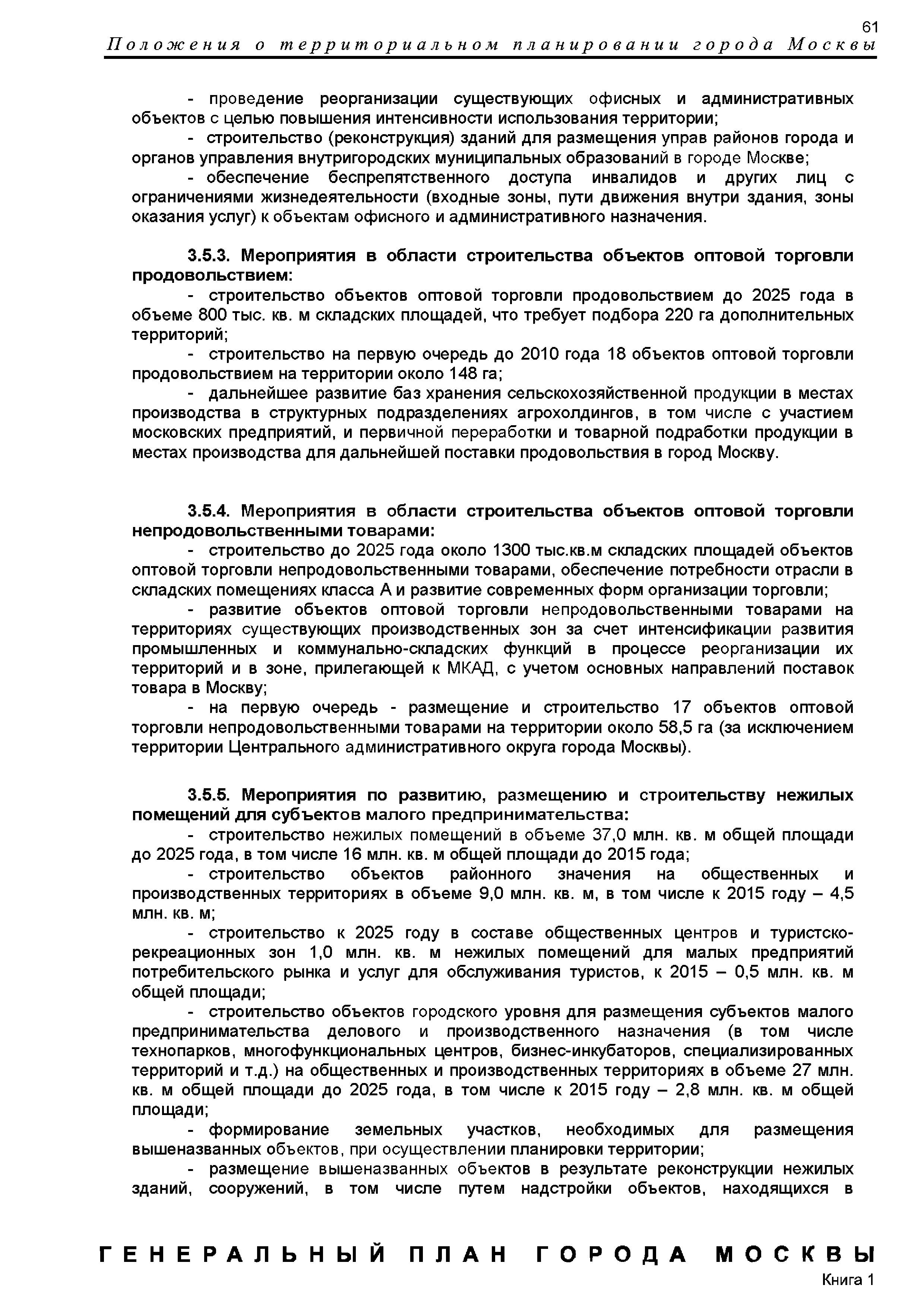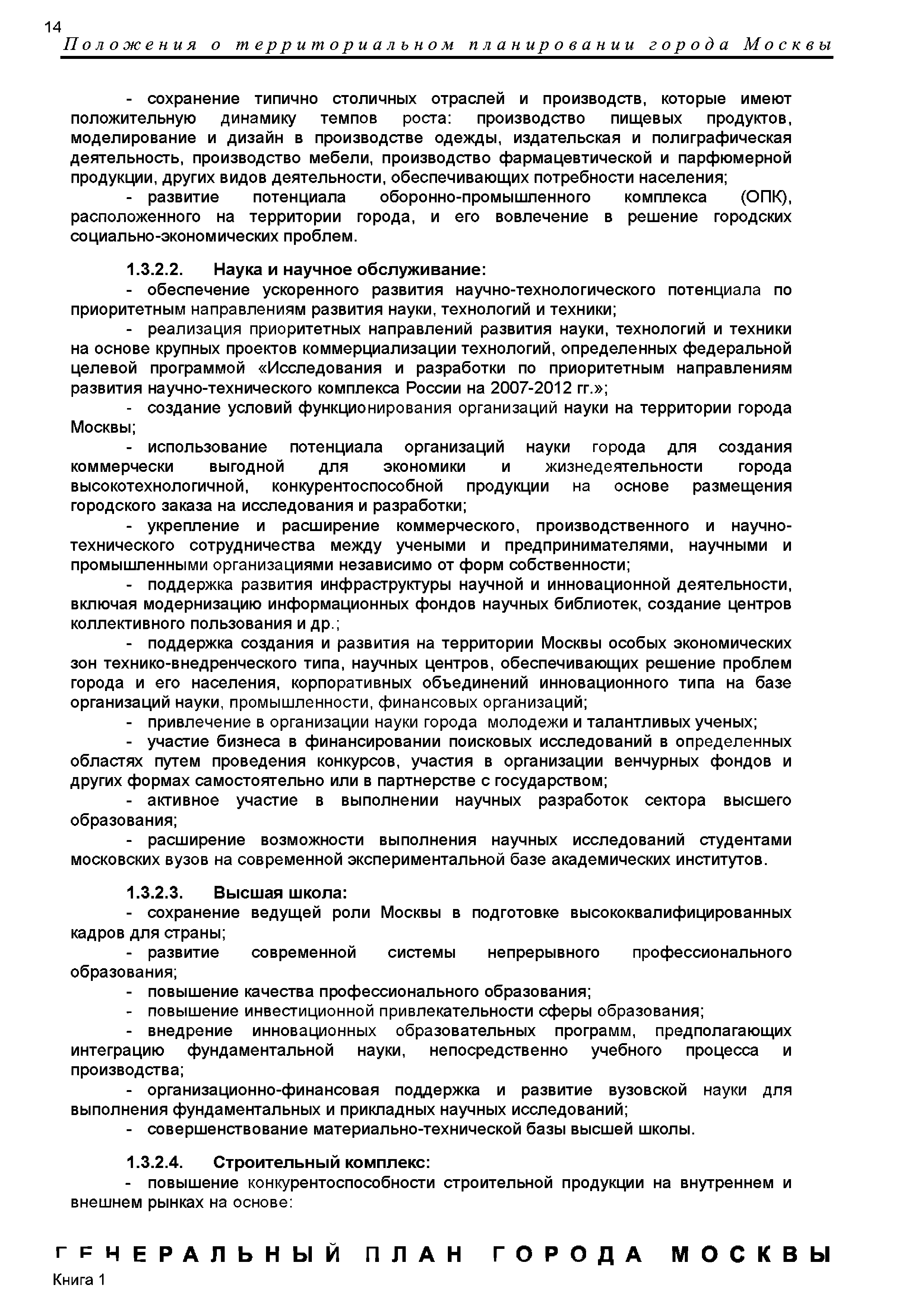 | Оглавление: | Содержание Часть 1. Социально-экономические предпосылки развития города Москвы 1. Общие положения 1.1. Цели и задачи социально-экономического развития города Москвы 1.2. Повышение качества жизни и уровня воспроизводства населения 1.3. Устойчивое и сбалансированное развитие отраслей экономики города Москвы и рост валового регионального продукта 1.4. Повышение эффективности использования накопленного потенциала и ресурсов города 1.5. Мероприятия социально-экономического развития города Москвы Часть 2. Территориальное планирование развития города Москвы 1. Цели территориального планирования пространственного развития города Москвы на период до 2025 года 2. Задачи территориального планирования пространственного развития города Москвы на период до 2025 года, направленные на обеспечение общественных интересов, социальных гарантий, последовательное повышение качества городской среды и устойчивости развития города 3. Основные группы мероприятий территориального планирования города Москвы 3.1. Мероприятия в области планировочной организации и функционального зонирования территории 3.2. Инженерно-технические мероприятия по охране окружающей среды и защите населения и территории от опасных воздействий природного и техногенного характера 3.3. Мероприятия по сохранению, восстановлению объектов культурного наследия и реабилитации исторической среды 3.4. Мероприятия по сохранению и реабилитации особо охраняемых природных территорий 3.5. Мероприятия по размещению и строительству, реконструкции, реновации, капитальному ремонту объектов капитального строительства жилищного, общественного, административного, делового, производственного назначения 3.6. Мероприятия по развитию, размещению и строительству, реконструкции систем и объектов транспортной инфраструктуры и совершенствованию их функционирования 3.7. Мероприятия по развитию, размещению и строительству, реконструкции систем и объектов инженерной инфраструктуры и совершенствованию их функционирования 3.8. Мероприятия по развитию, размещению и строительству, реконструкции социально значимых объектов социальной инфраструктуры 3.9. Мероприятия в области ландшафтного и садово-паркового строительства, комплексного благоустройства и художественного оформления территории 4. Показатели территориального планирования развития города Москвы 4.1. Основные показатели развития особо охраняемых природных территорий, природных и озелененных территорий, охраны окружающей среды и защиты населения и территорий от опасных воздействий 4.2. Основные показатели развития социальной инфраструктуры 4.3. Основные показатели в области жилищного строительства 4.4. Основные показатели развития транспортной инфраструктуры 4.5. Основные показатели развития инженерной инфраструктуры Часть 3. Обеспечение совместных интересов субъектов Российской Федерации - города федерального значения Москвы и Московской области в сфере территориального планирования 1. Цели и задачи территориального планирования в части обеспечения совместных интересов города Москвы и Московской области 2. Мероприятия территориального планирования в части обеспечения совместных интересов города Москвы и Московской области 2.1. Формирование эффективной системы расселения города Москвы и Московской области 2