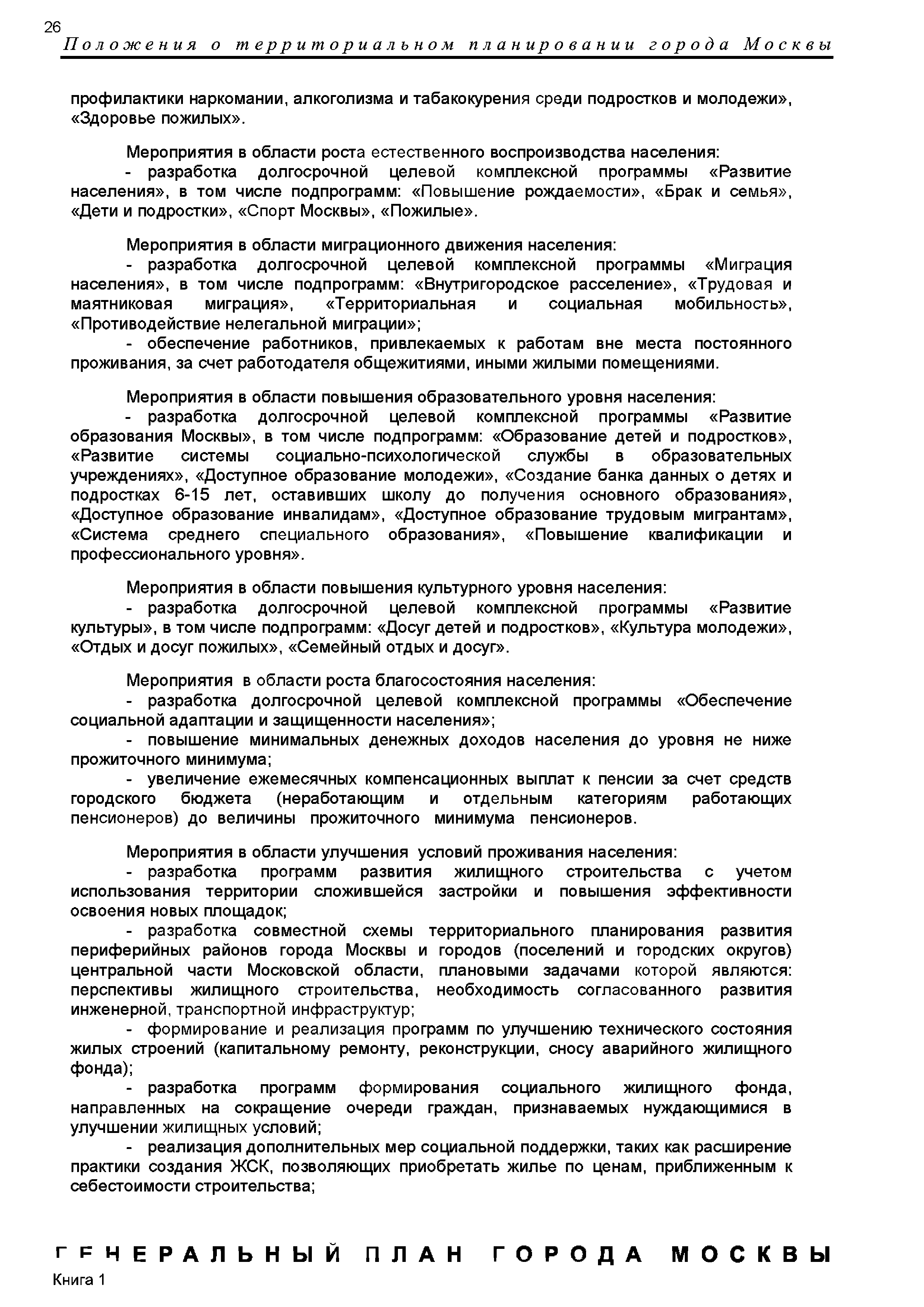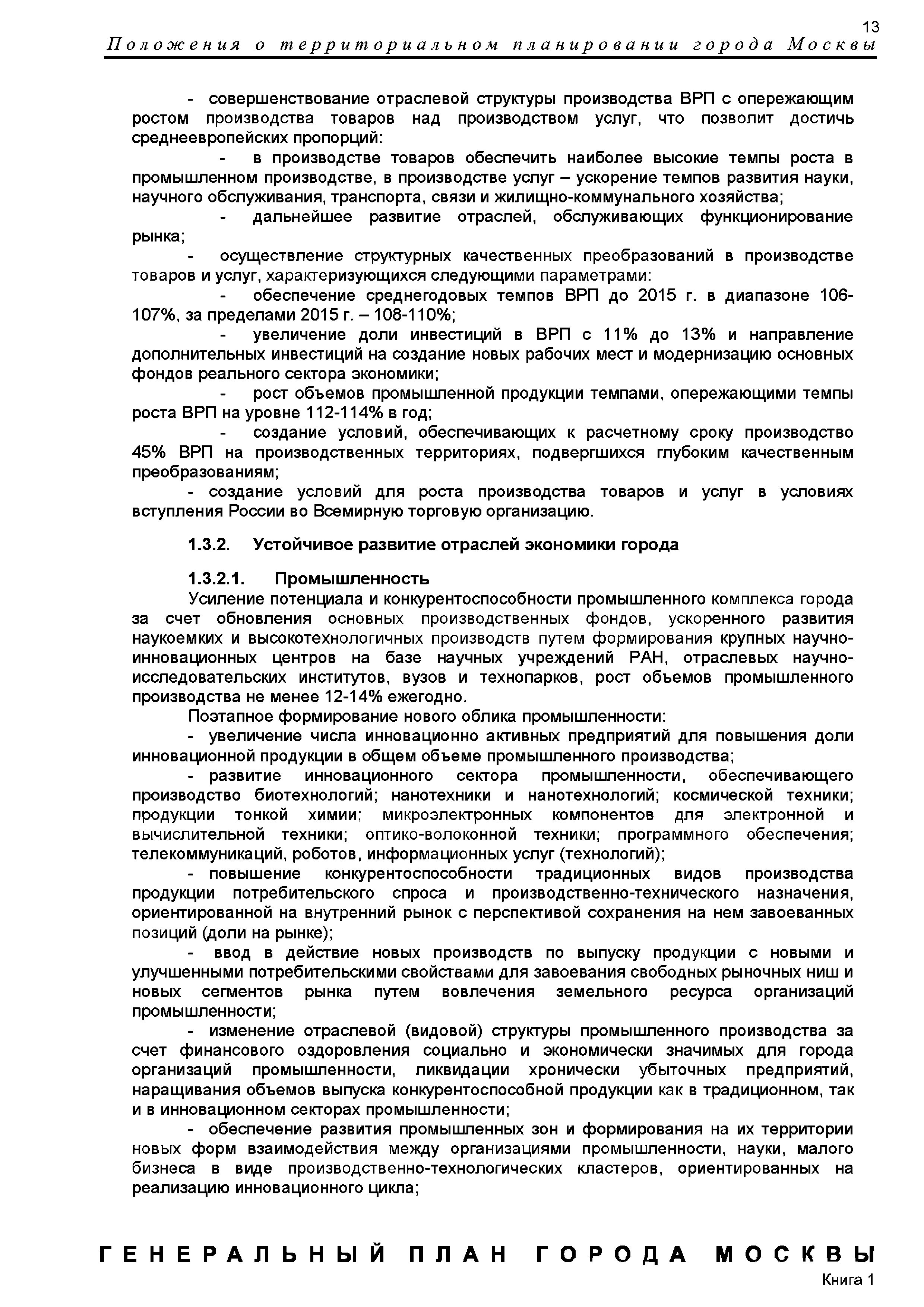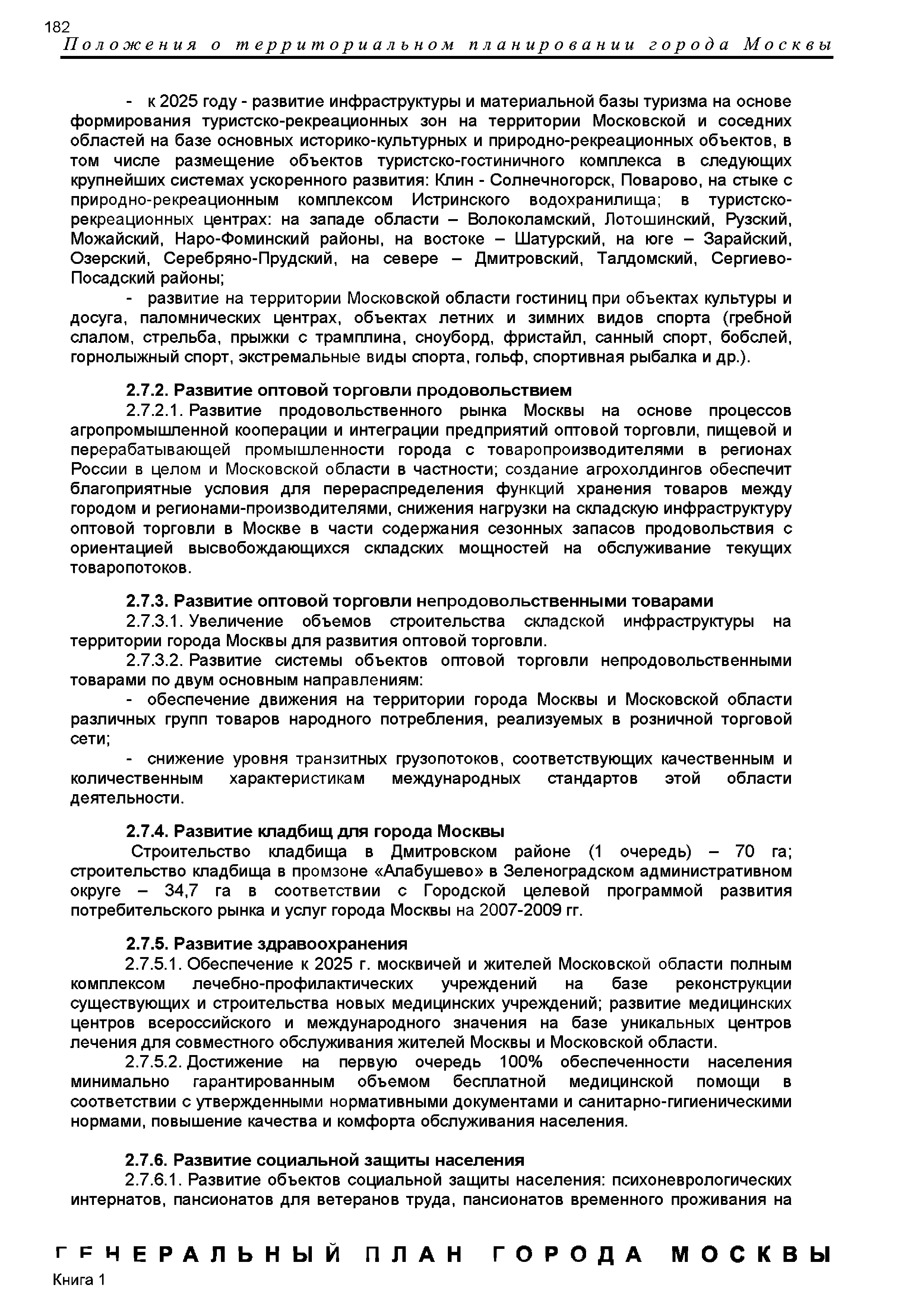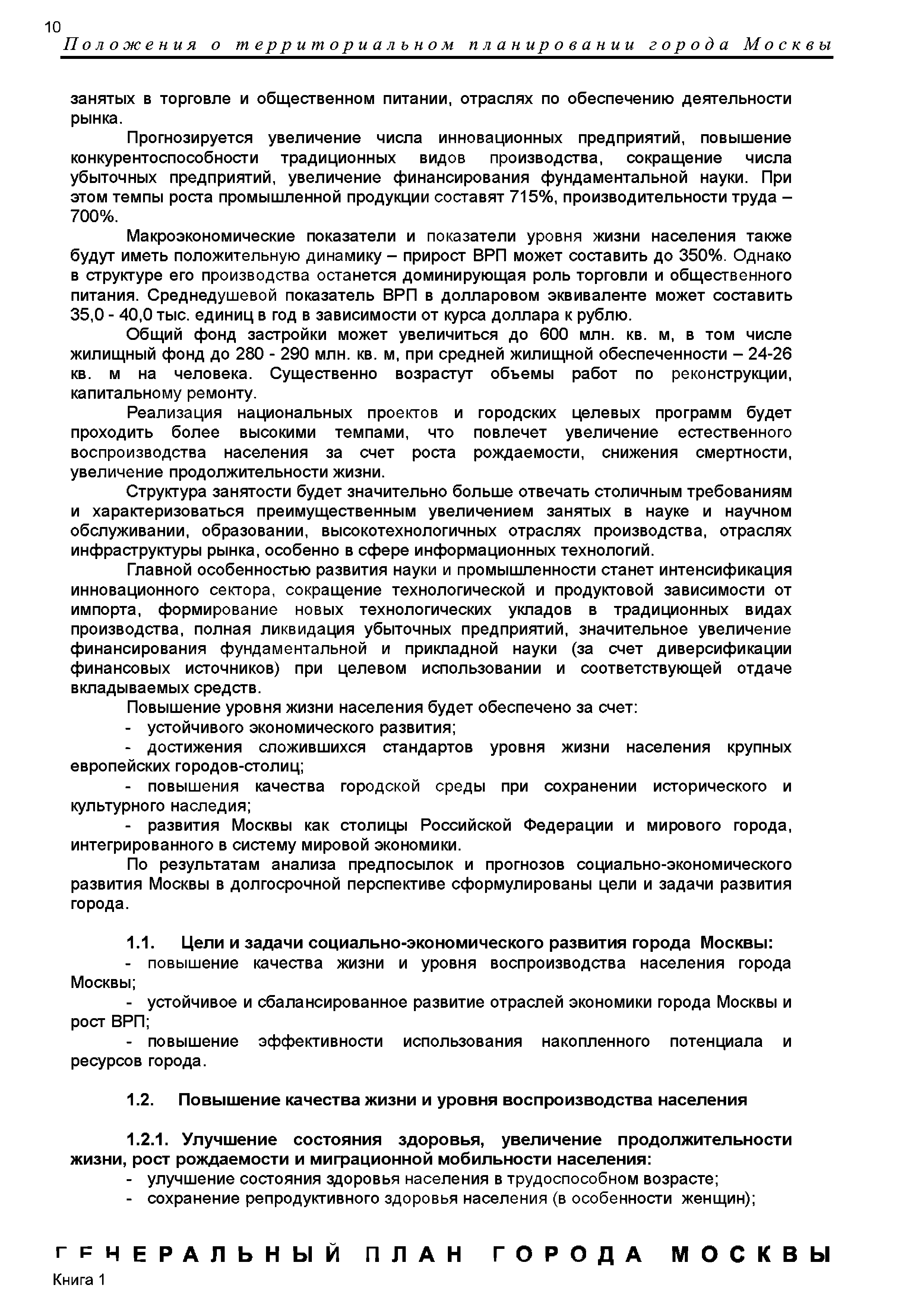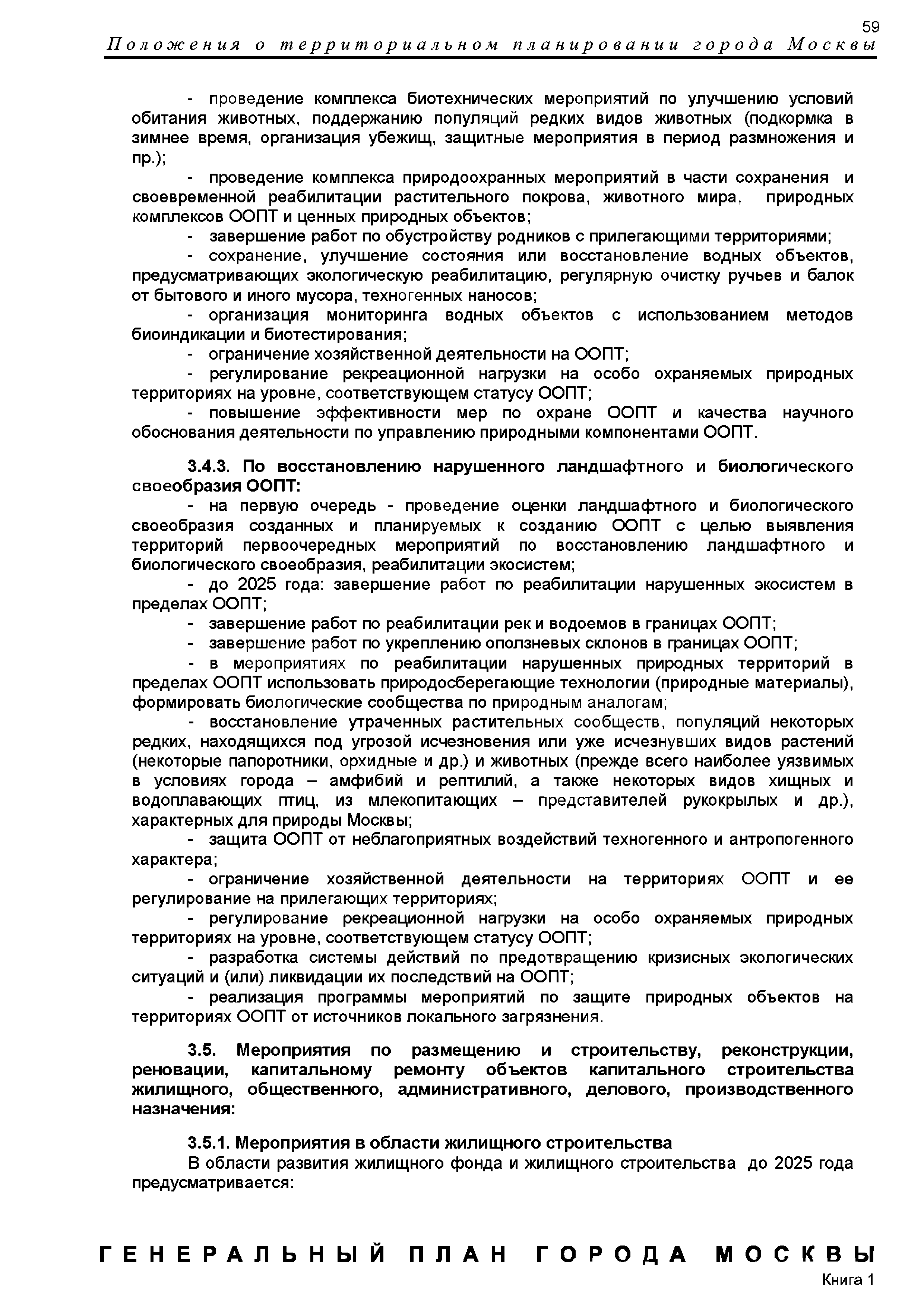 | Оглавление: | Содержание Часть 1. Социально-экономические предпосылки развития города Москвы 1. Общие положения 1.1. Цели и задачи социально-экономического развития города Москвы 1.2. Повышение качества жизни и уровня воспроизводства населения 1.3. Устойчивое и сбалансированное развитие отраслей экономики города Москвы и рост валового регионального продукта 1.4. Повышение эффективности использования накопленного потенциала и ресурсов города 1.5. Мероприятия социально-экономического развития города Москвы Часть 2. Территориальное планирование развития города Москвы 1. Цели территориального планирования пространственного развития города Москвы на период до 2025 года 2. Задачи территориального планирования пространственного развития города Москвы на период до 2025 года, направленные на обеспечение общественных интересов, социальных гарантий, последовательное повышение качества городской среды и устойчивости развития города 3. Основные группы мероприятий территориального планирования города Москвы 3.1. Мероприятия в области планировочной организации и функционального зонирования территории 3.2. Инженерно-технические мероприятия по охране окружающей среды и защите населения и территории от опасных воздействий природного и техногенного характера 3.3. Мероприятия по сохранению, восстановлению объектов культурного наследия и реабилитации исторической среды 3.4. Мероприятия по сохранению и реабилитации особо охраняемых природных территорий 3.5. Мероприятия по размещению и строительству, реконструкции, реновации, капитальному ремонту объектов капитального строительства жилищного, общественного, административного, делового, производственного назначения 3.6. Мероприятия по развитию, размещению и строительству, реконструкции систем и объектов транспортной инфраструктуры и совершенствованию их функционирования 3.7. Мероприятия по развитию, размещению и строительству, реконструкции систем и объектов инженерной инфраструктуры и совершенствованию их функционирования 3.8. Мероприятия по развитию, размещению и строительству, реконструкции социально значимых объектов социальной инфраструктуры 3.9. Мероприятия в области ландшафтного и садово-паркового строительства, комплексного благоустройства и художественного оформления территории 4. Показатели территориального планирования развития города Москвы 4.1. Основные показатели развития особо охраняемых природных территорий, природных и озелененных территорий, охраны окружающей среды и защиты населения и территорий от опасных воздействий 4.2. Основные показатели развития социальной инфраструктуры 4.3. Основные показатели в области жилищного строительства 4.4. Основные показатели развития транспортной инфраструктуры 4.5. Основные показатели развития инженерной инфраструктуры Часть 3. Обеспечение совместных интересов субъектов Российской Федерации - города федерального значения Москвы и Московской области в сфере территориального планирования 1. Цели и задачи территориального планирования в части обеспечения совместных интересов города Москвы и Московской области 2. Мероприятия территориального планирования в части обеспечения совместных интересов города Москвы и Московской области 2.1. Формирование эффективной системы расселения города Москвы и Московской области 2