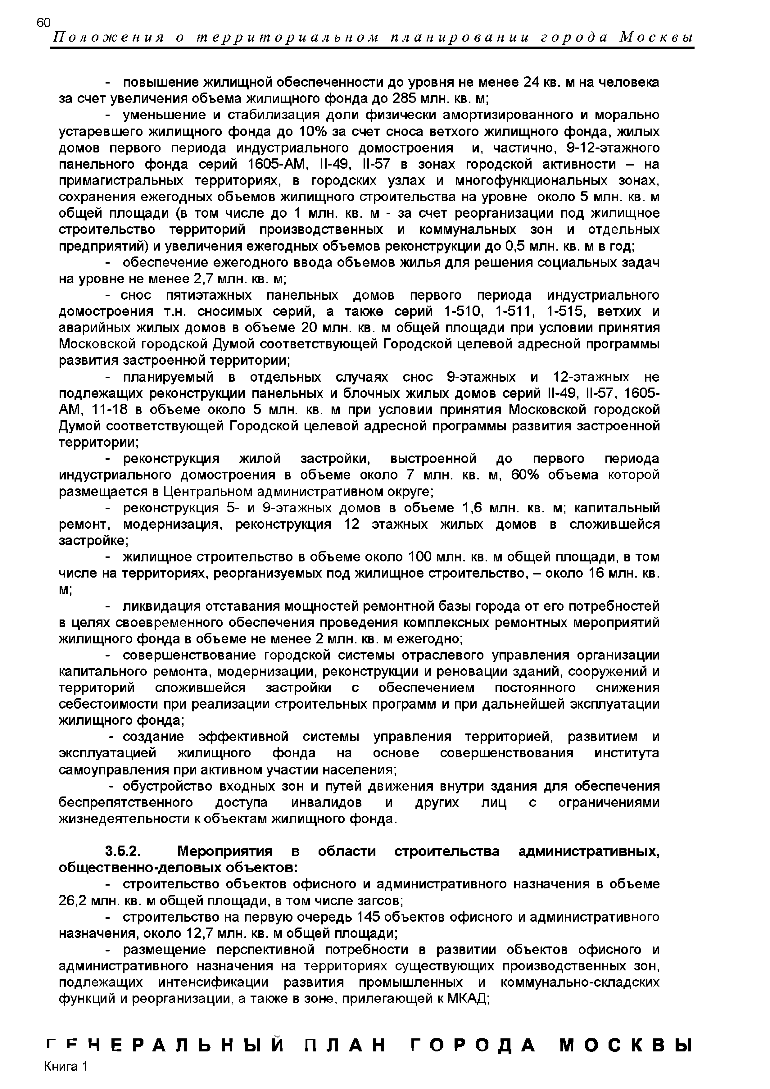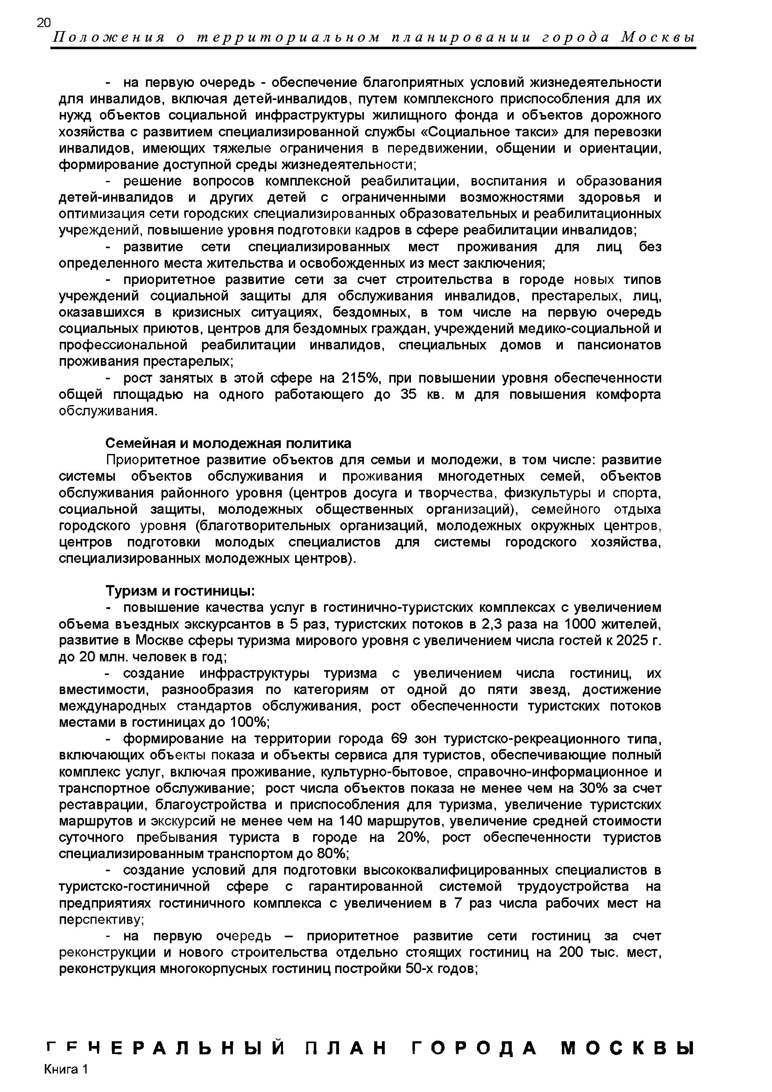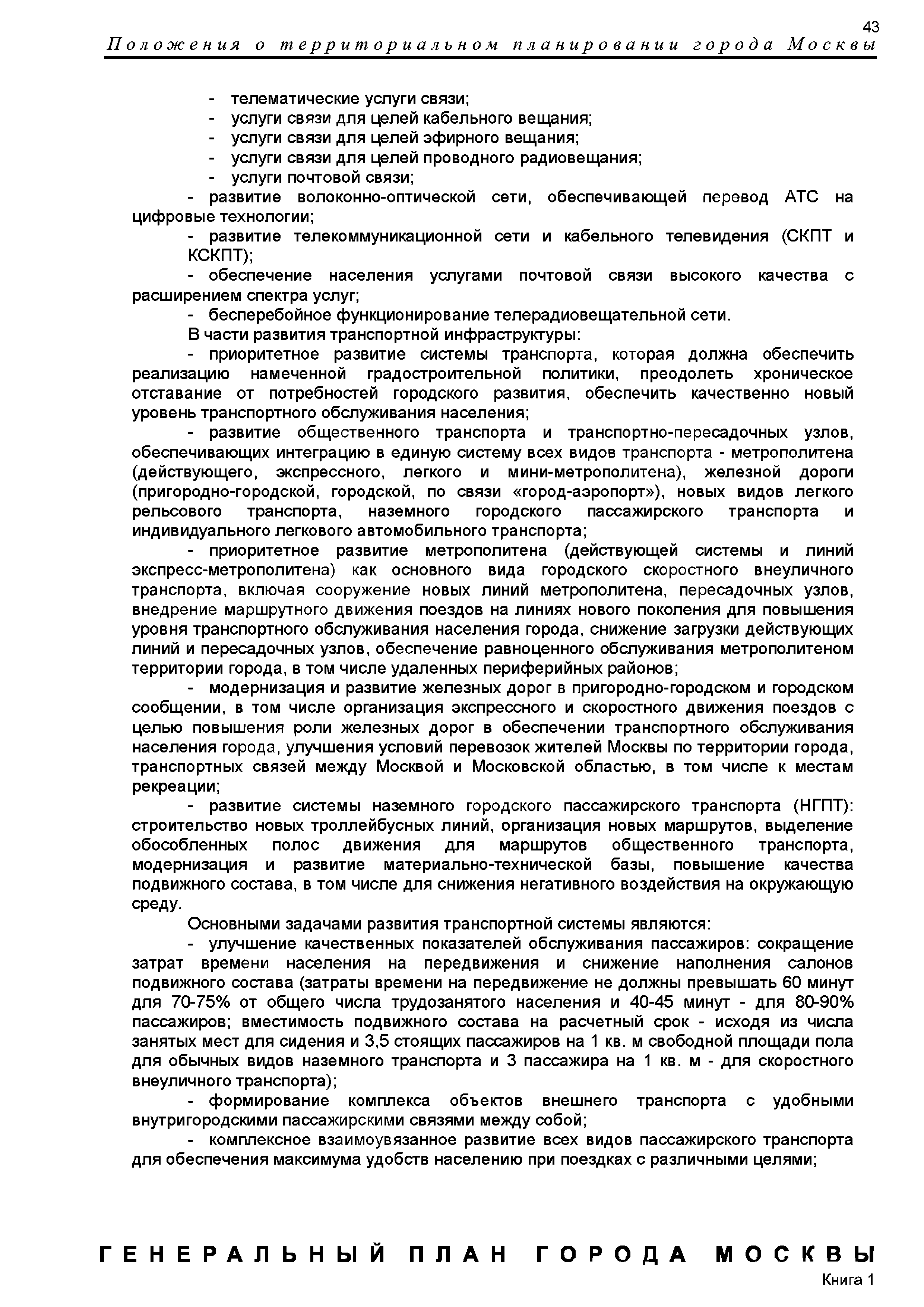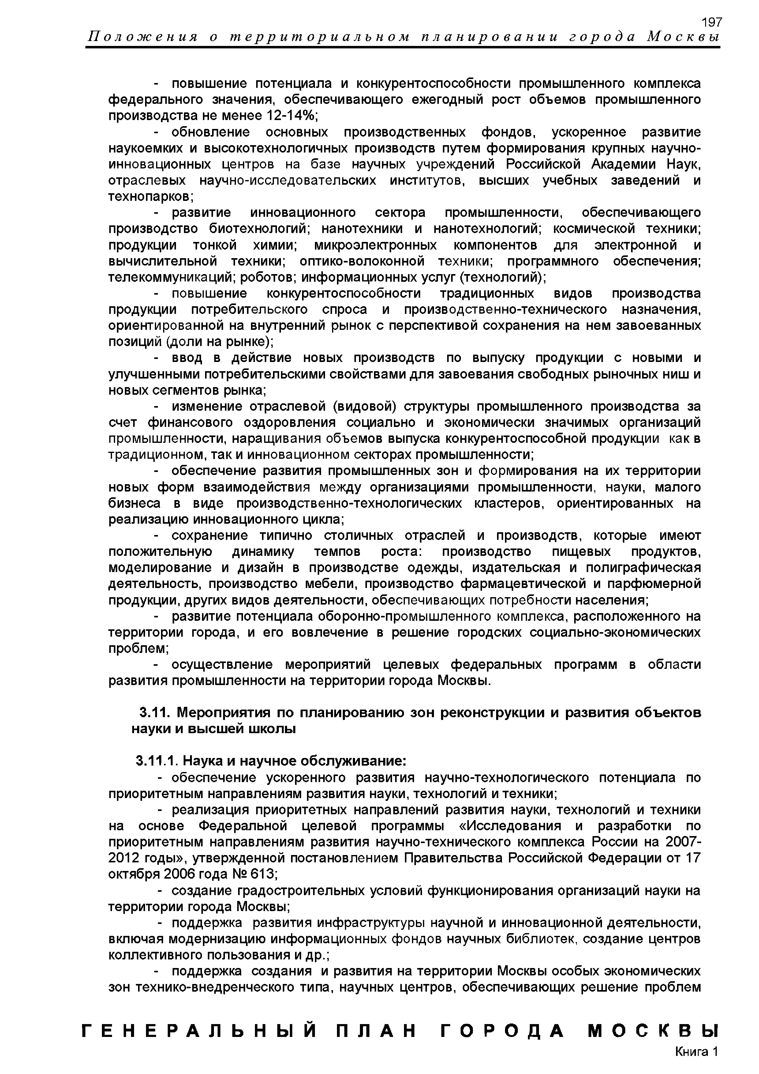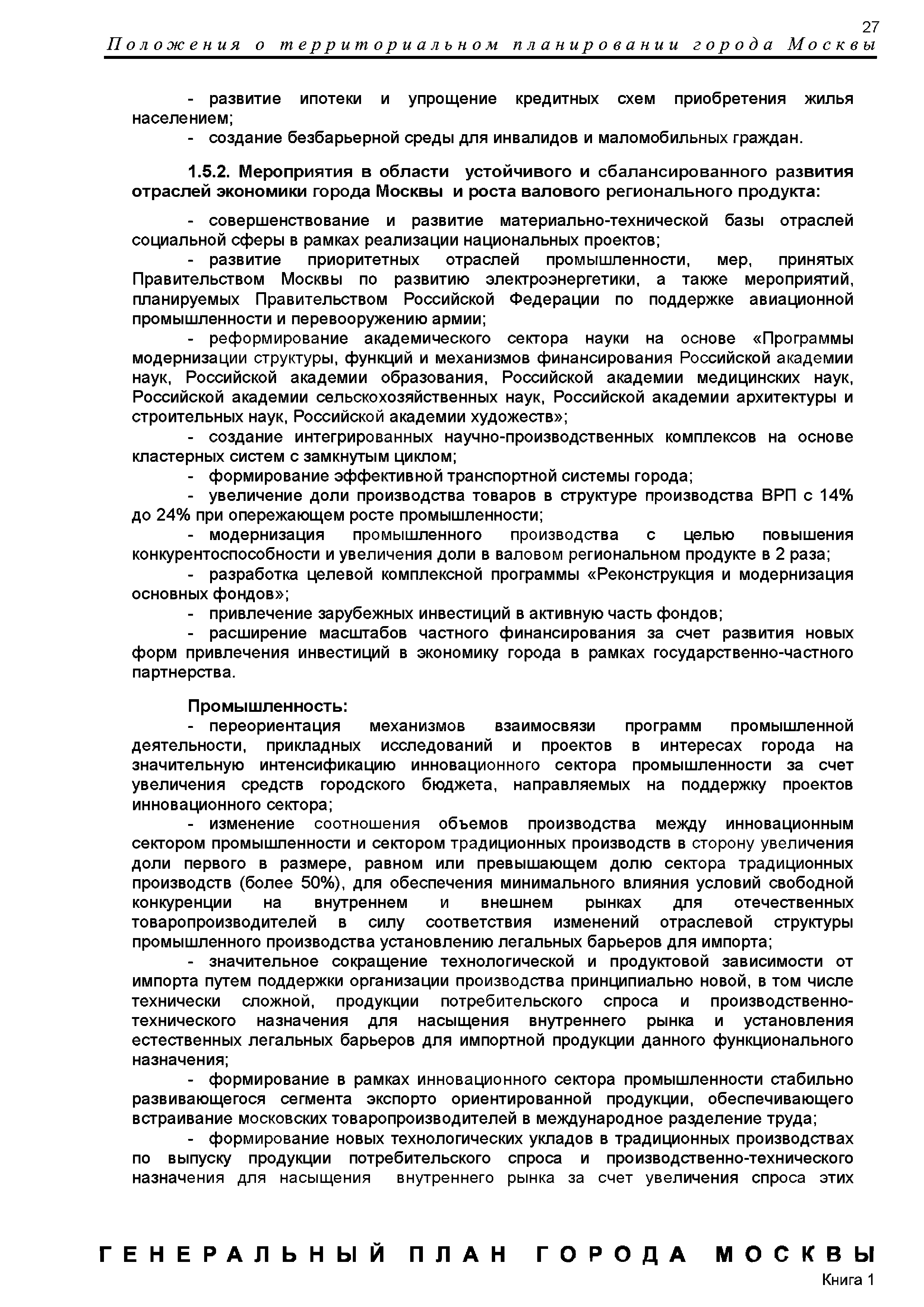 | Оглавление: | Содержание Часть 1. Социально-экономические предпосылки развития города Москвы 1. Общие положения 1.1. Цели и задачи социально-экономического развития города Москвы 1.2. Повышение качества жизни и уровня воспроизводства населения 1.3. Устойчивое и сбалансированное развитие отраслей экономики города Москвы и рост валового регионального продукта 1.4. Повышение эффективности использования накопленного потенциала и ресурсов города 1.5. Мероприятия социально-экономического развития города Москвы Часть 2. Территориальное планирование развития города Москвы 1. Цели территориального планирования пространственного развития города Москвы на период до 2025 года 2. Задачи территориального планирования пространственного развития города Москвы на период до 2025 года, направленные на обеспечение общественных интересов, социальных гарантий, последовательное повышение качества городской среды и устойчивости развития города 3. Основные группы мероприятий территориального планирования города Москвы 3.1. Мероприятия в области планировочной организации и функционального зонирования территории 3.2. Инженерно-технические мероприятия по охране окружающей среды и защите населения и территории от опасных воздействий природного и техногенного характера 3.3. Мероприятия по сохранению, восстановлению объектов культурного наследия и реабилитации исторической среды 3.4. Мероприятия по сохранению и реабилитации особо охраняемых природных территорий 3.5. Мероприятия по размещению и строительству, реконструкции, реновации, капитальному ремонту объектов капитального строительства жилищного, общественного, административного, делового, производственного назначения 3.6. Мероприятия по развитию, размещению и строительству, реконструкции систем и объектов транспортной инфраструктуры и совершенствованию их функционирования 3.7. Мероприятия по развитию, размещению и строительству, реконструкции систем и объектов инженерной инфраструктуры и совершенствованию их функционирования 3.8. Мероприятия по развитию, размещению и строительству, реконструкции социально значимых объектов социальной инфраструктуры 3.9. Мероприятия в области ландшафтного и садово-паркового строительства, комплексного благоустройства и художественного оформления территории 4. Показатели территориального планирования развития города Москвы 4.1. Основные показатели развития особо охраняемых природных территорий, природных и озелененных территорий, охраны окружающей среды и защиты населения и территорий от опасных воздействий 4.2. Основные показатели развития социальной инфраструктуры 4.3. Основные показатели в области жилищного строительства 4.4. Основные показатели развития транспортной инфраструктуры 4.5. Основные показатели развития инженерной инфраструктуры Часть 3. Обеспечение совместных интересов субъектов Российской Федерации - города федерального значения Москвы и Московской области в сфере территориального планирования 1. Цели и задачи территориального планирования в части обеспечения совместных интересов города Москвы и Московской области 2. Мероприятия территориального планирования в части обеспечения совместных интересов города Москвы и Московской области 2.1. Формирование эффективной системы расселения города Москвы и Московской области 2