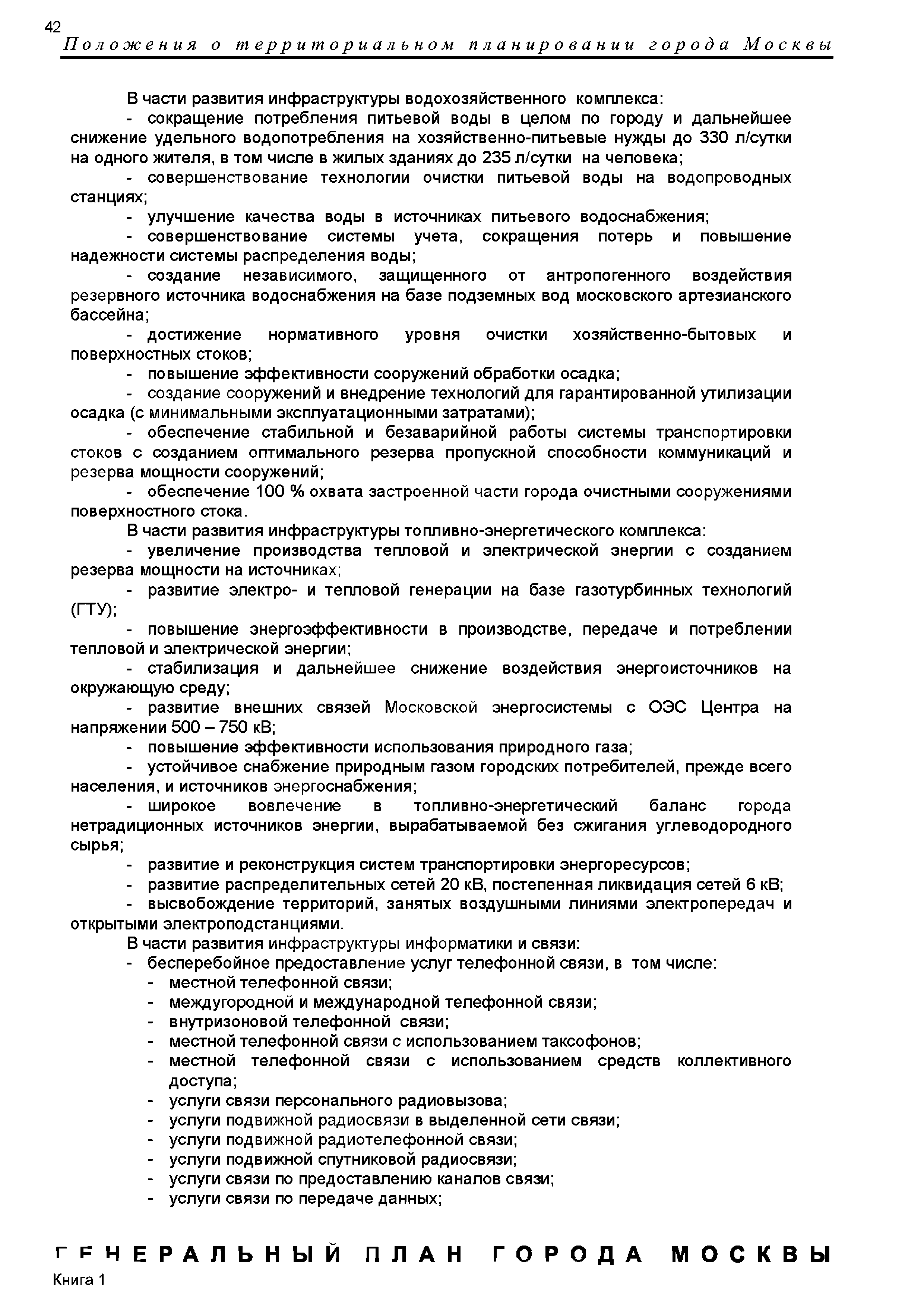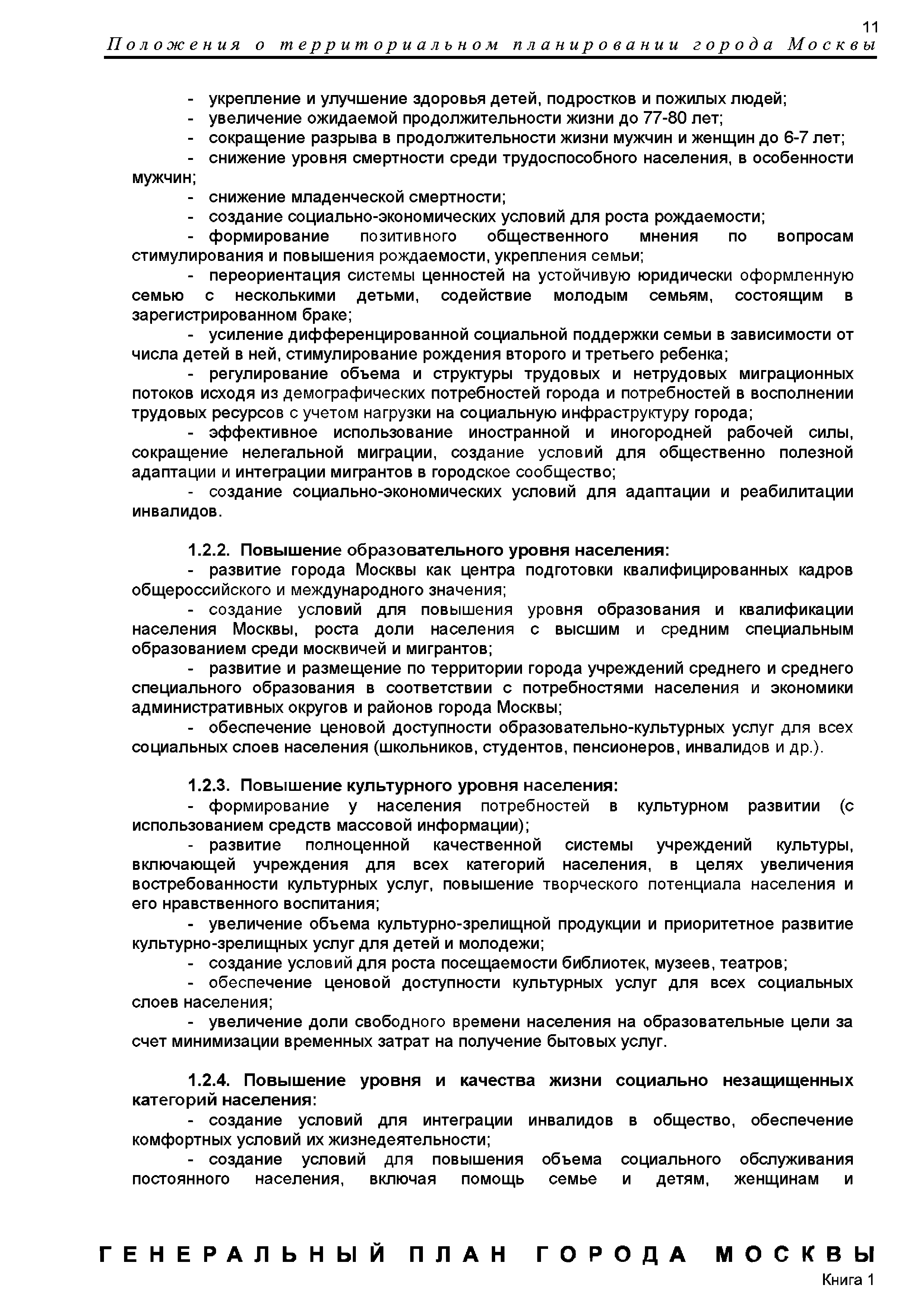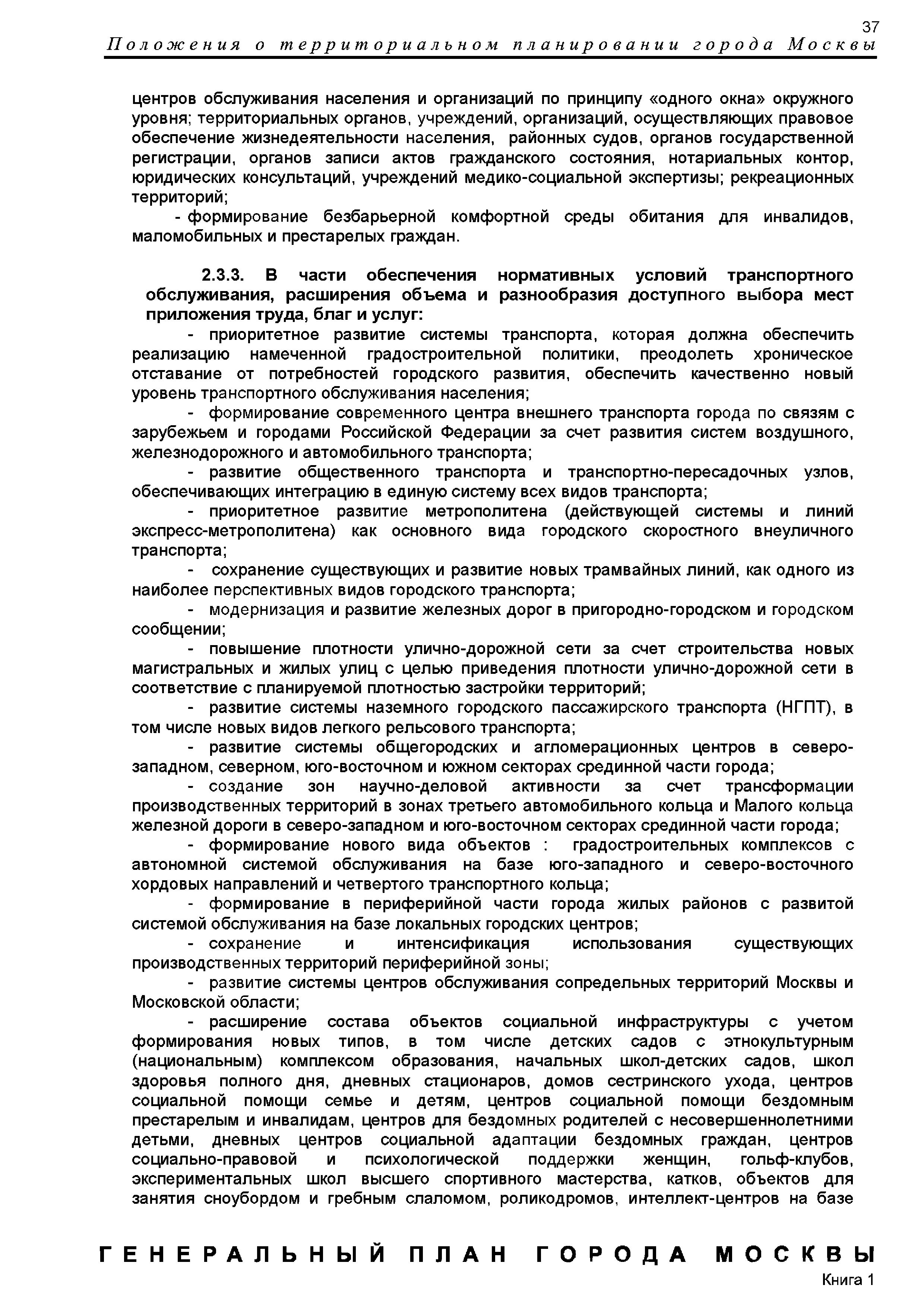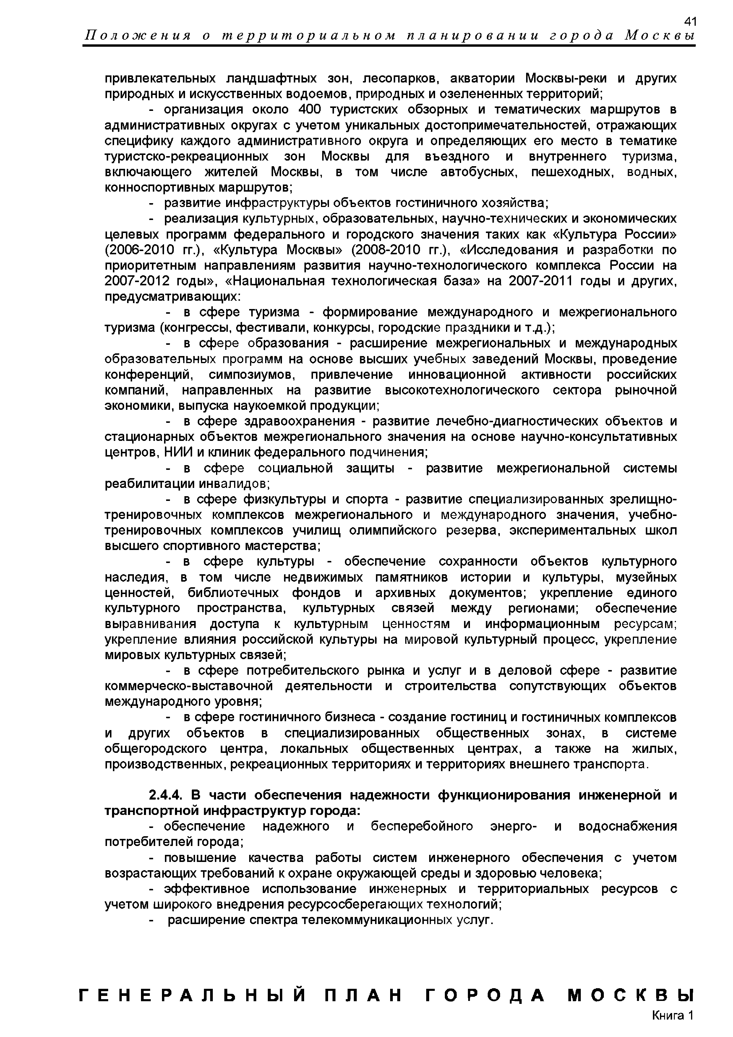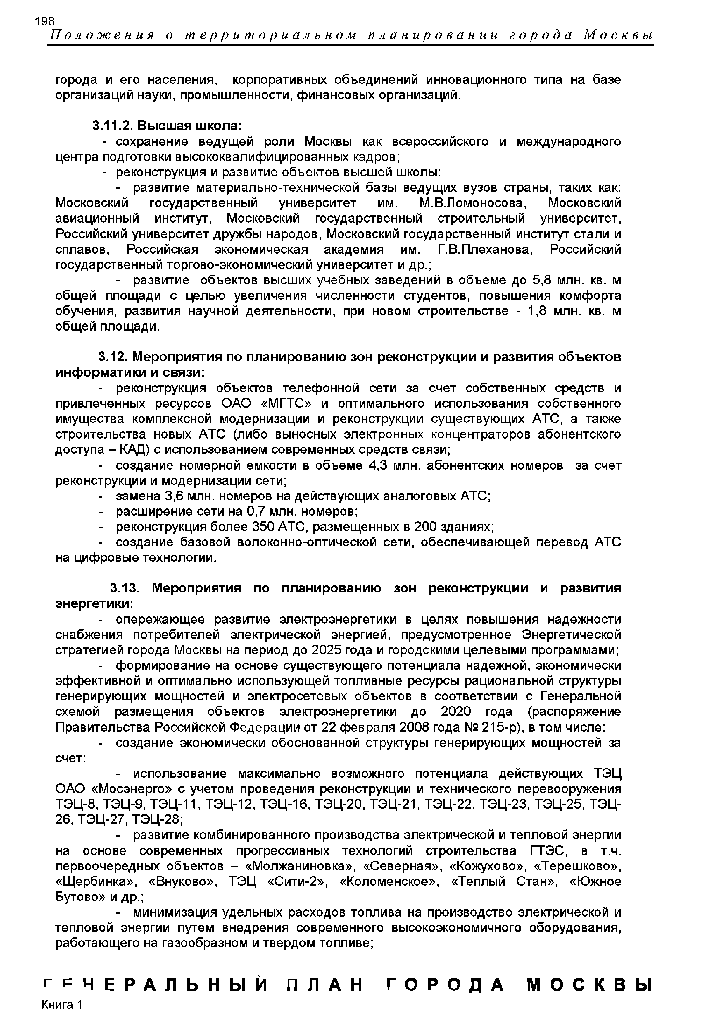 | Оглавление: | Содержание Часть 1. Социально-экономические предпосылки развития города Москвы 1. Общие положения 1.1. Цели и задачи социально-экономического развития города Москвы 1.2. Повышение качества жизни и уровня воспроизводства населения 1.3. Устойчивое и сбалансированное развитие отраслей экономики города Москвы и рост валового регионального продукта 1.4. Повышение эффективности использования накопленного потенциала и ресурсов города 1.5. Мероприятия социально-экономического развития города Москвы Часть 2. Территориальное планирование развития города Москвы 1. Цели территориального планирования пространственного развития города Москвы на период до 2025 года 2. Задачи территориального планирования пространственного развития города Москвы на период до 2025 года, направленные на обеспечение общественных интересов, социальных гарантий, последовательное повышение качества городской среды и устойчивости развития города 3. Основные группы мероприятий территориального планирования города Москвы 3.1. Мероприятия в области планировочной организации и функционального зонирования территории 3.2. Инженерно-технические мероприятия по охране окружающей среды и защите населения и территории от опасных воздействий природного и техногенного характера 3.3. Мероприятия по сохранению, восстановлению объектов культурного наследия и реабилитации исторической среды 3.4. Мероприятия по сохранению и реабилитации особо охраняемых природных территорий 3.5. Мероприятия по размещению и строительству, реконструкции, реновации, капитальному ремонту объектов капитального строительства жилищного, общественного, административного, делового, производственного назначения 3.6. Мероприятия по развитию, размещению и строительству, реконструкции систем и объектов транспортной инфраструктуры и совершенствованию их функционирования 3.7. Мероприятия по развитию, размещению и строительству, реконструкции систем и объектов инженерной инфраструктуры и совершенствованию их функционирования 3.8. Мероприятия по развитию, размещению и строительству, реконструкции социально значимых объектов социальной инфраструктуры 3.9. Мероприятия в области ландшафтного и садово-паркового строительства, комплексного благоустройства и художественного оформления территории 4. Показатели территориального планирования развития города Москвы 4.1. Основные показатели развития особо охраняемых природных территорий, природных и озелененных территорий, охраны окружающей среды и защиты населения и территорий от опасных воздействий 4.2. Основные показатели развития социальной инфраструктуры 4.3. Основные показатели в области жилищного строительства 4.4. Основные показатели развития транспортной инфраструктуры 4.5. Основные показатели развития инженерной инфраструктуры Часть 3. Обеспечение совместных интересов субъектов Российской Федерации - города федерального значения Москвы и Московской области в сфере территориального планирования 1. Цели и задачи территориального планирования в части обеспечения совместных интересов города Москвы и Московской области 2. Мероприятия территориального планирования в части обеспечения совместных интересов города Москвы и Московской области 2.1. Формирование эффективной системы расселения города Москвы и Московской области 2