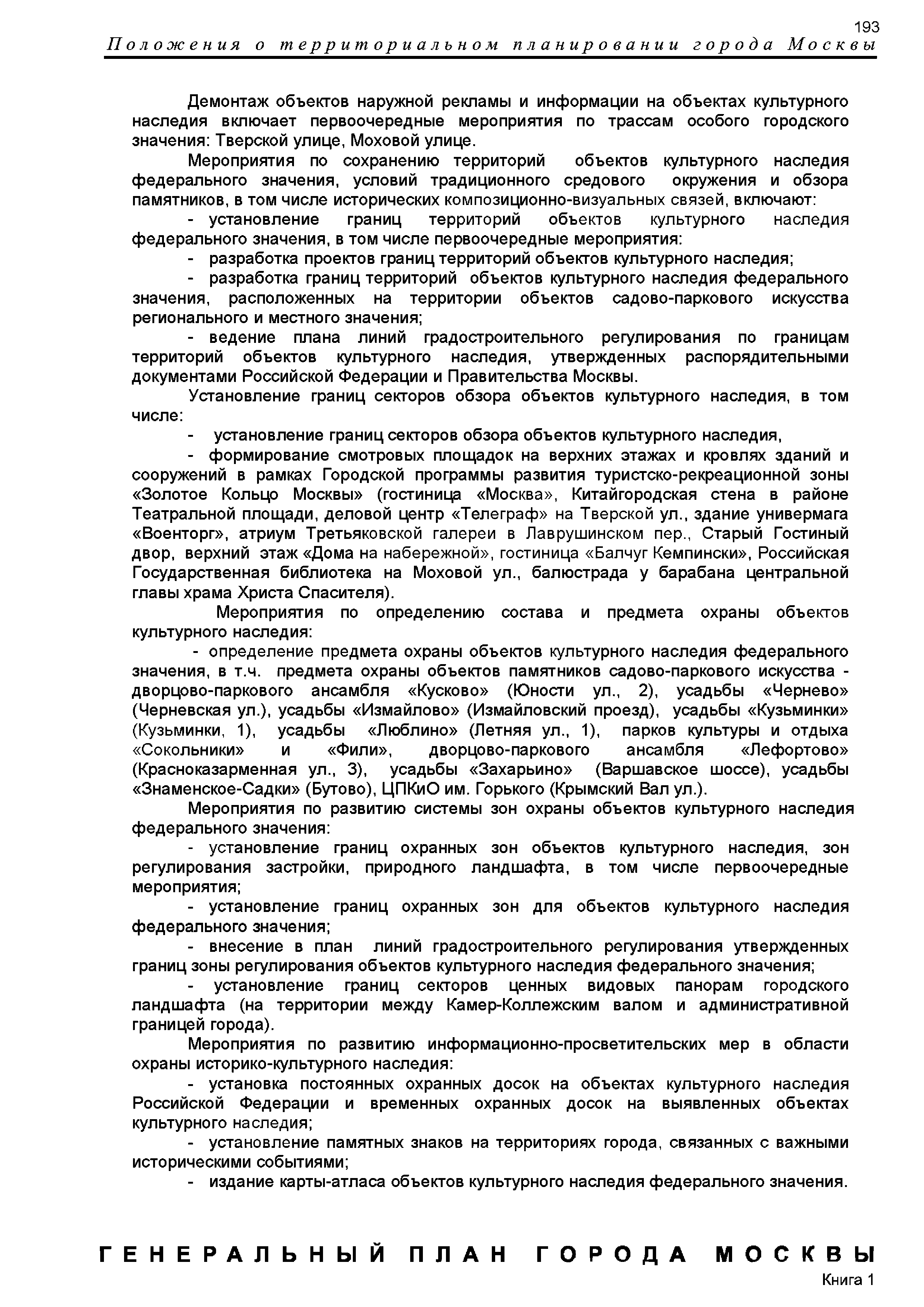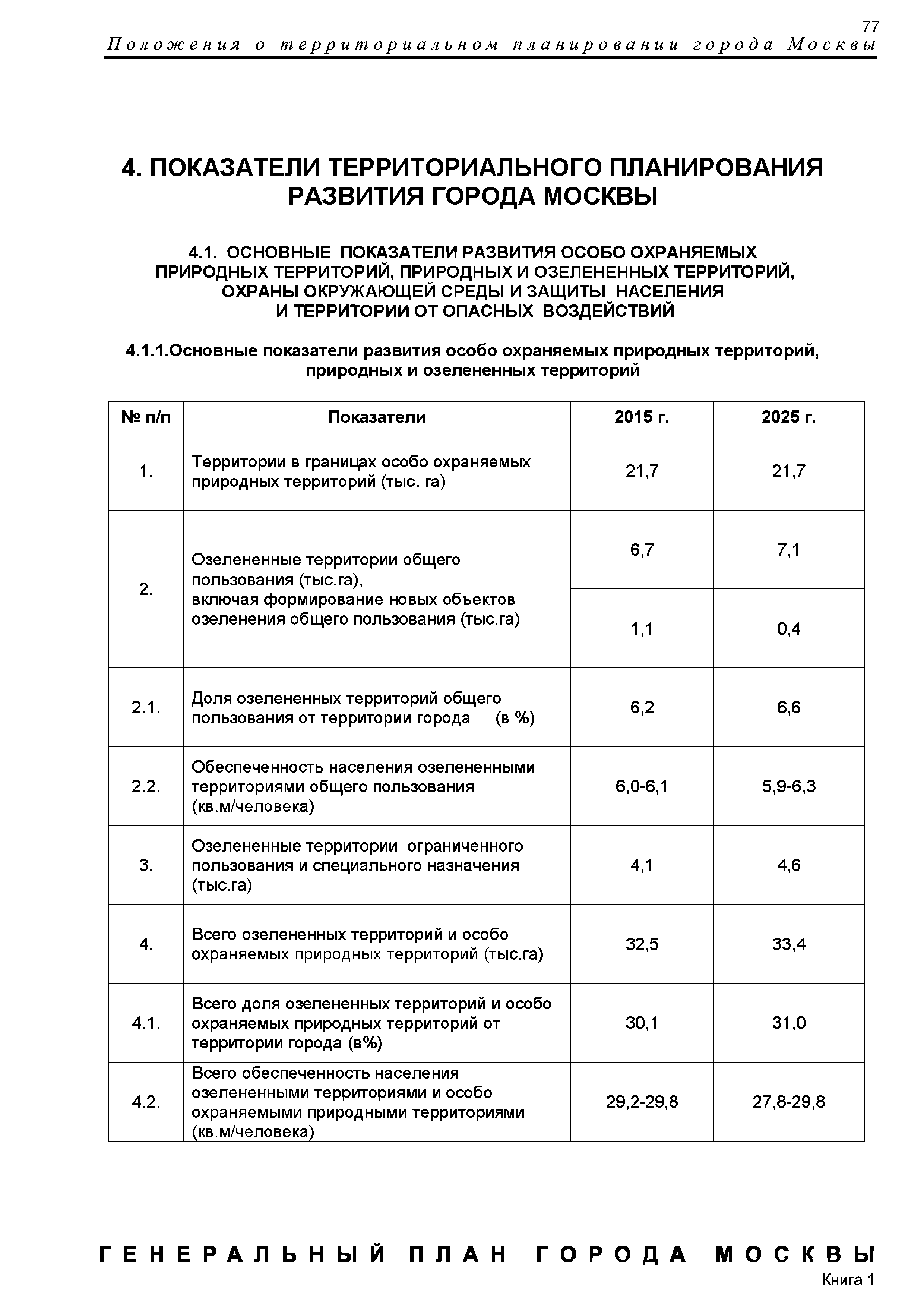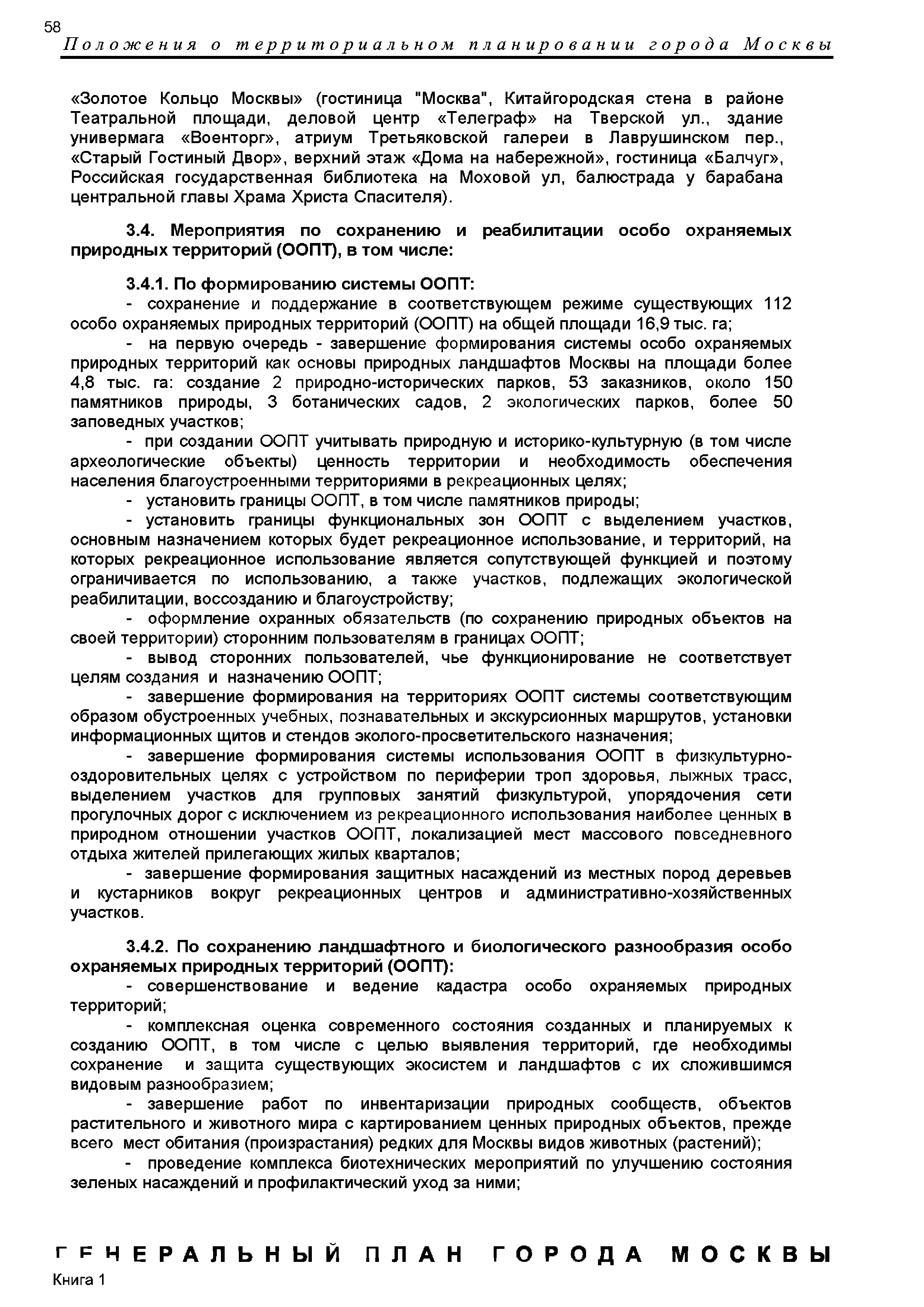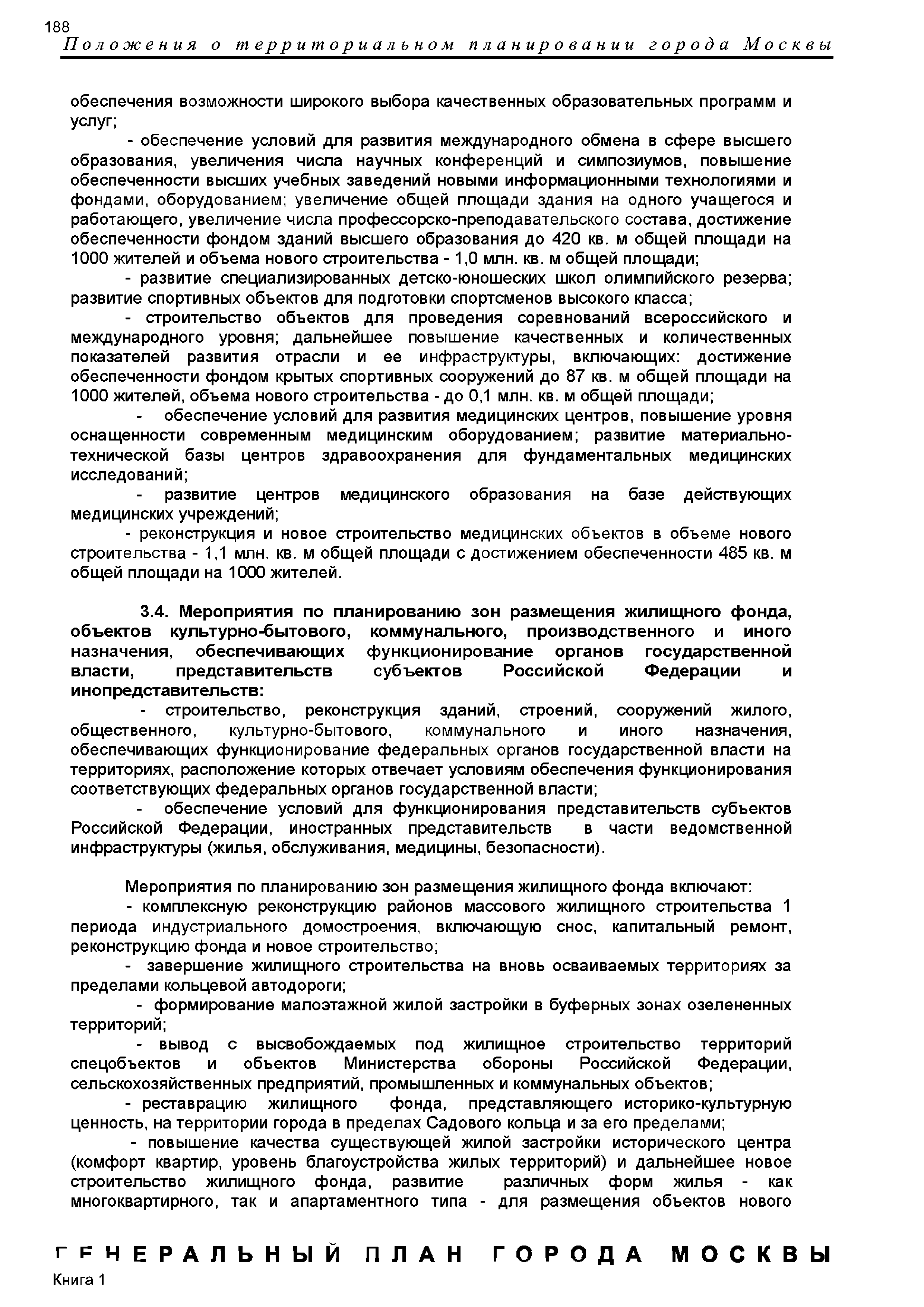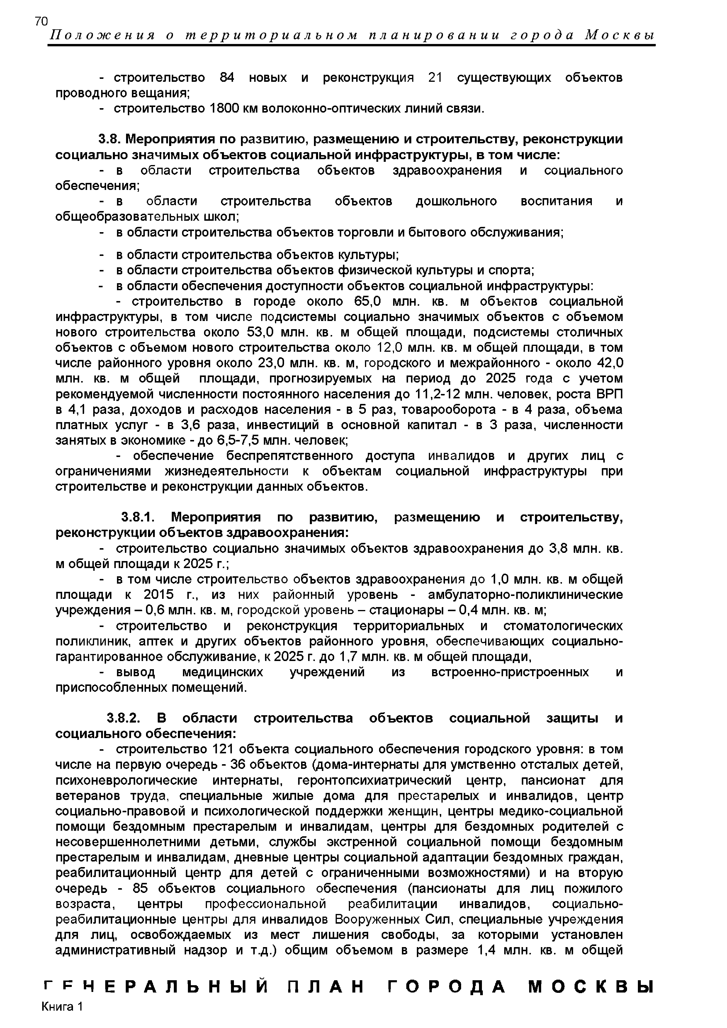 | Оглавление: | Содержание Часть 1. Социально-экономические предпосылки развития города Москвы 1. Общие положения 1.1. Цели и задачи социально-экономического развития города Москвы 1.2. Повышение качества жизни и уровня воспроизводства населения 1.3. Устойчивое и сбалансированное развитие отраслей экономики города Москвы и рост валового регионального продукта 1.4. Повышение эффективности использования накопленного потенциала и ресурсов города 1.5. Мероприятия социально-экономического развития города Москвы Часть 2. Территориальное планирование развития города Москвы 1. Цели территориального планирования пространственного развития города Москвы на период до 2025 года 2. Задачи территориального планирования пространственного развития города Москвы на период до 2025 года, направленные на обеспечение общественных интересов, социальных гарантий, последовательное повышение качества городской среды и устойчивости развития города 3. Основные группы мероприятий территориального планирования города Москвы 3.1. Мероприятия в области планировочной организации и функционального зонирования территории 3.2. Инженерно-технические мероприятия по охране окружающей среды и защите населения и территории от опасных воздействий природного и техногенного характера 3.3. Мероприятия по сохранению, восстановлению объектов культурного наследия и реабилитации исторической среды 3.4. Мероприятия по сохранению и реабилитации особо охраняемых природных территорий 3.5. Мероприятия по размещению и строительству, реконструкции, реновации, капитальному ремонту объектов капитального строительства жилищного, общественного, административного, делового, производственного назначения 3.6. Мероприятия по развитию, размещению и строительству, реконструкции систем и объектов транспортной инфраструктуры и совершенствованию их функционирования 3.7. Мероприятия по развитию, размещению и строительству, реконструкции систем и объектов инженерной инфраструктуры и совершенствованию их функционирования 3.8. Мероприятия по развитию, размещению и строительству, реконструкции социально значимых объектов социальной инфраструктуры 3.9. Мероприятия в области ландшафтного и садово-паркового строительства, комплексного благоустройства и художественного оформления территории 4. Показатели территориального планирования развития города Москвы 4.1. Основные показатели развития особо охраняемых природных территорий, природных и озелененных территорий, охраны окружающей среды и защиты населения и территорий от опасных воздействий 4.2. Основные показатели развития социальной инфраструктуры 4.3. Основные показатели в области жилищного строительства 4.4. Основные показатели развития транспортной инфраструктуры 4.5. Основные показатели развития инженерной инфраструктуры Часть 3. Обеспечение совместных интересов субъектов Российской Федерации - города федерального значения Москвы и Московской области в сфере территориального планирования 1. Цели и задачи территориального планирования в части обеспечения совместных интересов города Москвы и Московской области 2. Мероприятия территориального планирования в части обеспечения совместных интересов города Москвы и Московской области 2.1. Формирование эффективной системы расселения города Москвы и Московской области 2