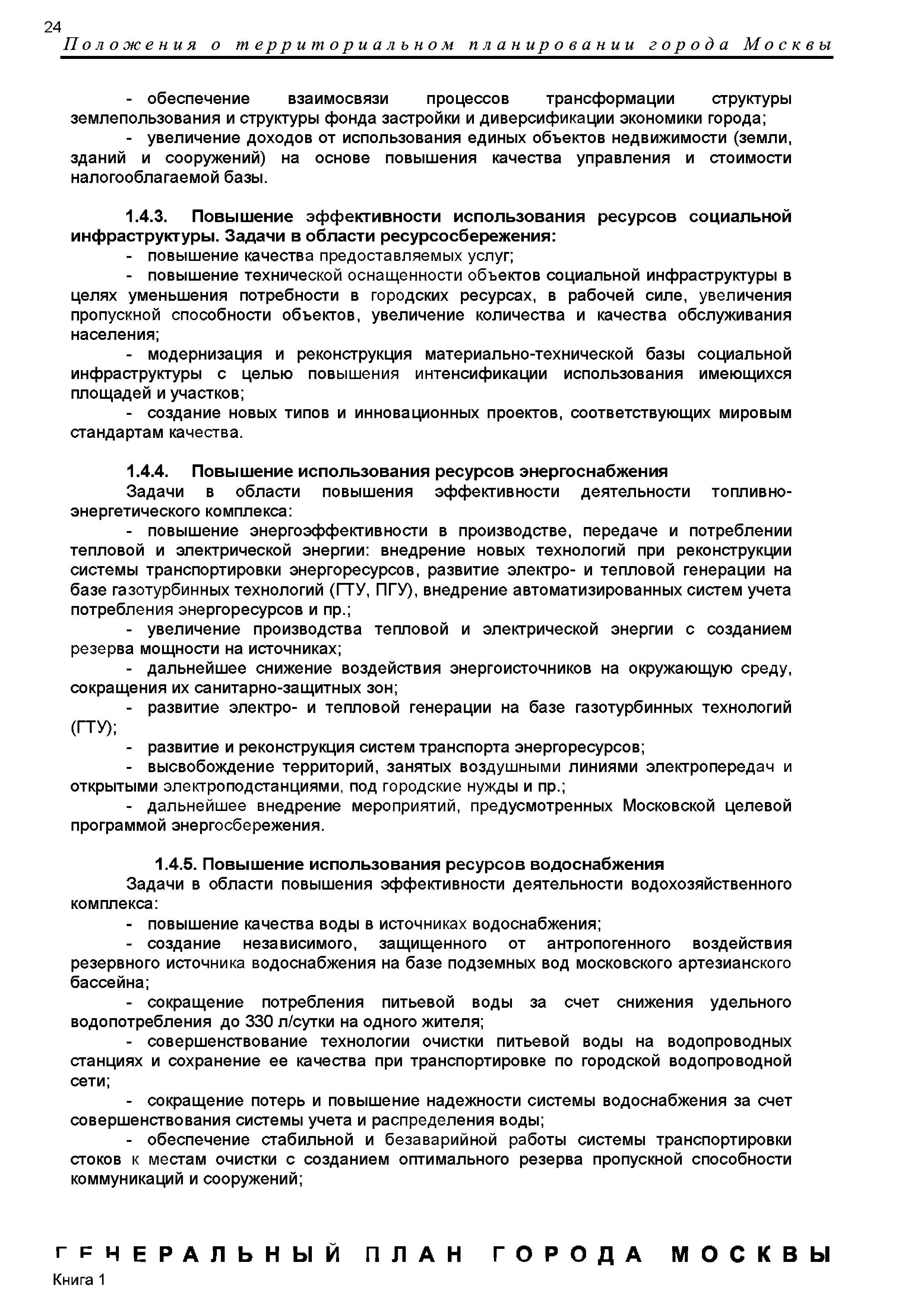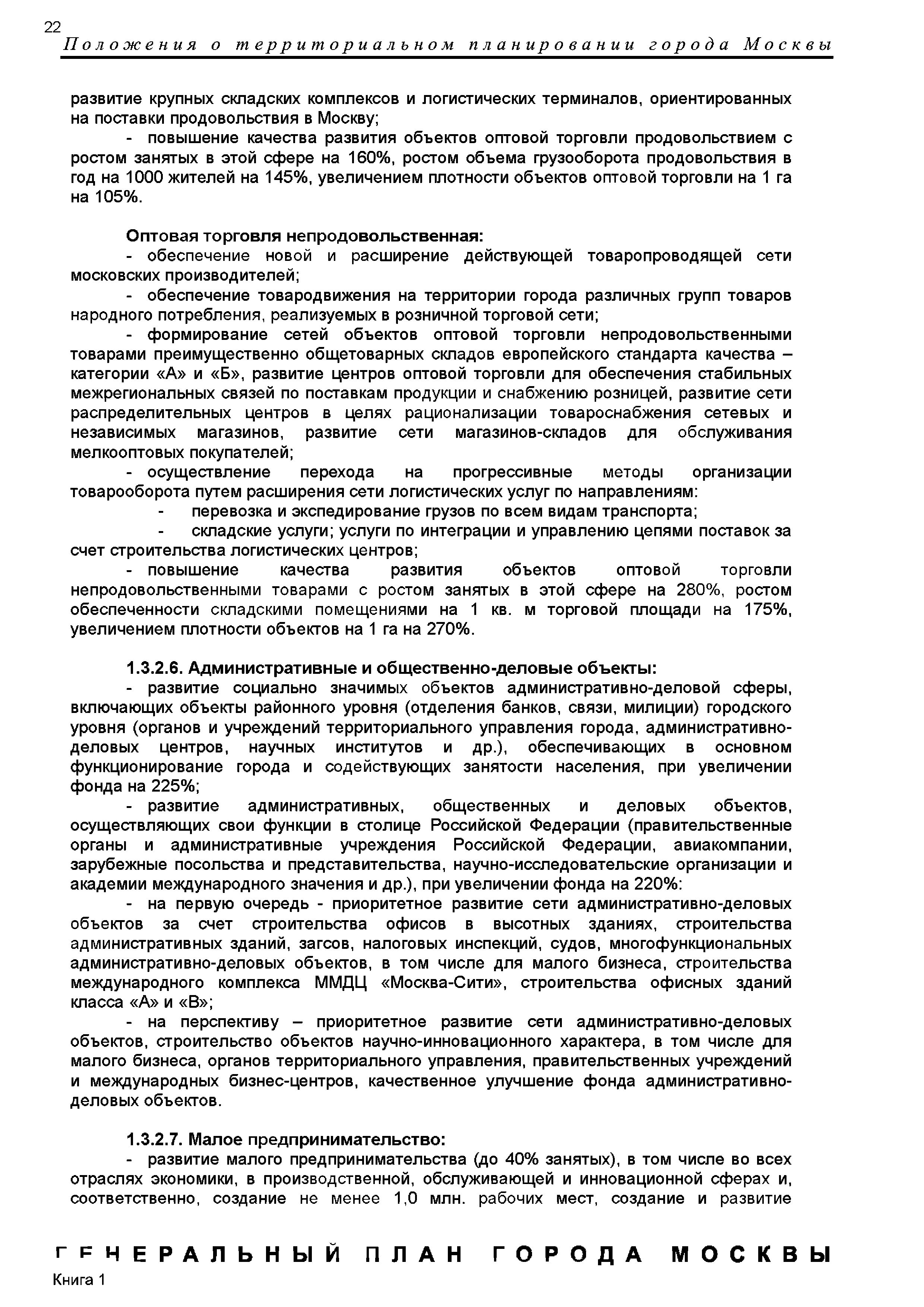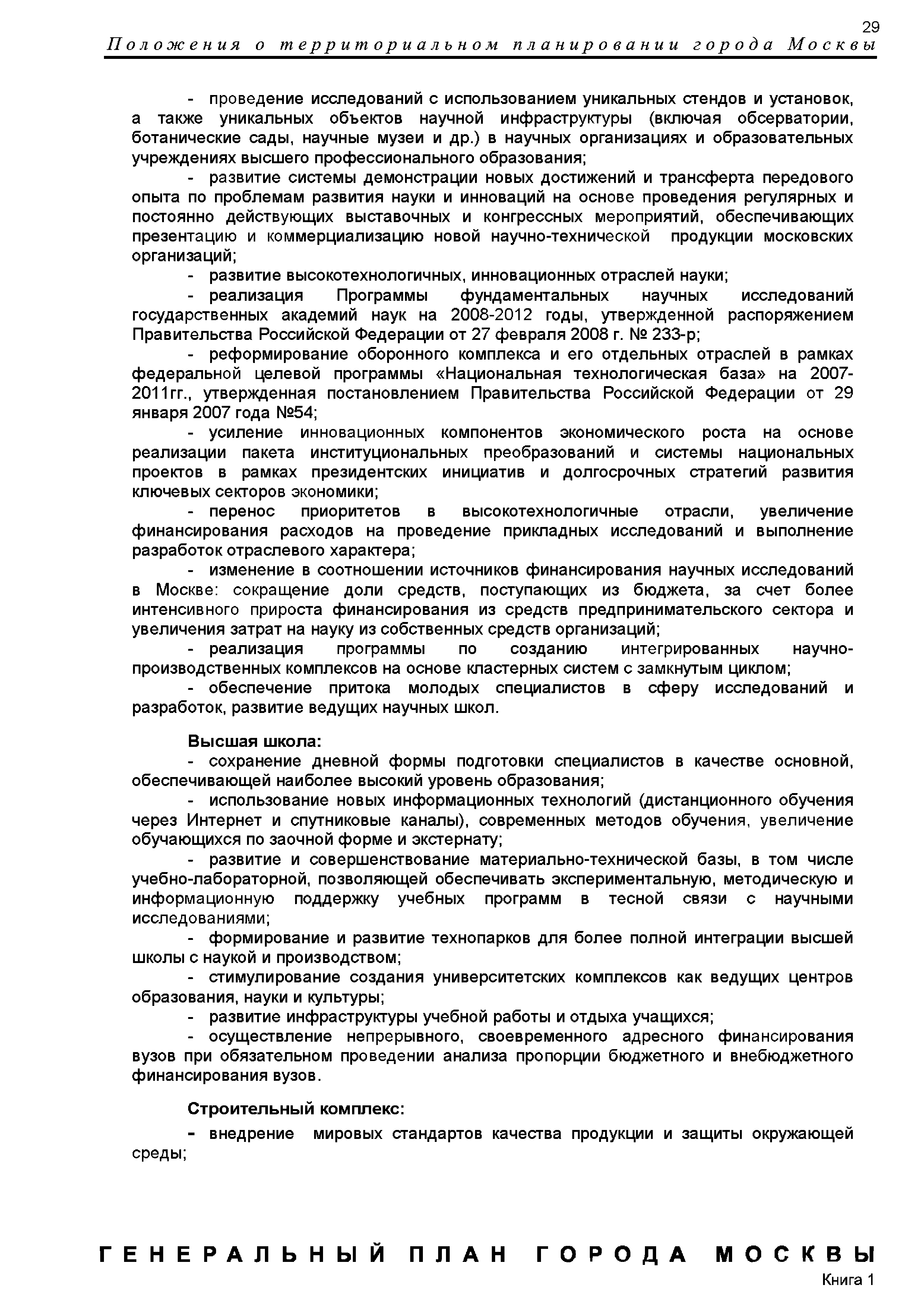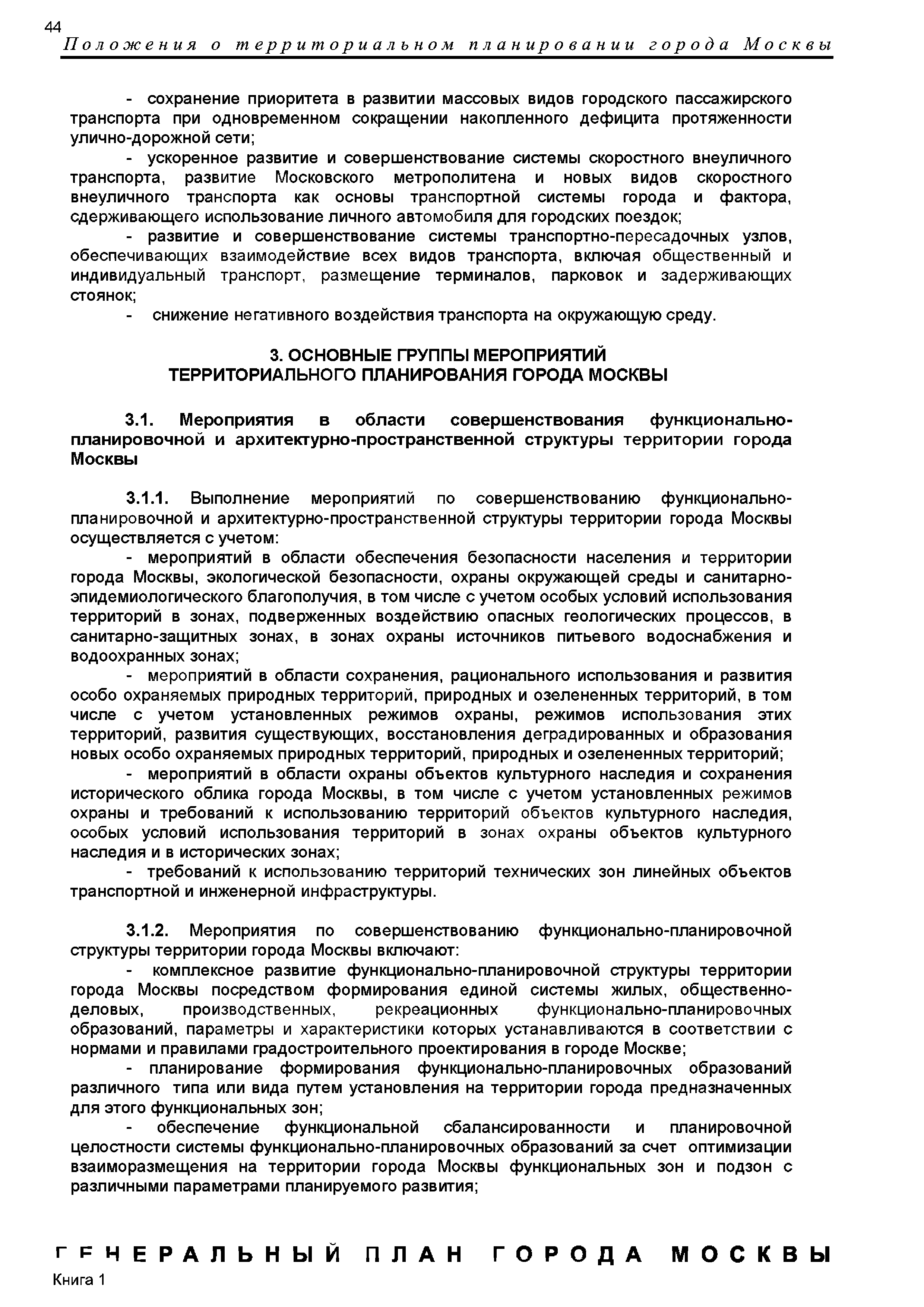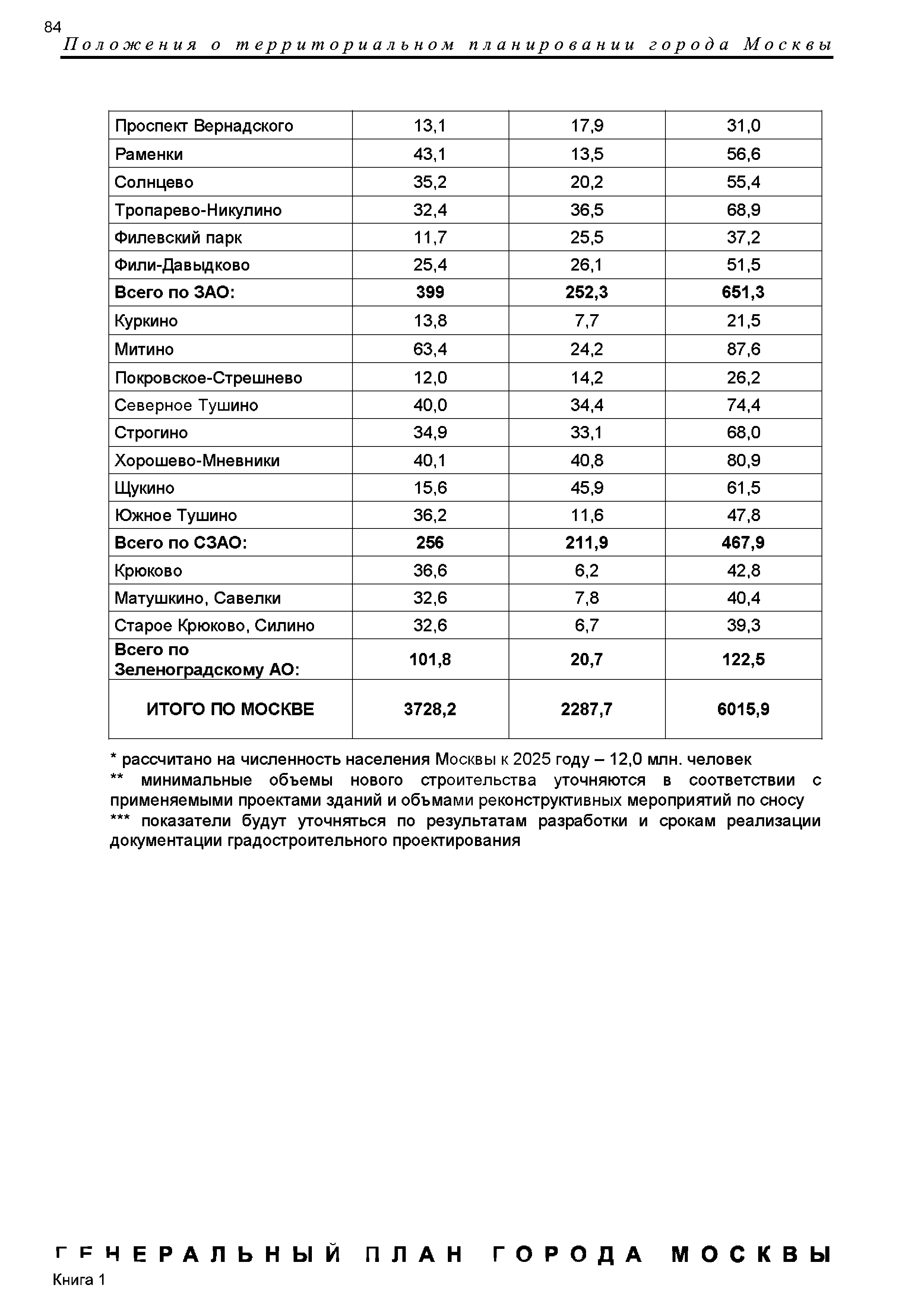 | Оглавление: | Содержание Часть 1. Социально-экономические предпосылки развития города Москвы 1. Общие положения 1.1. Цели и задачи социально-экономического развития города Москвы 1.2. Повышение качества жизни и уровня воспроизводства населения 1.3. Устойчивое и сбалансированное развитие отраслей экономики города Москвы и рост валового регионального продукта 1.4. Повышение эффективности использования накопленного потенциала и ресурсов города 1.5. Мероприятия социально-экономического развития города Москвы Часть 2. Территориальное планирование развития города Москвы 1. Цели территориального планирования пространственного развития города Москвы на период до 2025 года 2. Задачи территориального планирования пространственного развития города Москвы на период до 2025 года, направленные на обеспечение общественных интересов, социальных гарантий, последовательное повышение качества городской среды и устойчивости развития города 3. Основные группы мероприятий территориального планирования города Москвы 3.1. Мероприятия в области планировочной организации и функционального зонирования территории 3.2. Инженерно-технические мероприятия по охране окружающей среды и защите населения и территории от опасных воздействий природного и техногенного характера 3.3. Мероприятия по сохранению, восстановлению объектов культурного наследия и реабилитации исторической среды 3.4. Мероприятия по сохранению и реабилитации особо охраняемых природных территорий 3.5. Мероприятия по размещению и строительству, реконструкции, реновации, капитальному ремонту объектов капитального строительства жилищного, общественного, административного, делового, производственного назначения 3.6. Мероприятия по развитию, размещению и строительству, реконструкции систем и объектов транспортной инфраструктуры и совершенствованию их функционирования 3.7. Мероприятия по развитию, размещению и строительству, реконструкции систем и объектов инженерной инфраструктуры и совершенствованию их функционирования 3.8. Мероприятия по развитию, размещению и строительству, реконструкции социально значимых объектов социальной инфраструктуры 3.9. Мероприятия в области ландшафтного и садово-паркового строительства, комплексного благоустройства и художественного оформления территории 4. Показатели территориального планирования развития города Москвы 4.1. Основные показатели развития особо охраняемых природных территорий, природных и озелененных территорий, охраны окружающей среды и защиты населения и территорий от опасных воздействий 4.2. Основные показатели развития социальной инфраструктуры 4.3. Основные показатели в области жилищного строительства 4.4. Основные показатели развития транспортной инфраструктуры 4.5. Основные показатели развития инженерной инфраструктуры Часть 3. Обеспечение совместных интересов субъектов Российской Федерации - города федерального значения Москвы и Московской области в сфере территориального планирования 1. Цели и задачи территориального планирования в части обеспечения совместных интересов города Москвы и Московской области 2. Мероприятия территориального планирования в части обеспечения совместных интересов города Москвы и Московской области 2.1. Формирование эффективной системы расселения города Москвы и Московской области 2