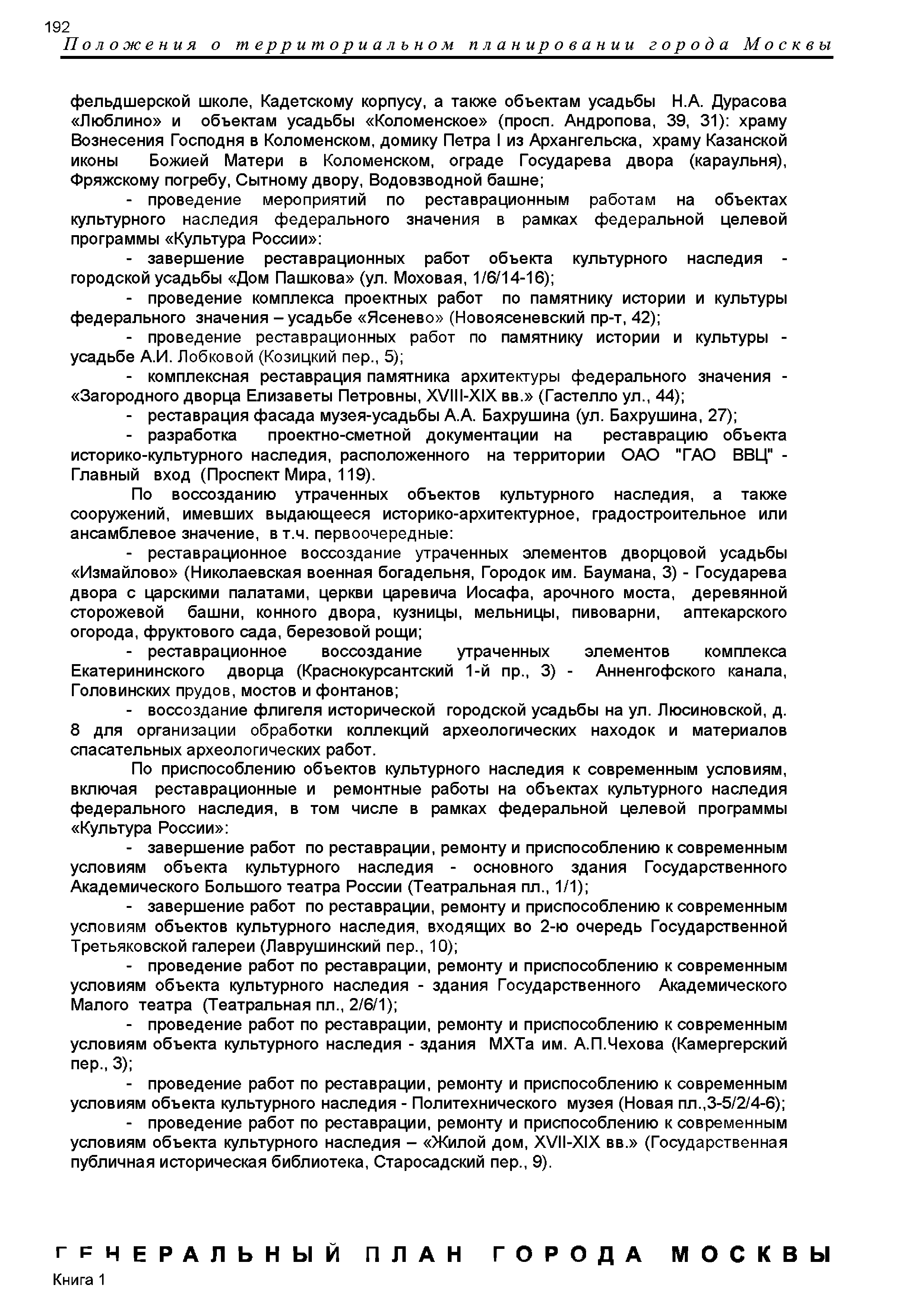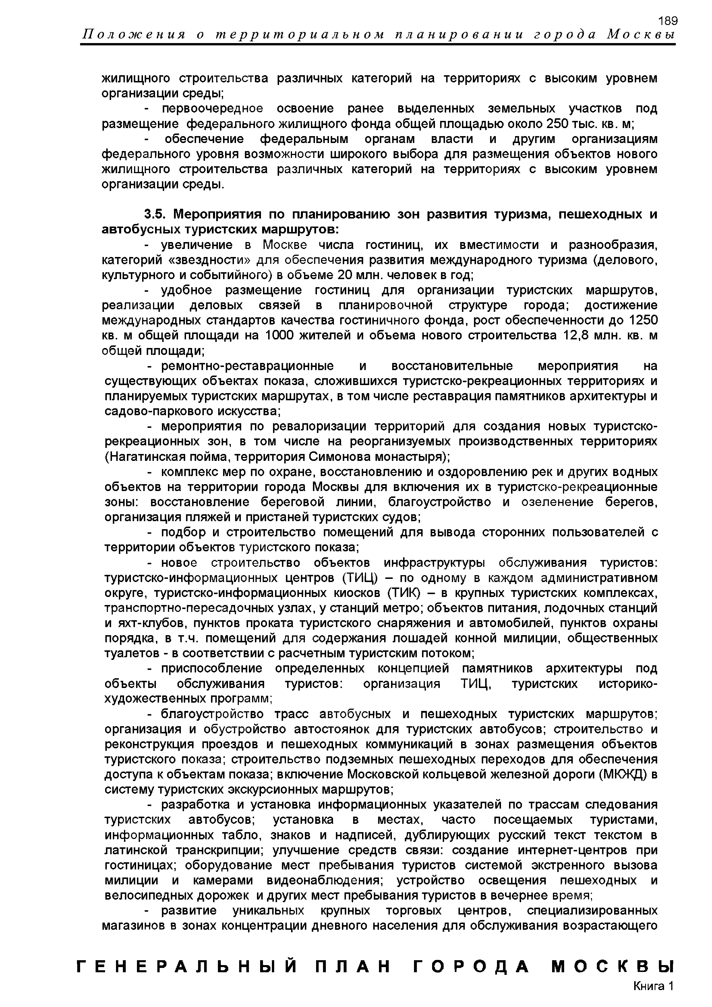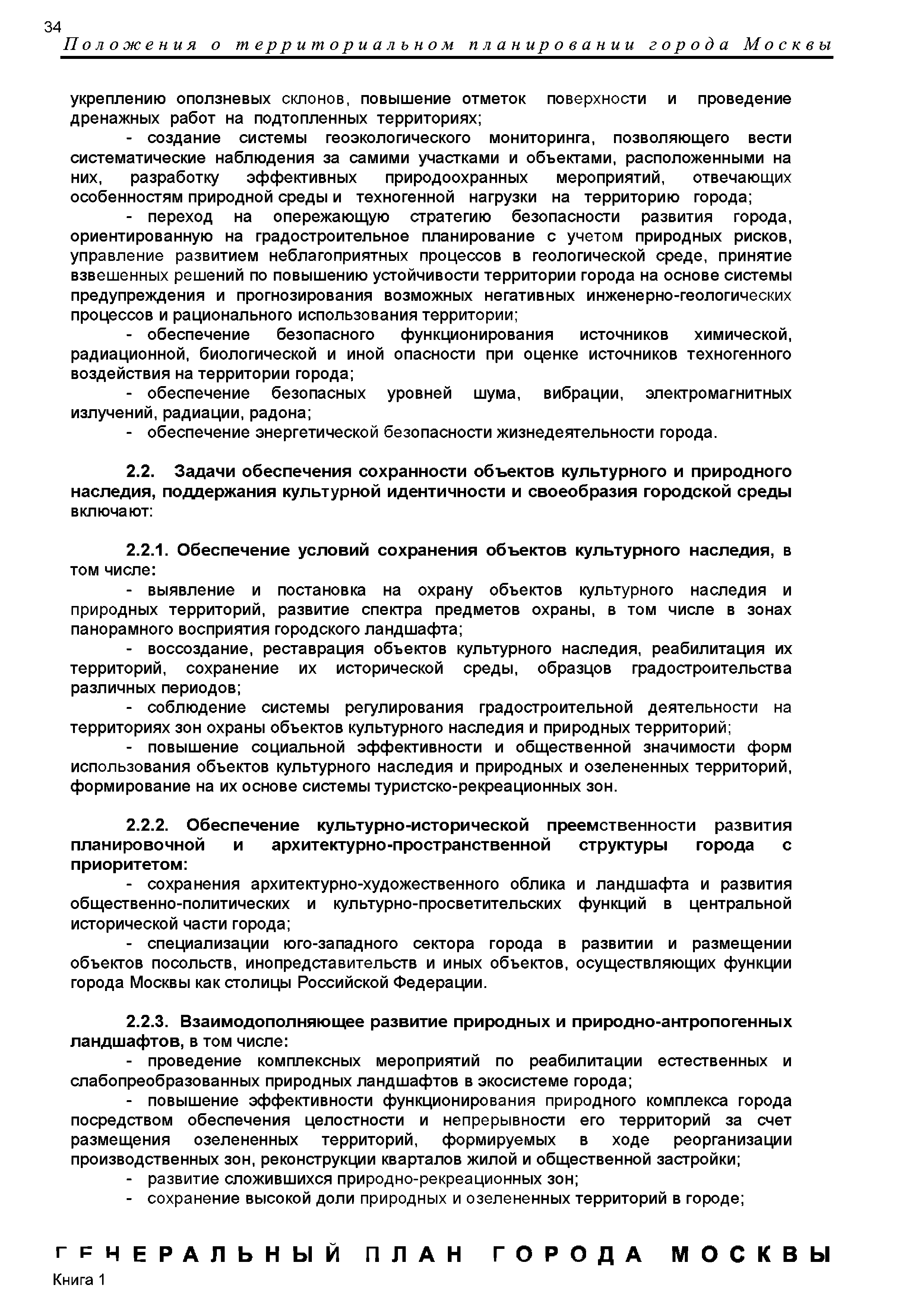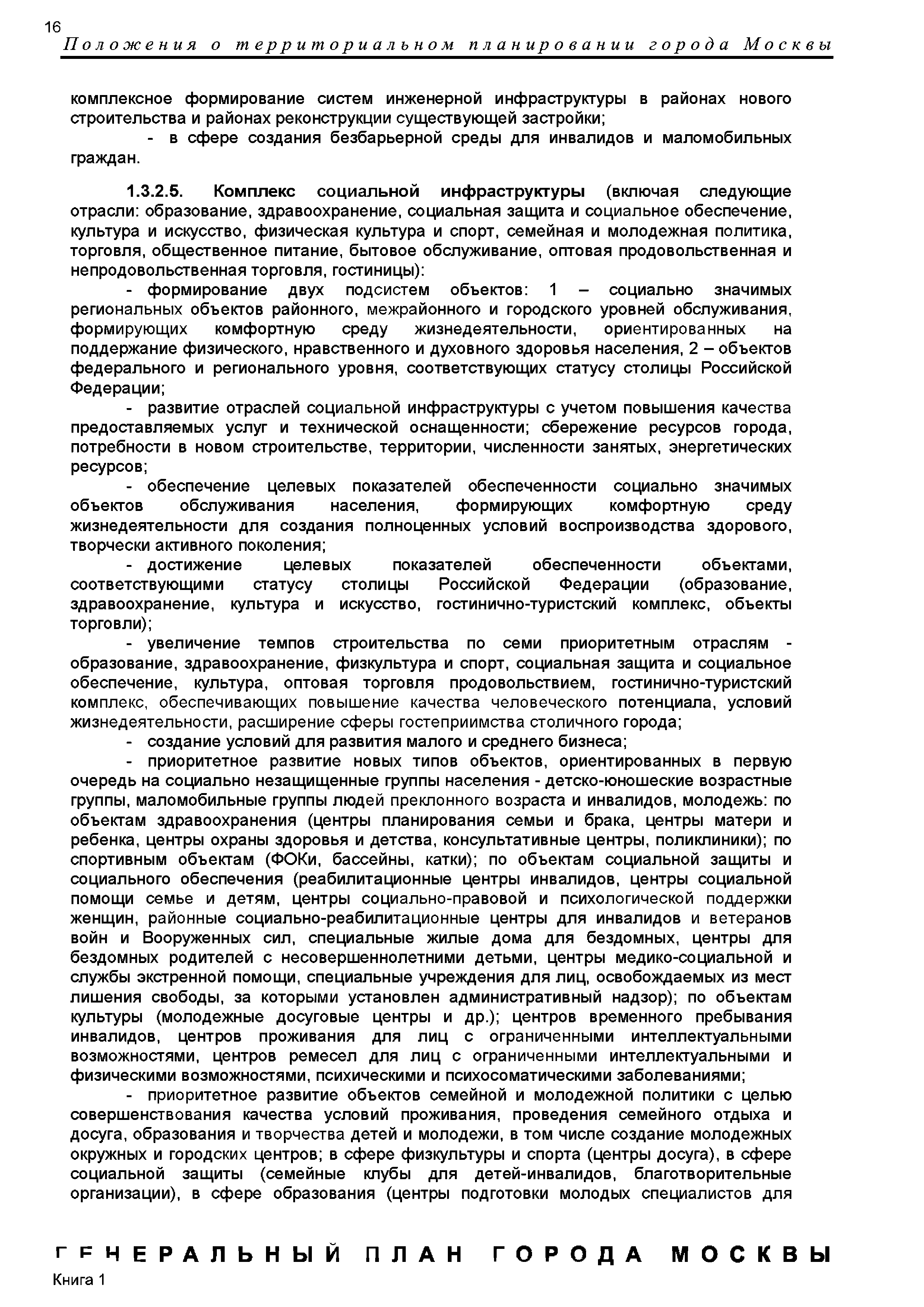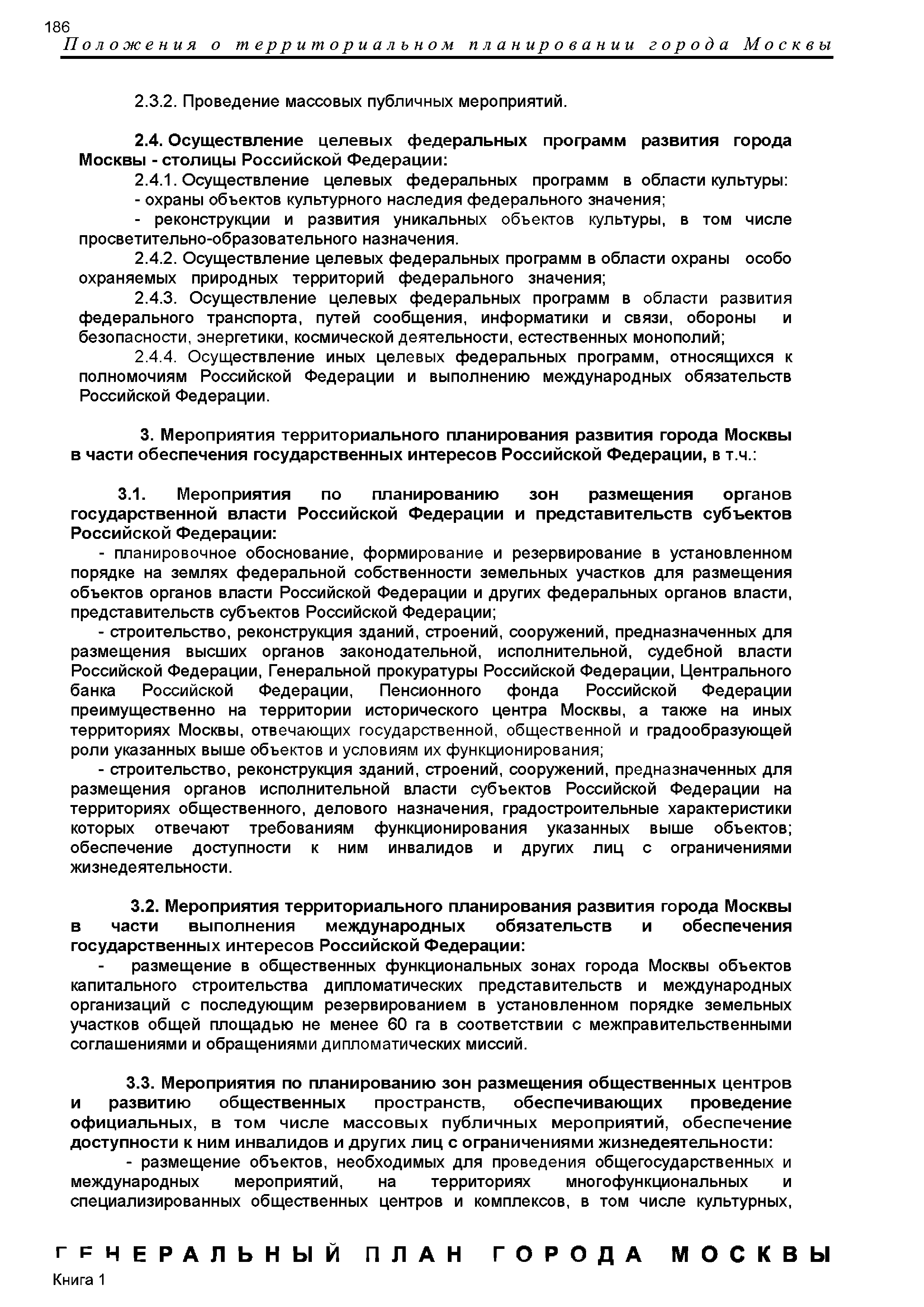 | Оглавление: | Содержание Часть 1. Социально-экономические предпосылки развития города Москвы 1. Общие положения 1.1. Цели и задачи социально-экономического развития города Москвы 1.2. Повышение качества жизни и уровня воспроизводства населения 1.3. Устойчивое и сбалансированное развитие отраслей экономики города Москвы и рост валового регионального продукта 1.4. Повышение эффективности использования накопленного потенциала и ресурсов города 1.5. Мероприятия социально-экономического развития города Москвы Часть 2. Территориальное планирование развития города Москвы 1. Цели территориального планирования пространственного развития города Москвы на период до 2025 года 2. Задачи территориального планирования пространственного развития города Москвы на период до 2025 года, направленные на обеспечение общественных интересов, социальных гарантий, последовательное повышение качества городской среды и устойчивости развития города 3. Основные группы мероприятий территориального планирования города Москвы 3.1. Мероприятия в области планировочной организации и функционального зонирования территории 3.2. Инженерно-технические мероприятия по охране окружающей среды и защите населения и территории от опасных воздействий природного и техногенного характера 3.3. Мероприятия по сохранению, восстановлению объектов культурного наследия и реабилитации исторической среды 3.4. Мероприятия по сохранению и реабилитации особо охраняемых природных территорий 3.5. Мероприятия по размещению и строительству, реконструкции, реновации, капитальному ремонту объектов капитального строительства жилищного, общественного, административного, делового, производственного назначения 3.6. Мероприятия по развитию, размещению и строительству, реконструкции систем и объектов транспортной инфраструктуры и совершенствованию их функционирования 3.7. Мероприятия по развитию, размещению и строительству, реконструкции систем и объектов инженерной инфраструктуры и совершенствованию их функционирования 3.8. Мероприятия по развитию, размещению и строительству, реконструкции социально значимых объектов социальной инфраструктуры 3.9. Мероприятия в области ландшафтного и садово-паркового строительства, комплексного благоустройства и художественного оформления территории 4. Показатели территориального планирования развития города Москвы 4.1. Основные показатели развития особо охраняемых природных территорий, природных и озелененных территорий, охраны окружающей среды и защиты населения и территорий от опасных воздействий 4.2. Основные показатели развития социальной инфраструктуры 4.3. Основные показатели в области жилищного строительства 4.4. Основные показатели развития транспортной инфраструктуры 4.5. Основные показатели развития инженерной инфраструктуры Часть 3. Обеспечение совместных интересов субъектов Российской Федерации - города федерального значения Москвы и Московской области в сфере территориального планирования 1. Цели и задачи территориального планирования в части обеспечения совместных интересов города Москвы и Московской области 2. Мероприятия территориального планирования в части обеспечения совместных интересов города Москвы и Московской области 2.1. Формирование эффективной системы расселения города Москвы и Московской области 2