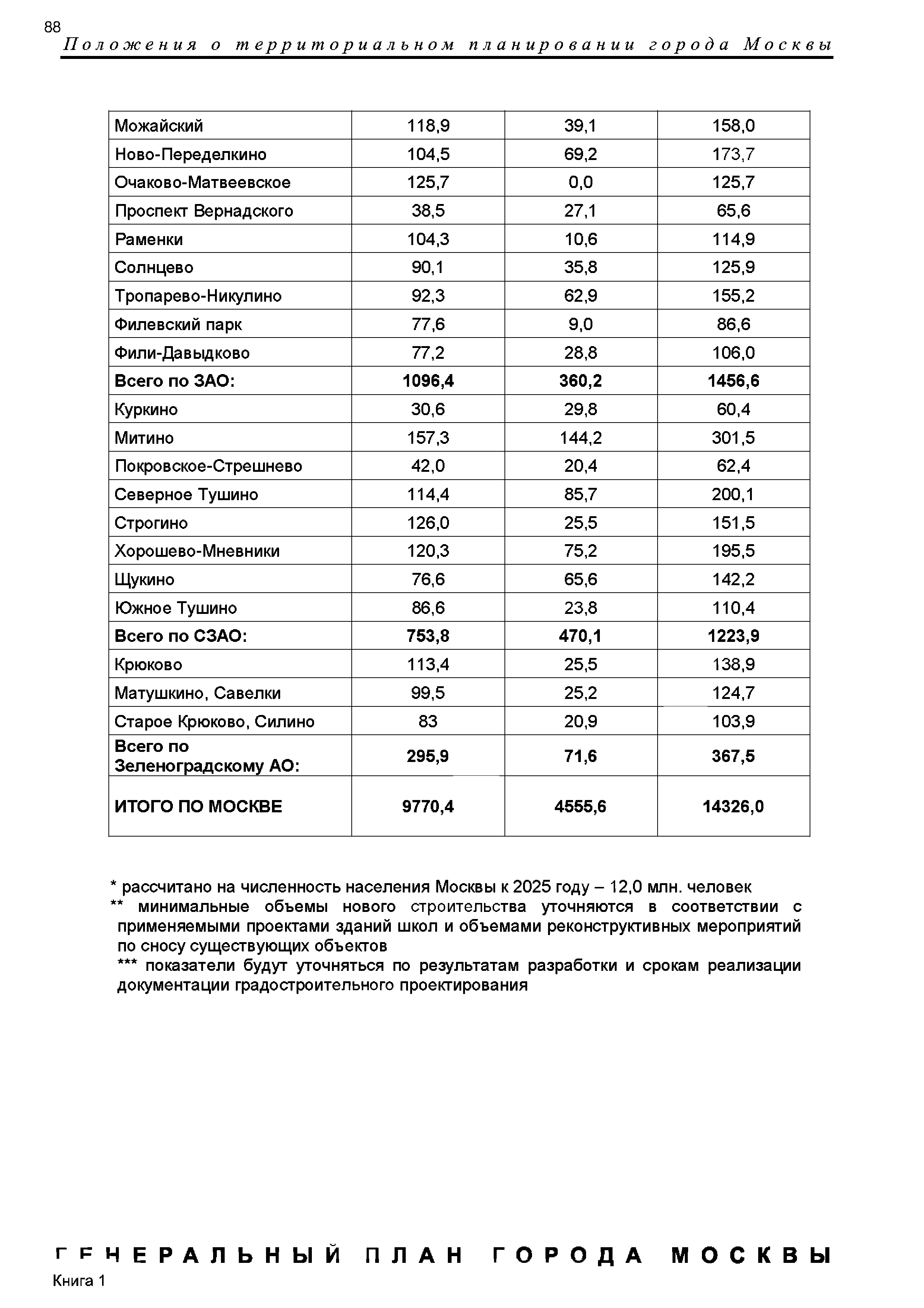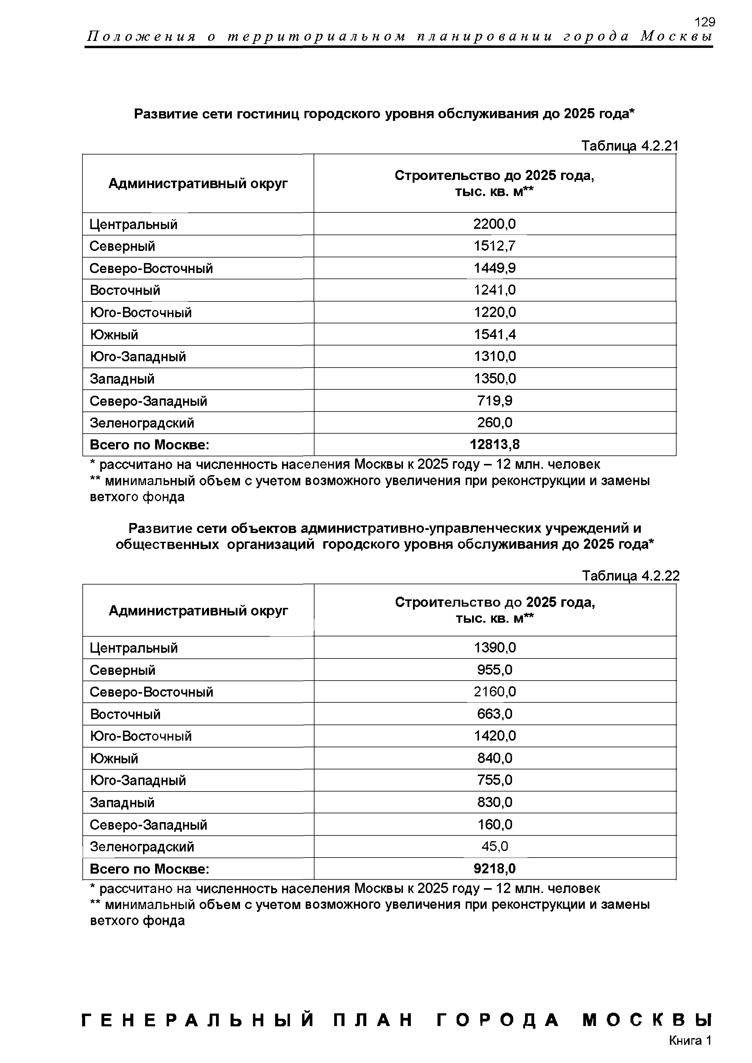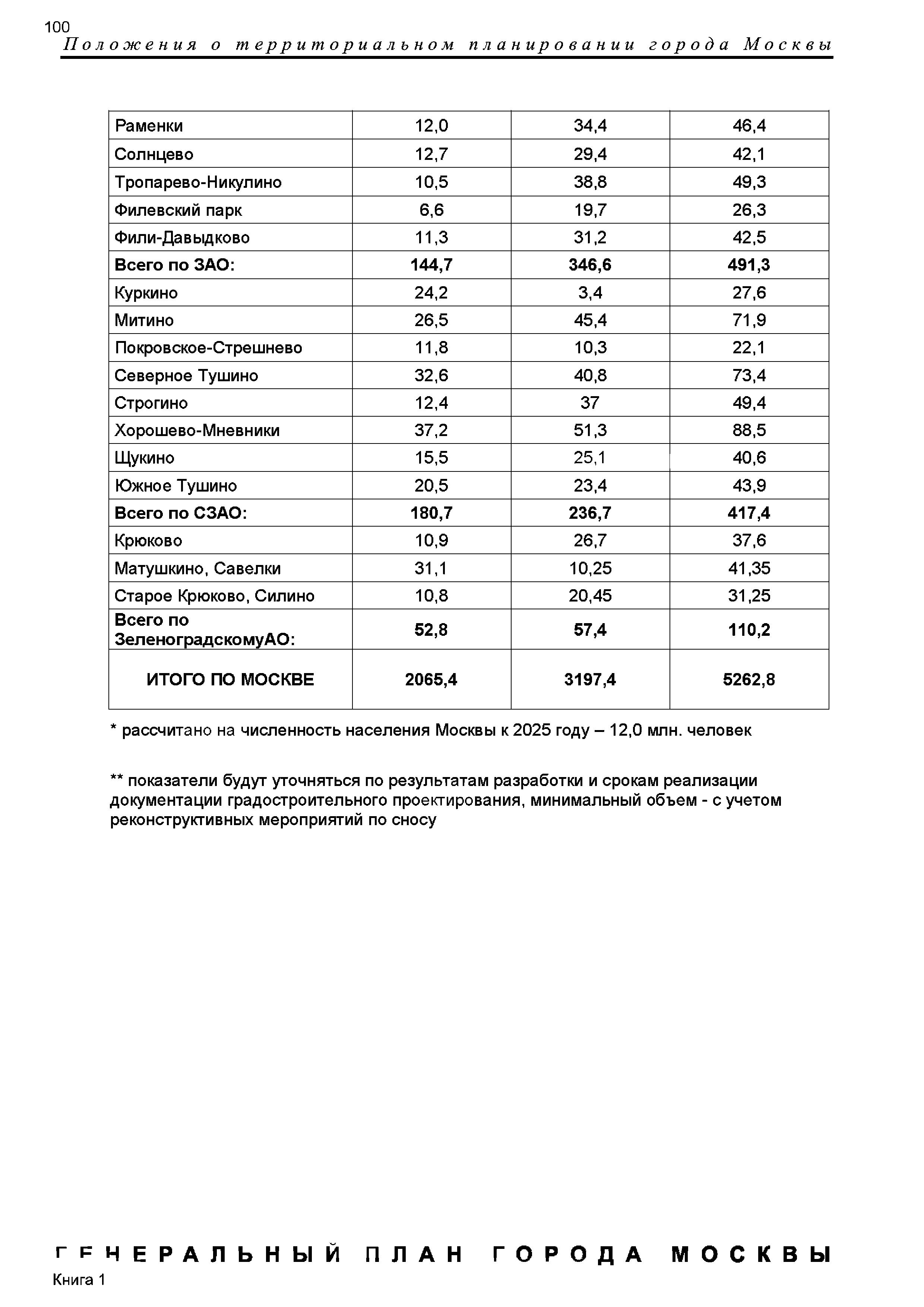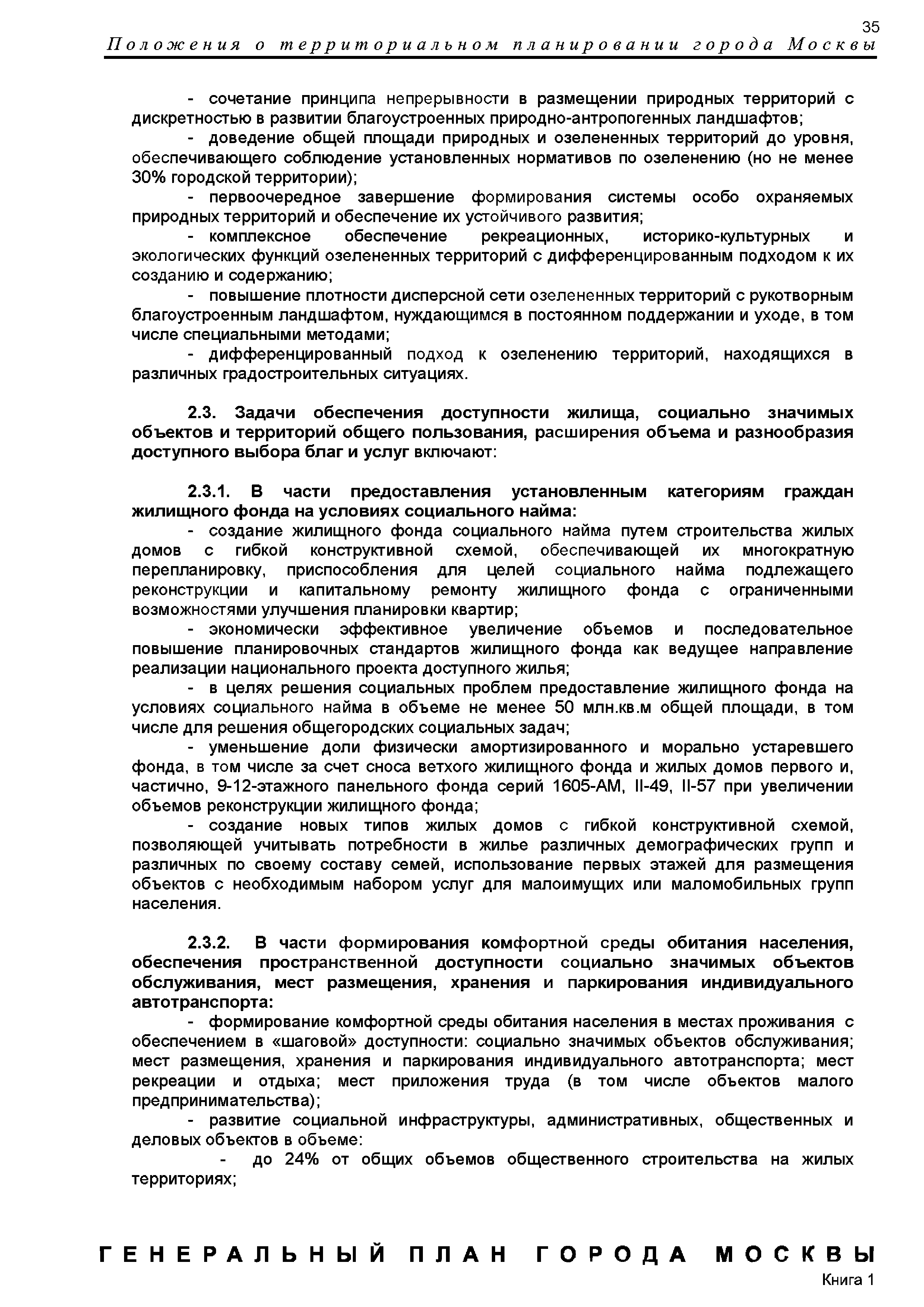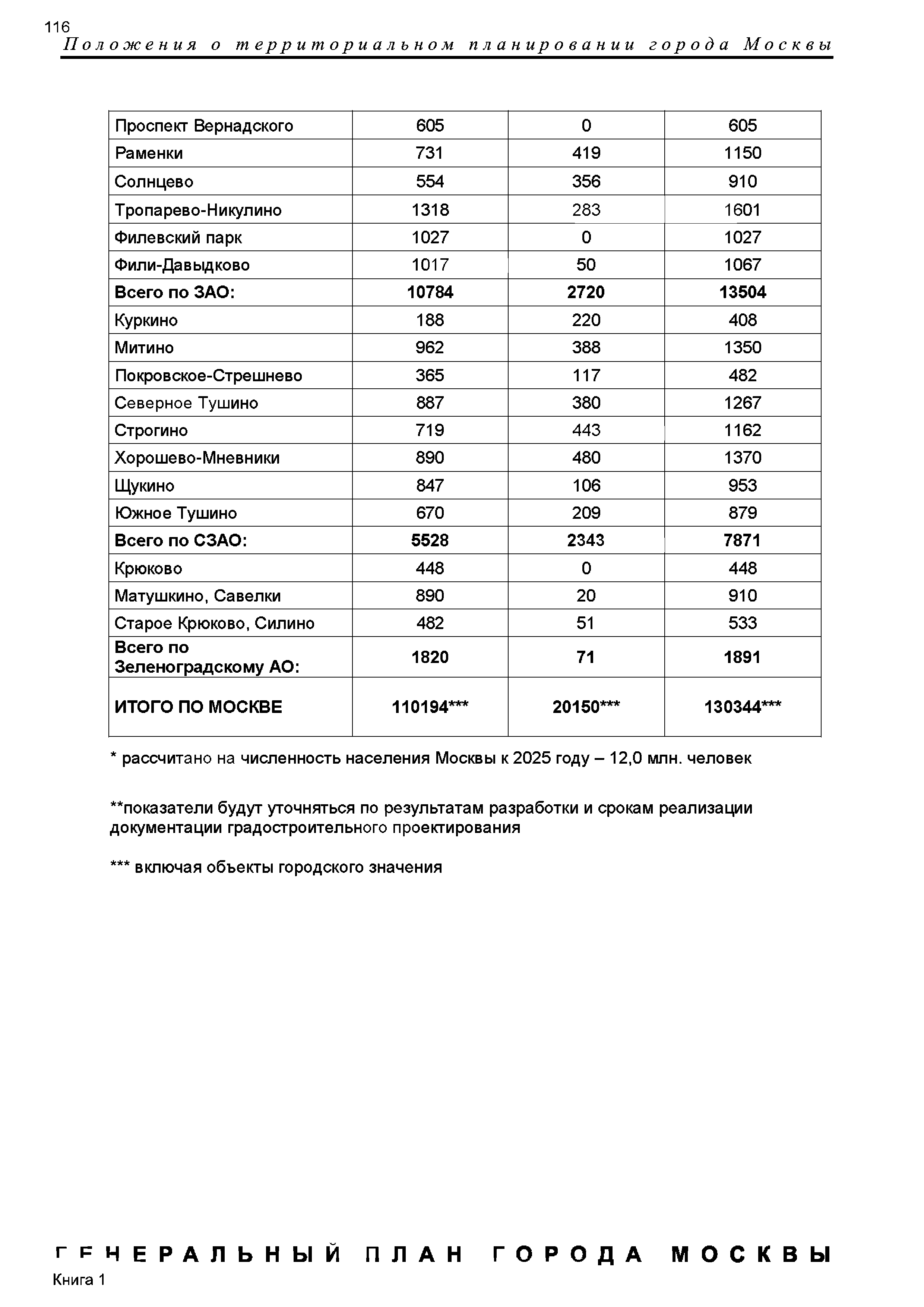 | Оглавление: | Содержание Часть 1. Социально-экономические предпосылки развития города Москвы 1. Общие положения 1.1. Цели и задачи социально-экономического развития города Москвы 1.2. Повышение качества жизни и уровня воспроизводства населения 1.3. Устойчивое и сбалансированное развитие отраслей экономики города Москвы и рост валового регионального продукта 1.4. Повышение эффективности использования накопленного потенциала и ресурсов города 1.5. Мероприятия социально-экономического развития города Москвы Часть 2. Территориальное планирование развития города Москвы 1. Цели территориального планирования пространственного развития города Москвы на период до 2025 года 2. Задачи территориального планирования пространственного развития города Москвы на период до 2025 года, направленные на обеспечение общественных интересов, социальных гарантий, последовательное повышение качества городской среды и устойчивости развития города 3. Основные группы мероприятий территориального планирования города Москвы 3.1. Мероприятия в области планировочной организации и функционального зонирования территории 3.2. Инженерно-технические мероприятия по охране окружающей среды и защите населения и территории от опасных воздействий природного и техногенного характера 3.3. Мероприятия по сохранению, восстановлению объектов культурного наследия и реабилитации исторической среды 3.4. Мероприятия по сохранению и реабилитации особо охраняемых природных территорий 3.5. Мероприятия по размещению и строительству, реконструкции, реновации, капитальному ремонту объектов капитального строительства жилищного, общественного, административного, делового, производственного назначения 3.6. Мероприятия по развитию, размещению и строительству, реконструкции систем и объектов транспортной инфраструктуры и совершенствованию их функционирования 3.7. Мероприятия по развитию, размещению и строительству, реконструкции систем и объектов инженерной инфраструктуры и совершенствованию их функционирования 3.8. Мероприятия по развитию, размещению и строительству, реконструкции социально значимых объектов социальной инфраструктуры 3.9. Мероприятия в области ландшафтного и садово-паркового строительства, комплексного благоустройства и художественного оформления территории 4. Показатели территориального планирования развития города Москвы 4.1. Основные показатели развития особо охраняемых природных территорий, природных и озелененных территорий, охраны окружающей среды и защиты населения и территорий от опасных воздействий 4.2. Основные показатели развития социальной инфраструктуры 4.3. Основные показатели в области жилищного строительства 4.4. Основные показатели развития транспортной инфраструктуры 4.5. Основные показатели развития инженерной инфраструктуры Часть 3. Обеспечение совместных интересов субъектов Российской Федерации - города федерального значения Москвы и Московской области в сфере территориального планирования 1. Цели и задачи территориального планирования в части обеспечения совместных интересов города Москвы и Московской области 2. Мероприятия территориального планирования в части обеспечения совместных интересов города Москвы и Московской области 2.1. Формирование эффективной системы расселения города Москвы и Московской области 2