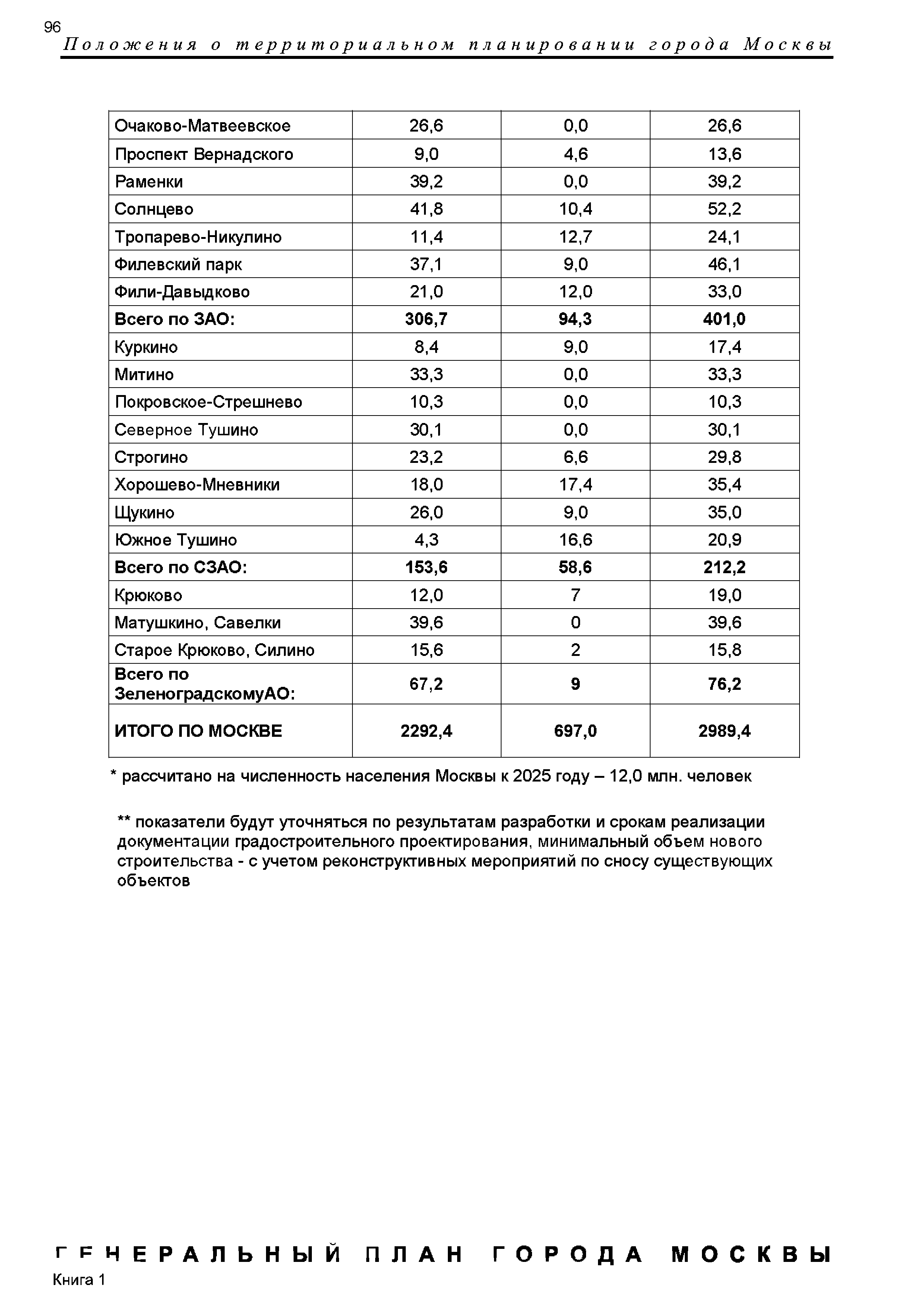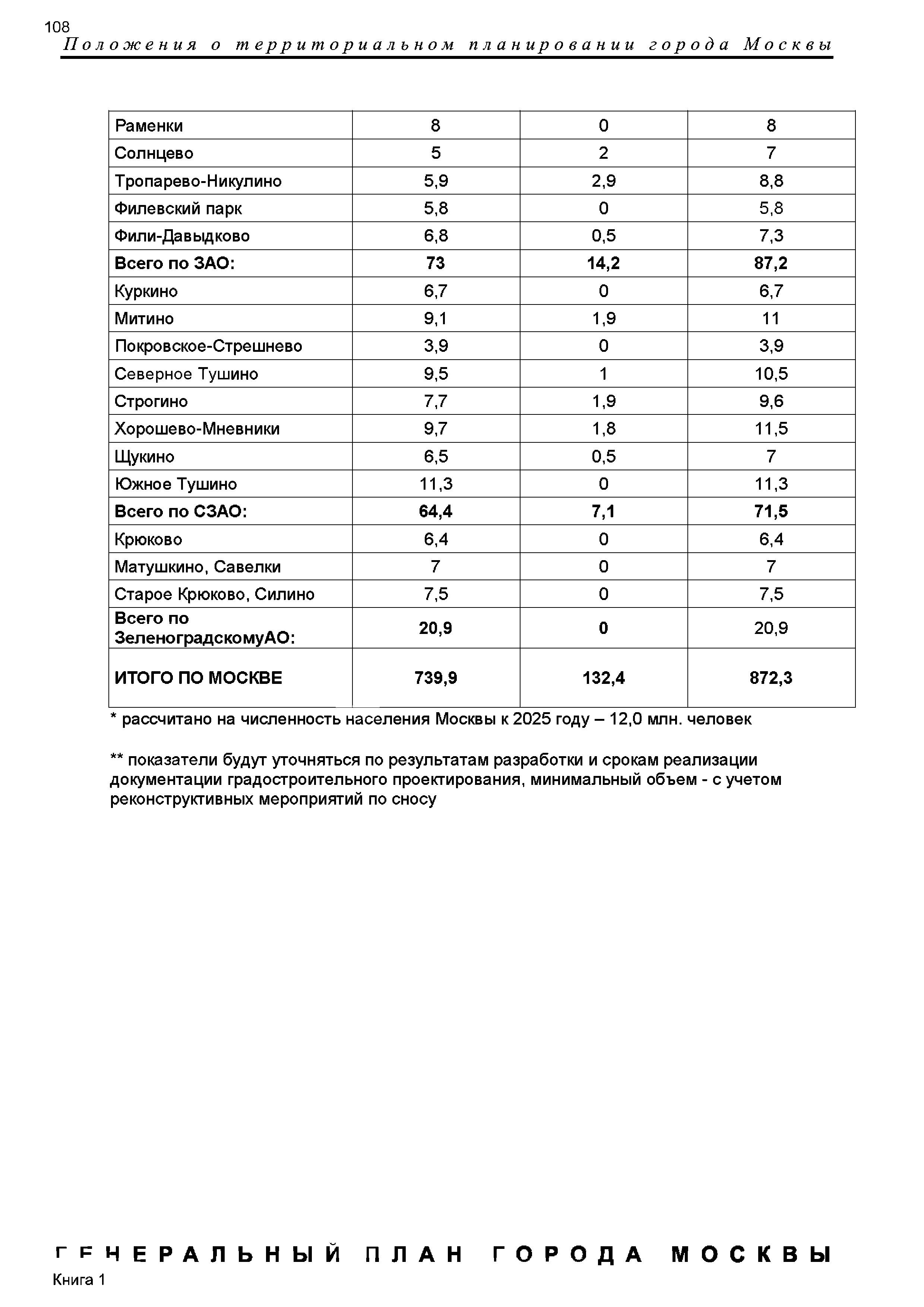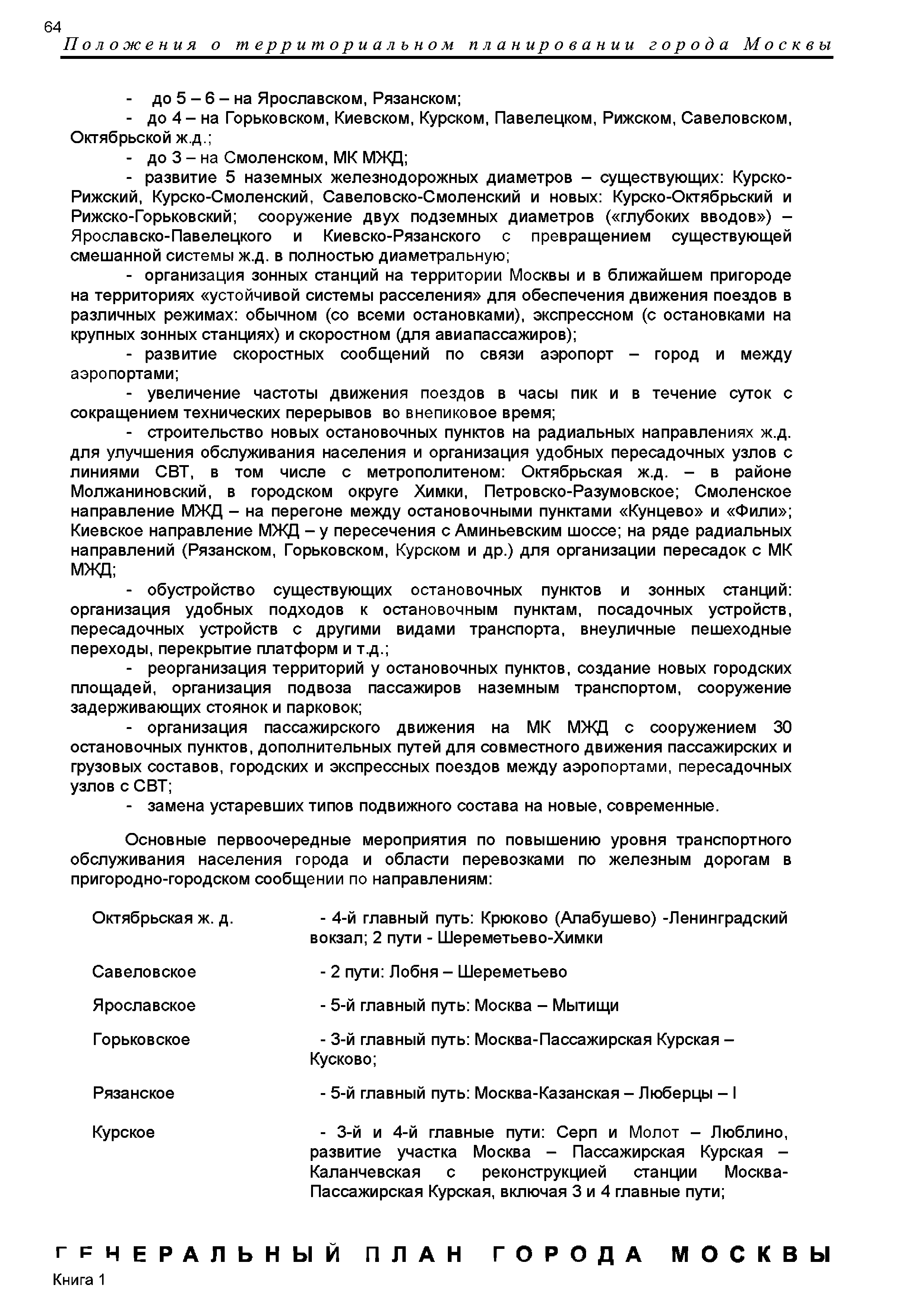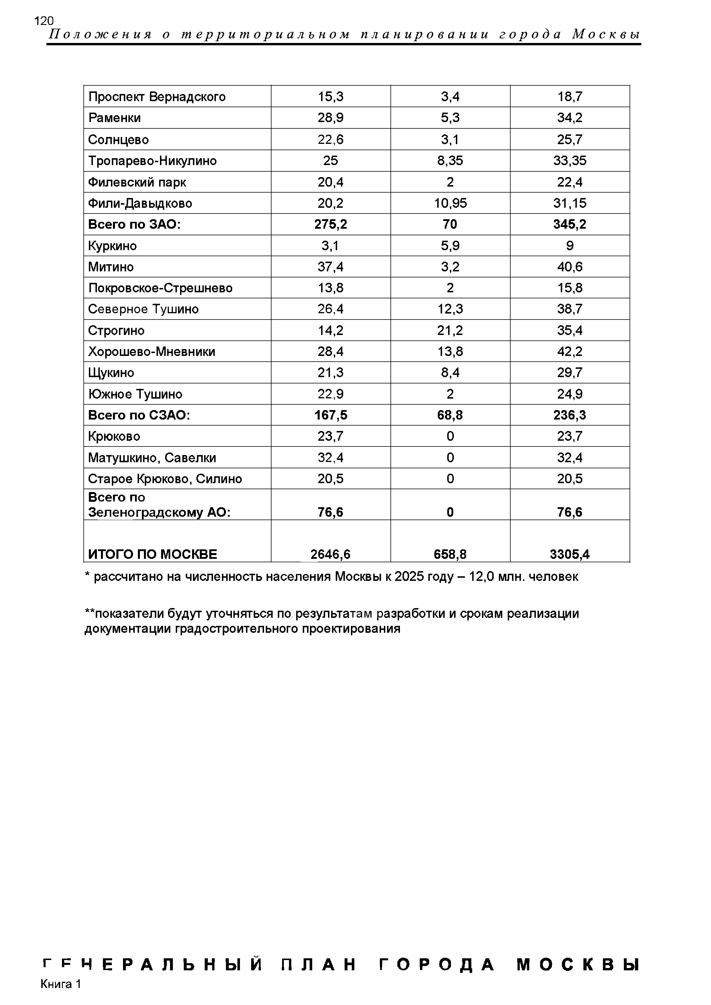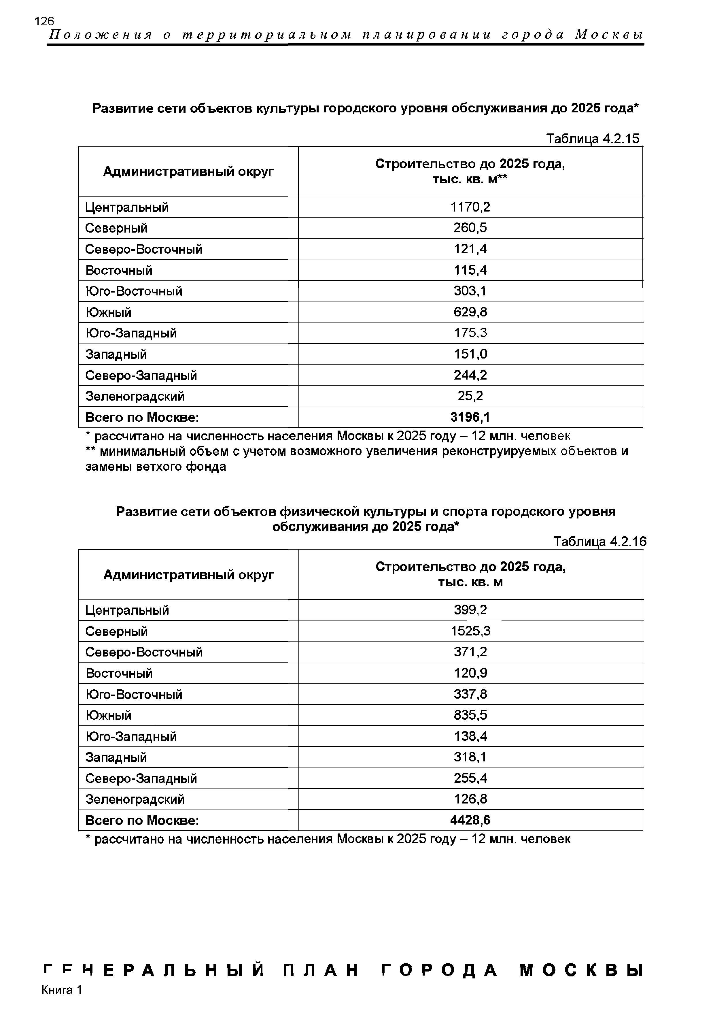 | Оглавление: | Содержание Часть 1. Социально-экономические предпосылки развития города Москвы 1. Общие положения 1.1. Цели и задачи социально-экономического развития города Москвы 1.2. Повышение качества жизни и уровня воспроизводства населения 1.3. Устойчивое и сбалансированное развитие отраслей экономики города Москвы и рост валового регионального продукта 1.4. Повышение эффективности использования накопленного потенциала и ресурсов города 1.5. Мероприятия социально-экономического развития города Москвы Часть 2. Территориальное планирование развития города Москвы 1. Цели территориального планирования пространственного развития города Москвы на период до 2025 года 2. Задачи территориального планирования пространственного развития города Москвы на период до 2025 года, направленные на обеспечение общественных интересов, социальных гарантий, последовательное повышение качества городской среды и устойчивости развития города 3. Основные группы мероприятий территориального планирования города Москвы 3.1. Мероприятия в области планировочной организации и функционального зонирования территории 3.2. Инженерно-технические мероприятия по охране окружающей среды и защите населения и территории от опасных воздействий природного и техногенного характера 3.3. Мероприятия по сохранению, восстановлению объектов культурного наследия и реабилитации исторической среды 3.4. Мероприятия по сохранению и реабилитации особо охраняемых природных территорий 3.5. Мероприятия по размещению и строительству, реконструкции, реновации, капитальному ремонту объектов капитального строительства жилищного, общественного, административного, делового, производственного назначения 3.6. Мероприятия по развитию, размещению и строительству, реконструкции систем и объектов транспортной инфраструктуры и совершенствованию их функционирования 3.7. Мероприятия по развитию, размещению и строительству, реконструкции систем и объектов инженерной инфраструктуры и совершенствованию их функционирования 3.8. Мероприятия по развитию, размещению и строительству, реконструкции социально значимых объектов социальной инфраструктуры 3.9. Мероприятия в области ландшафтного и садово-паркового строительства, комплексного благоустройства и художественного оформления территории 4. Показатели территориального планирования развития города Москвы 4.1. Основные показатели развития особо охраняемых природных территорий, природных и озелененных территорий, охраны окружающей среды и защиты населения и территорий от опасных воздействий 4.2. Основные показатели развития социальной инфраструктуры 4.3. Основные показатели в области жилищного строительства 4.4. Основные показатели развития транспортной инфраструктуры 4.5. Основные показатели развития инженерной инфраструктуры Часть 3. Обеспечение совместных интересов субъектов Российской Федерации - города федерального значения Москвы и Московской области в сфере территориального планирования 1. Цели и задачи территориального планирования в части обеспечения совместных интересов города Москвы и Московской области 2. Мероприятия территориального планирования в части обеспечения совместных интересов города Москвы и Московской области 2.1. Формирование эффективной системы расселения города Москвы и Московской области 2
