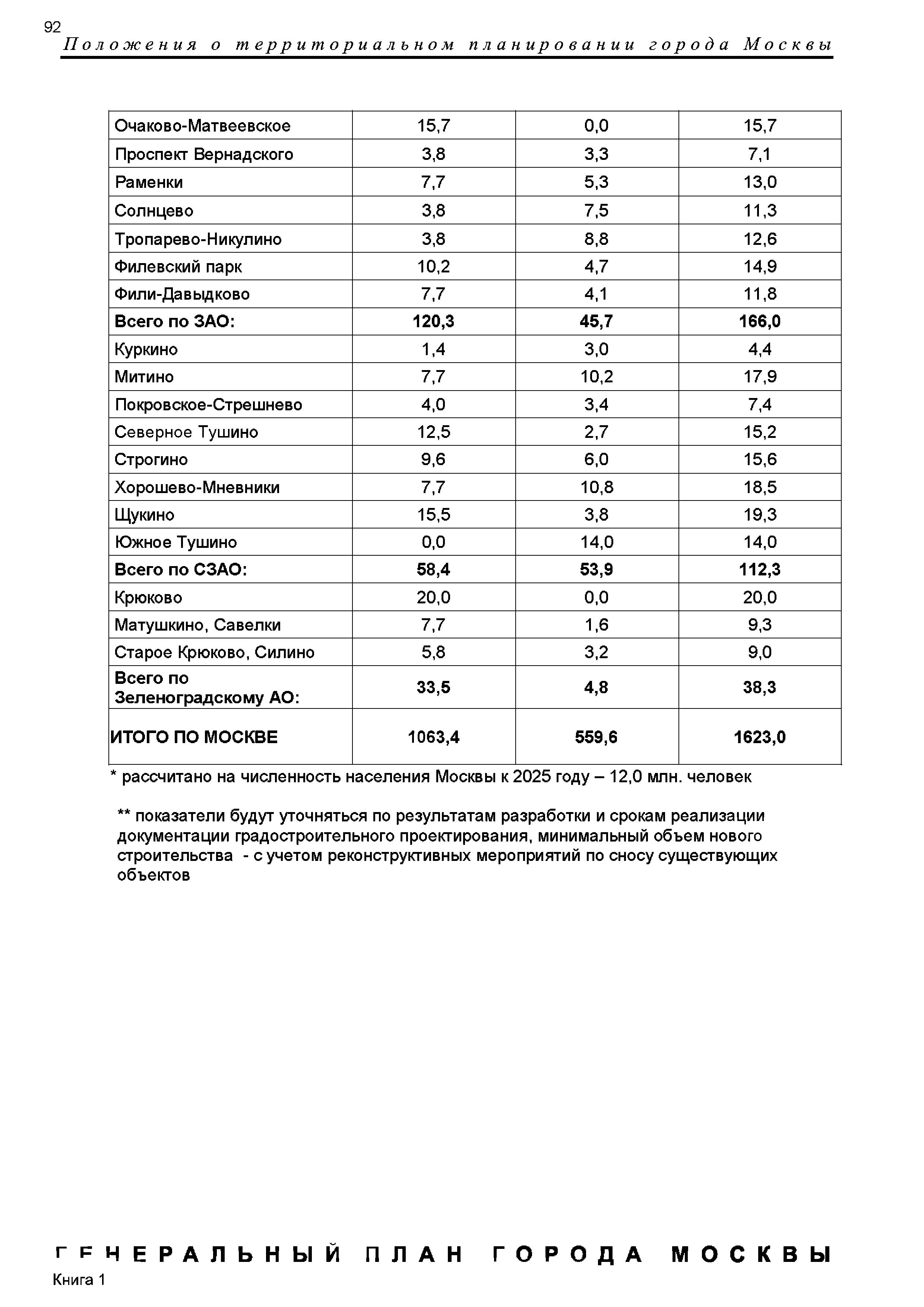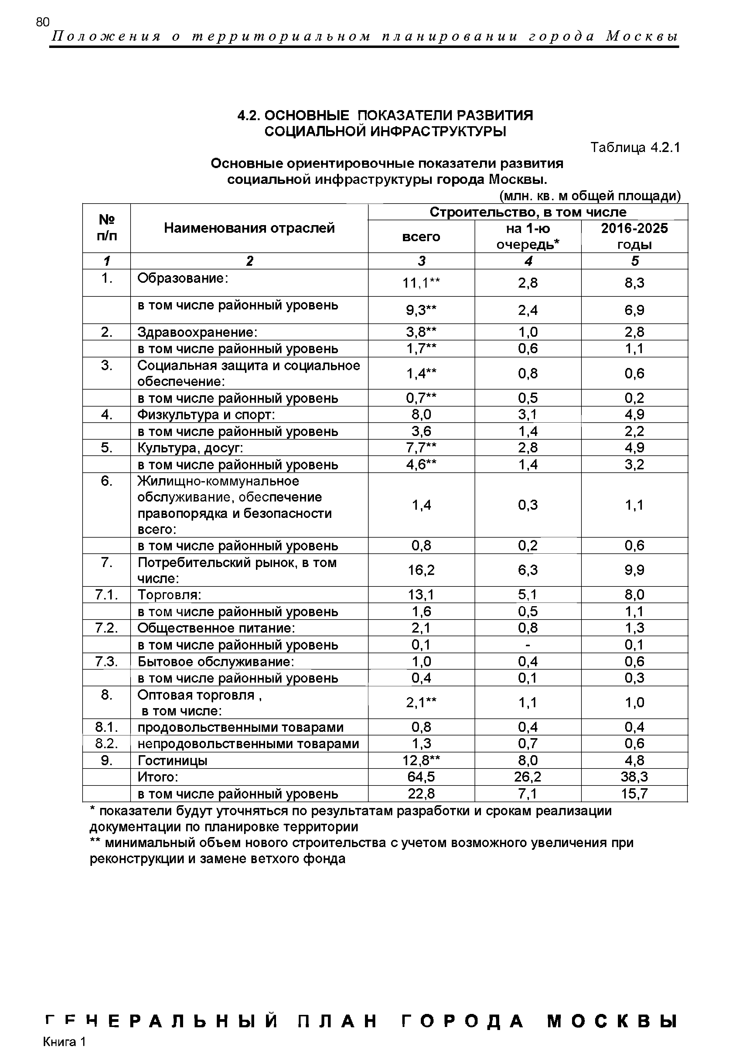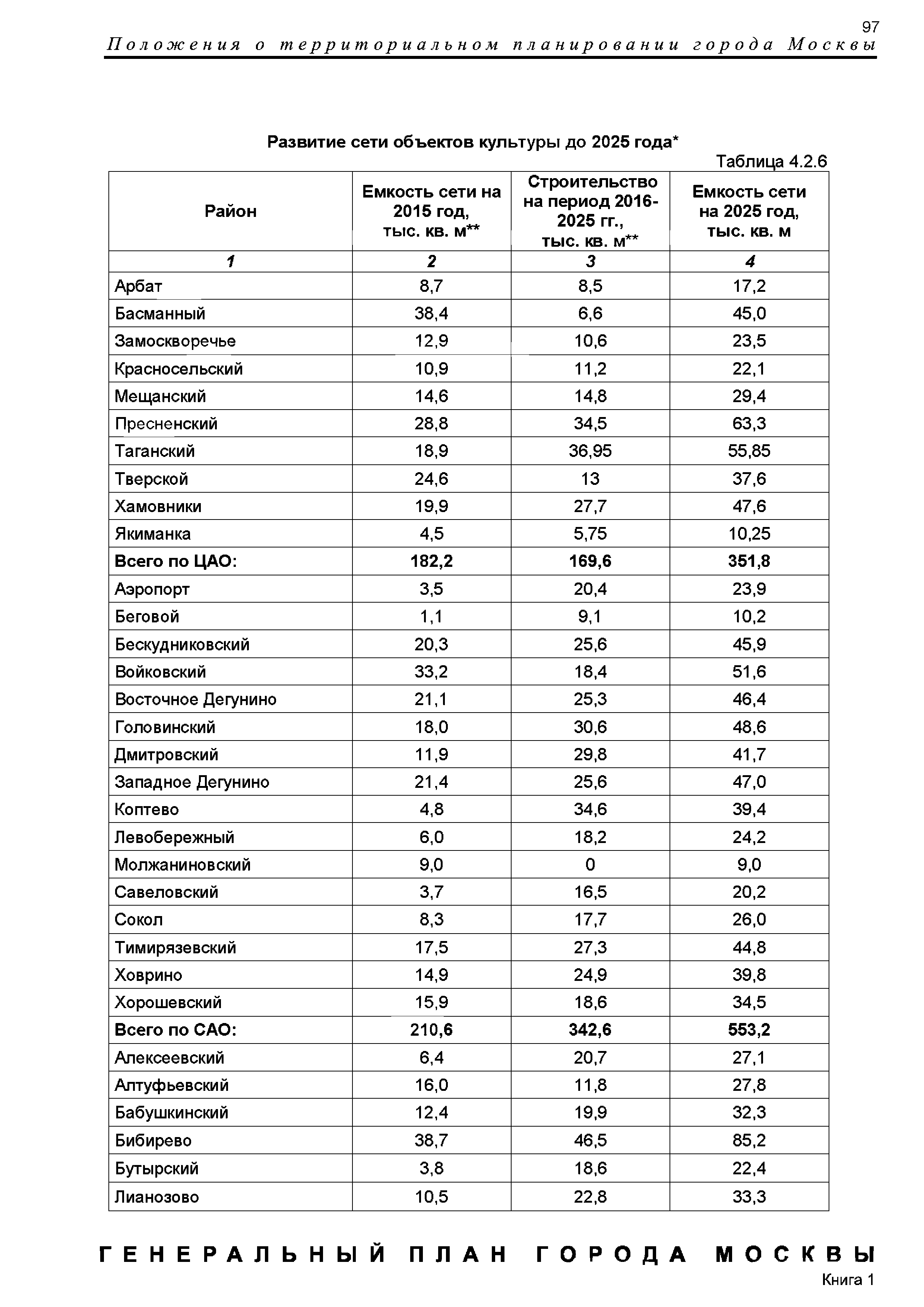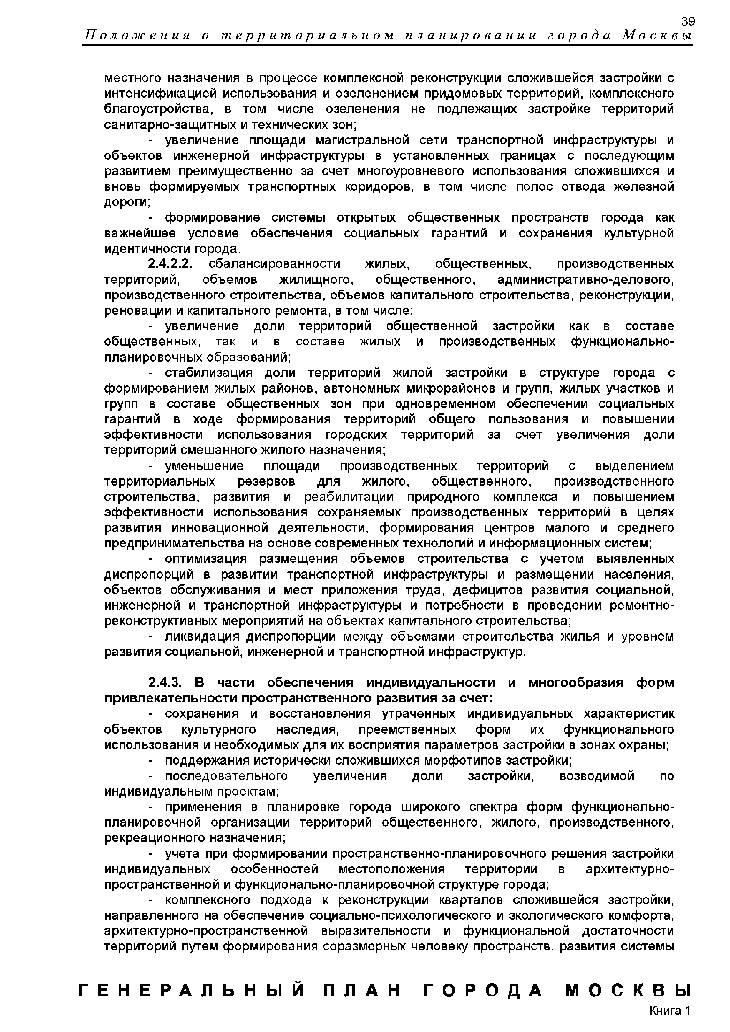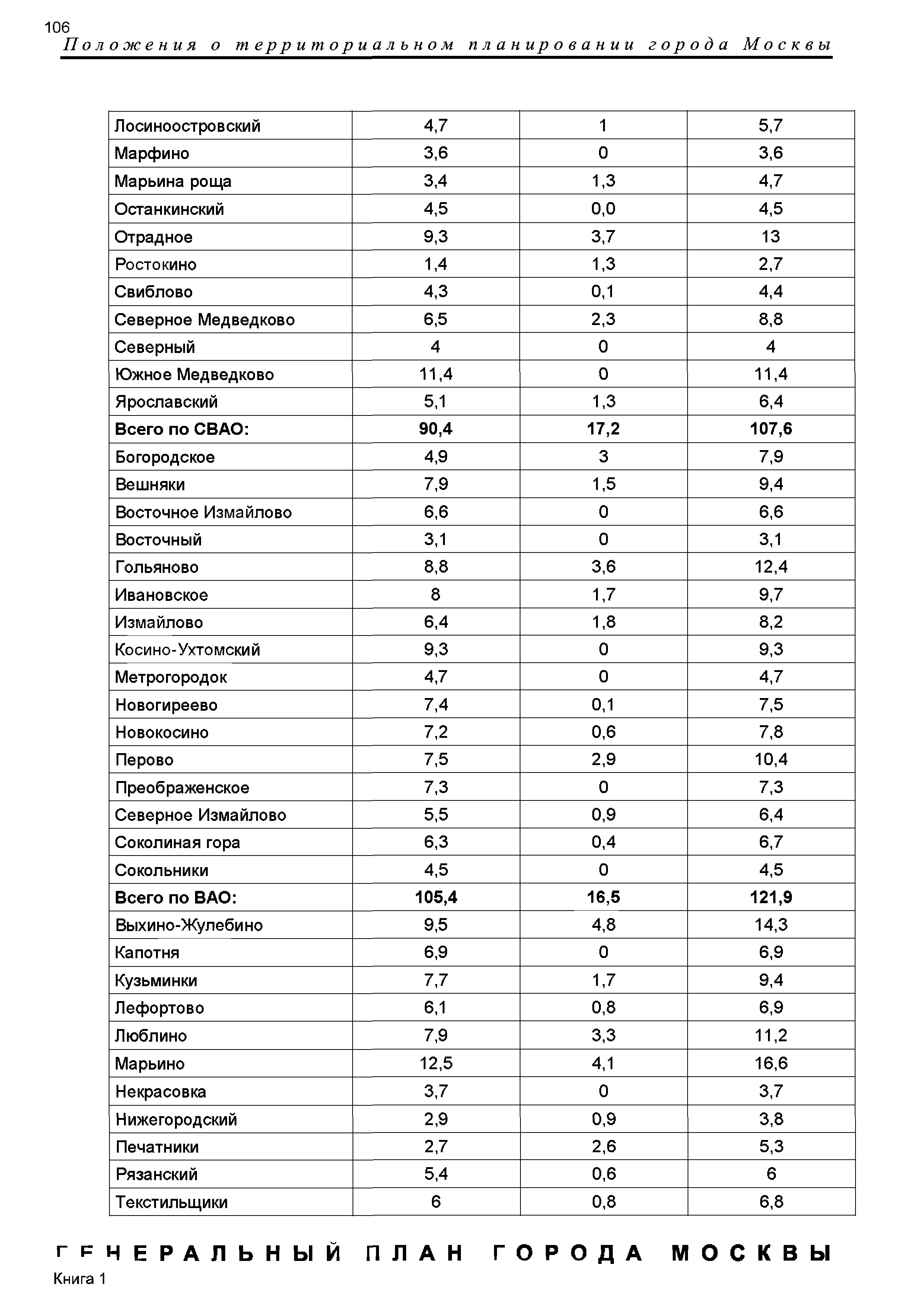 | Оглавление: | Содержание Часть 1. Социально-экономические предпосылки развития города Москвы 1. Общие положения 1.1. Цели и задачи социально-экономического развития города Москвы 1.2. Повышение качества жизни и уровня воспроизводства населения 1.3. Устойчивое и сбалансированное развитие отраслей экономики города Москвы и рост валового регионального продукта 1.4. Повышение эффективности использования накопленного потенциала и ресурсов города 1.5. Мероприятия социально-экономического развития города Москвы Часть 2. Территориальное планирование развития города Москвы 1. Цели территориального планирования пространственного развития города Москвы на период до 2025 года 2. Задачи территориального планирования пространственного развития города Москвы на период до 2025 года, направленные на обеспечение общественных интересов, социальных гарантий, последовательное повышение качества городской среды и устойчивости развития города 3. Основные группы мероприятий территориального планирования города Москвы 3.1. Мероприятия в области планировочной организации и функционального зонирования территории 3.2. Инженерно-технические мероприятия по охране окружающей среды и защите населения и территории от опасных воздействий природного и техногенного характера 3.3. Мероприятия по сохранению, восстановлению объектов культурного наследия и реабилитации исторической среды 3.4. Мероприятия по сохранению и реабилитации особо охраняемых природных территорий 3.5. Мероприятия по размещению и строительству, реконструкции, реновации, капитальному ремонту объектов капитального строительства жилищного, общественного, административного, делового, производственного назначения 3.6. Мероприятия по развитию, размещению и строительству, реконструкции систем и объектов транспортной инфраструктуры и совершенствованию их функционирования 3.7. Мероприятия по развитию, размещению и строительству, реконструкции систем и объектов инженерной инфраструктуры и совершенствованию их функционирования 3.8. Мероприятия по развитию, размещению и строительству, реконструкции социально значимых объектов социальной инфраструктуры 3.9. Мероприятия в области ландшафтного и садово-паркового строительства, комплексного благоустройства и художественного оформления территории 4. Показатели территориального планирования развития города Москвы 4.1. Основные показатели развития особо охраняемых природных территорий, природных и озелененных территорий, охраны окружающей среды и защиты населения и территорий от опасных воздействий 4.2. Основные показатели развития социальной инфраструктуры 4.3. Основные показатели в области жилищного строительства 4.4. Основные показатели развития транспортной инфраструктуры 4.5. Основные показатели развития инженерной инфраструктуры Часть 3. Обеспечение совместных интересов субъектов Российской Федерации - города федерального значения Москвы и Московской области в сфере территориального планирования 1. Цели и задачи территориального планирования в части обеспечения совместных интересов города Москвы и Московской области 2. Мероприятия территориального планирования в части обеспечения совместных интересов города Москвы и Московской области 2.1. Формирование эффективной системы расселения города Москвы и Московской области 2