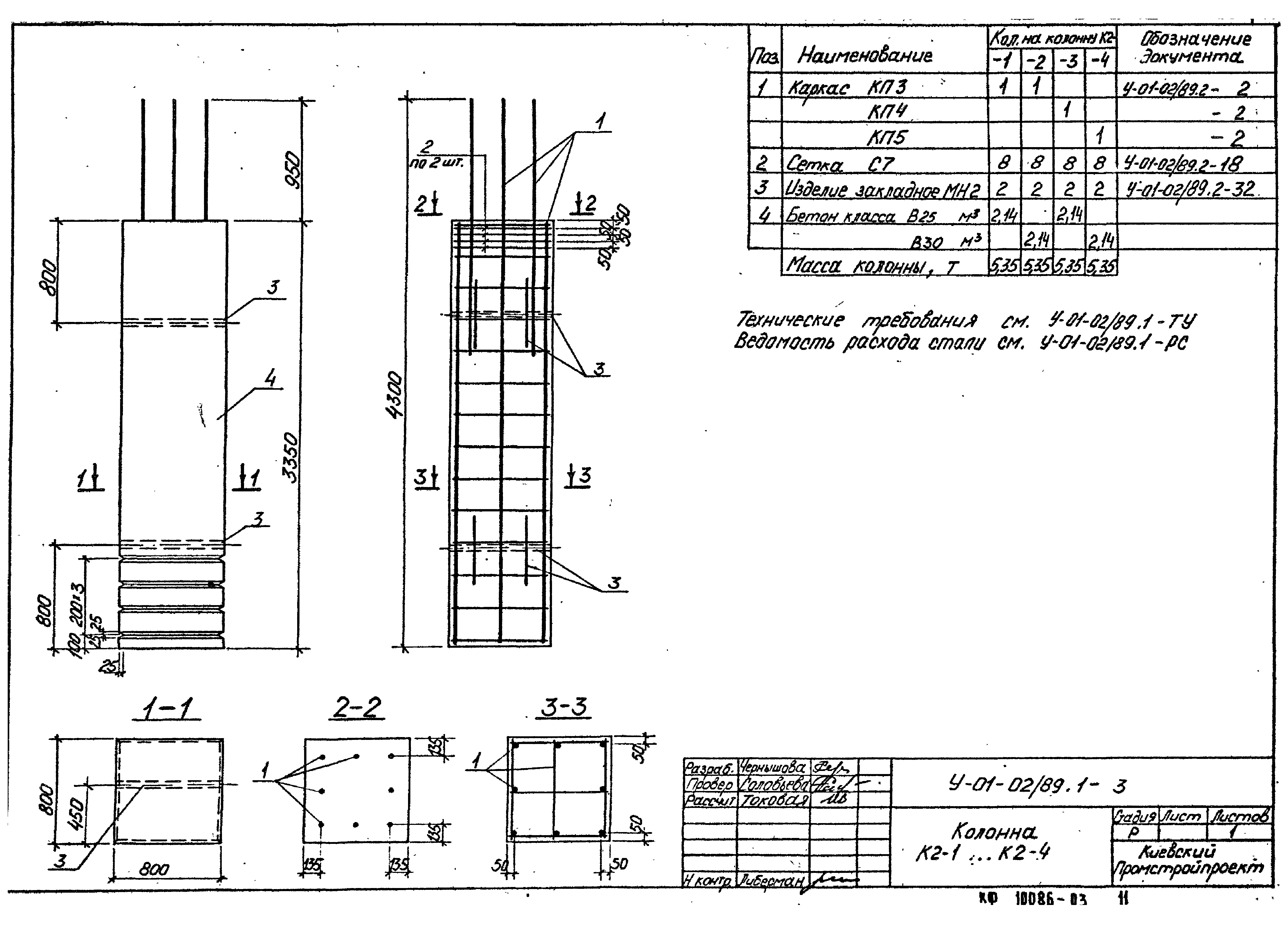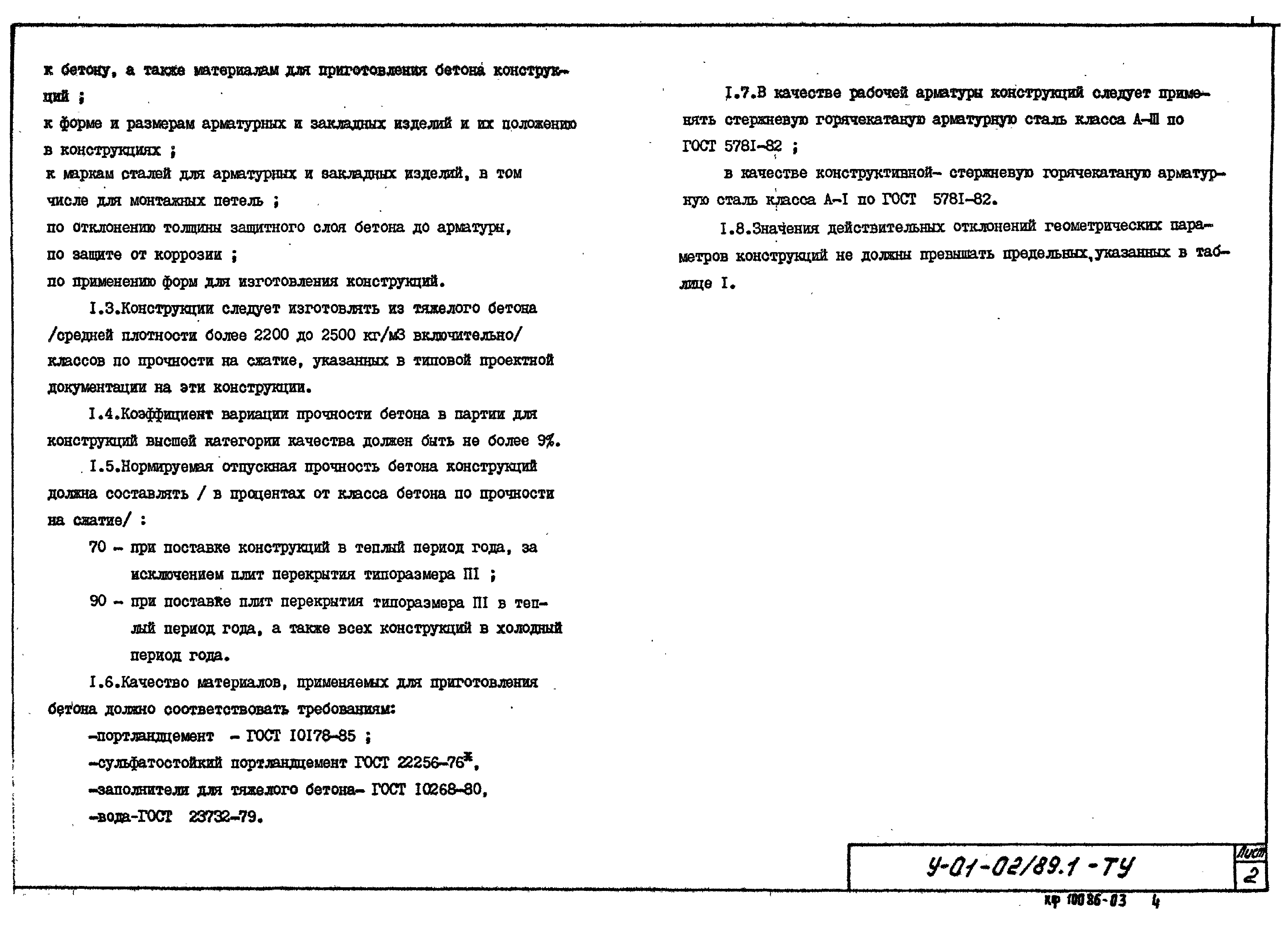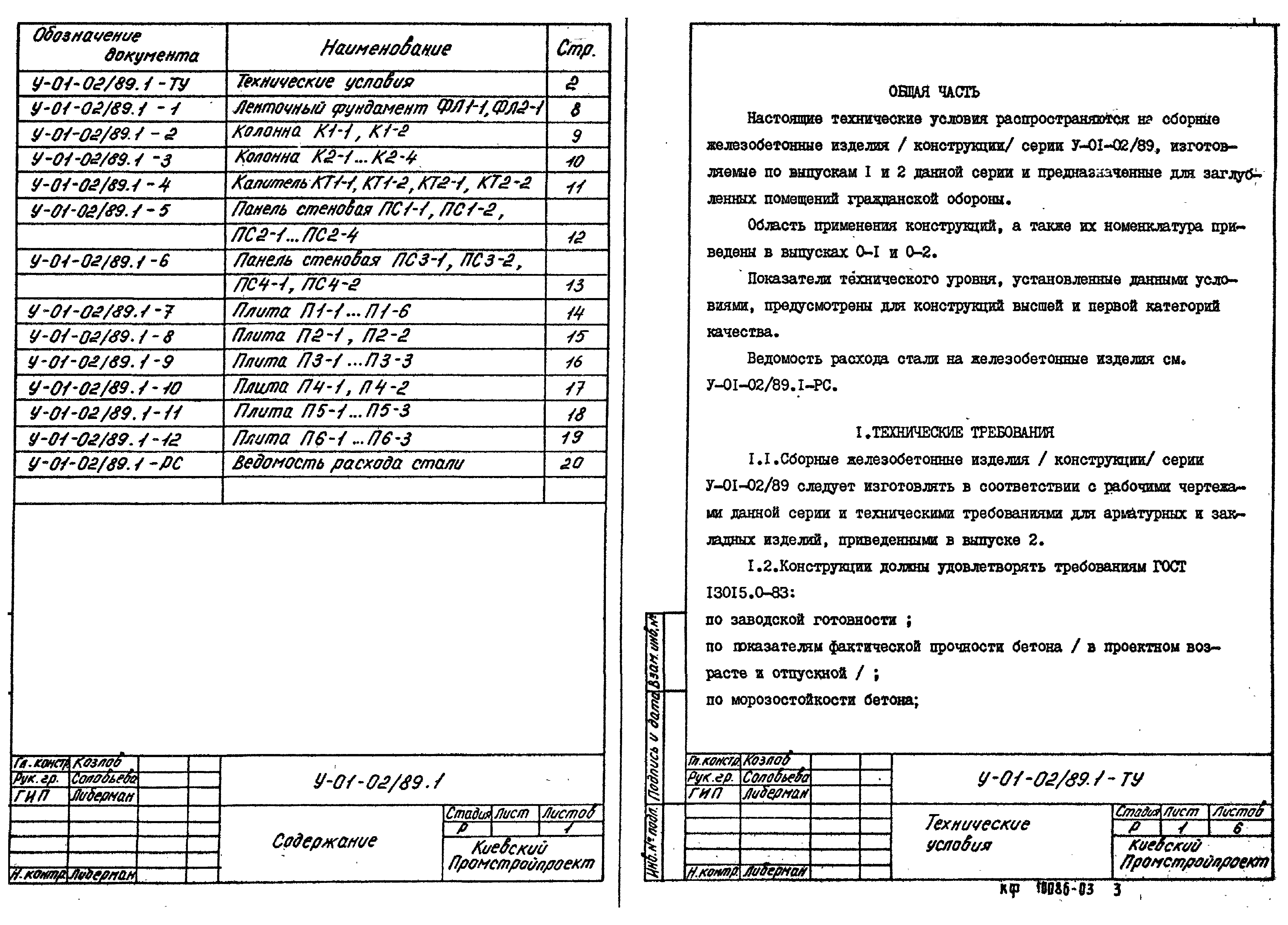 | Оглавление: | У-01-02/89.1-ТУ Технические условия У-01-02/89.1-1 Ленточный фундамент ФЛ1-1, ФЛ2-1 У-01-02/89.1-2 Колонна К1-1, К1-2 У-01-02/89.1-3 Колонна К2-1 - К2-4 У-01-02/89.1-4 Капитель КТ1-1, КТ1-2, КТ2-1, КТ2-2 У-01-02/89.1-5 Панель стеновая ПС1-1, ПС1-2, ПС2-1 - ПС2-4 У-01-02/89.1-6 Панель стеновая ПС3-1, ПС3-2, ПС4-1, ПС4-2 У-01-02/89.1-7 Плита П1-1 - П1-6 У-01-02/89.1-8 Плита П2-1, П2-2 У-01-02/89.1-9 Плита П3-1 - П3-3 У-01-02/89.1-10 Плита П4-1, П4-2 У-01-02/89.1-11 Плита П5-1 - П5-3 У-01-02/89.1-12 Плита П6-1 - П6-3 У-01-02/89.1-РС Ведомость расхода стали |