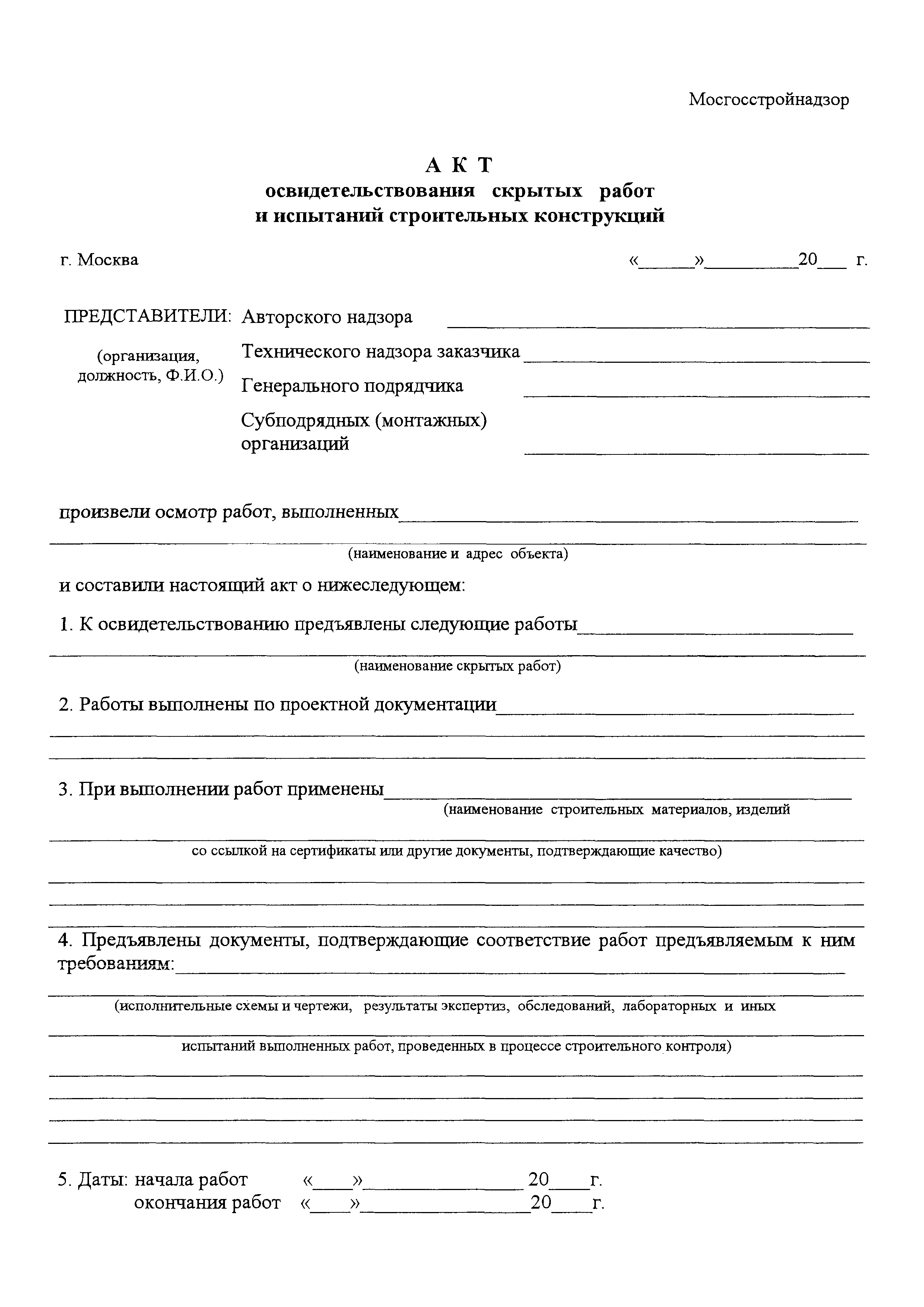 Акт освидетельствования скрытых работ и испытаний строительных конструкций| Статус: | справочные материалы, мп, тпр | | Название рус.: | Акт освидетельствования скрытых работ и испытаний строительных конструкций | | Дата добавления в базу: | 01.09.2013 | | Дата актуализации: | 01.01.2021 | | Утверждён: | Мосгосстройнадзор