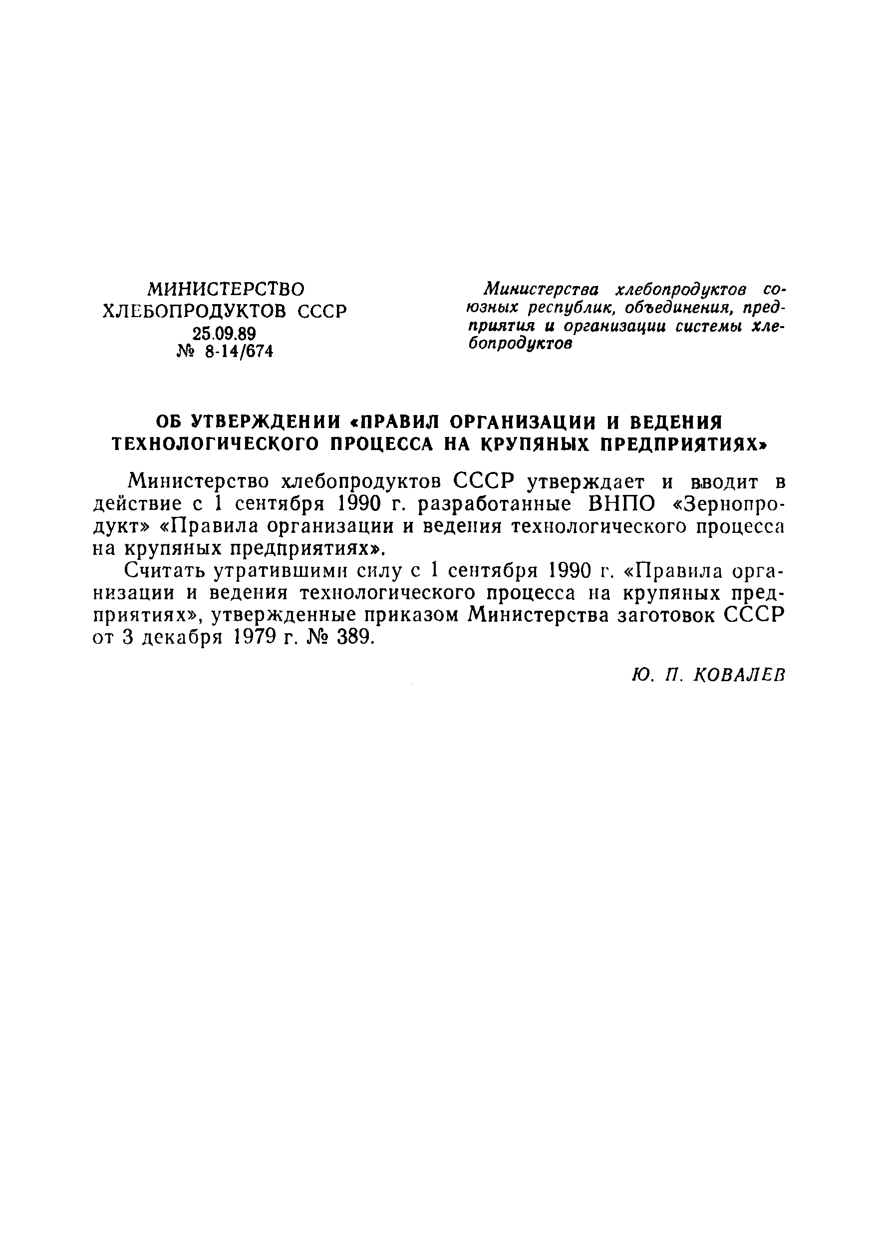 | Утверждён: | 25.09.1989 Министерство хлебопродуктов СССР (USSR Ministry of Bakery Products 8-14/674) |