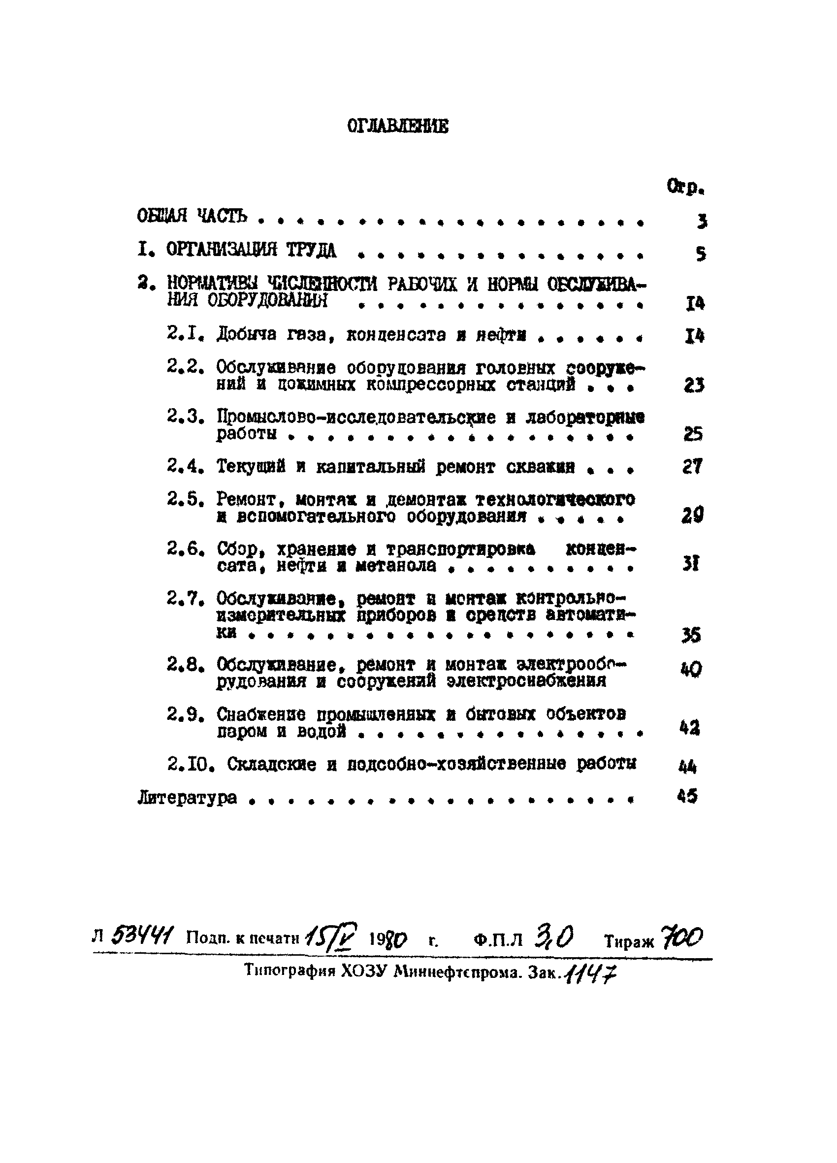 | Оглавление: | Общая часть 1 Организация труда 2 Нормативы численности рабочих и нормы обслуживания оборудования 2.1 Добыча газа, конденсата и нефти 2.2 Обслуживание оборудования головных сооружений и дожимных компрессорных станций 2.3 Промыслово-исследовательские и лабораторные работы 2.4 Текущий и капитальный ремонт скважин 2.5 Ремонт, монтаж и демонтаж технологического и вспомогательного оборудования 2.6 Сбор, хранение и транспортировка конденсата, нефти и метанола 2.7 Обслуживание, ремонт и монтаж контрольно-измерительных приборов и средств автоматики 2.8 Обслуживание, ремонт и монтаж электрооборудования и сооружений электроснабжения 2.9 Снабжение промышленных и бытовых объектов паром и водой 2.10 Складские и подсобно-хозяйственные работы Литература |